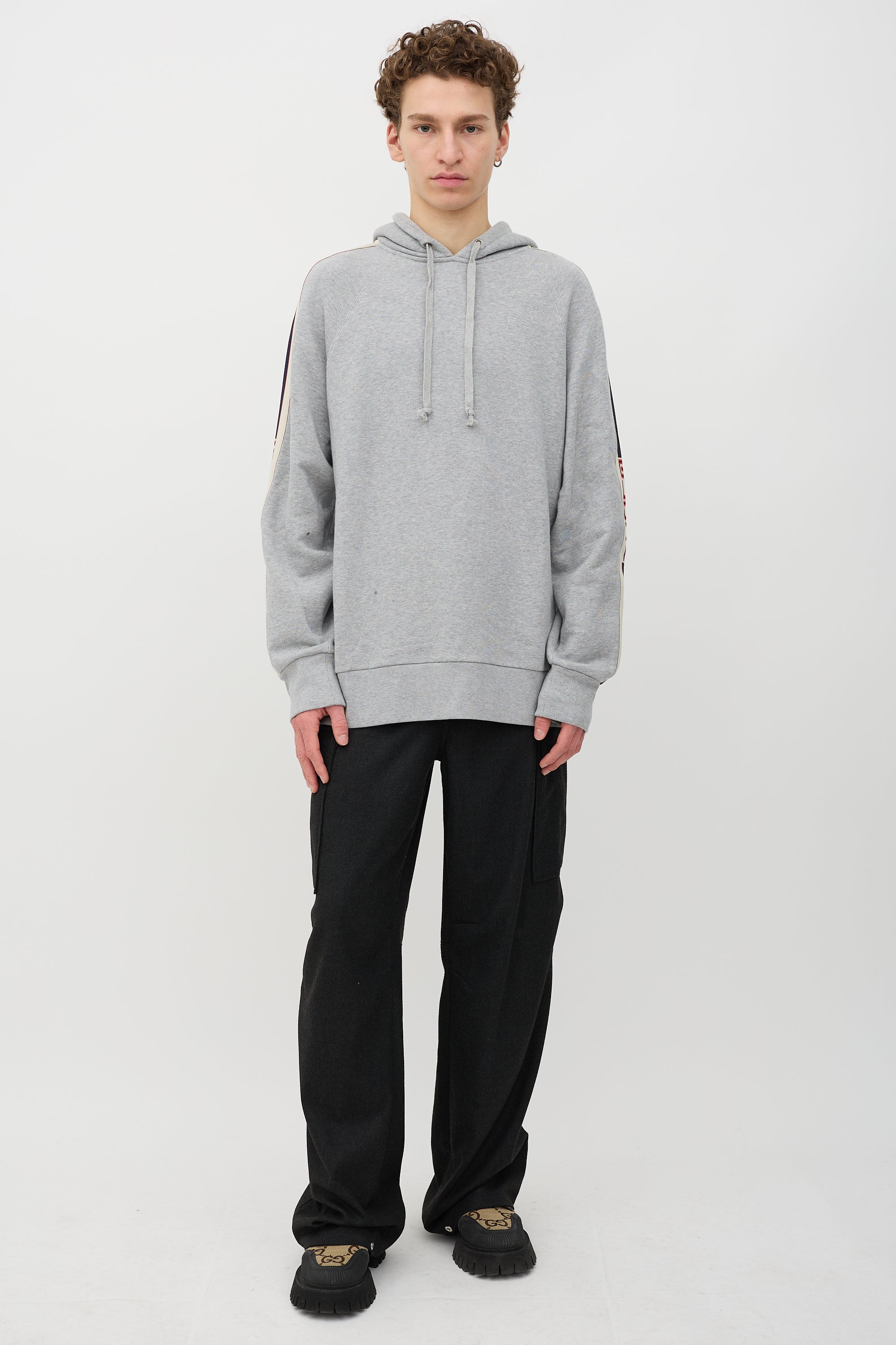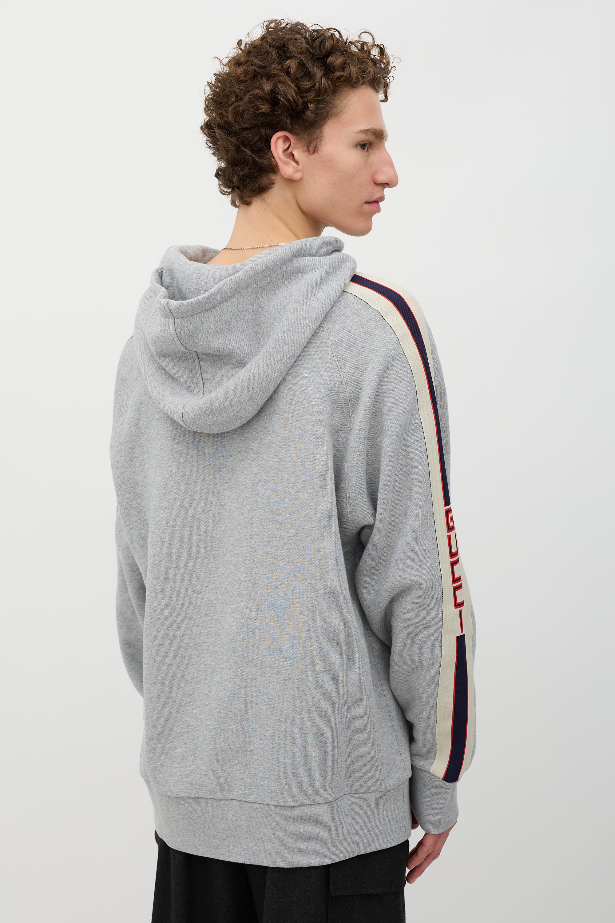 Pre-owned Gucci heather grey hoodie featuring drawstring hood, multicolour logo Web stripes along sleeves, and ribbed hem and cuffs.