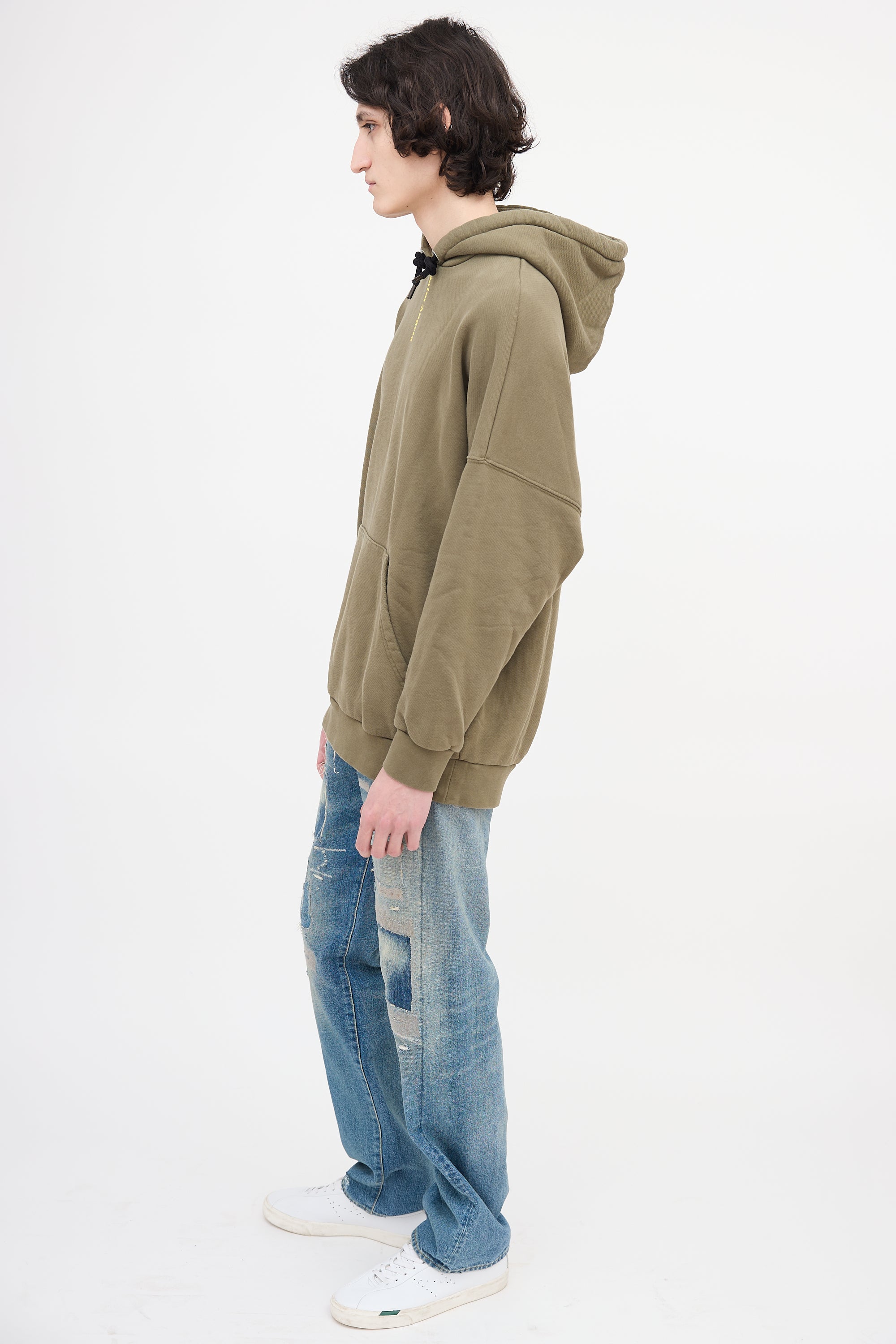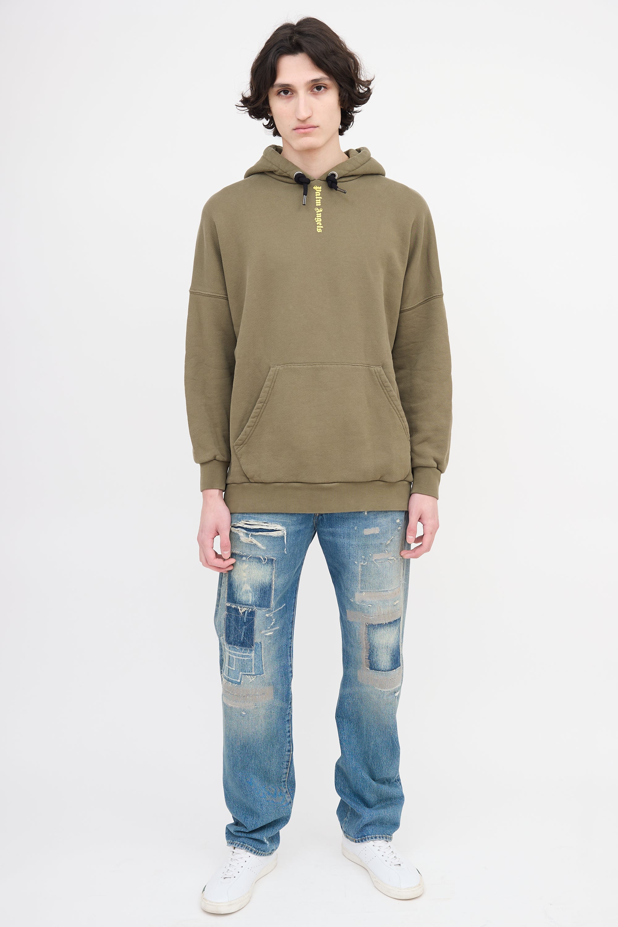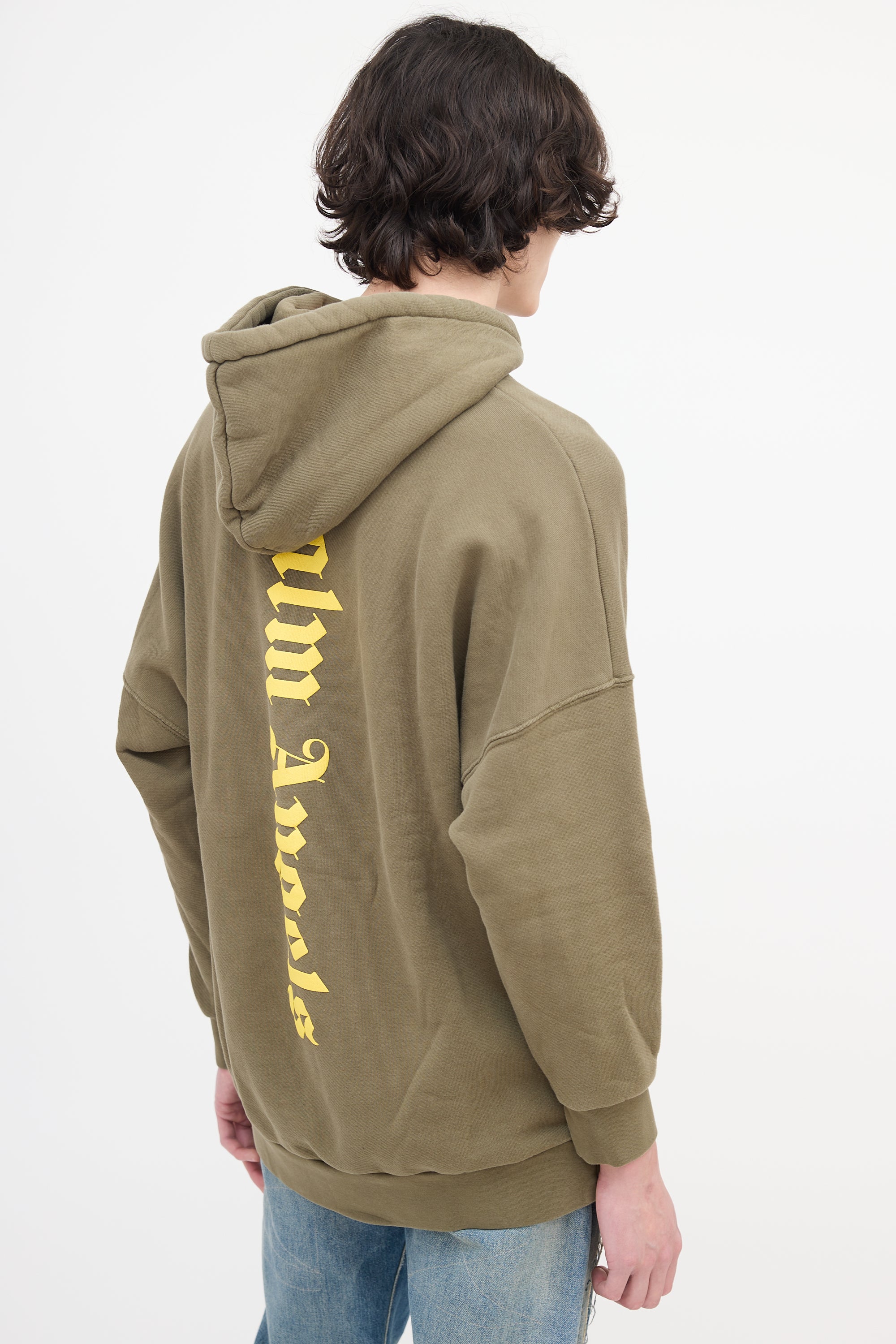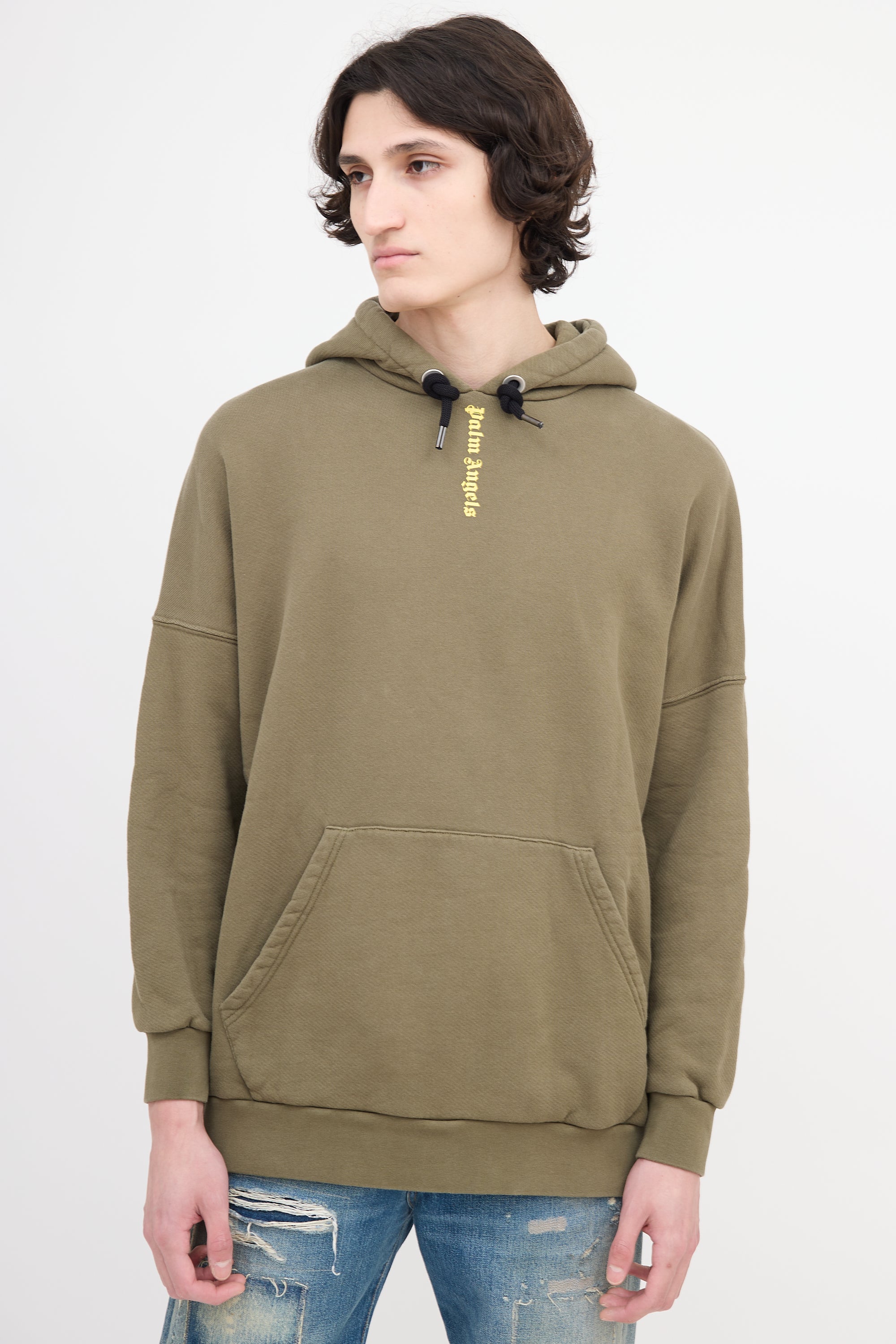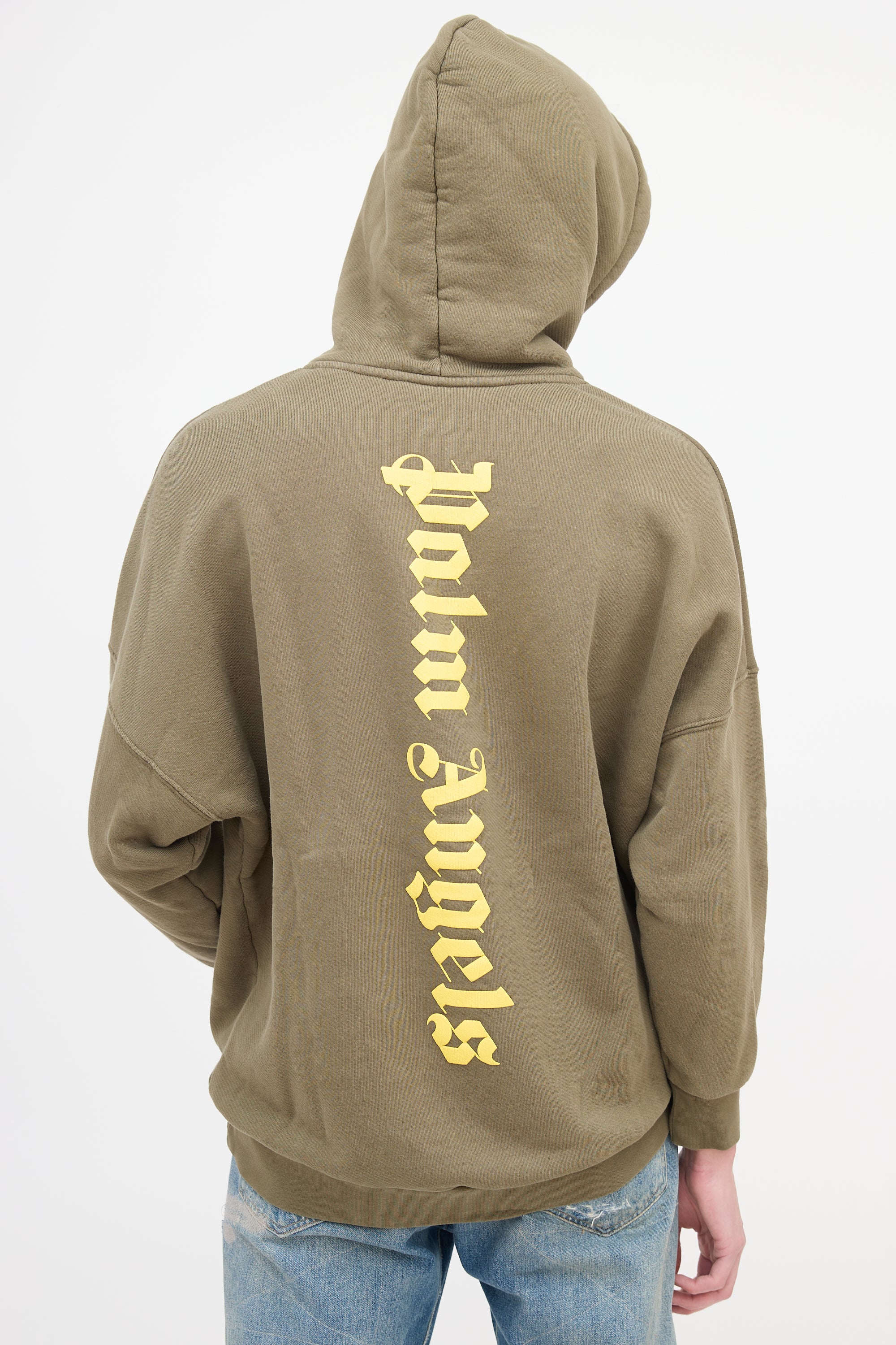 Pre-owned Palm Angels green Classic Logo hoodie featuring drawstring hood, front kangaroo pocket, drop shoulder, ribbed hem and cuffs, and yellow printed logo at neck and back.