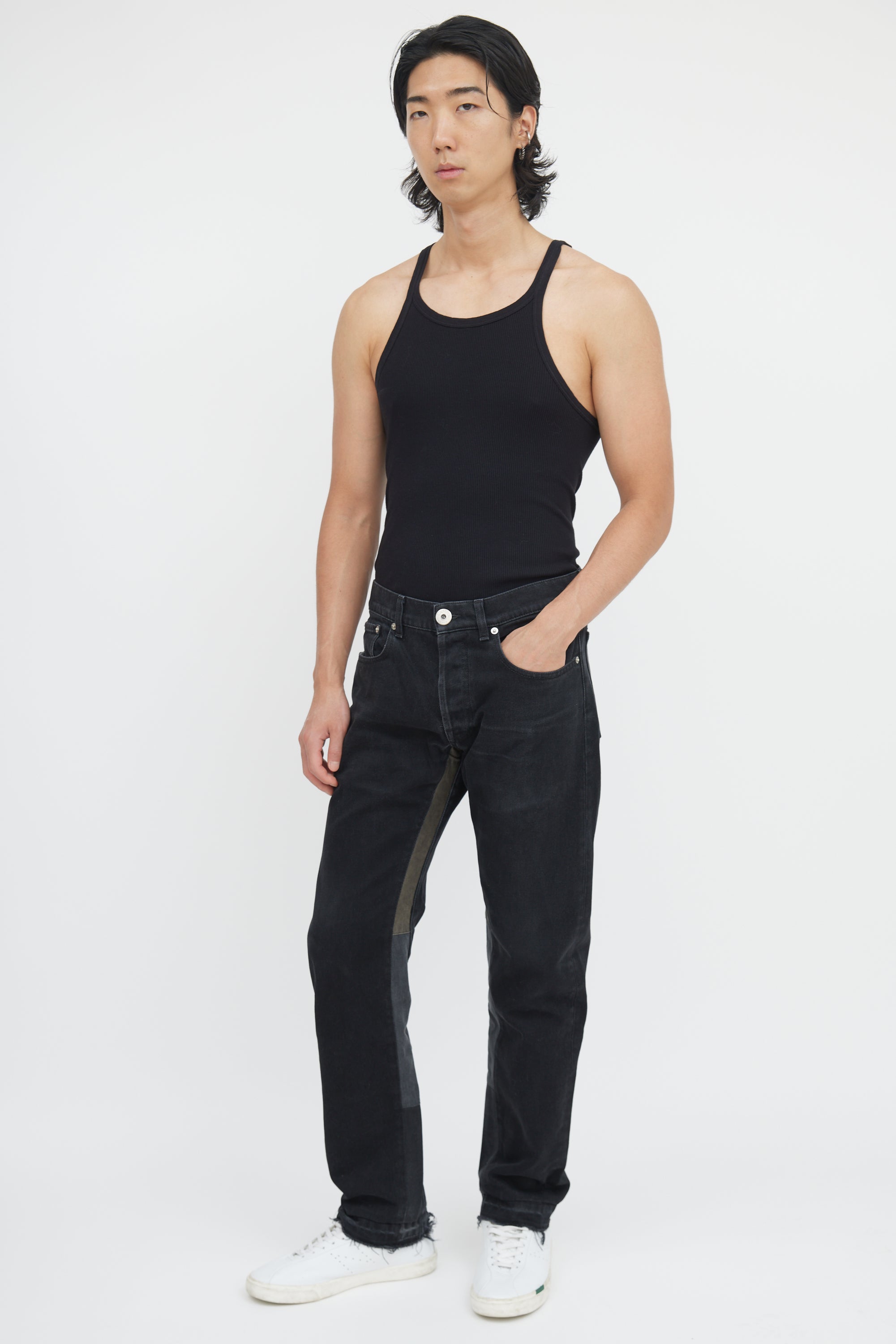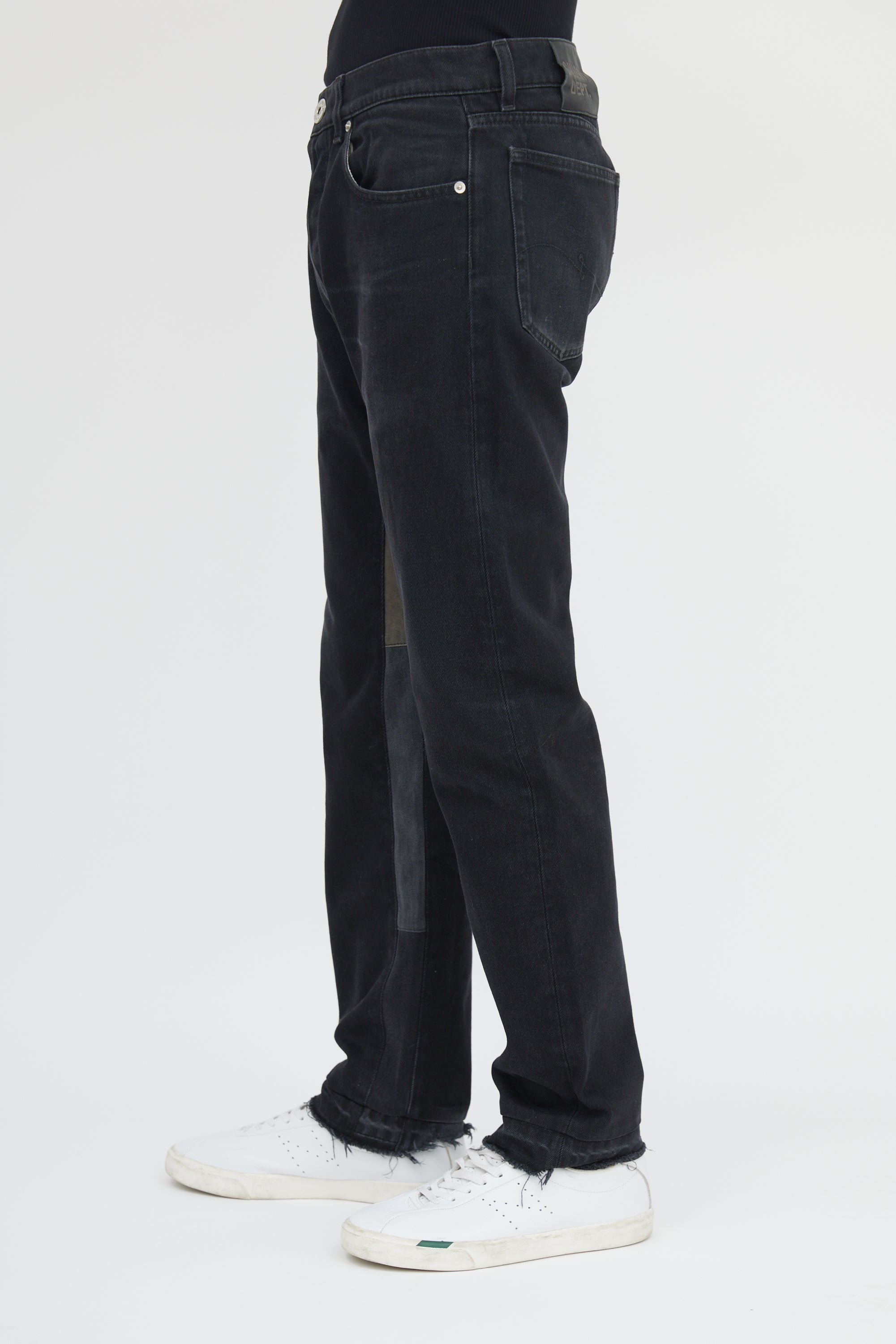 Pre-owned Lanvin X Gallery Dept. black jeans featuring straight leg, leather and denim panels throughout inseam and hem, five pocket styling, black leather and brown Jacron patches at back waist, button fly, and raw hem.