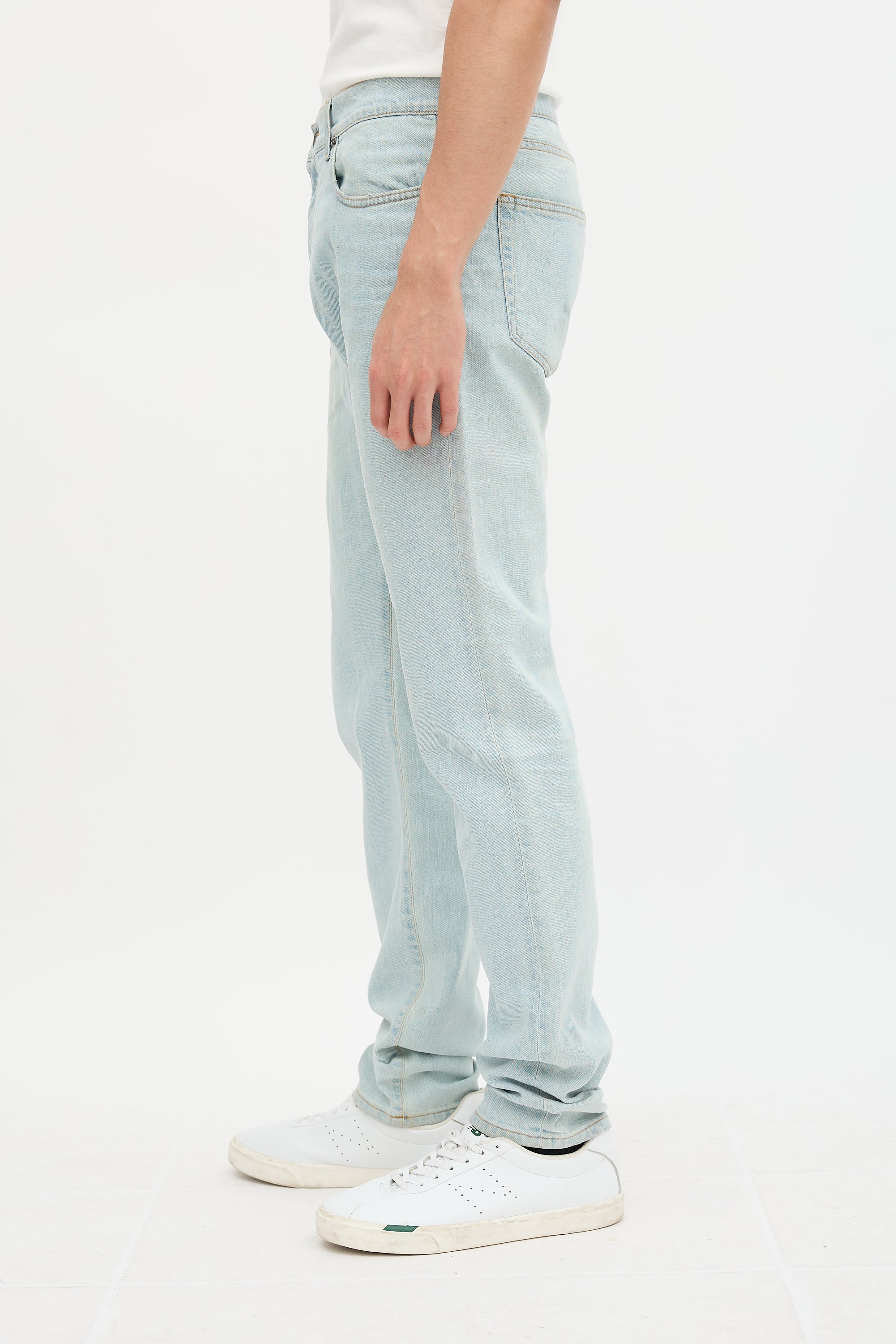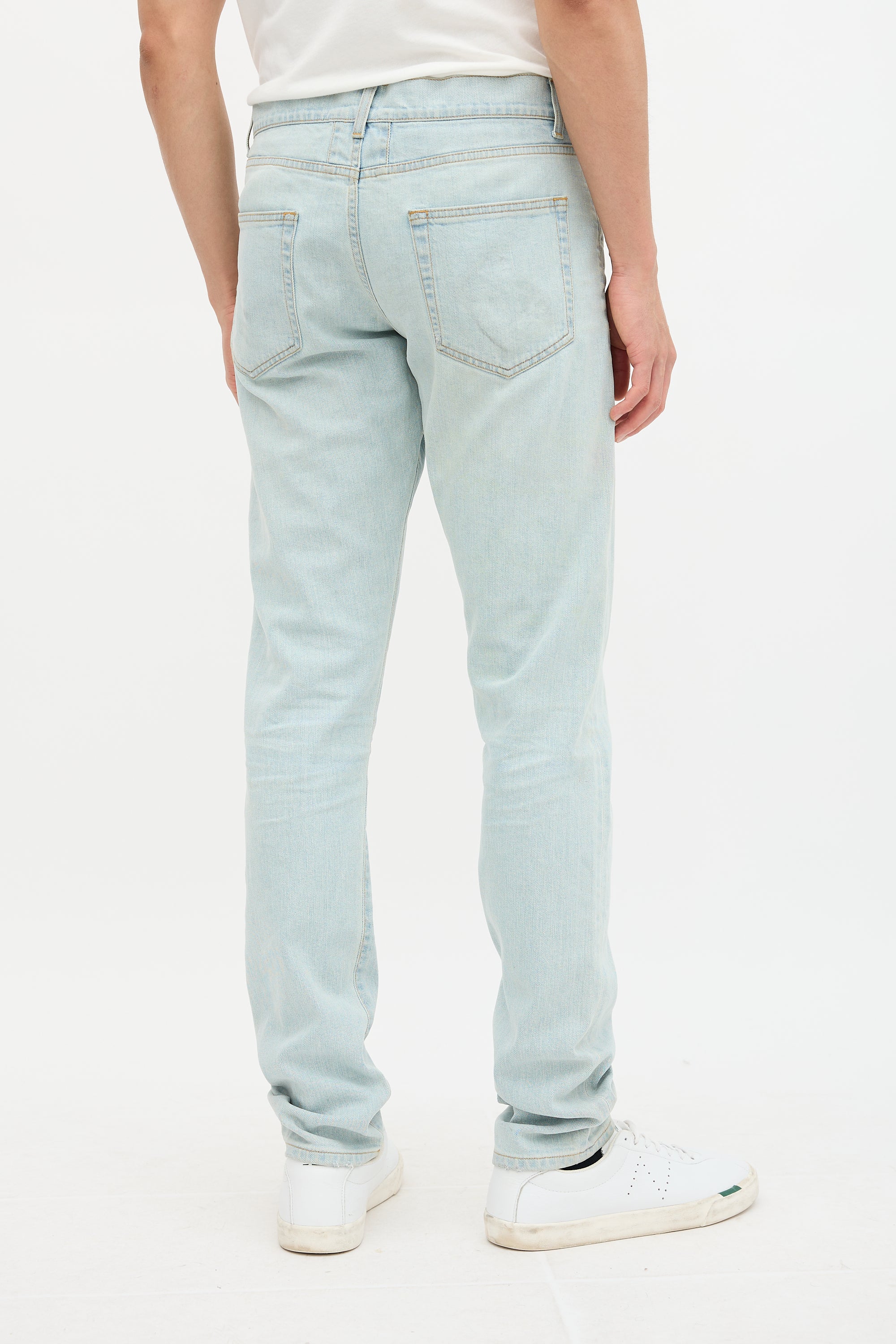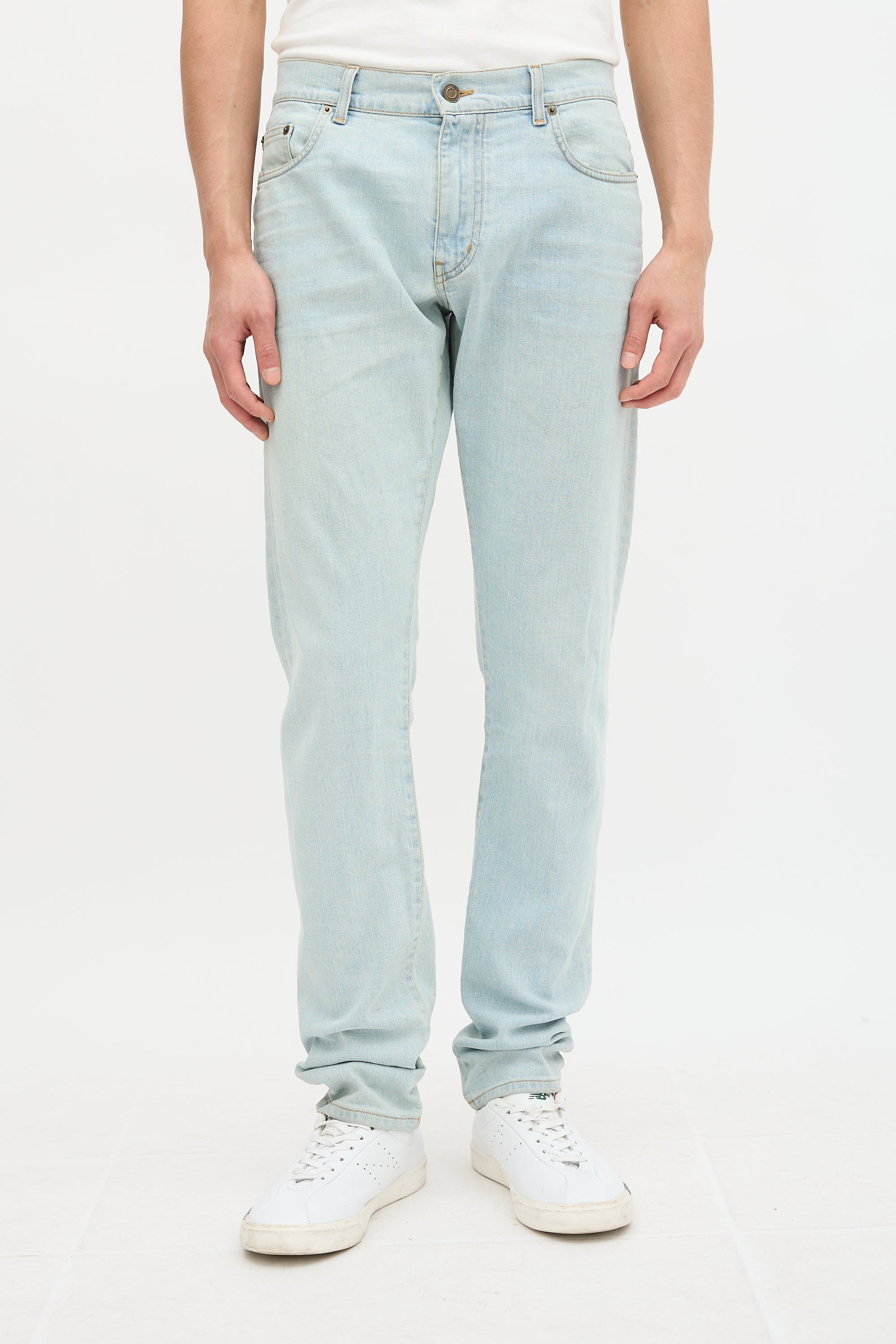 Pre-owned Saint Laurent light wash D02 skinny jeans featuring mid rise, five pocket styling, and zip fly.