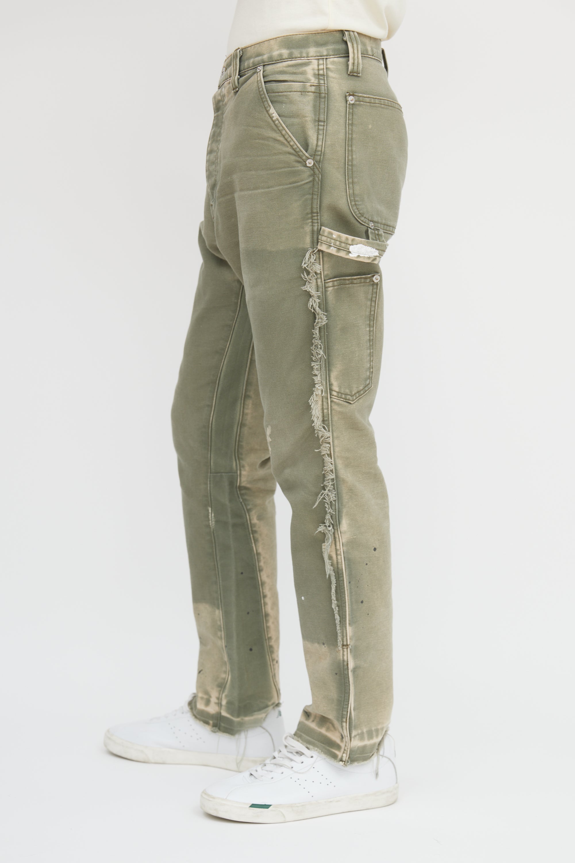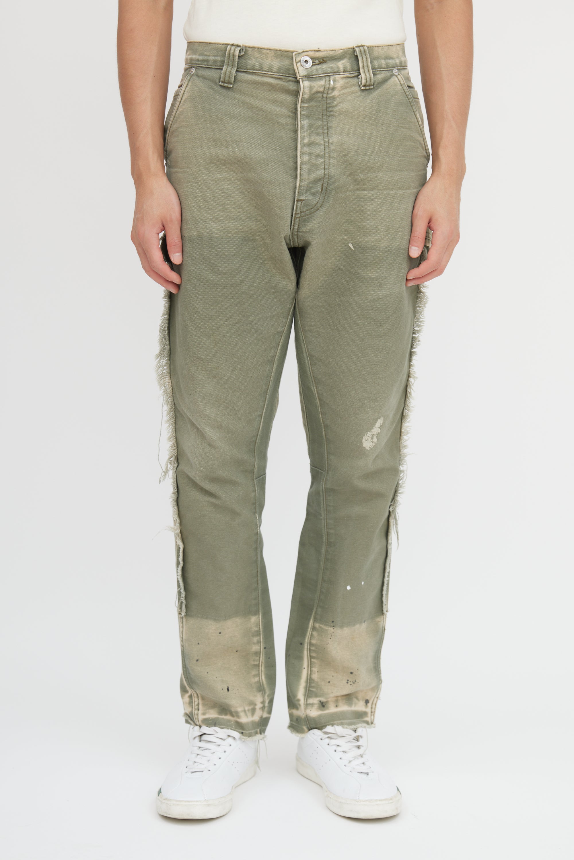 Pre-owned Gallery Dept. khaki green Carpenter Flare jeans featuring faded and paint splatter detail, raw edges, six pocket styling, beige leather Jacron, and button fly.