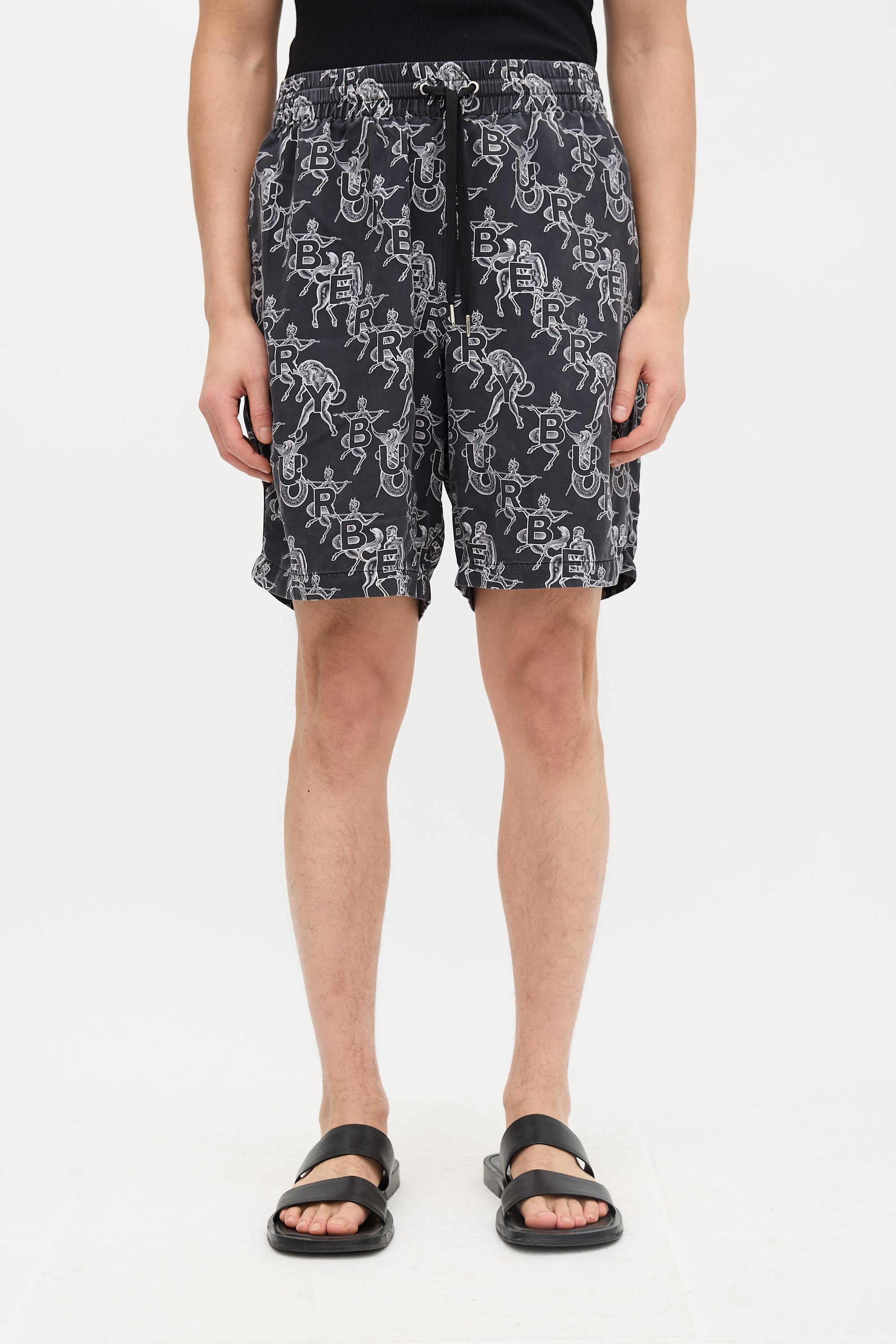 Pre-owned Burberry black and white silk shorts featuring all over logo with mythical motif, drawstring waist, and in seam pockets.