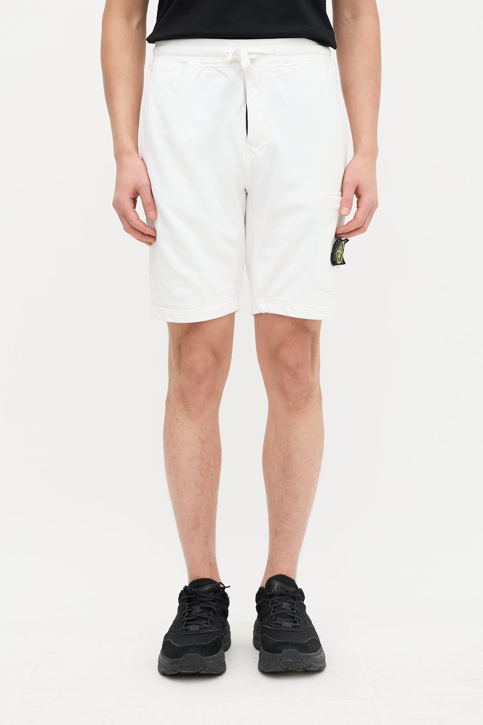 Pre-owned Stone Island white sweat shorts featuring drawstring waist, three pocket styling, patch pocket with removable patch logo at left side, and zip fly.