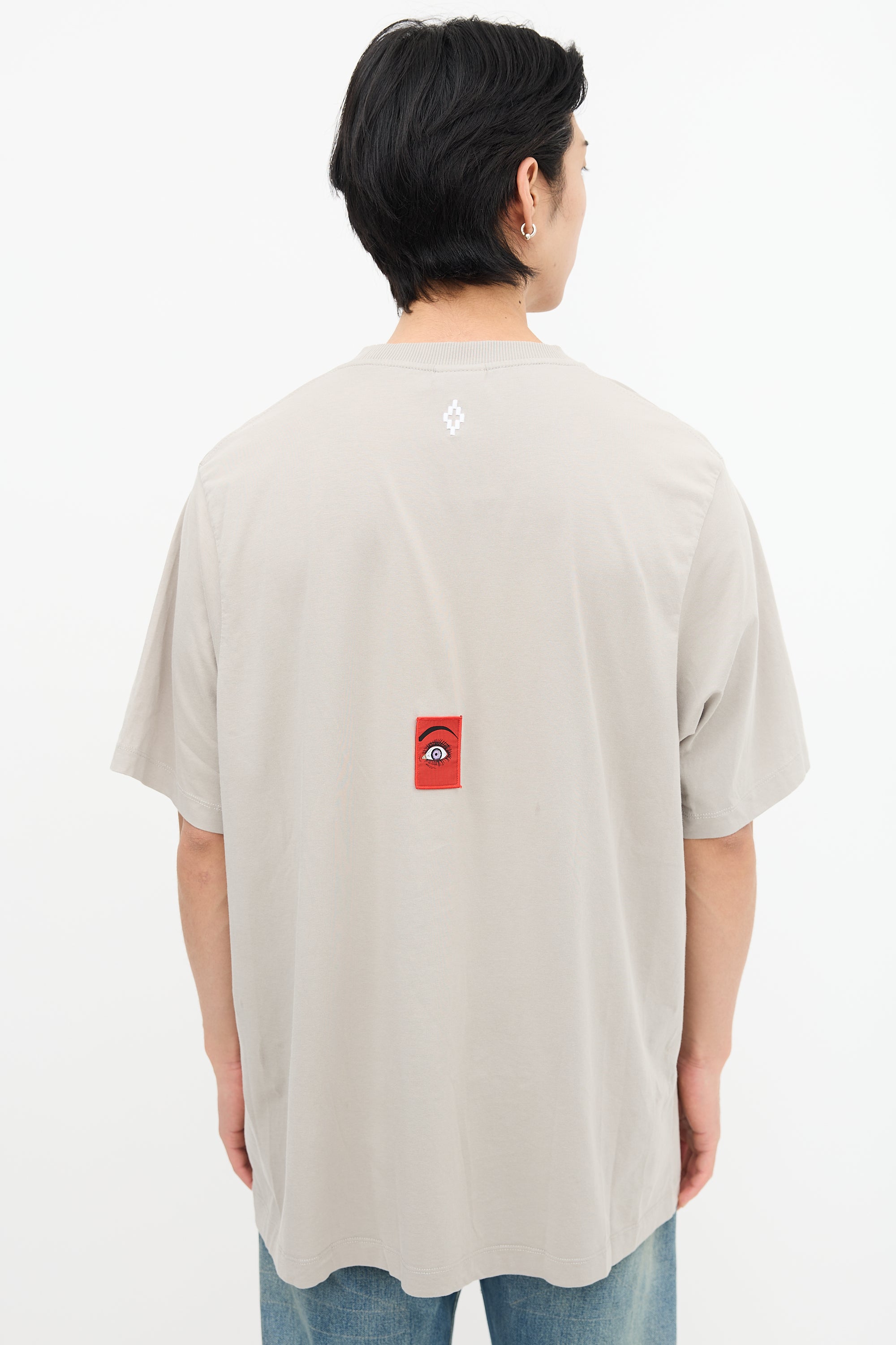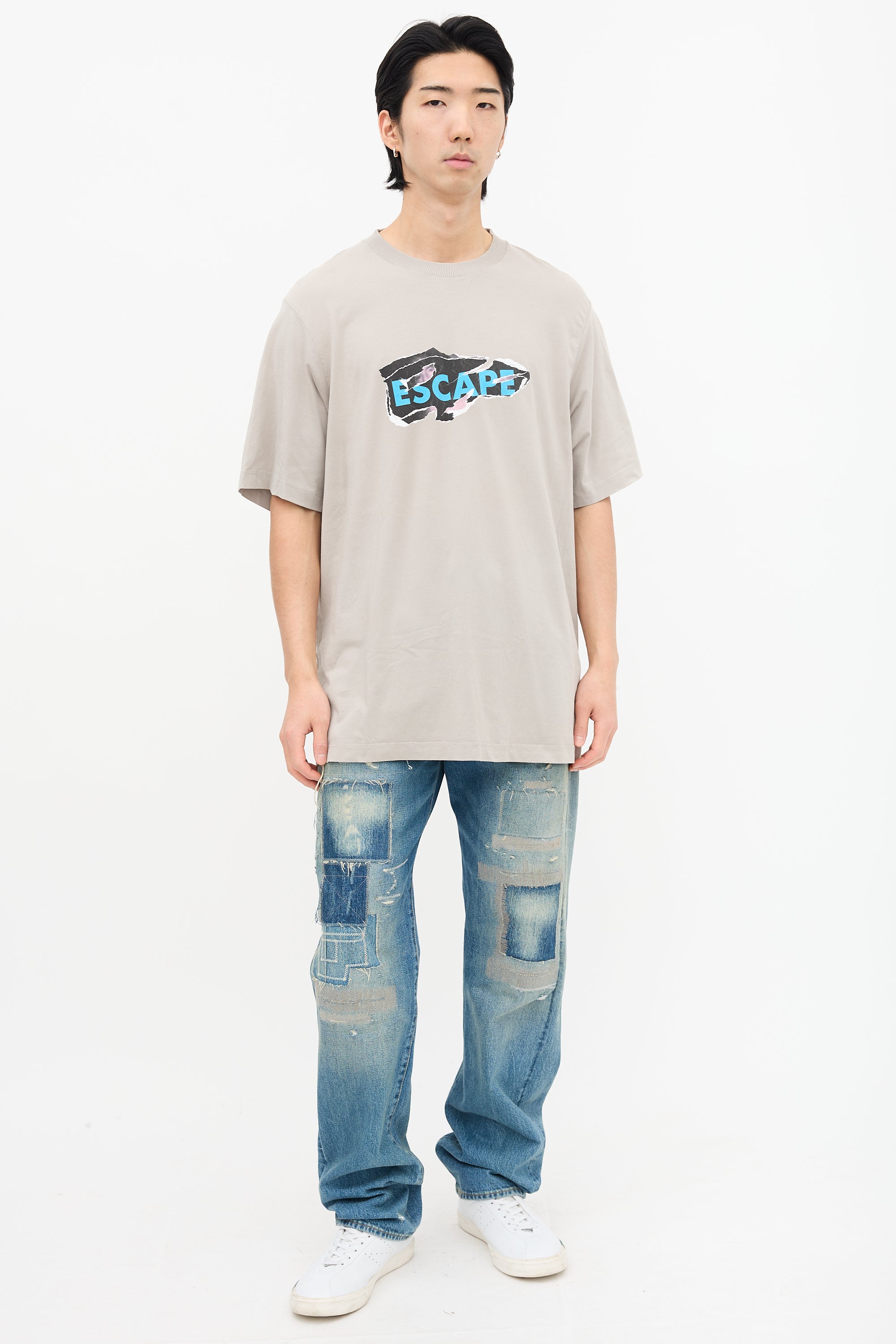 Pre-owned Marcelo Burlon grey T-shirt featuring a ribbed round neckline, multicolour "Escape" graphic front, and embroidered motif at back neck, and red eye motif patch at centre back.