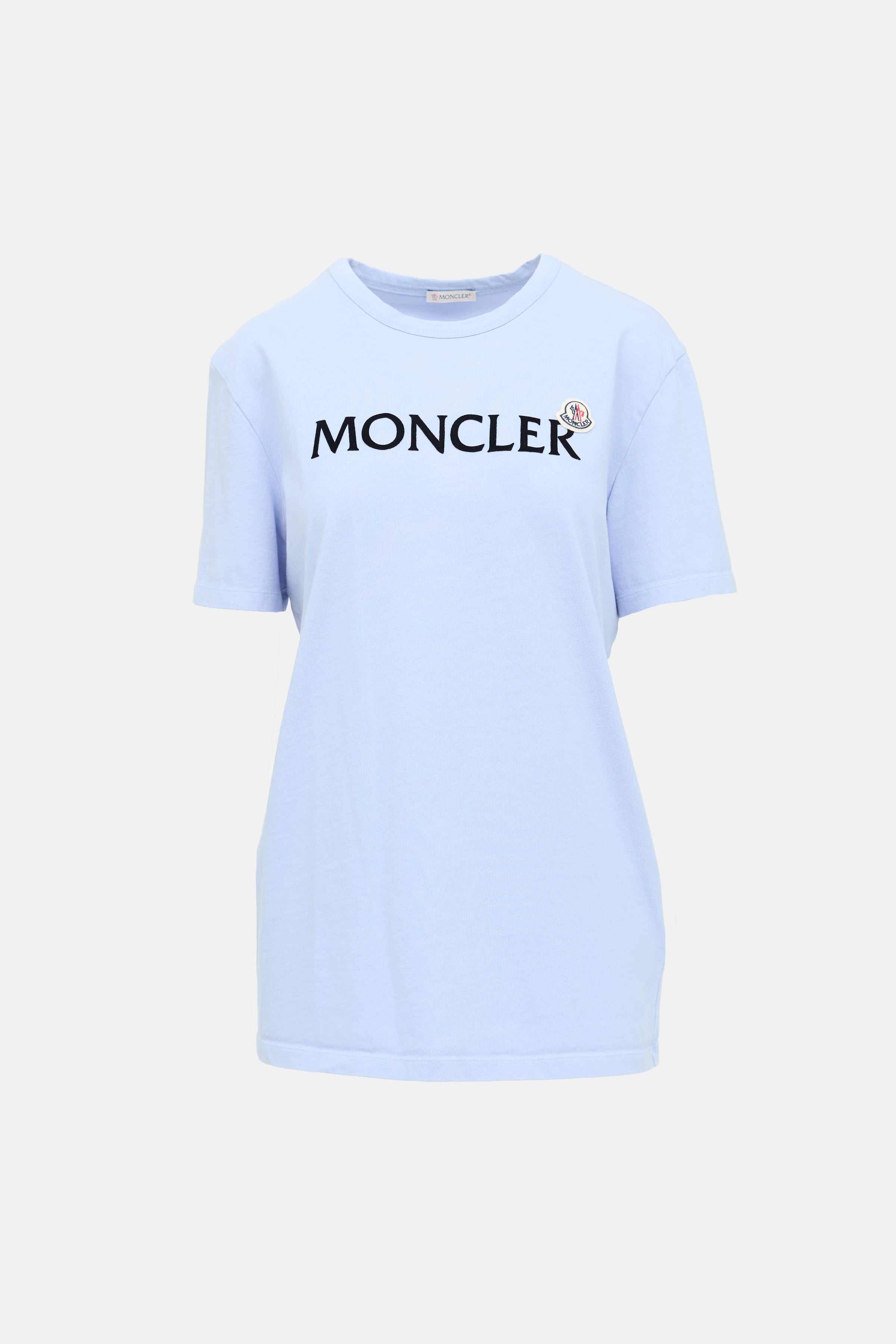 Pre-owned Moncler blue T-shirt featuring a black flocked logo at chest with embroidered logo patch, crew neckline, and short sleeves.