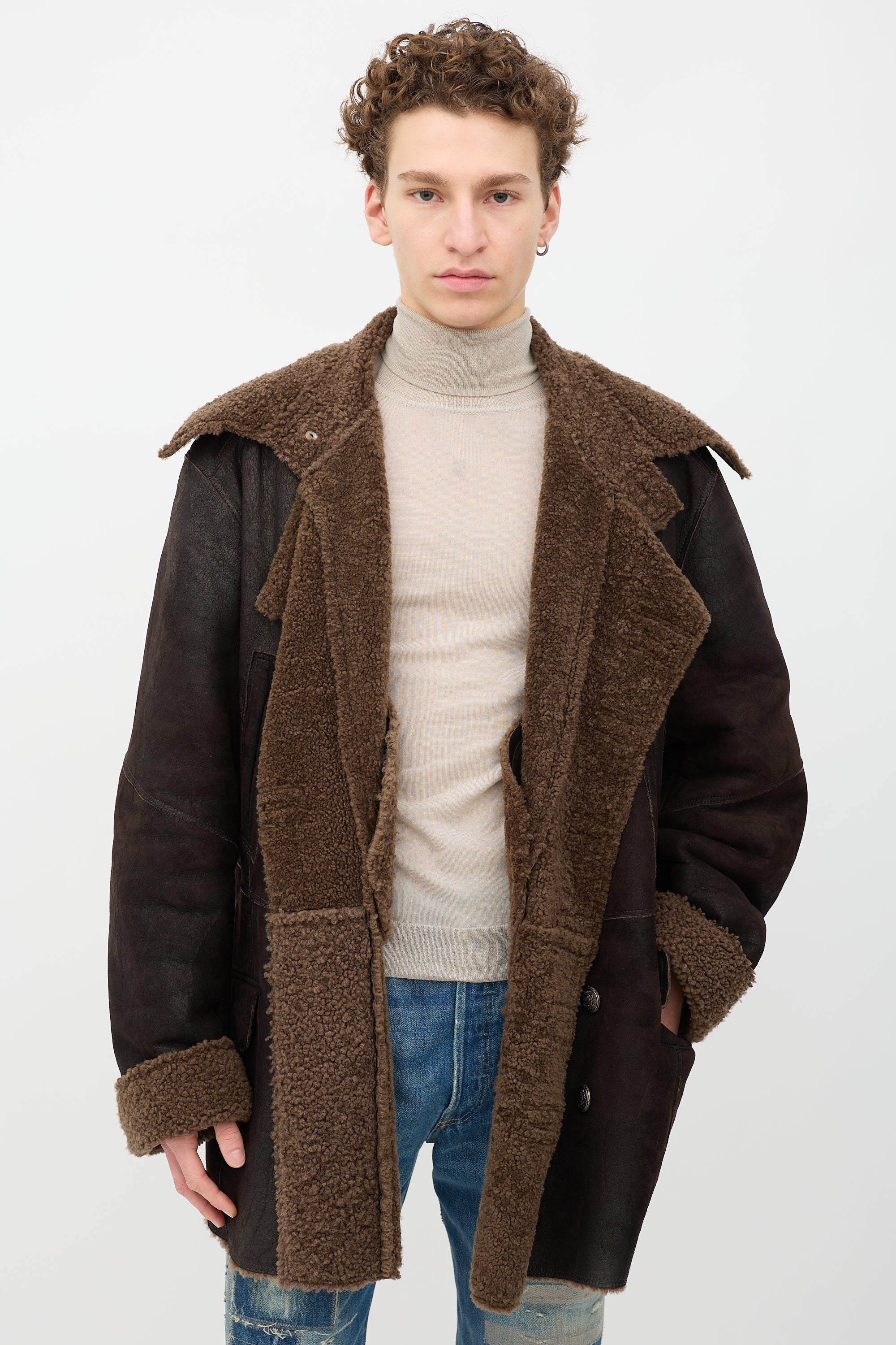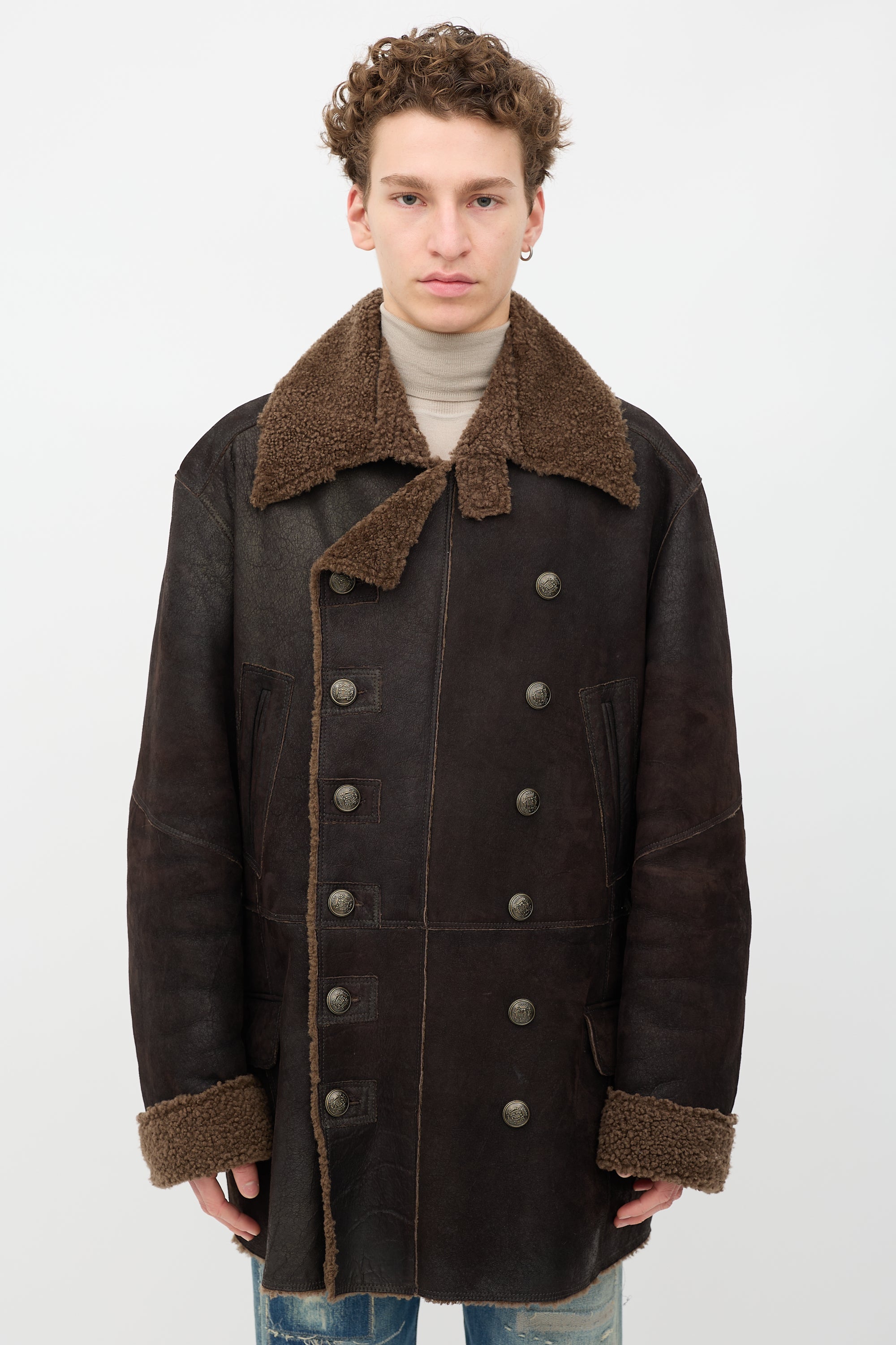 Pre-owned Dolce & Gabbana brown shearling coat featuring wide collar and lapel with strap closure, double breasted button up front, four front pockets, and foldover cuffs.