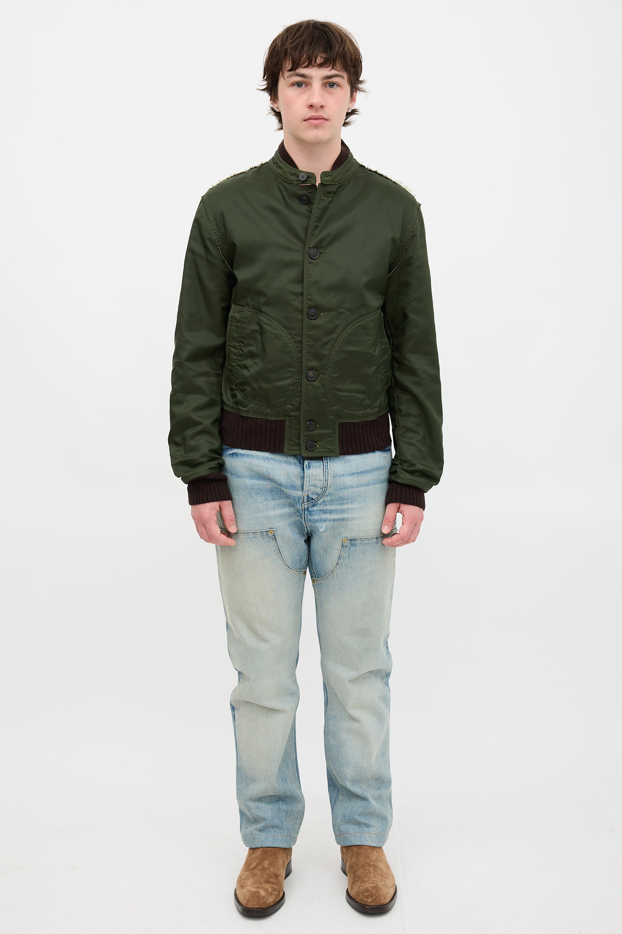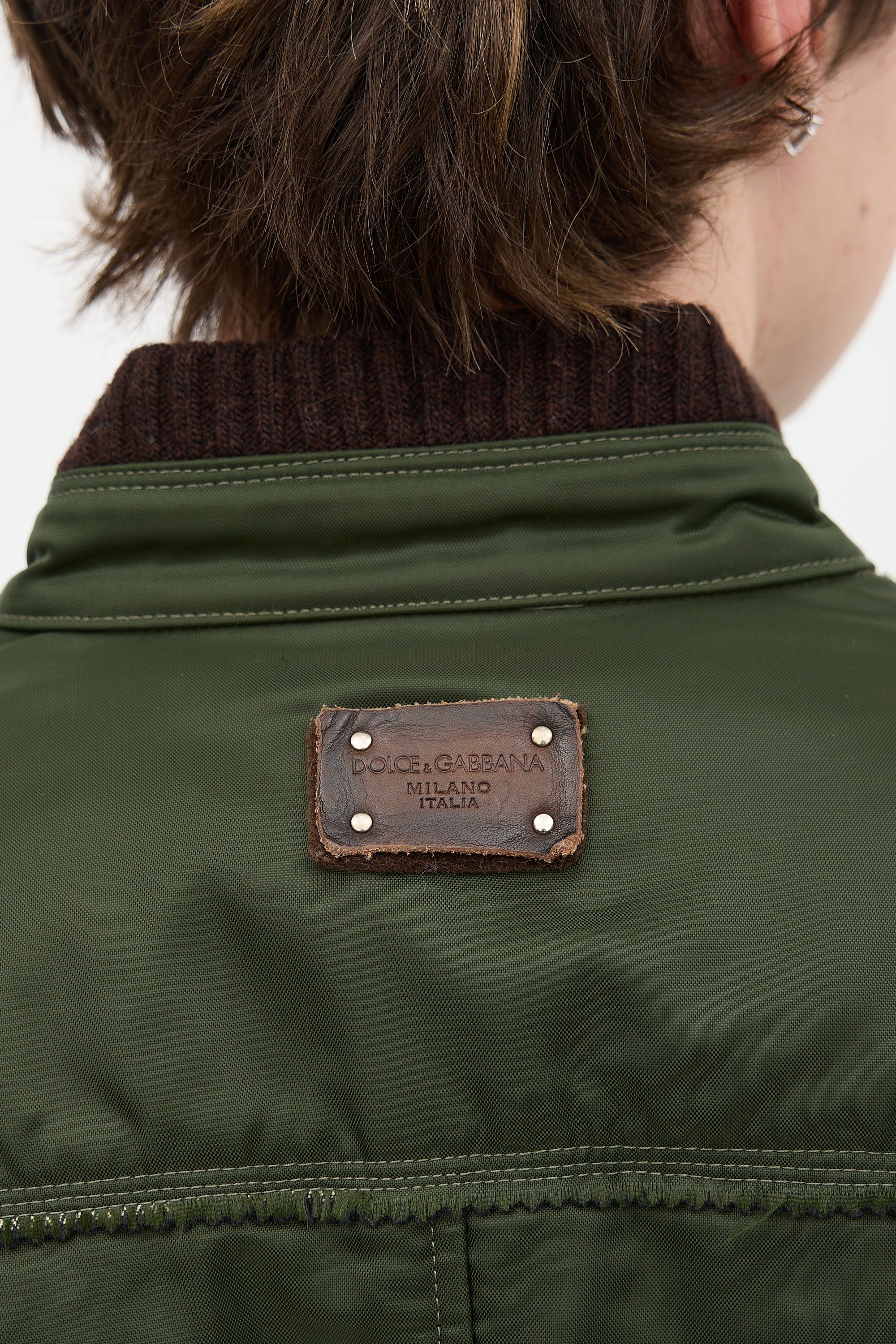 Pre-owned Dolce & Gabbana green nylon bomber jacket featuring a brown ribbed stand collar, button front, two welt pockets at front, frayed trims at shoulder, leather logo patch at back collar, herringbone lining, and a ribbed hem and cuffs.