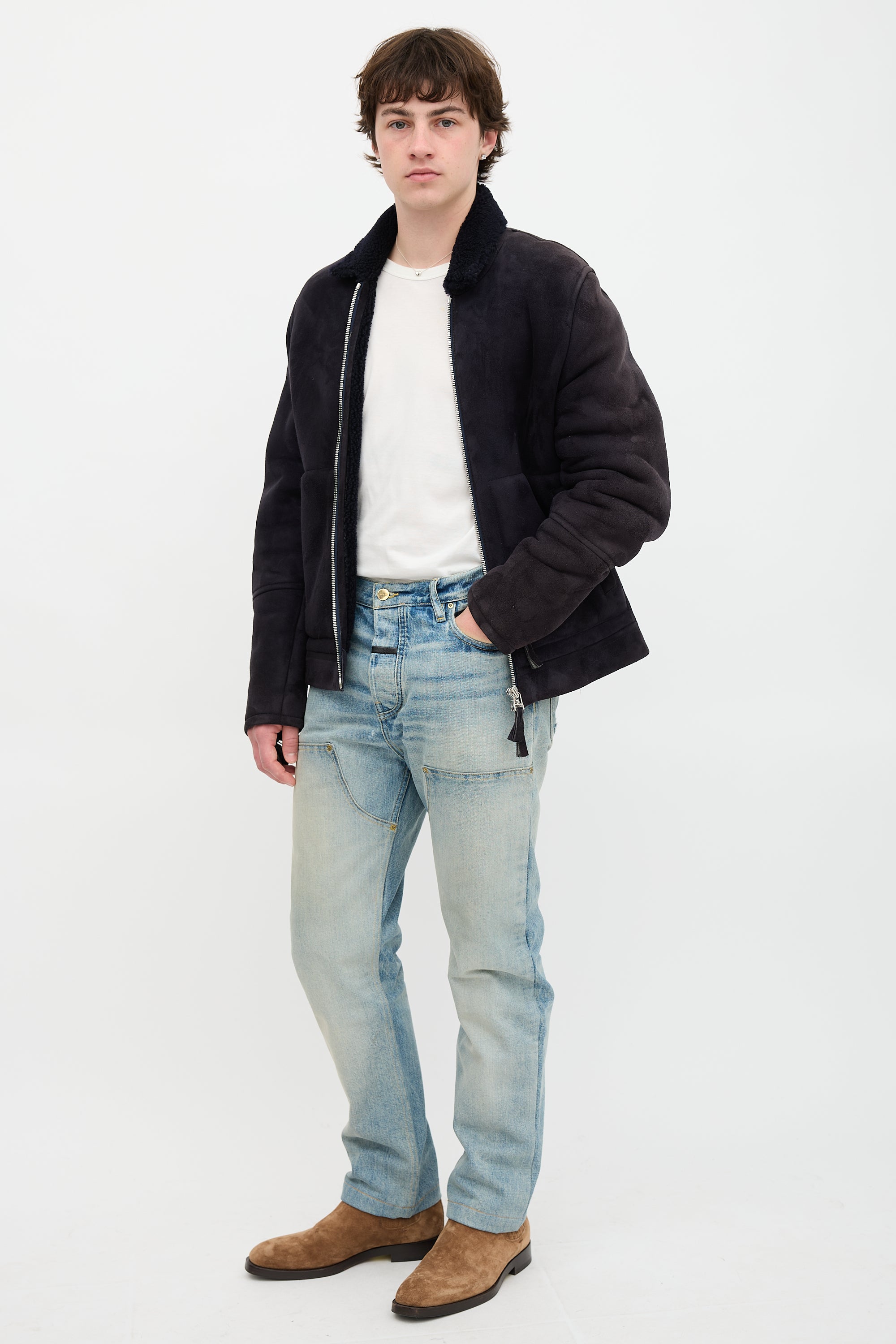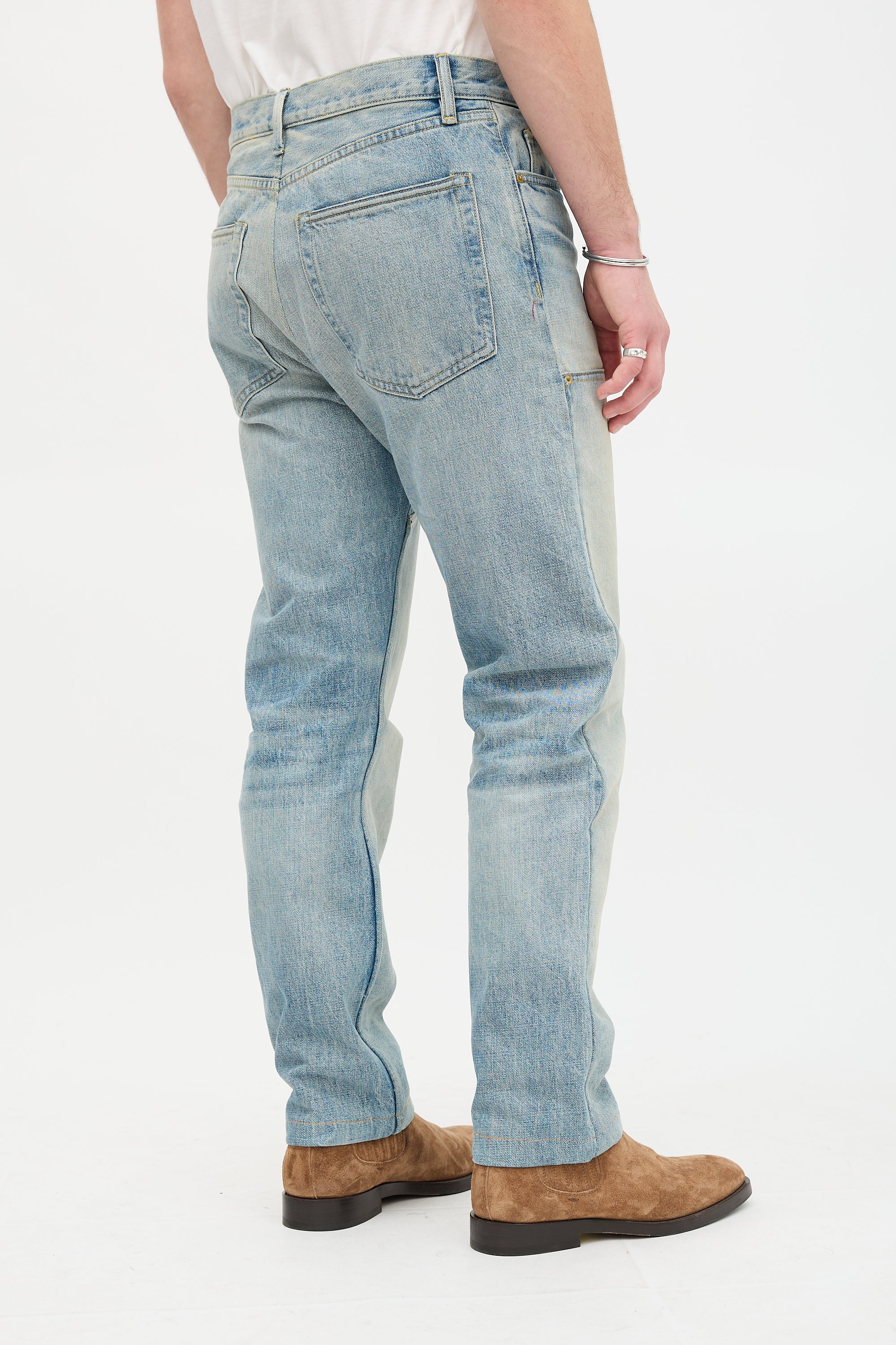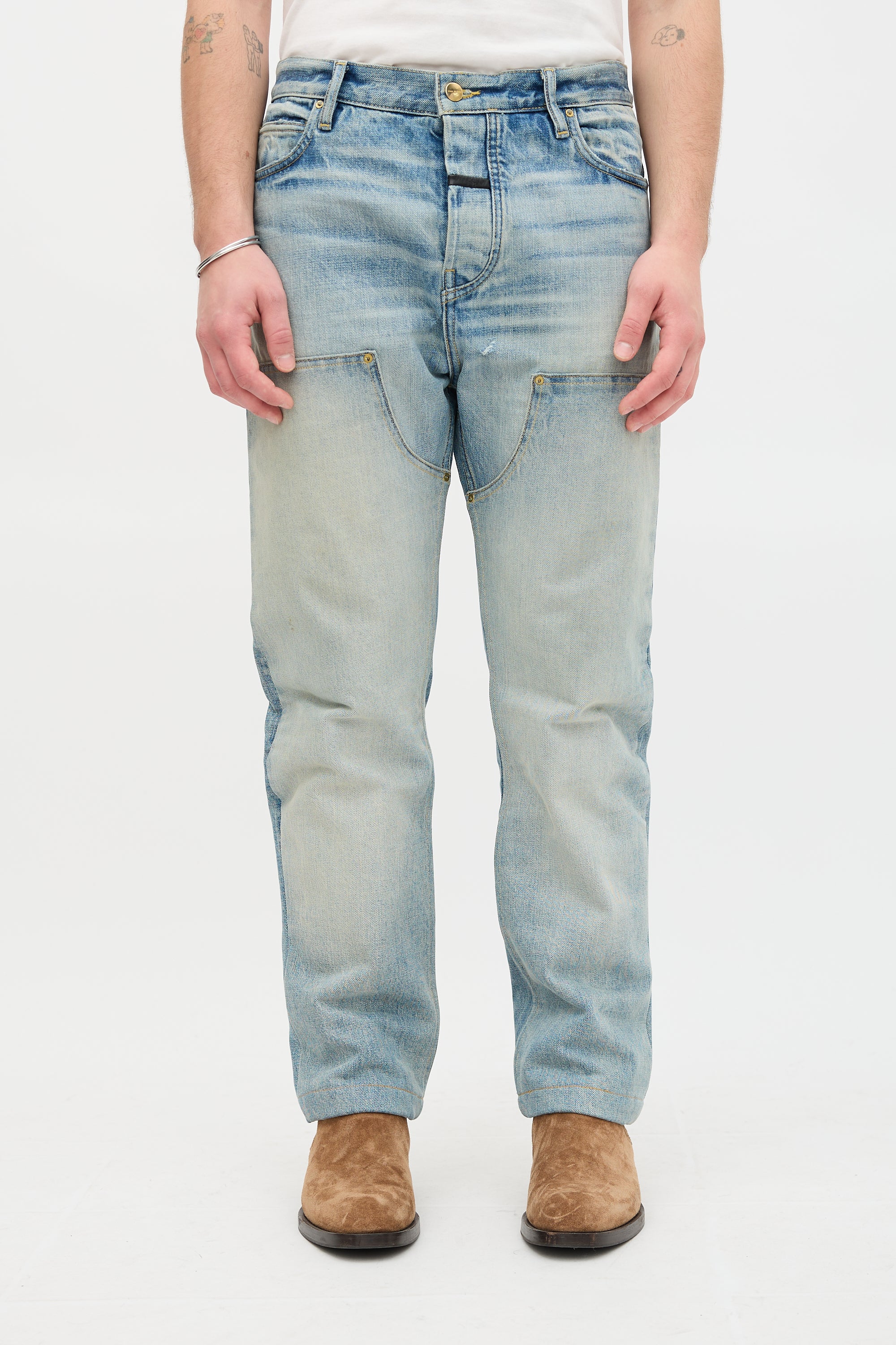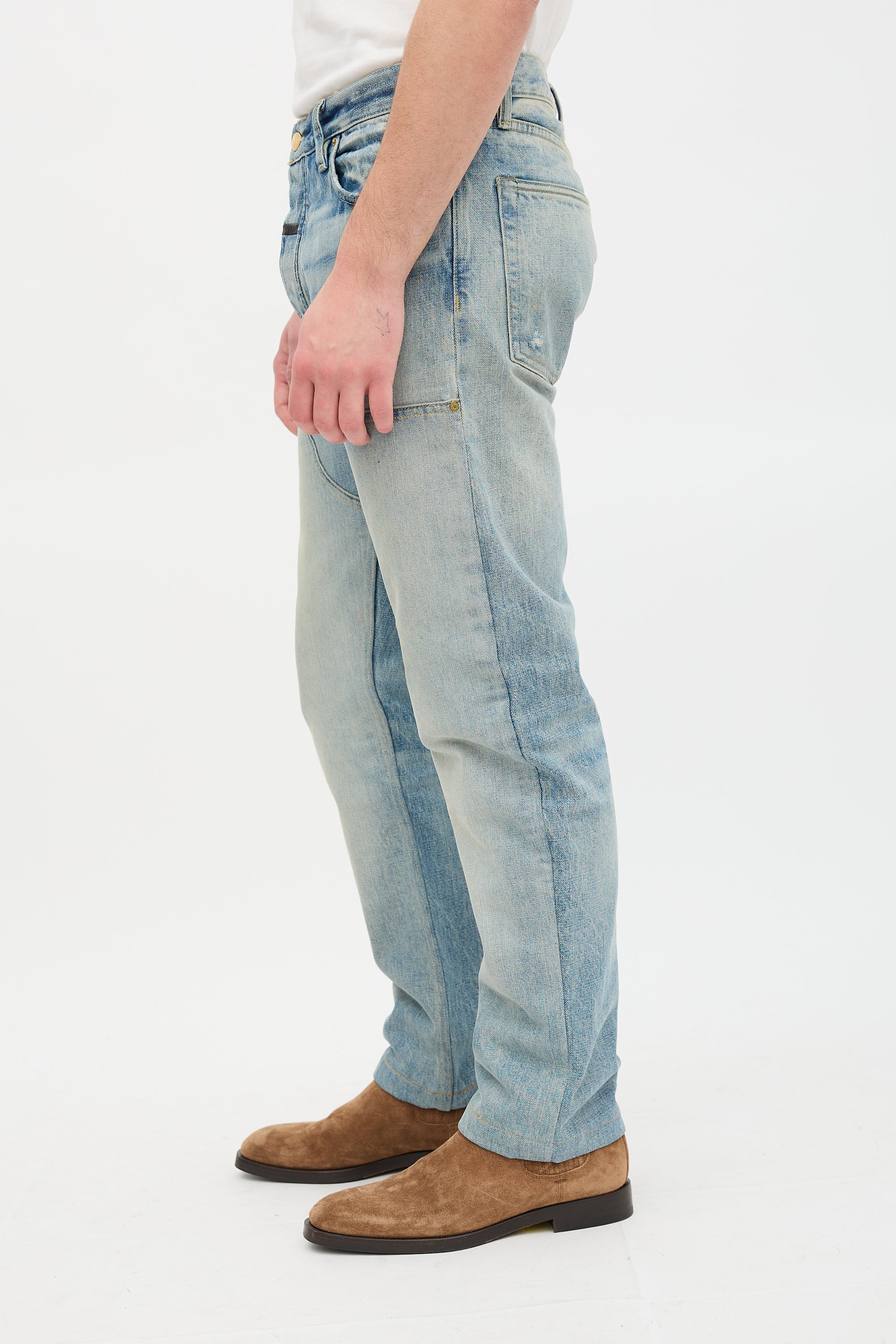 Pre-owned Fear of God light wash straight leg jeans featuring a button fly with black leather logo applique, belt loops, five pocket styling, and double panelled knees with rivets.