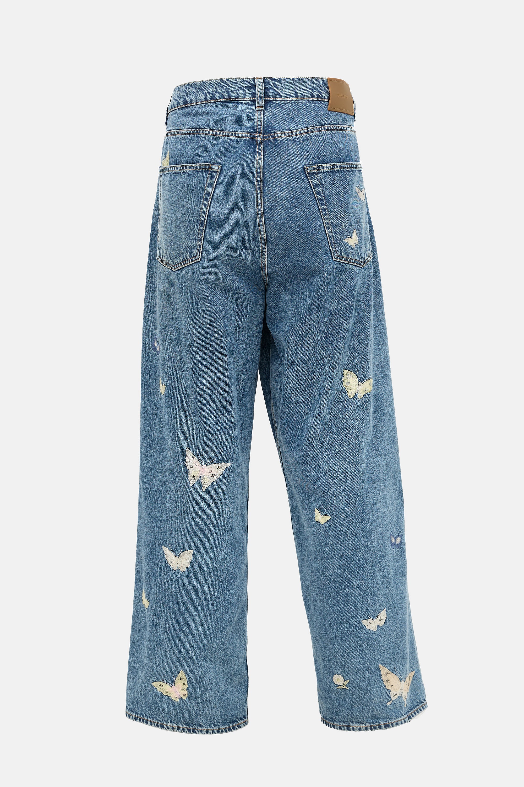 Pre-owned Our Legacy medium wash Vast Cut Butterfly jeans featuring a zip fly, five pocket styling, yellow and blue embroidered butterflies throughout, brown rubber logo patch, and a wide straight leg.
