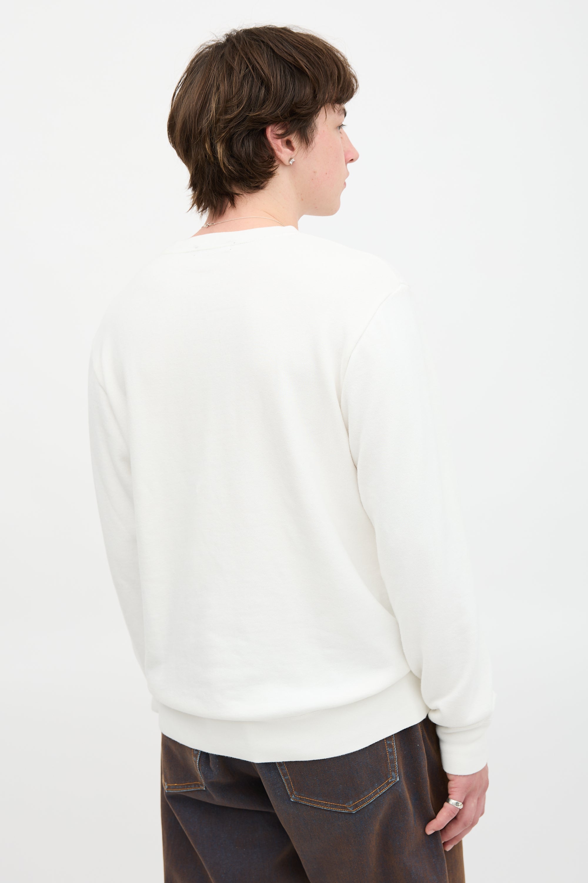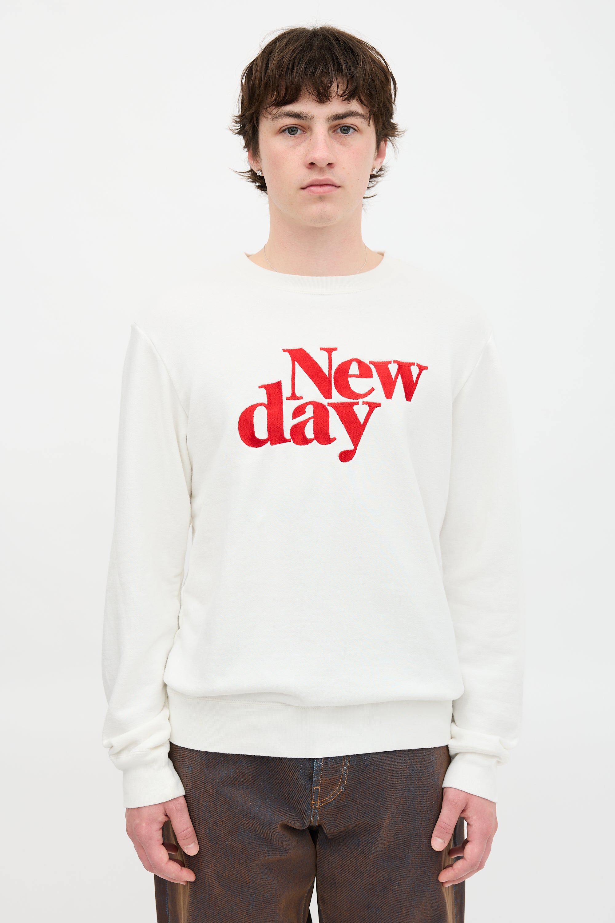 Pre-owned Undercover white New Day sweatshirt featuring a red embroidery at front, a ribbed crew neck collar, and a ribbed hem and cuffs.