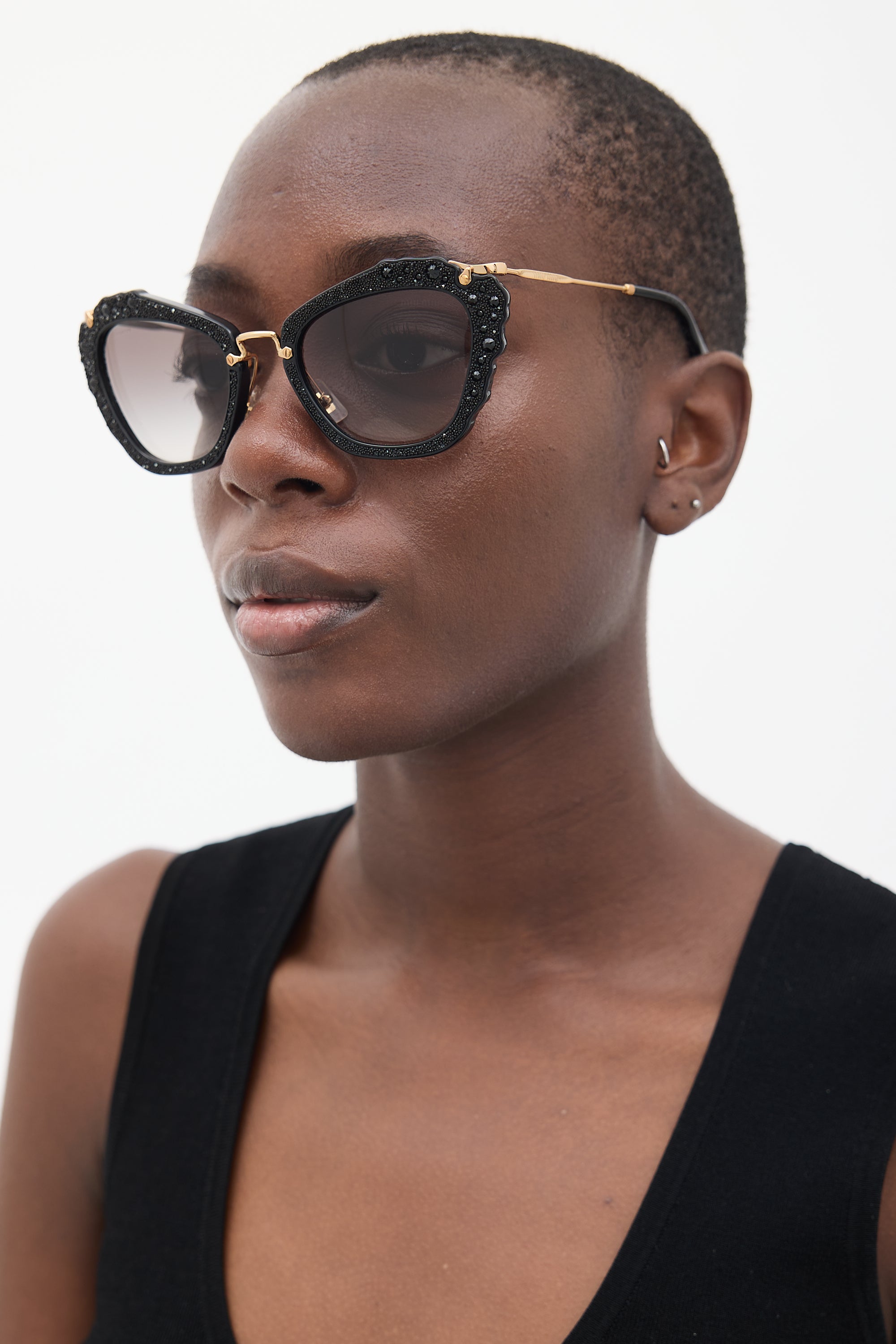 Pre-owned Miu Miu black SMU04Q cateye sunglasses featuring a glitter crystal embellished frame, tinted lenses, adjustable nose pads, gold tone wire arms, and engraved logo at temples.