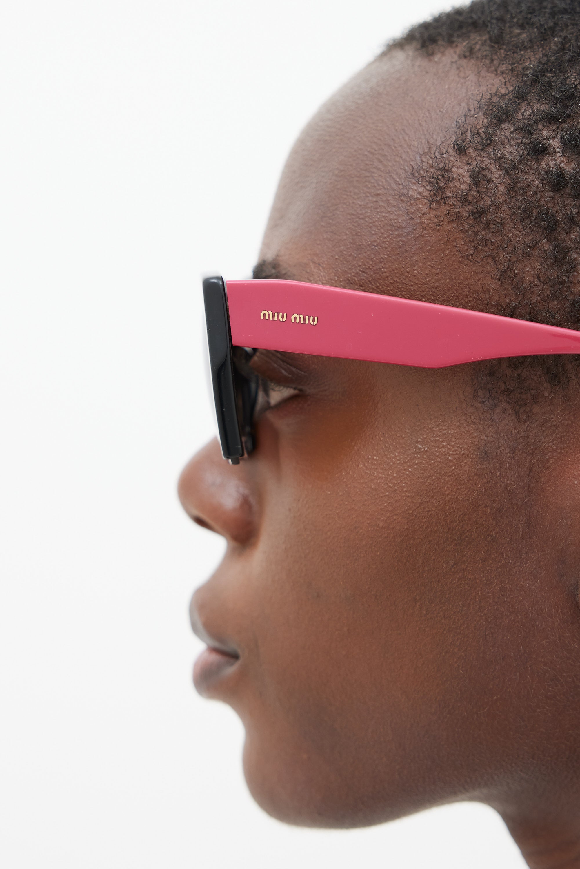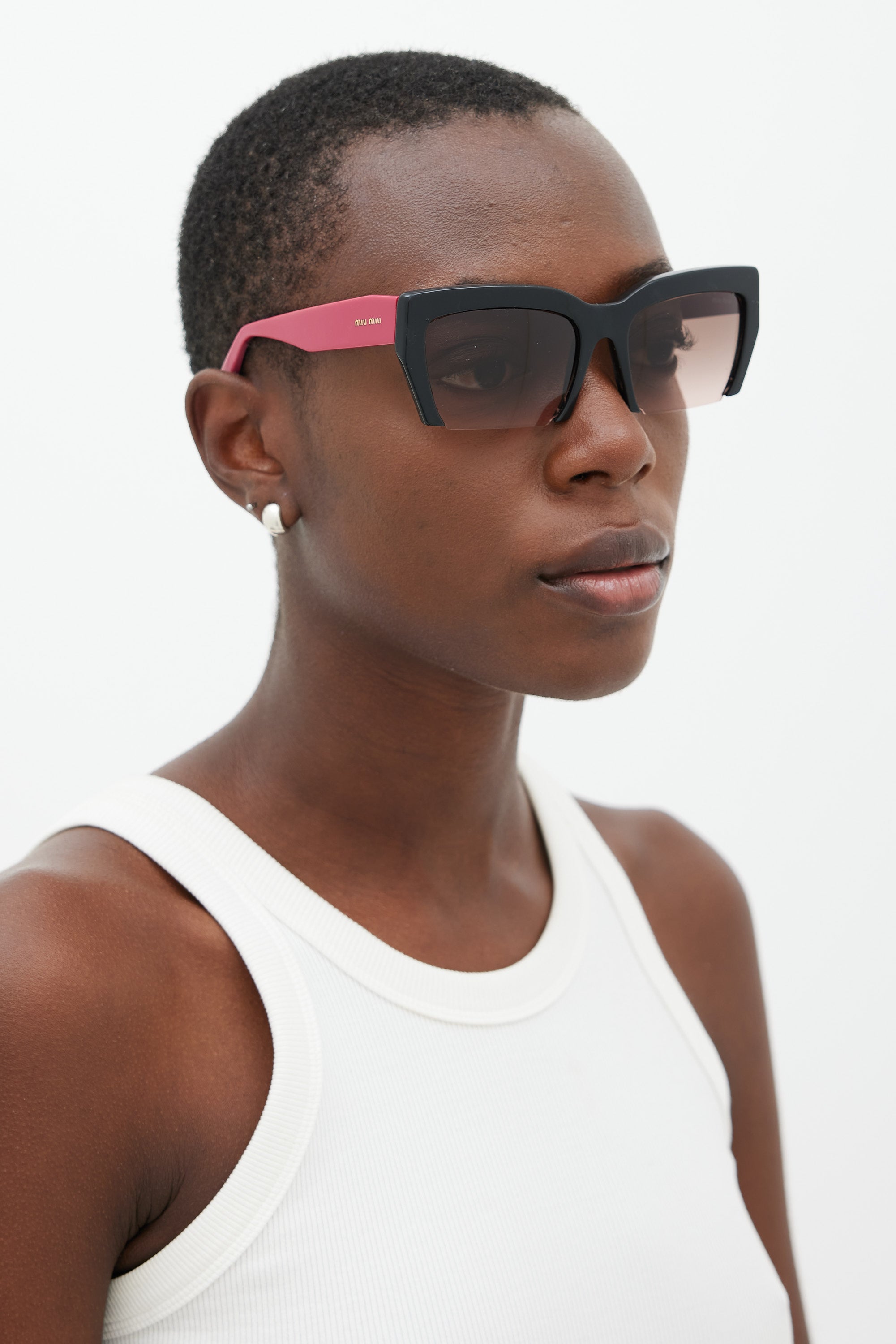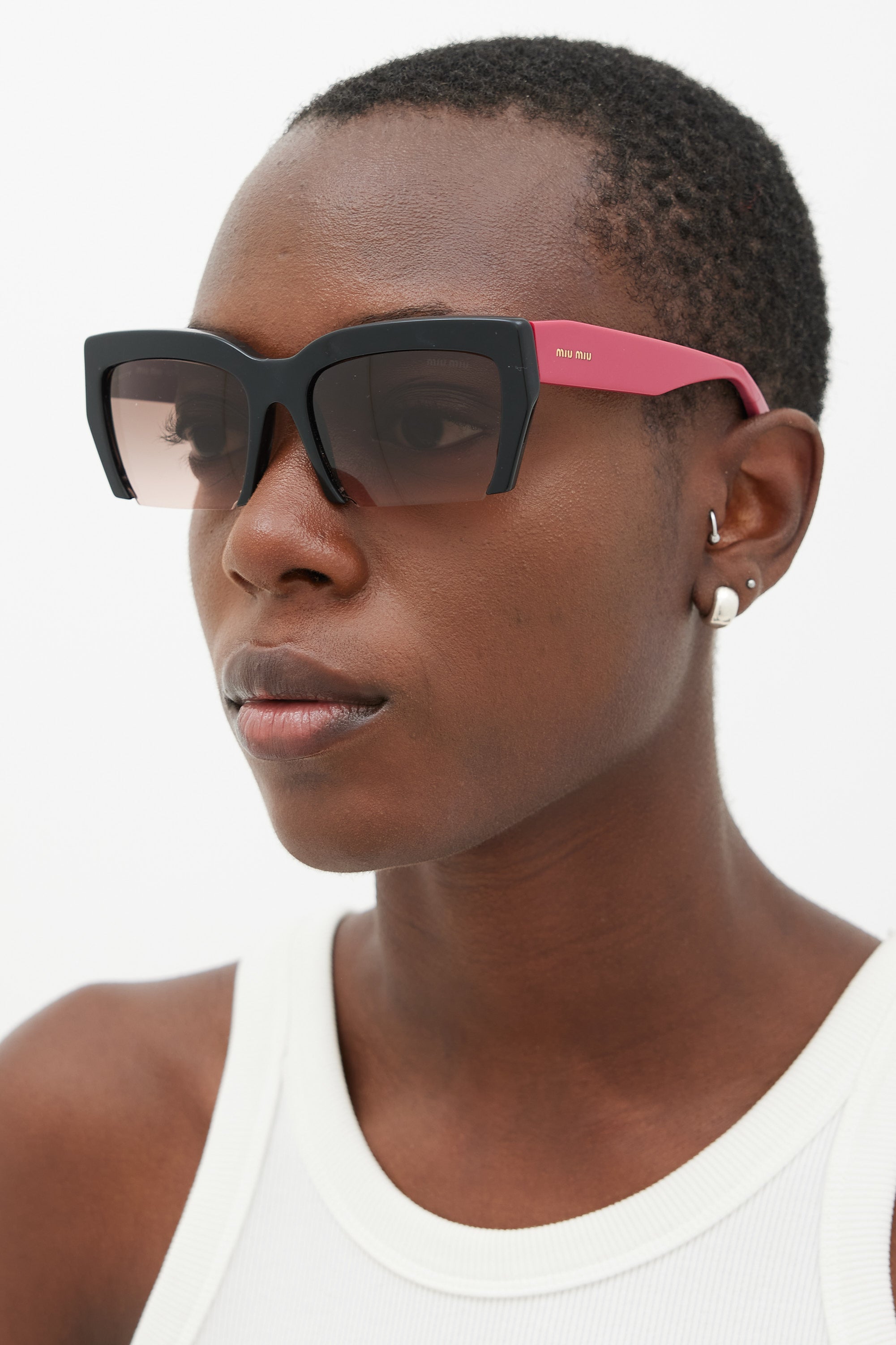 Pre-owned Miu Miu black SMU11O sunglasses featuring tinted lenses, nose pads, logo hardware at temples, and pink arms. Comes with original case.