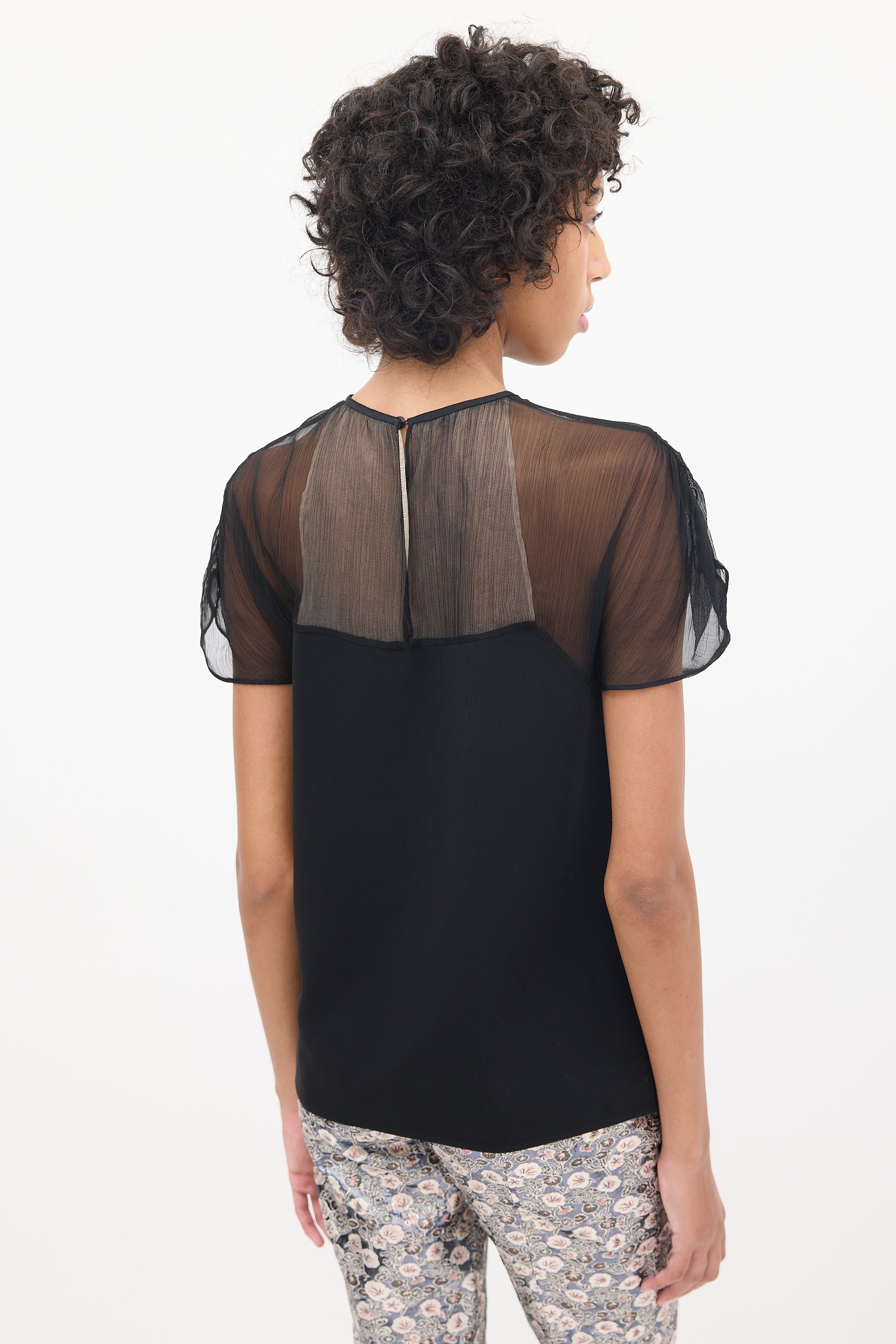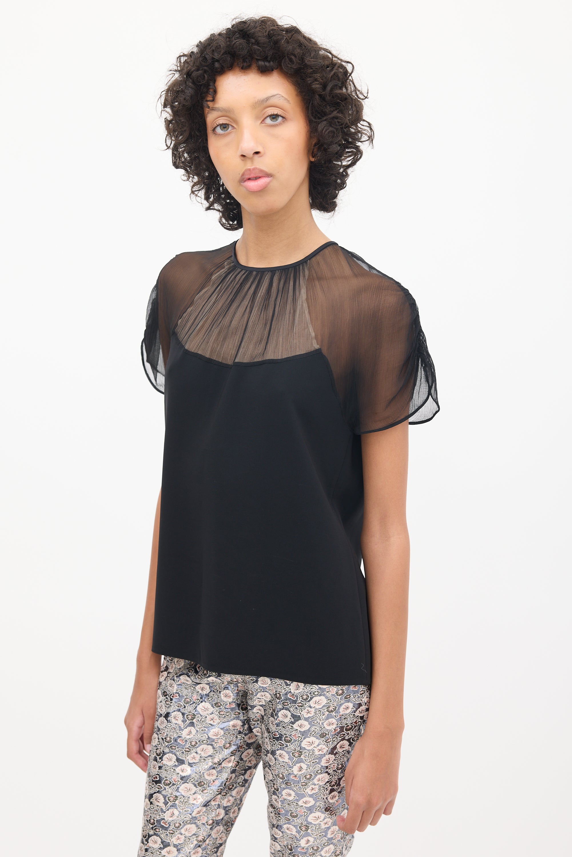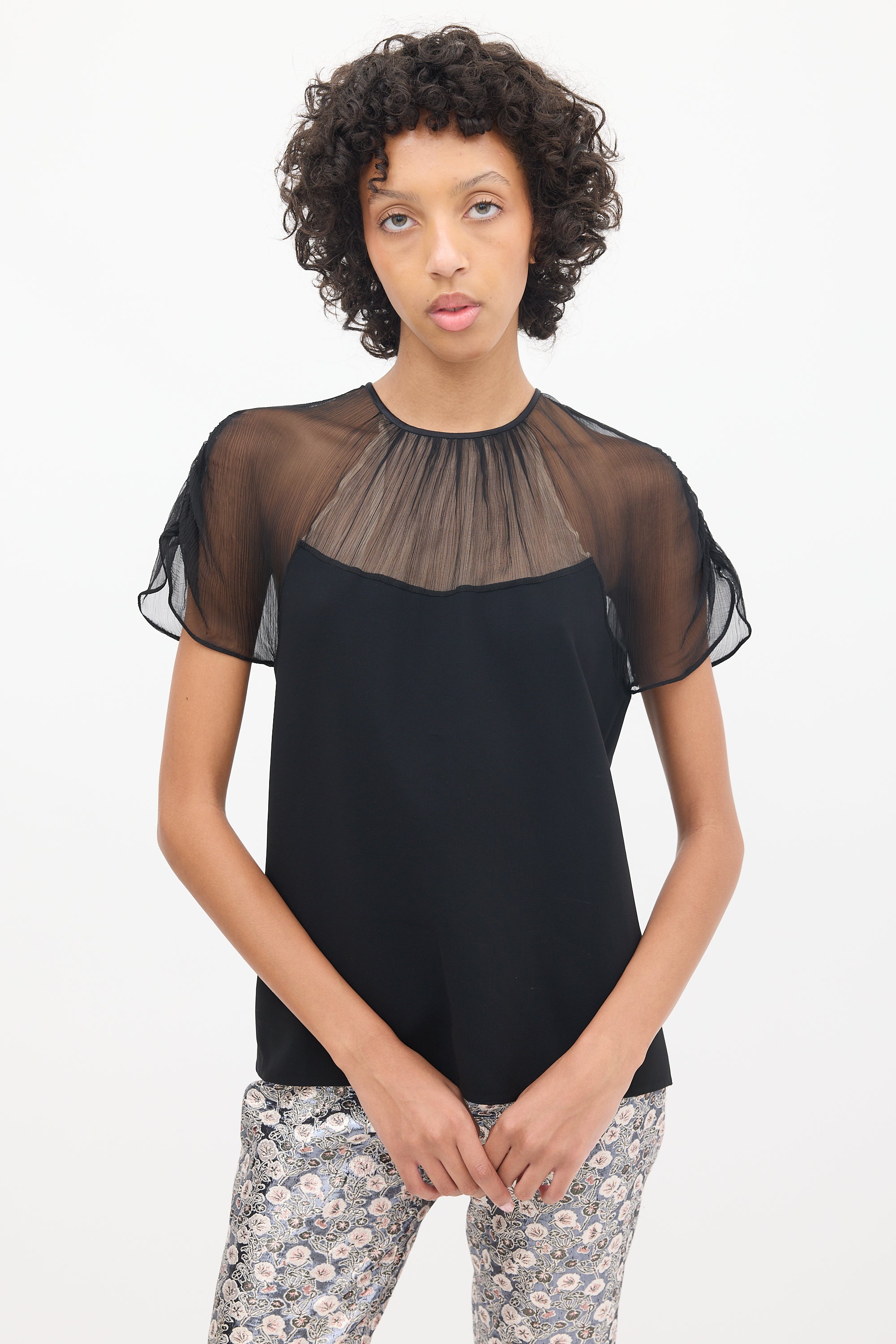 Pre-owned Miu Miu black top featuring a round gathered neckline, sheer plissé panelled top yoke with beige lining, upper centre back slit with top button fastening, even hem, and ruched short sleeves.