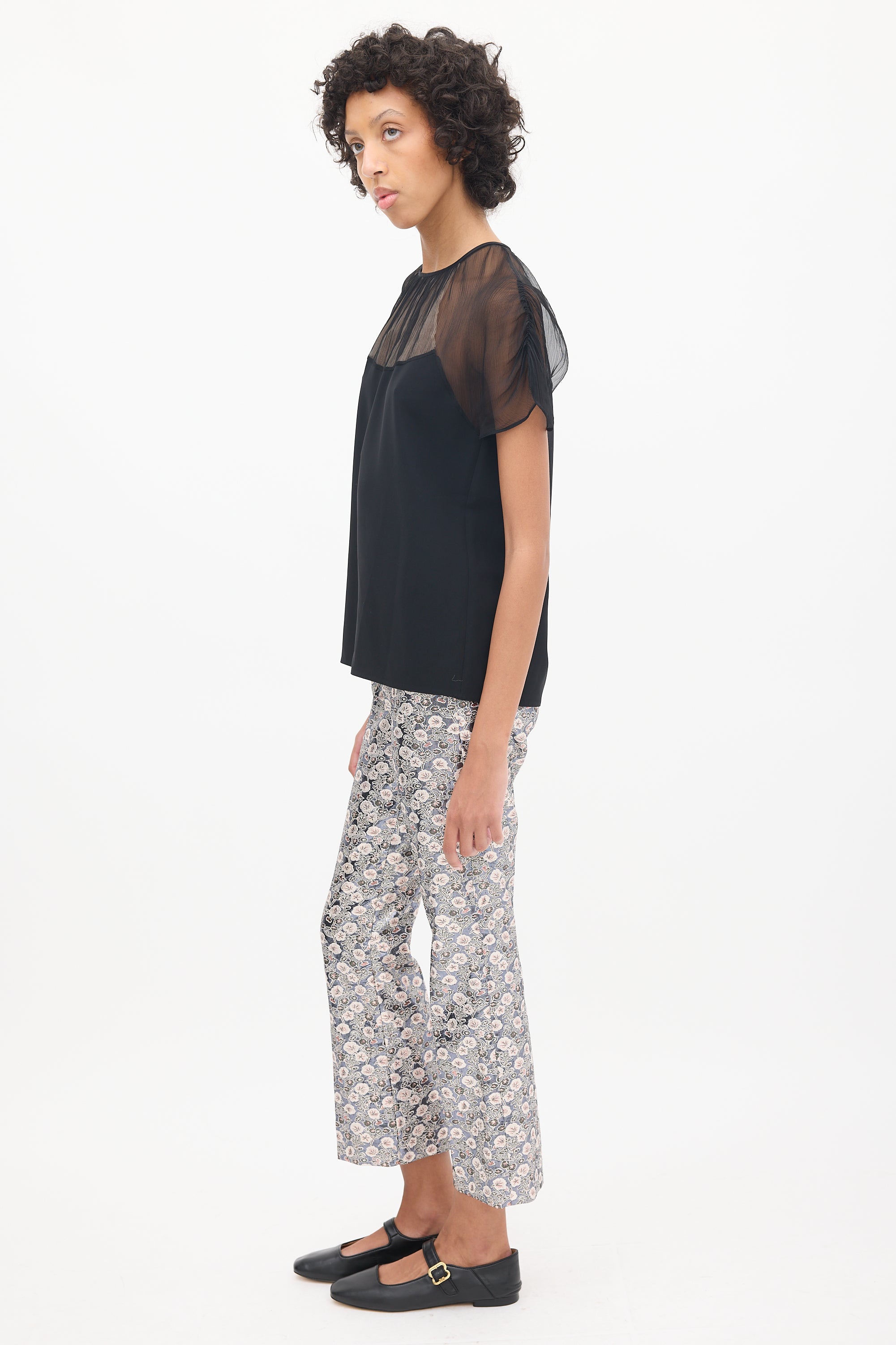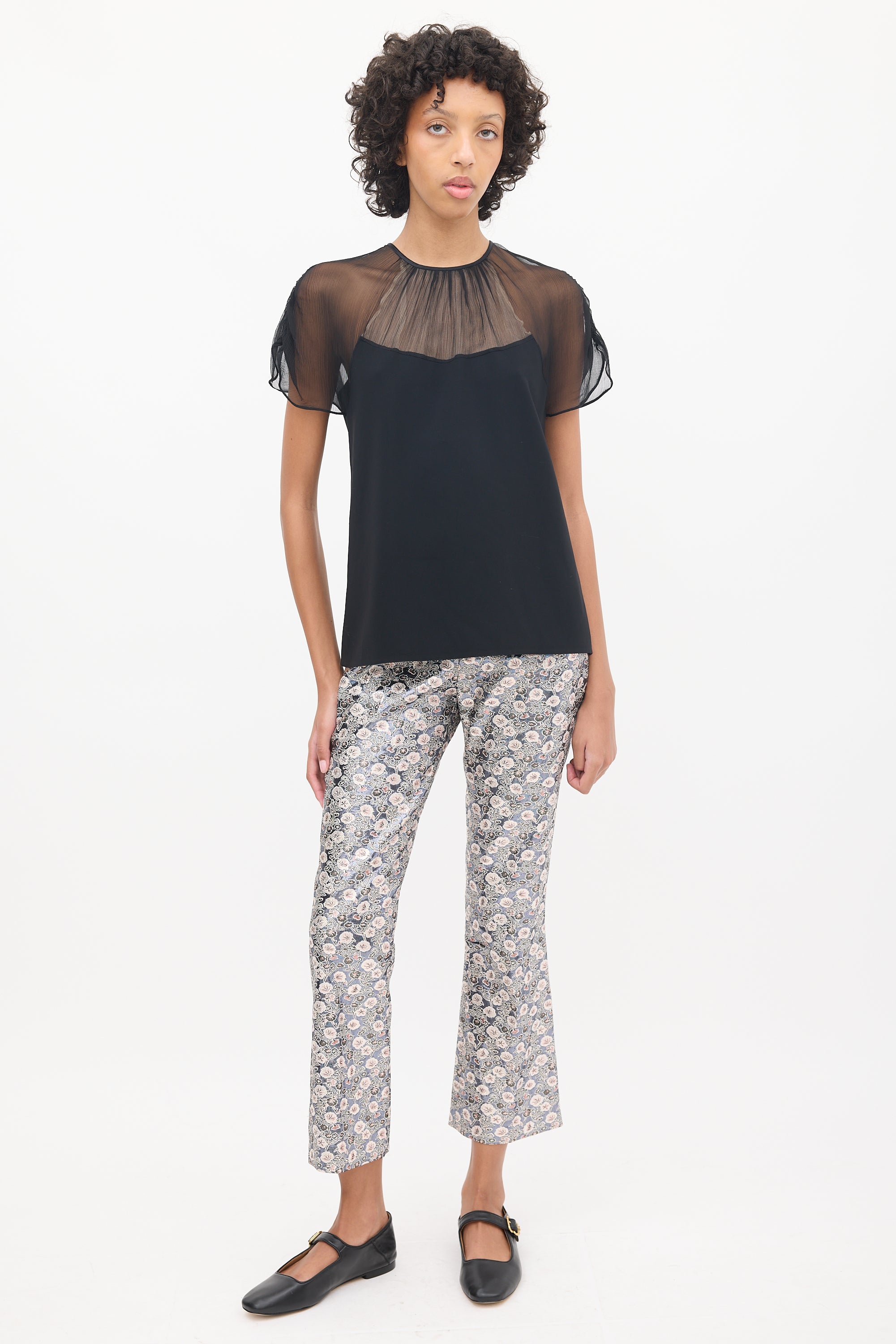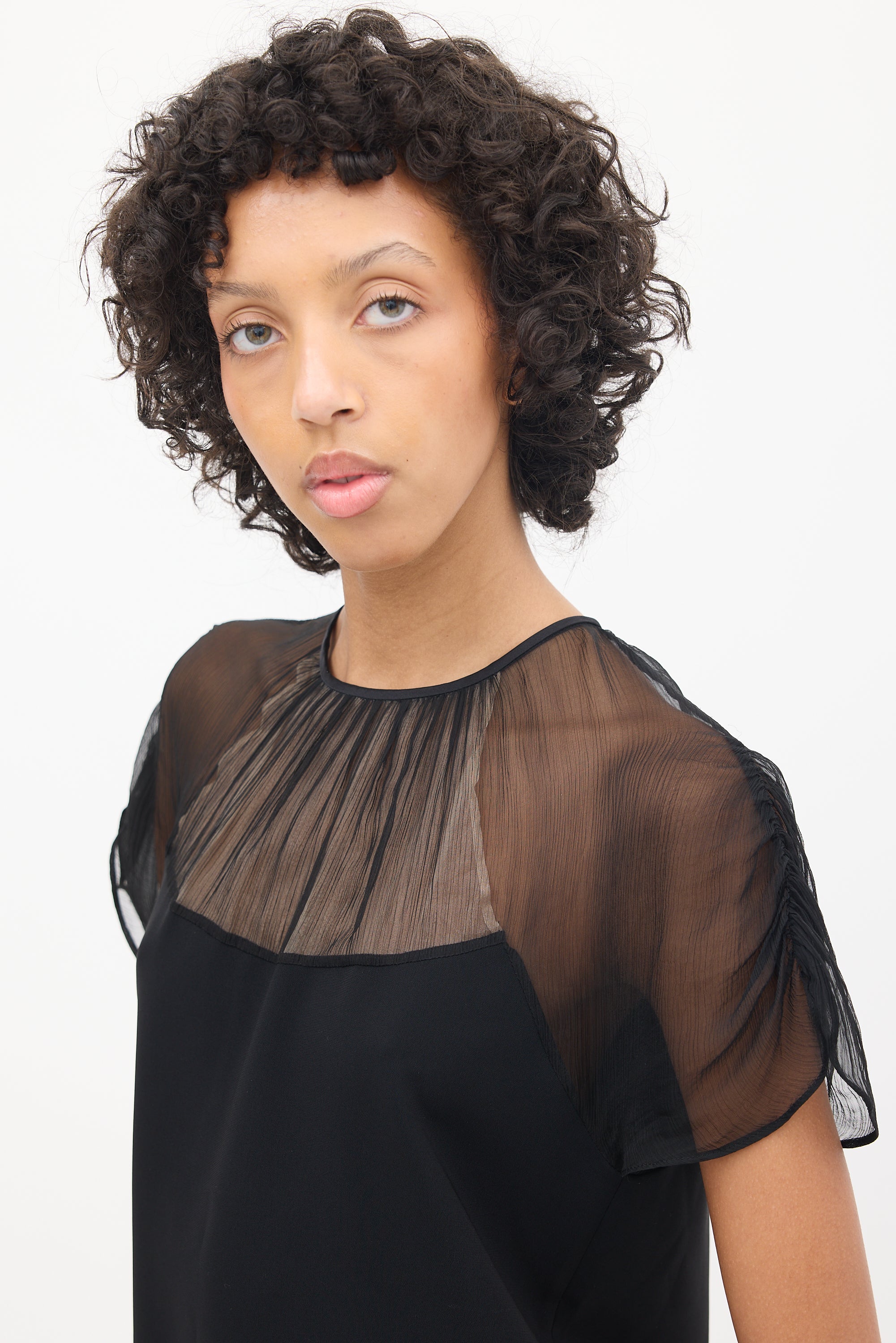 Pre-owned Miu Miu black top featuring a round gathered neckline, sheer plissé panelled top yoke with beige lining, upper centre back slit with top button fastening, even hem, and ruched short sleeves.