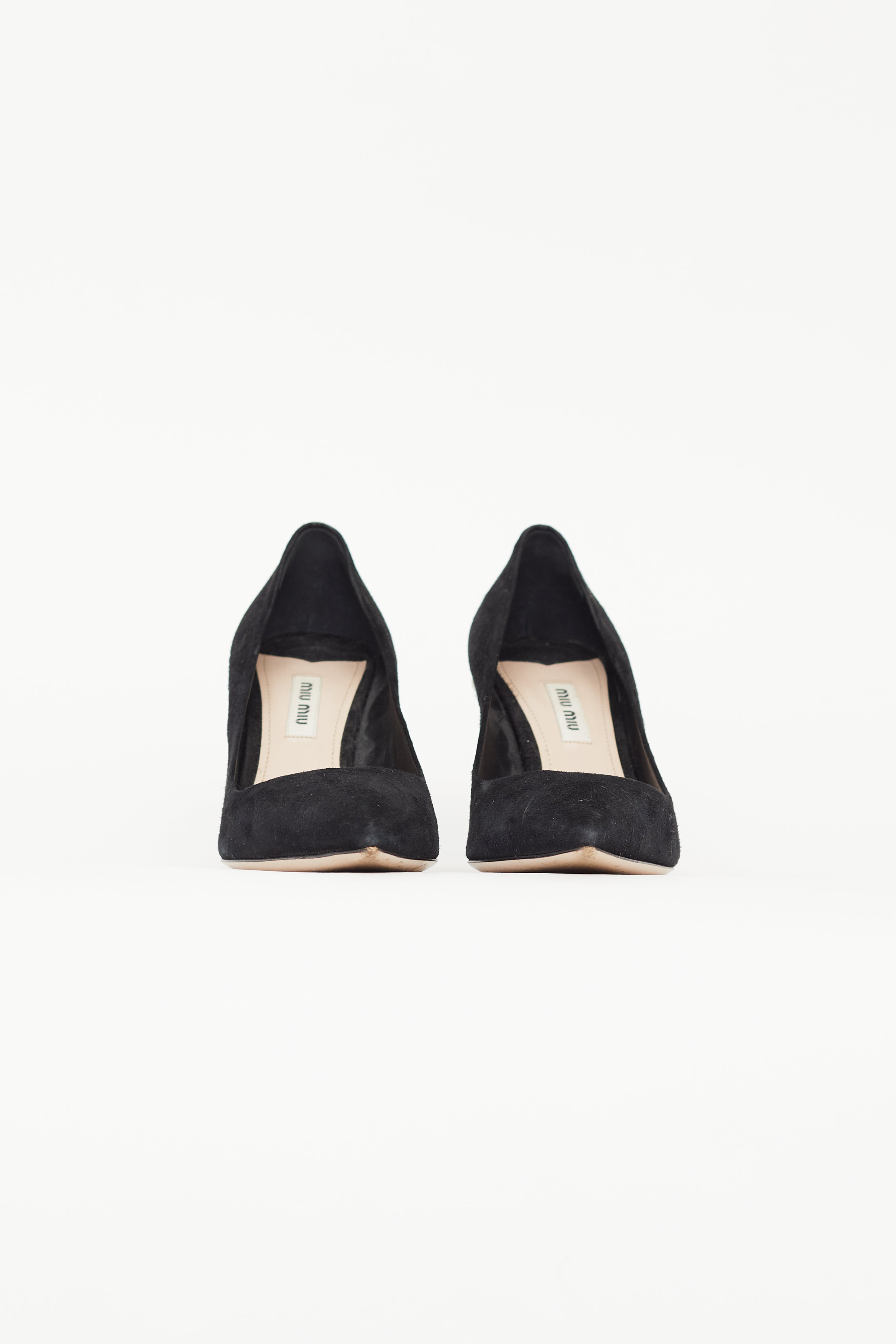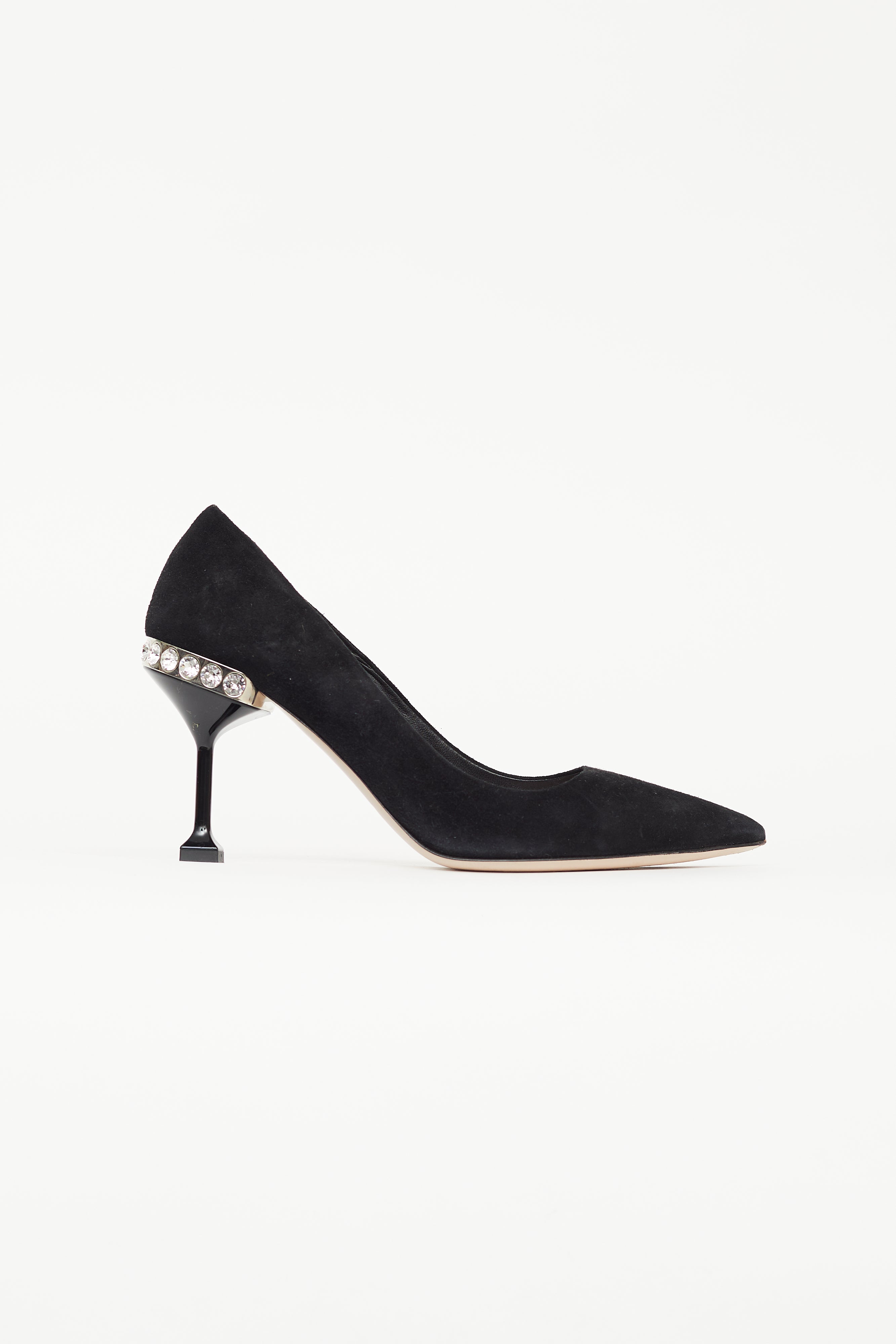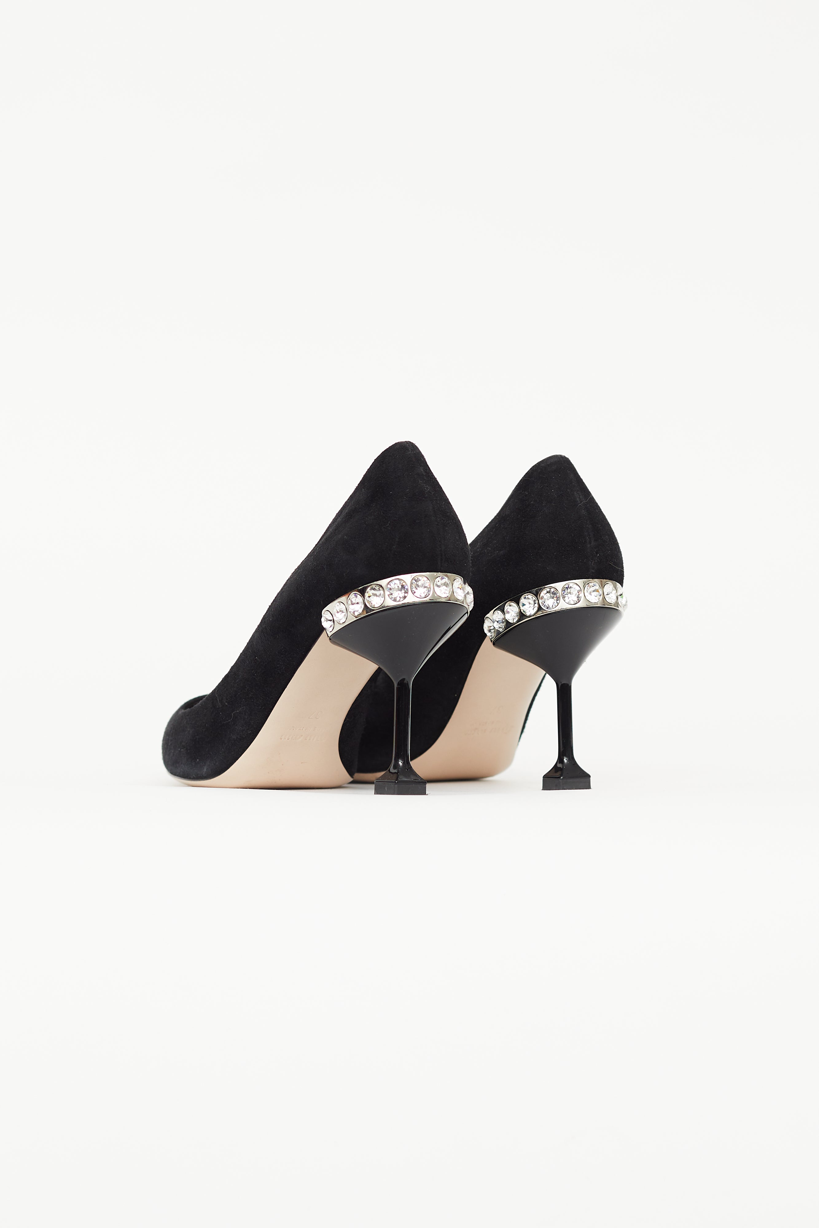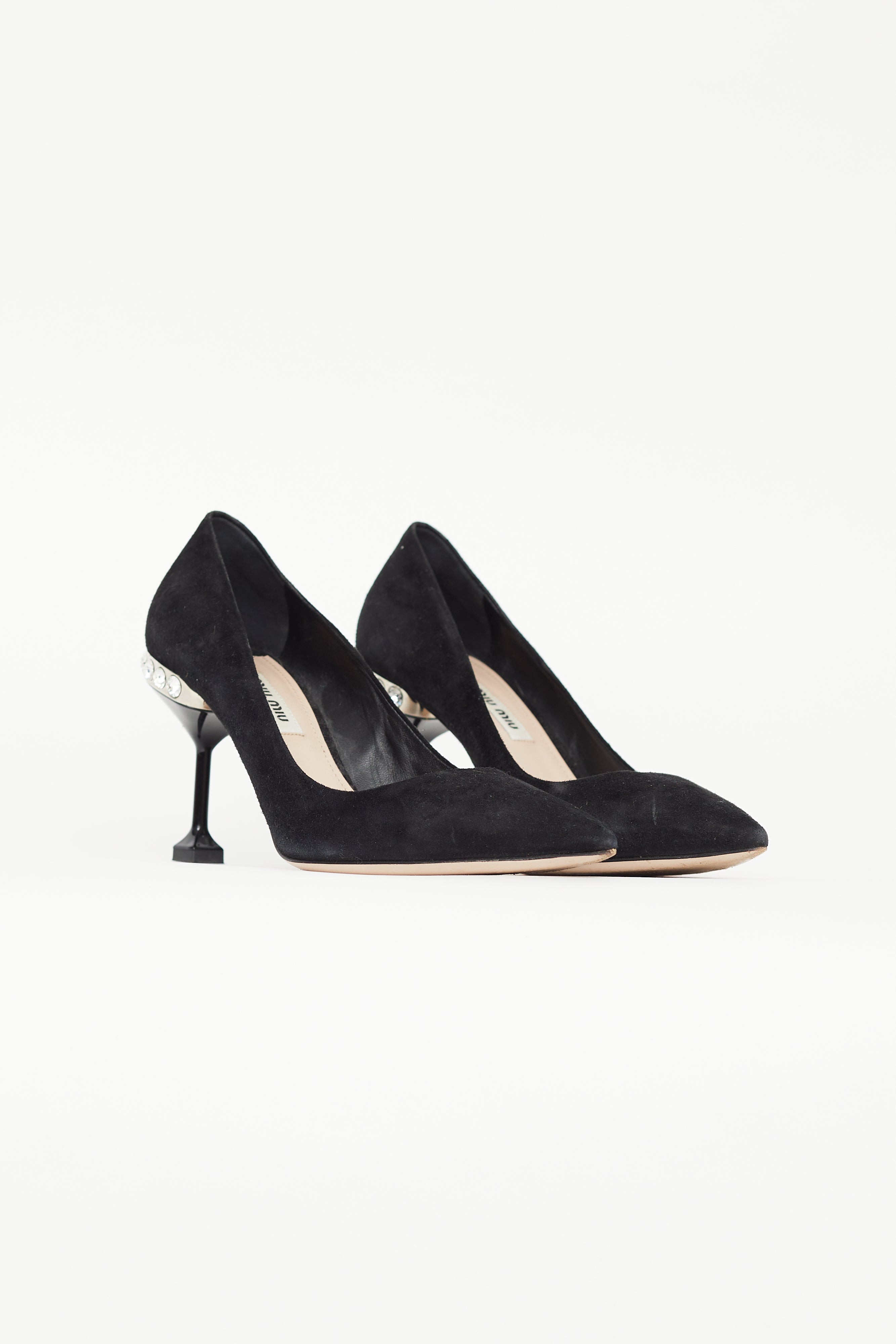 Pre-owned Miu Miu black heels featuring pointed toe, slip on entry, suede upper, flared stiletto heel, and silver tone and crystal embellished back heel.