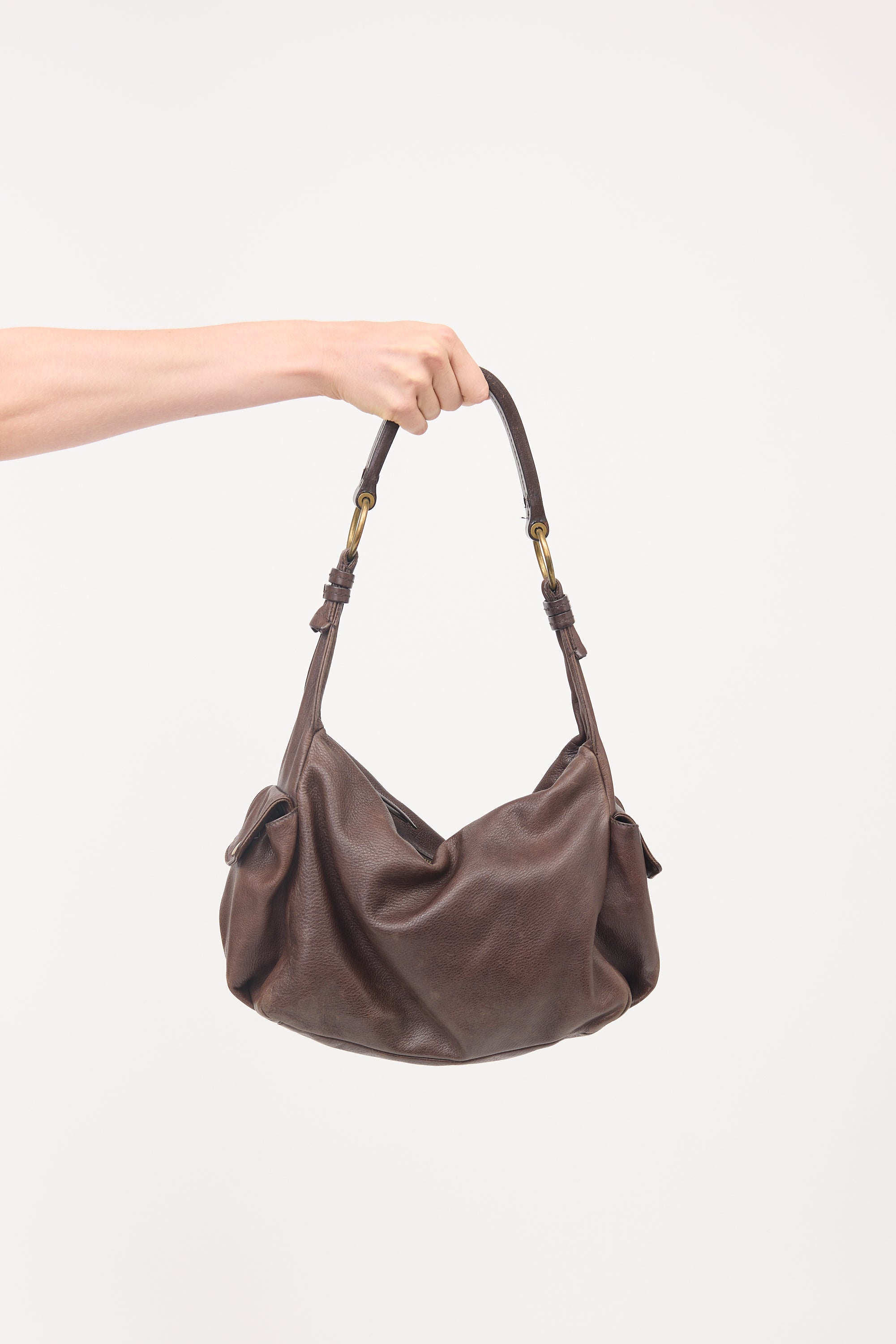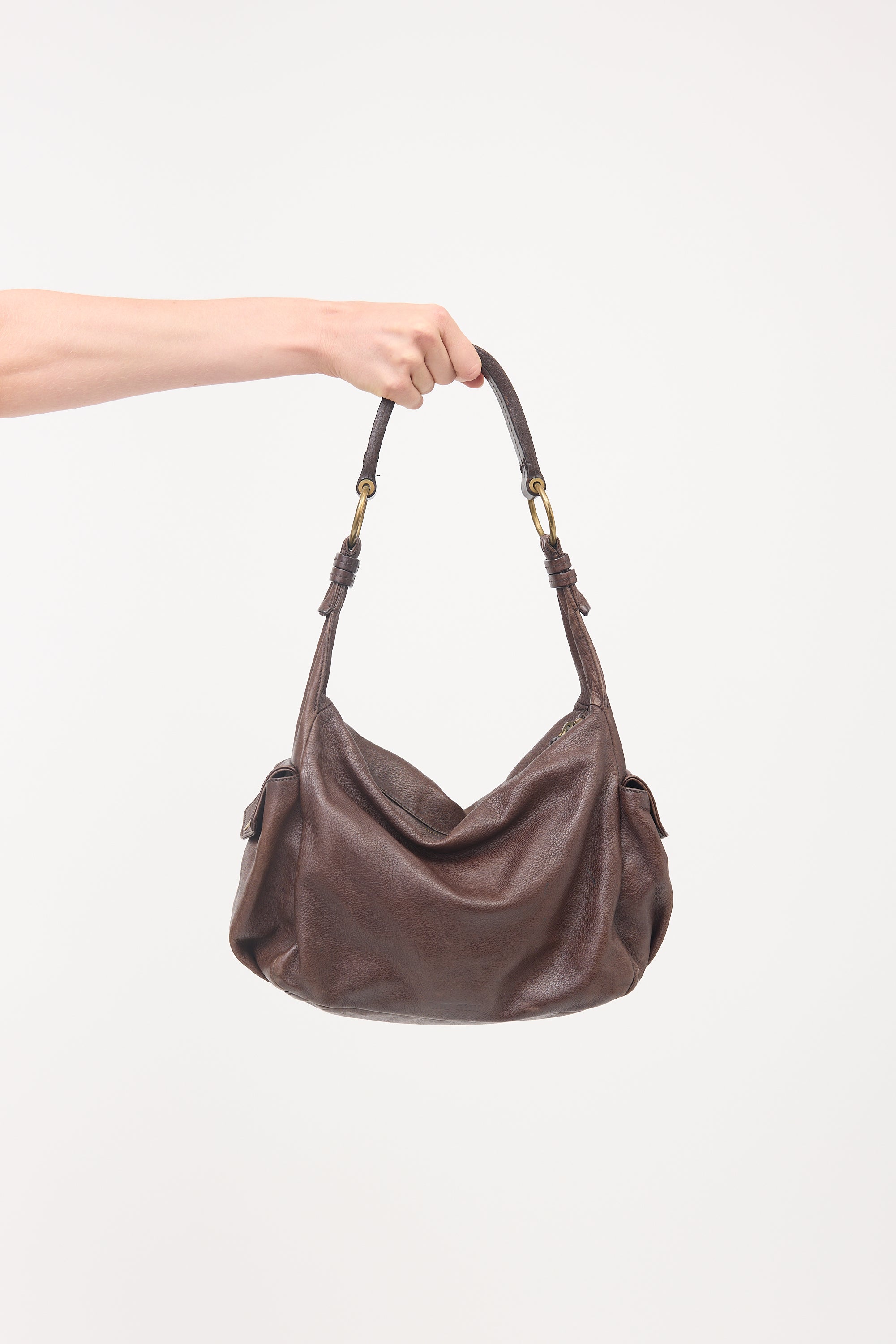Pre-owned Miu Miu brown leather shoulder bag featuring gold tone hardware, flat shoulder strap, side cargo pockets, debossed logo at front base, top zip closure, and one lined main compartment with one zip pocket.