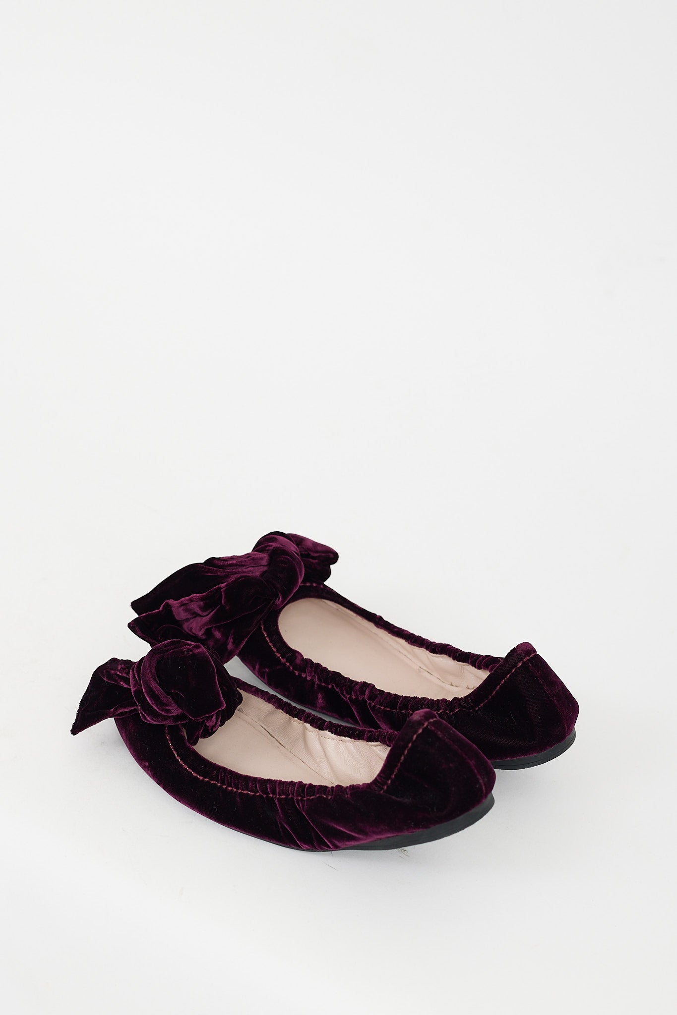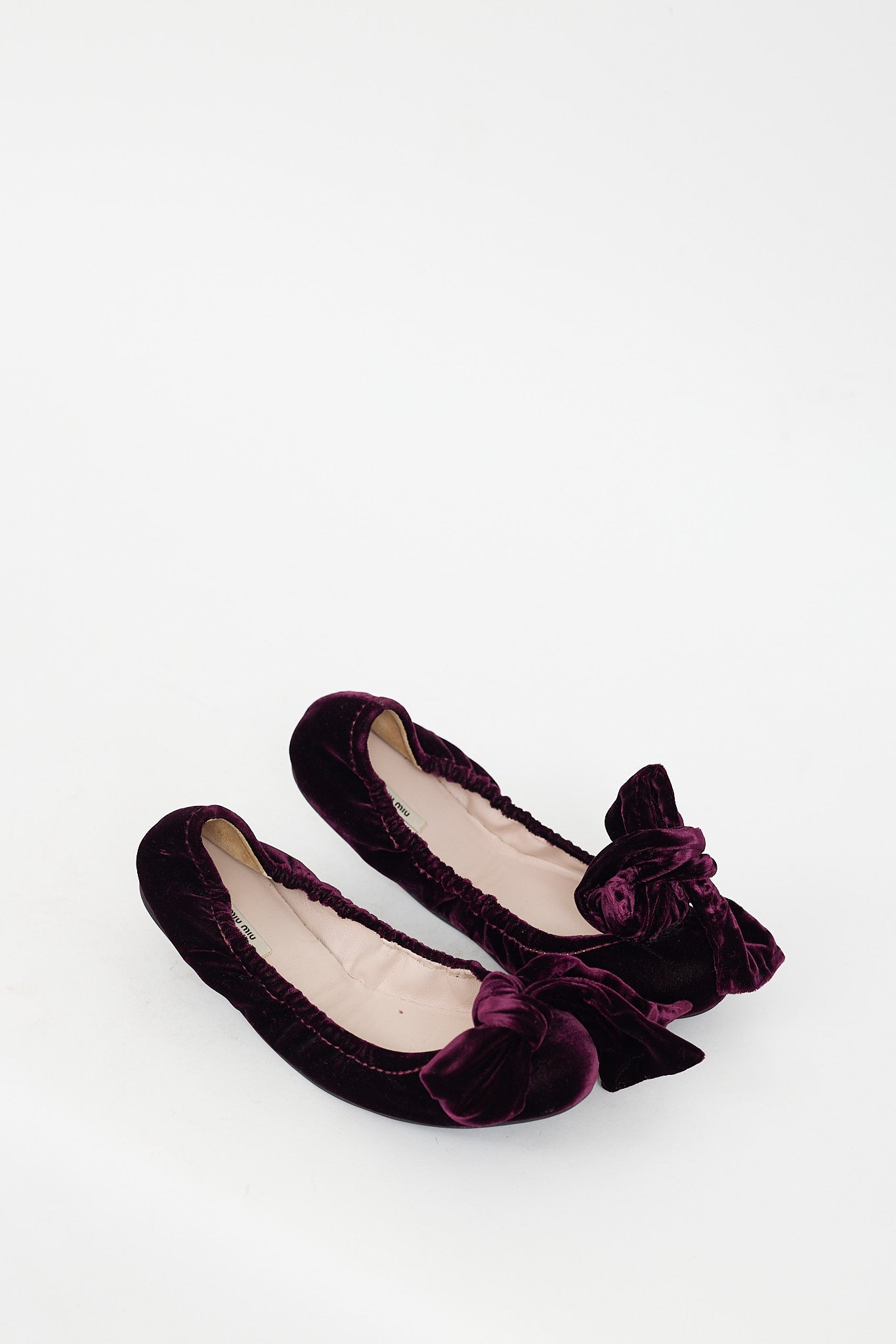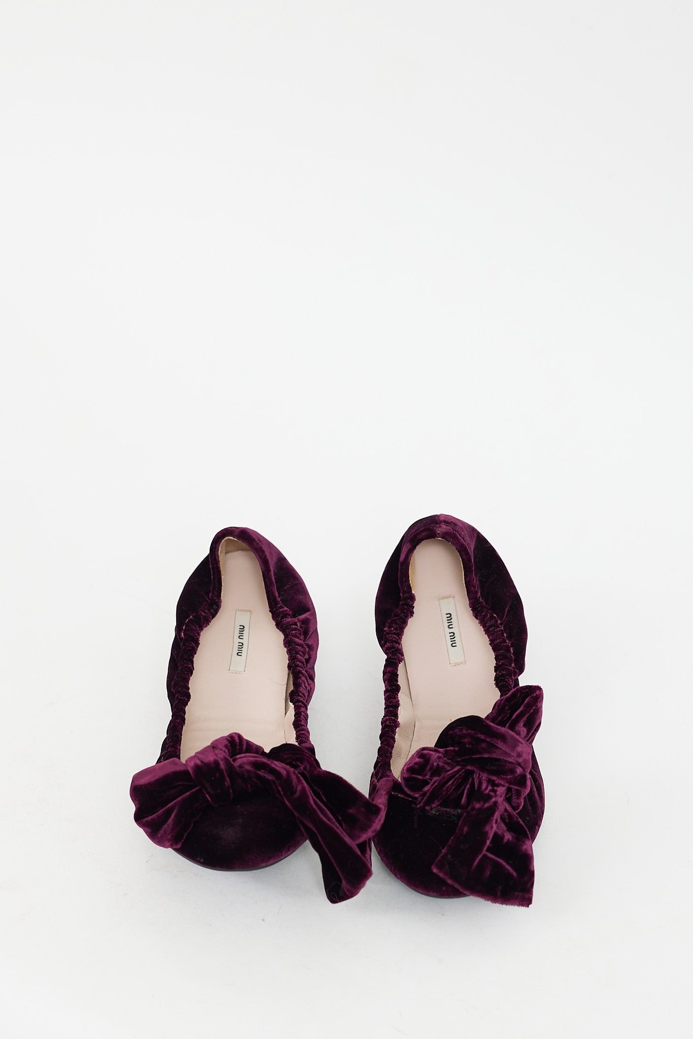 Pre-owned Miu Miu purple velvet ballet flats featuring rounded toe, attached bow at toe, elasticized opening, and rubber outsole.