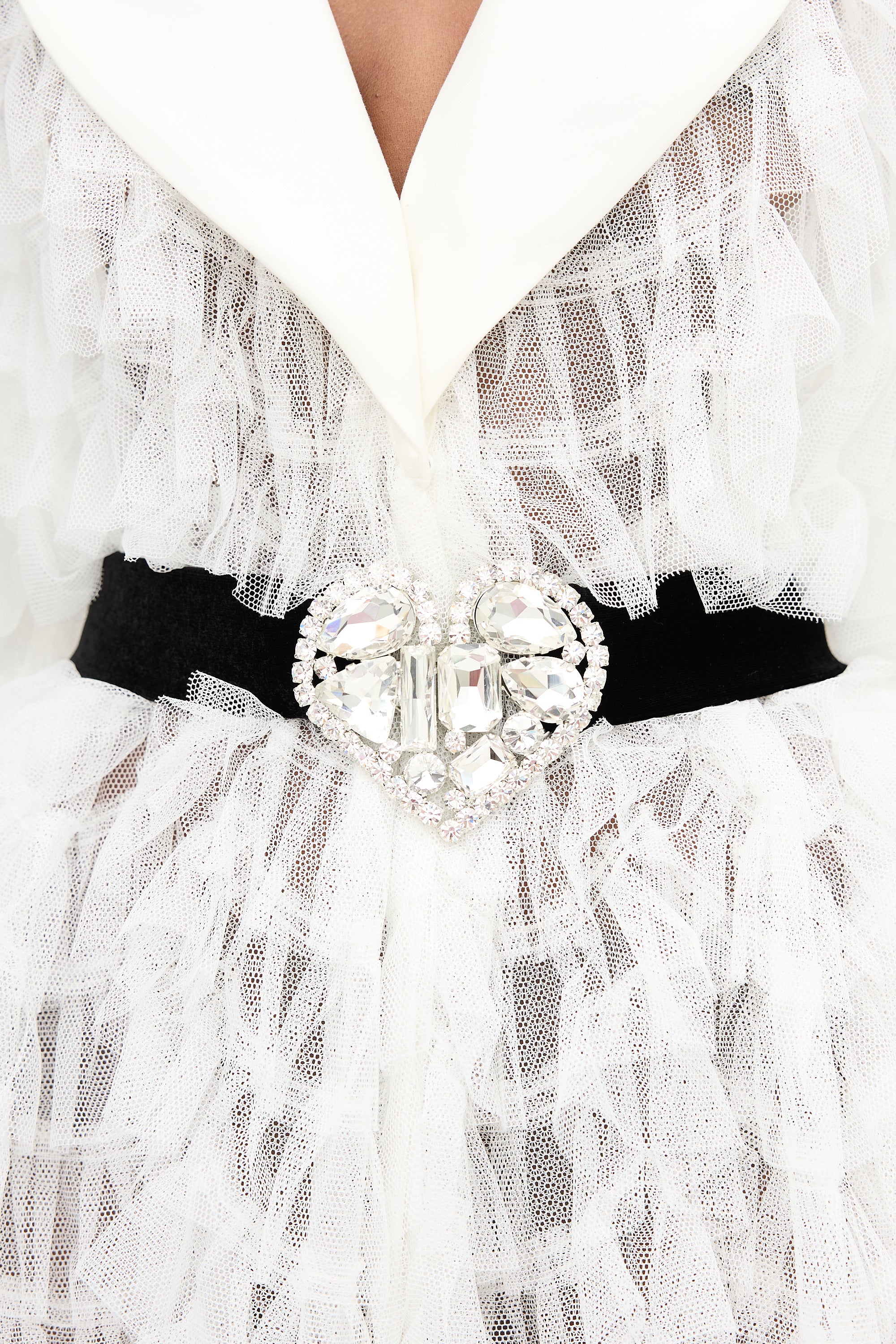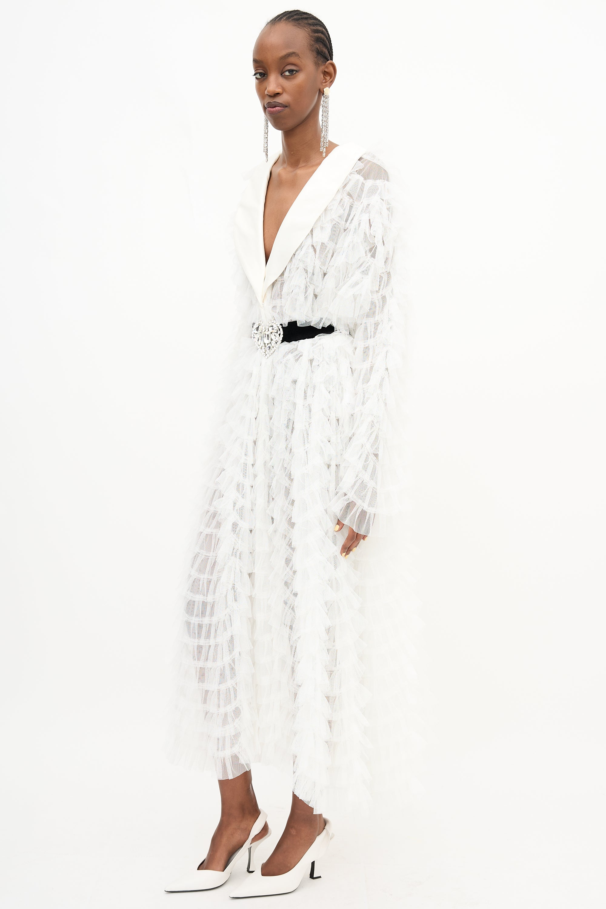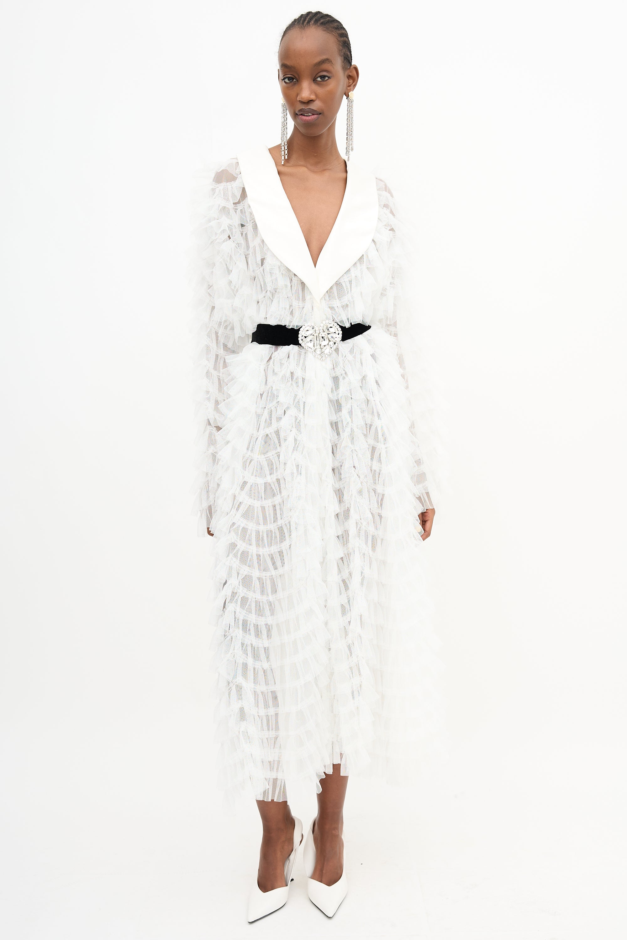 Pre-owned Alessandra Rich white Documented tulle dress featuring layered ruffles, a shawl lapel, long sleeves, silk blend black gemstone belt, and button front. Unlined. Clipped to fit model.