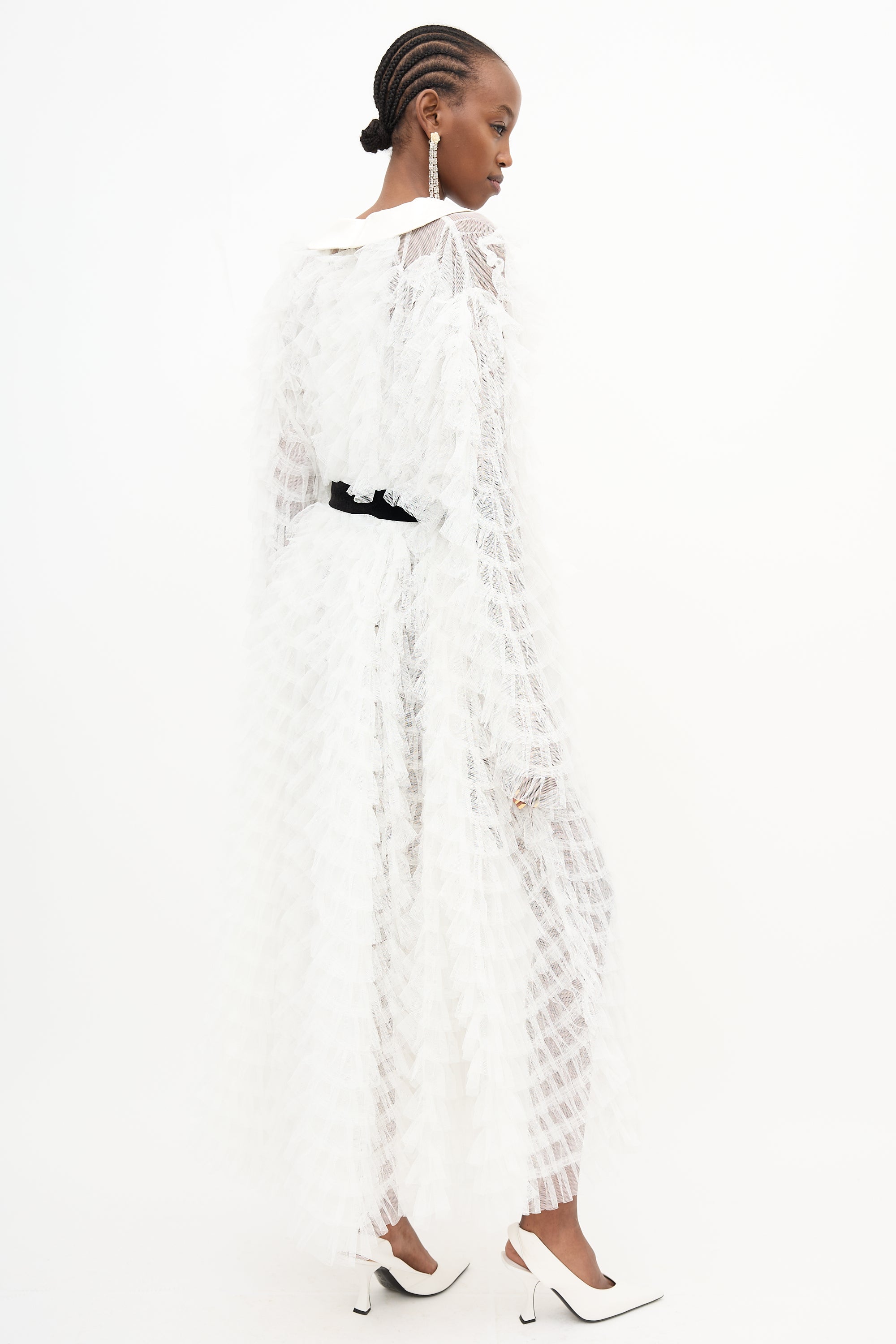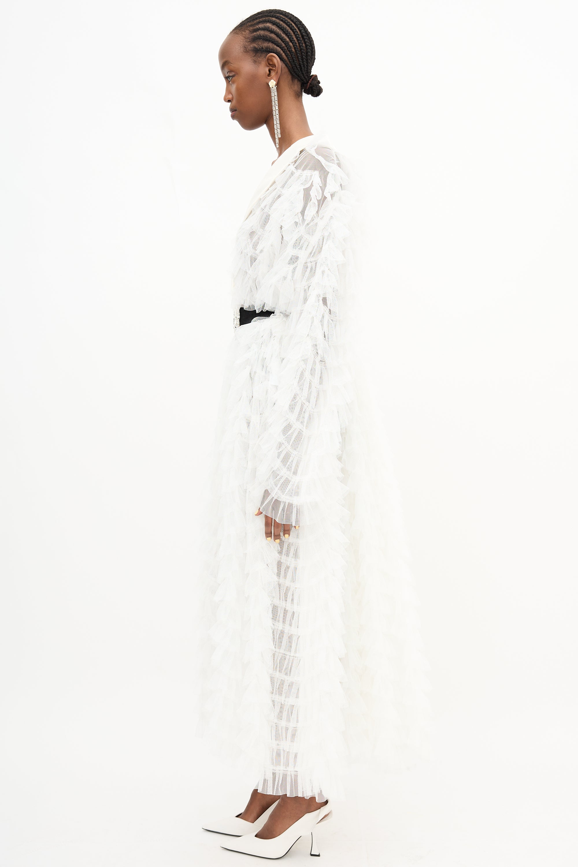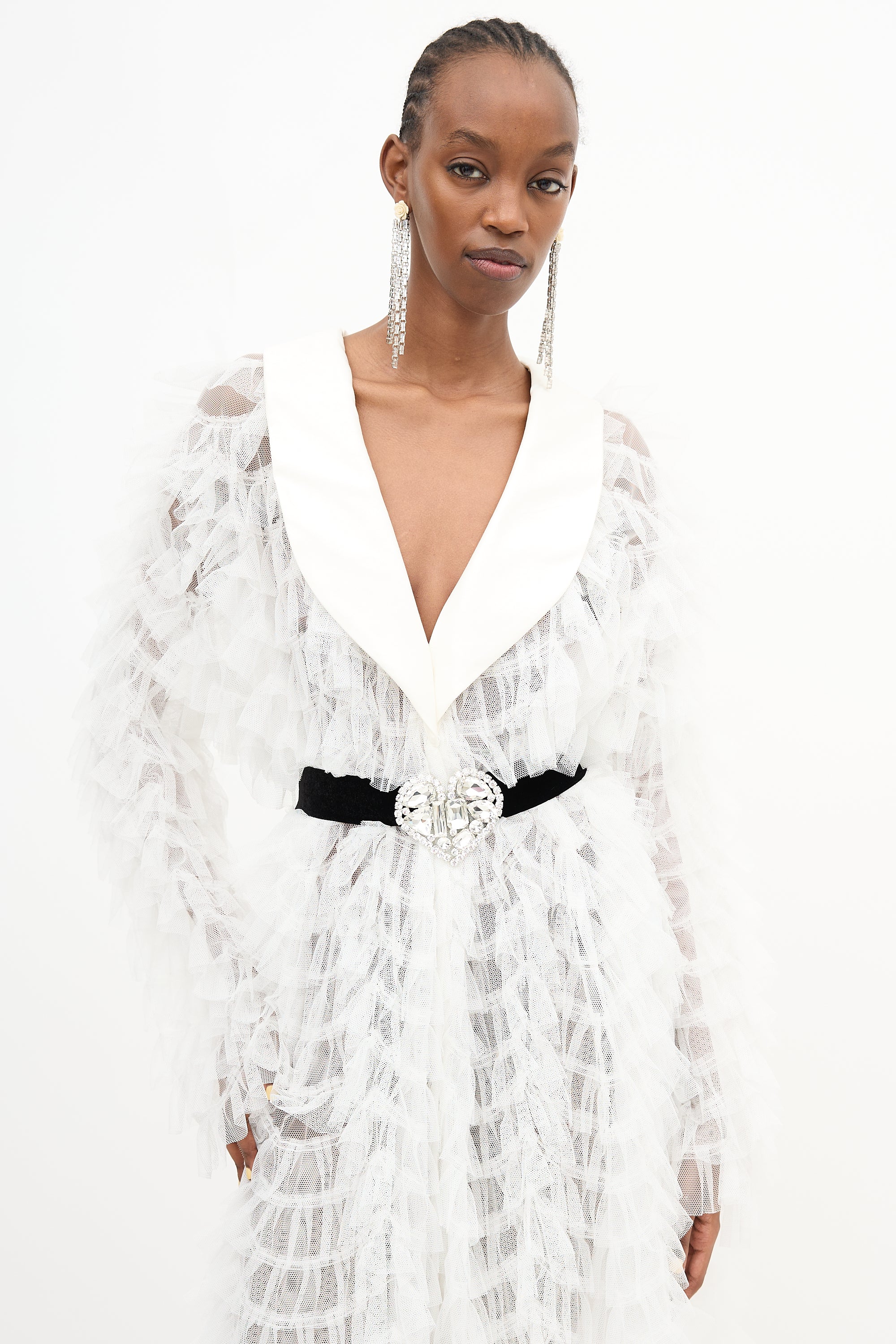 Pre-owned Alessandra Rich white Documented tulle dress featuring layered ruffles, a shawl lapel, long sleeves, silk blend black gemstone belt, and button front. Unlined. Clipped to fit model.