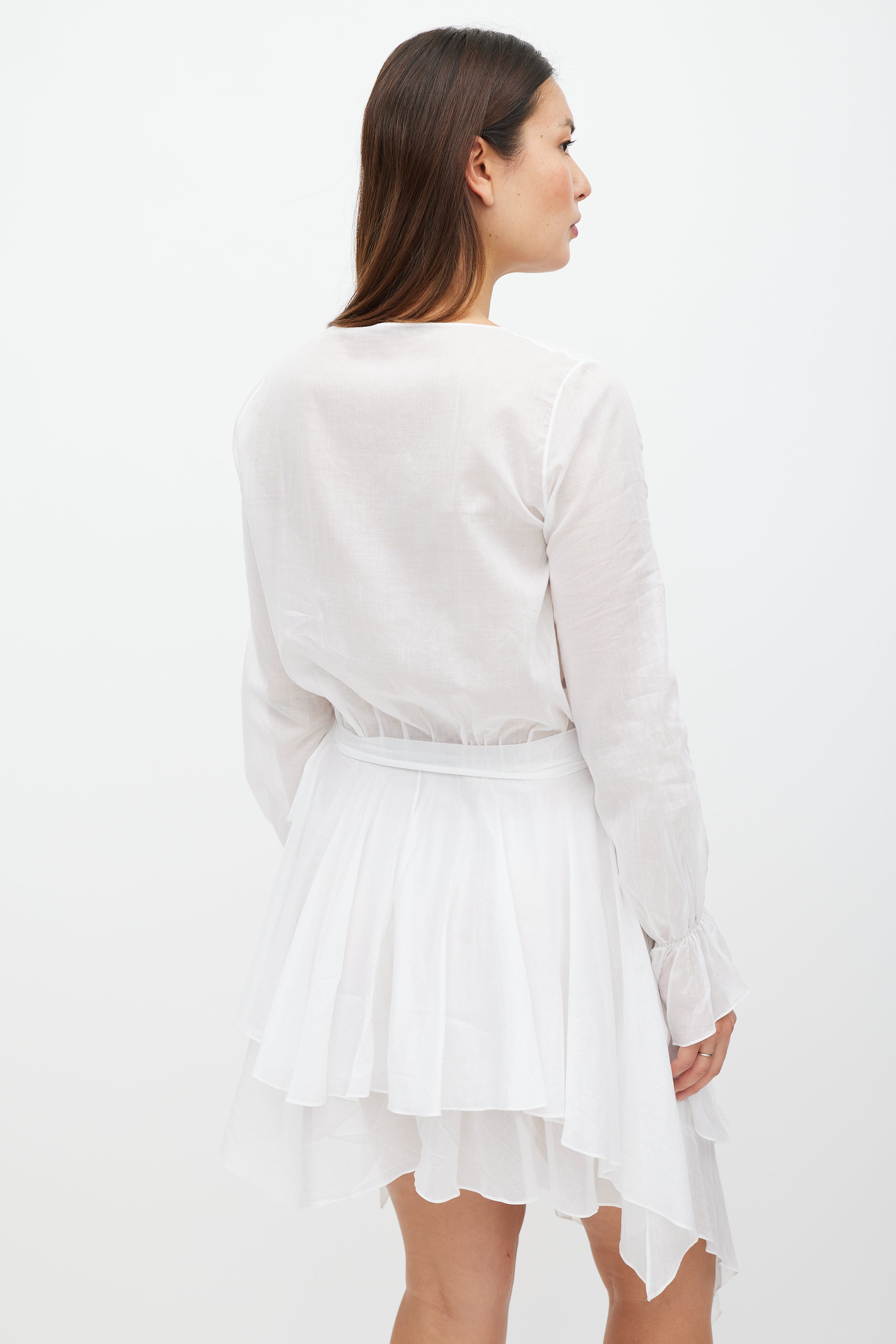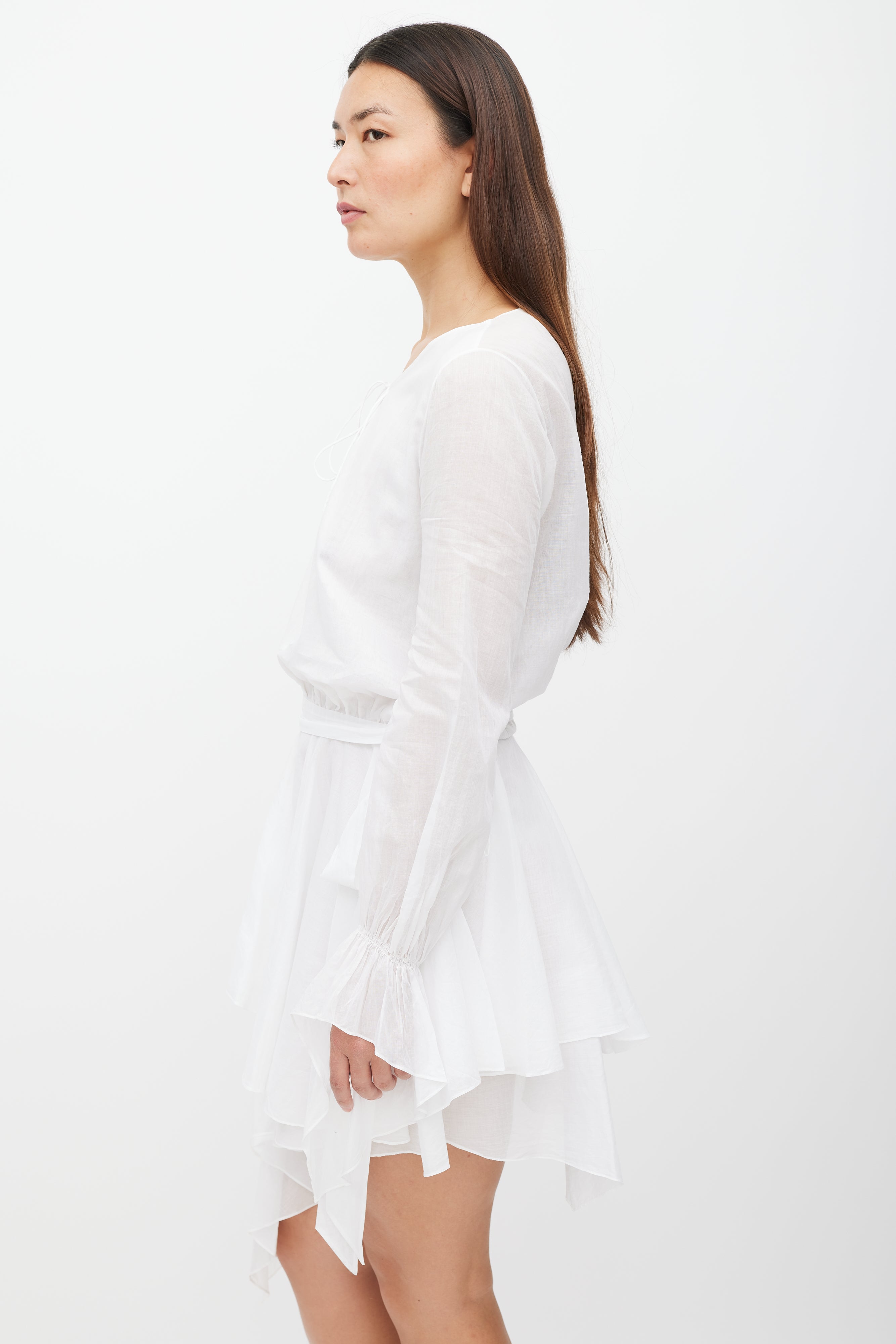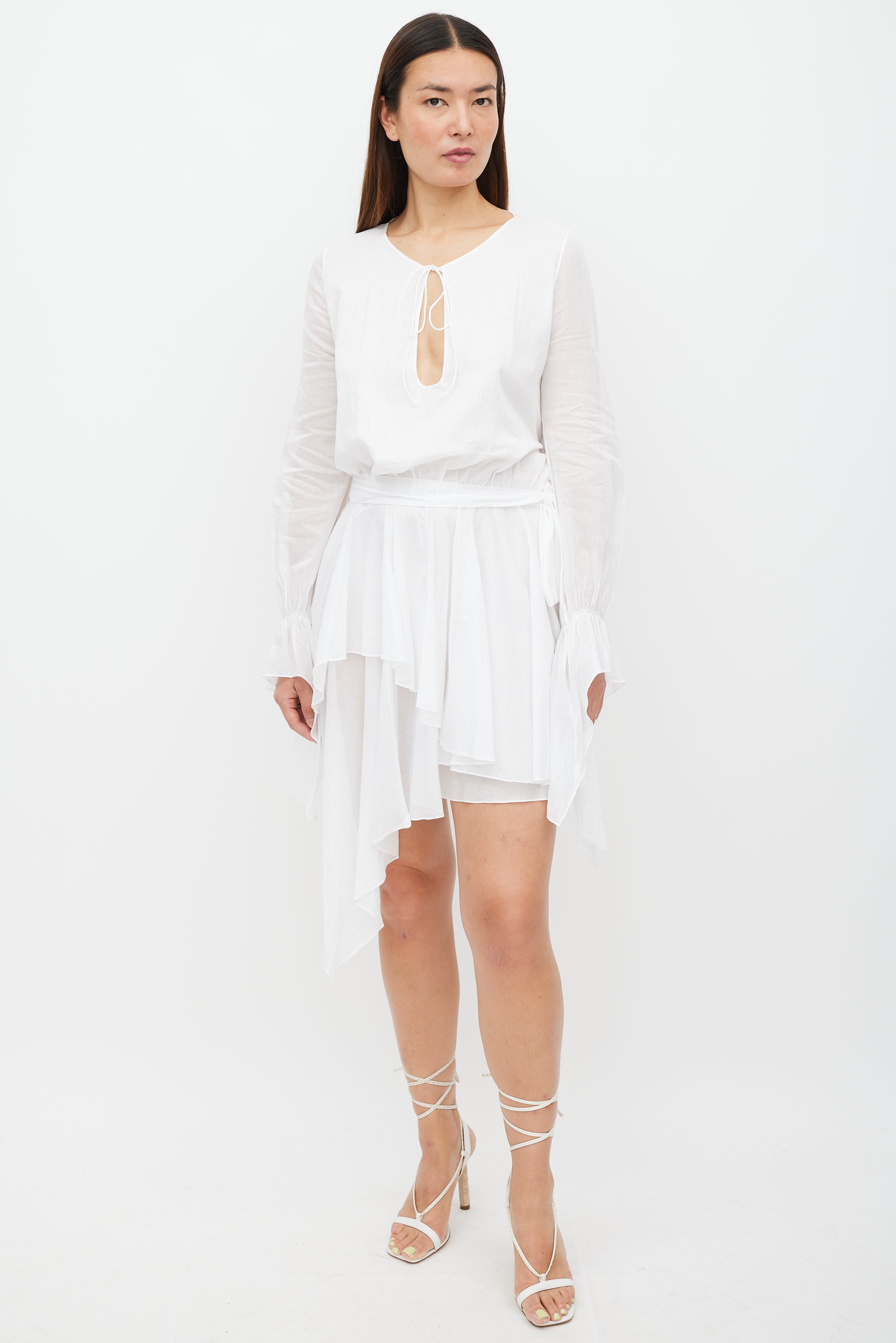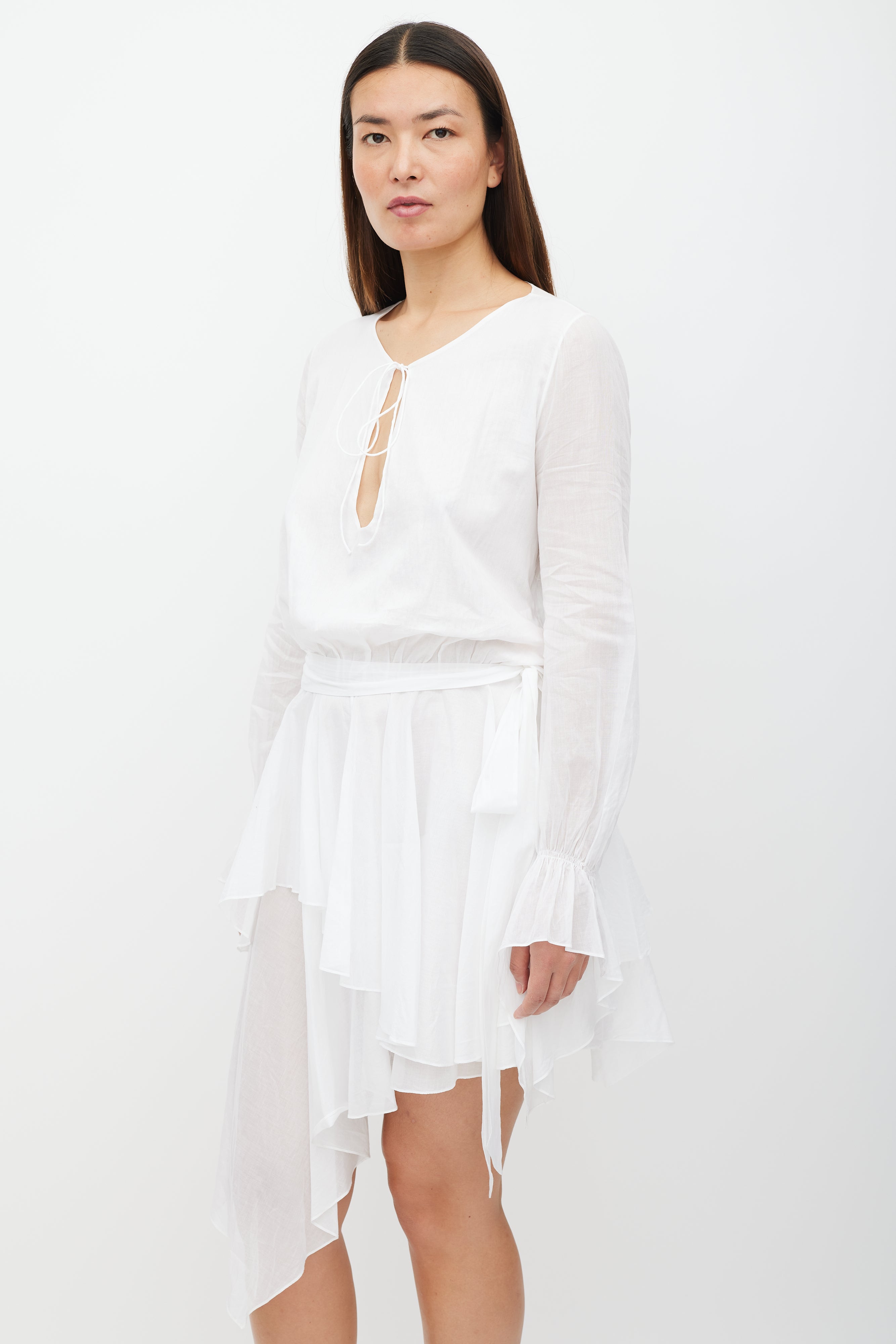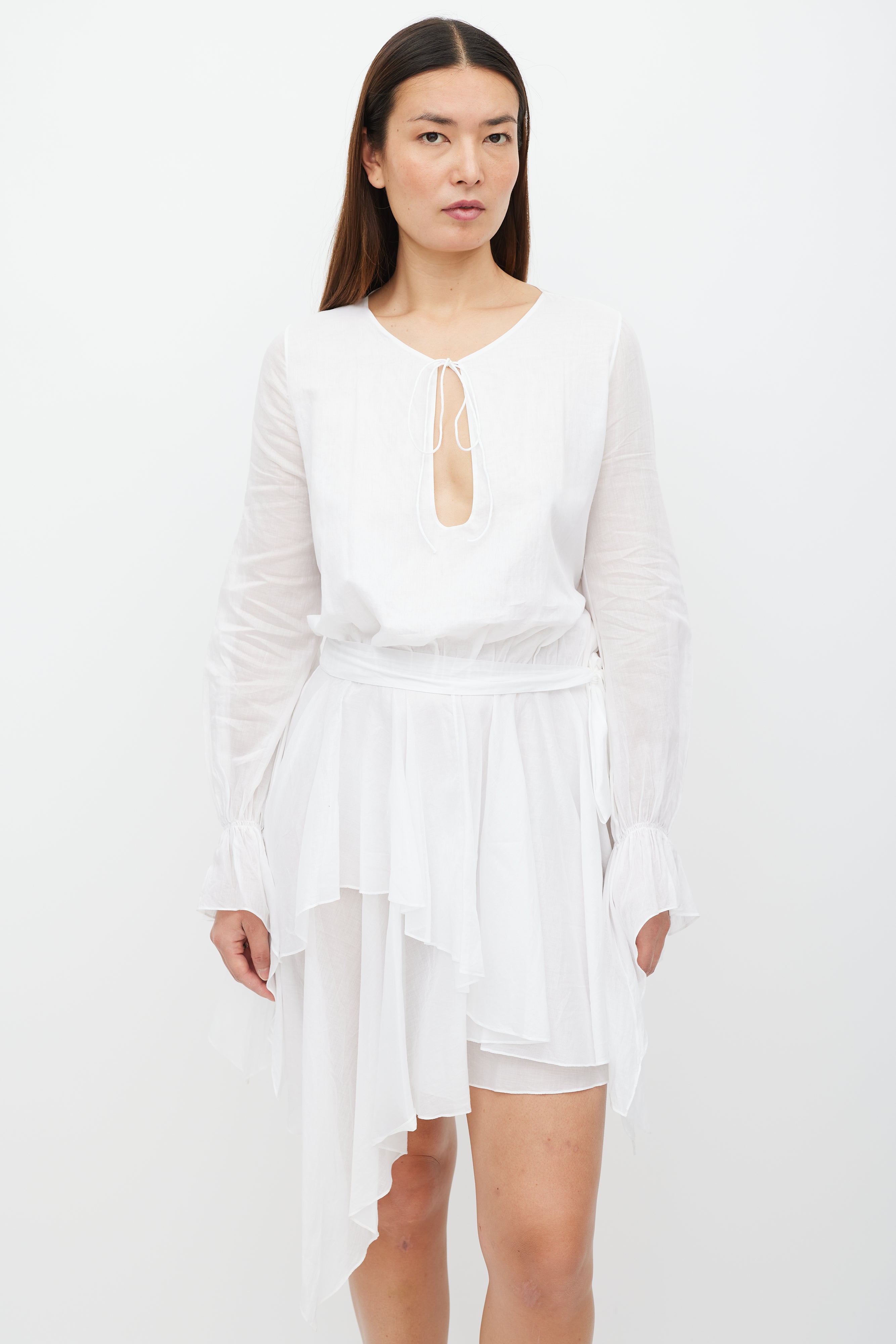 Pre-owned Alexandre Vauthier white dress featuring a keyhole neckline, long sleeves with ruffled cuffs, tie belt at waist, ruffled hem, and zip closure at side.