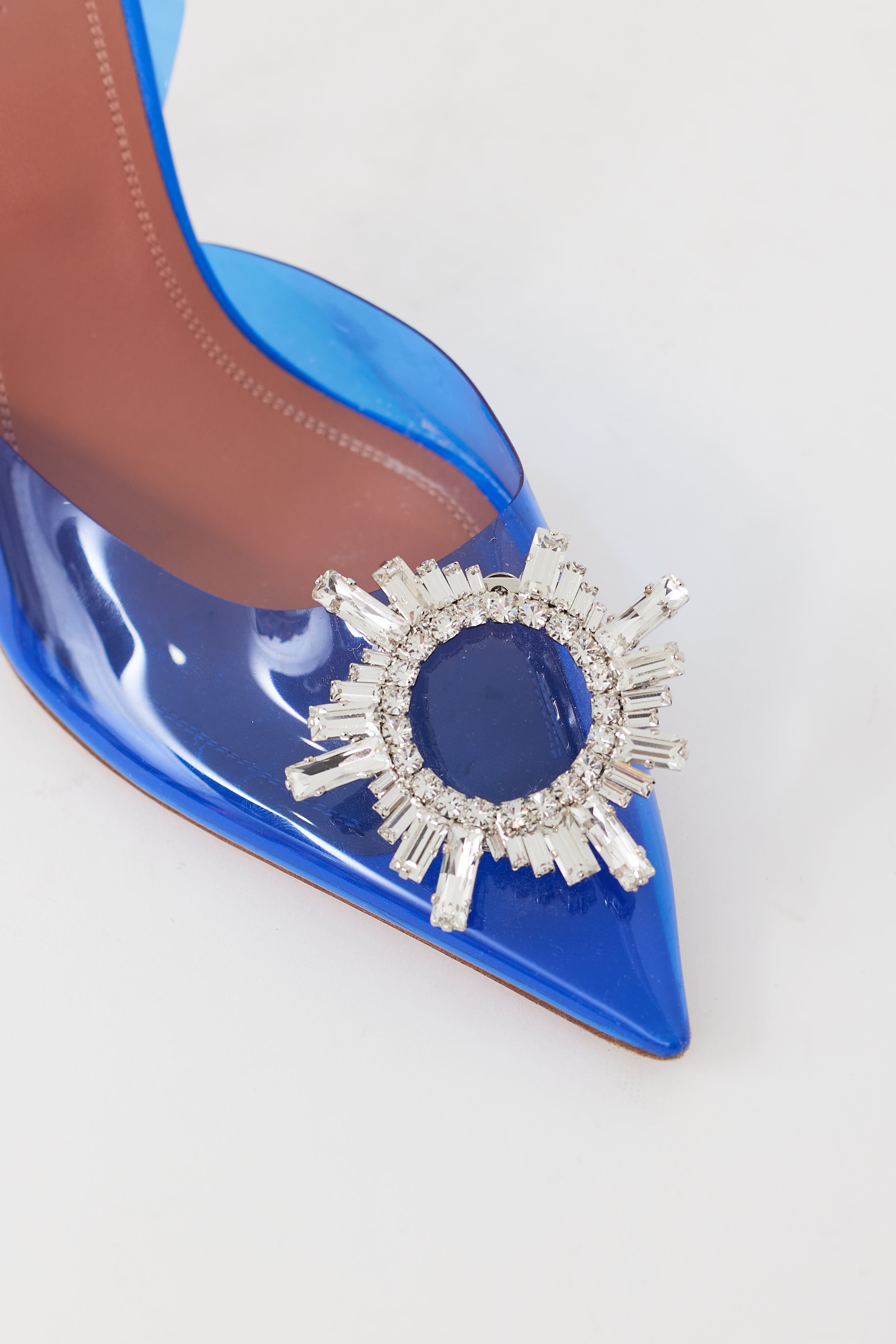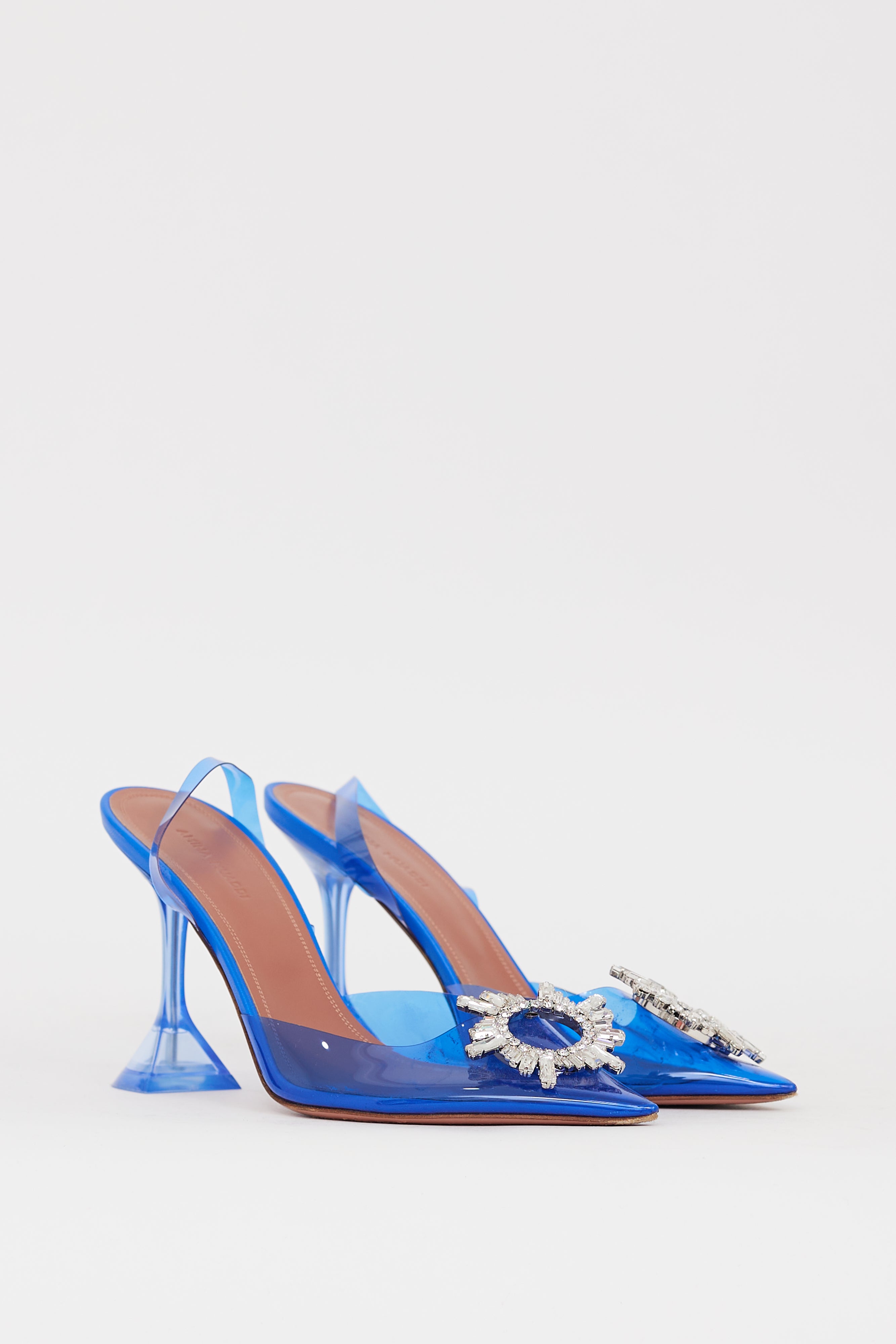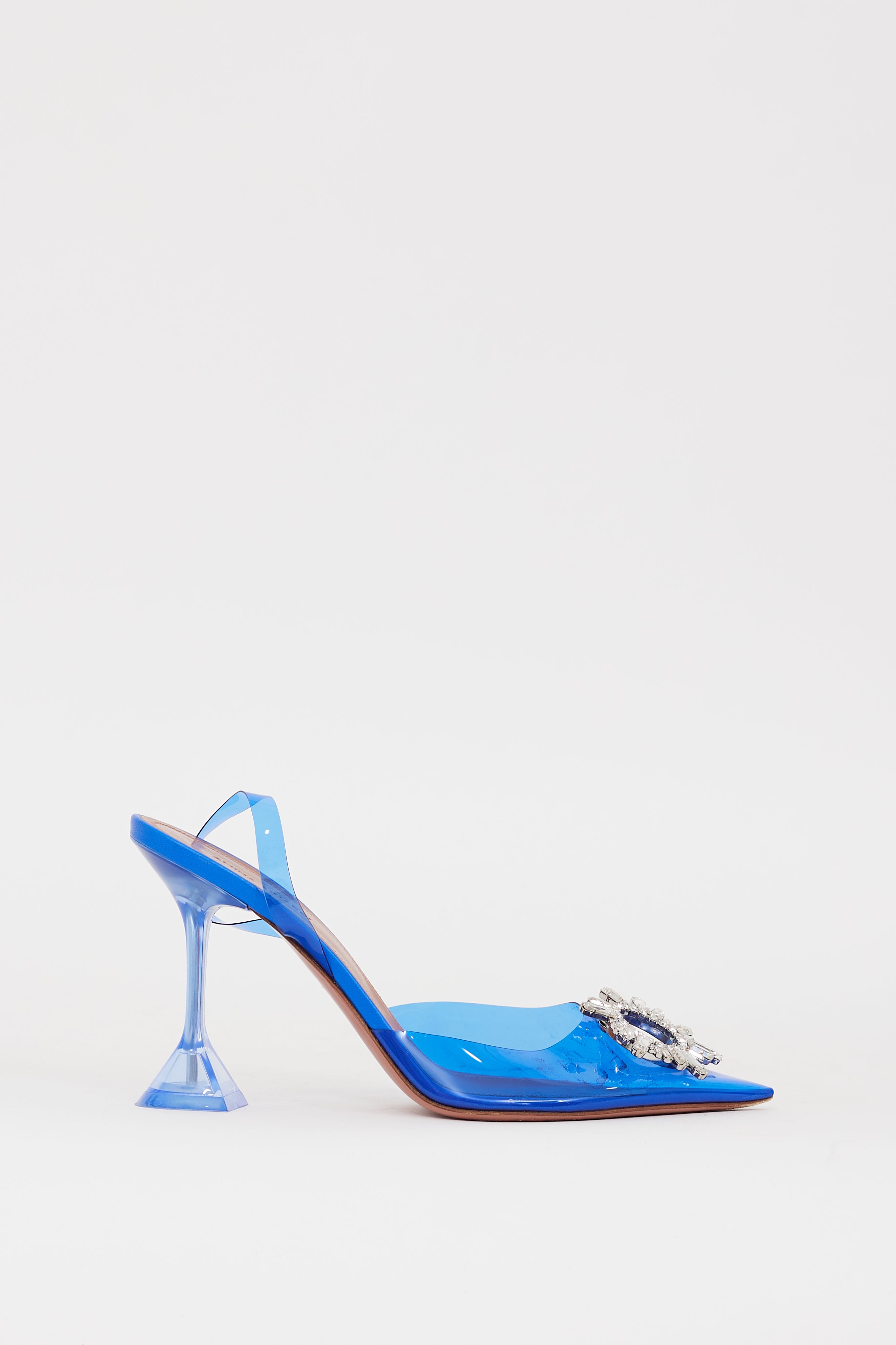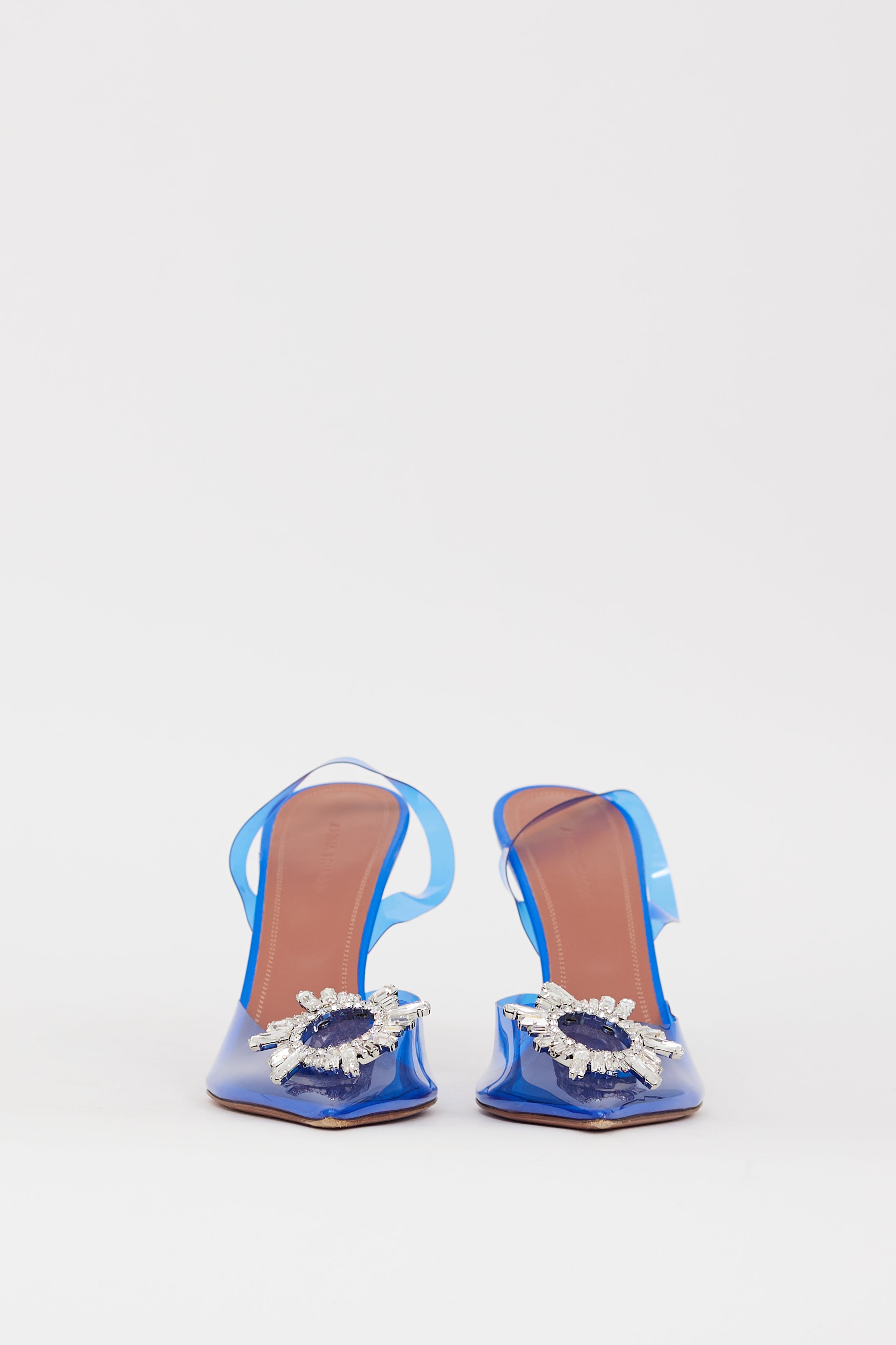 Pre-owned Amina Muaddi blue Begum Glass heels featuring a pointed toe, Swarovski crystal embellishment at vamp, slingback strap, and fluted heel.
