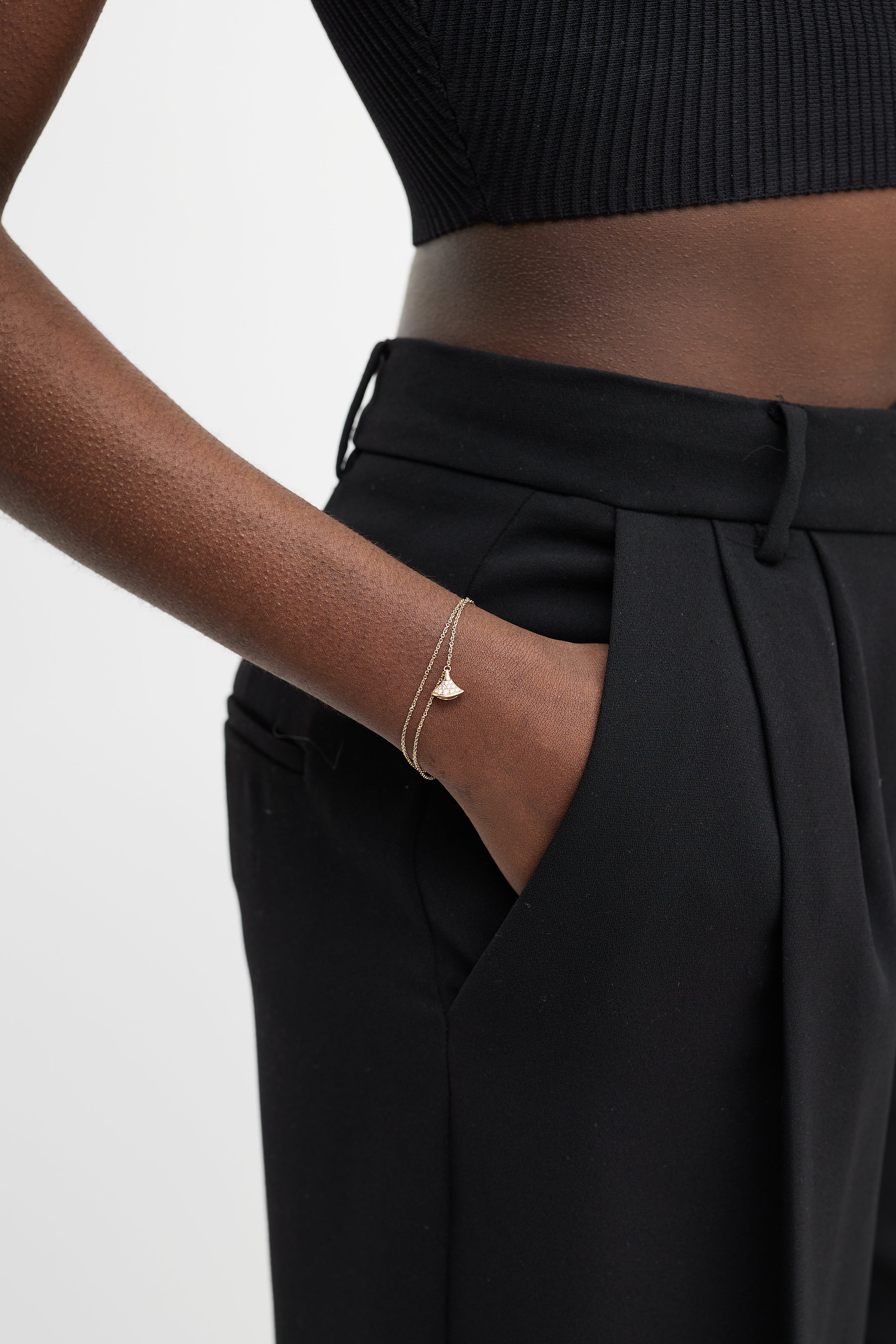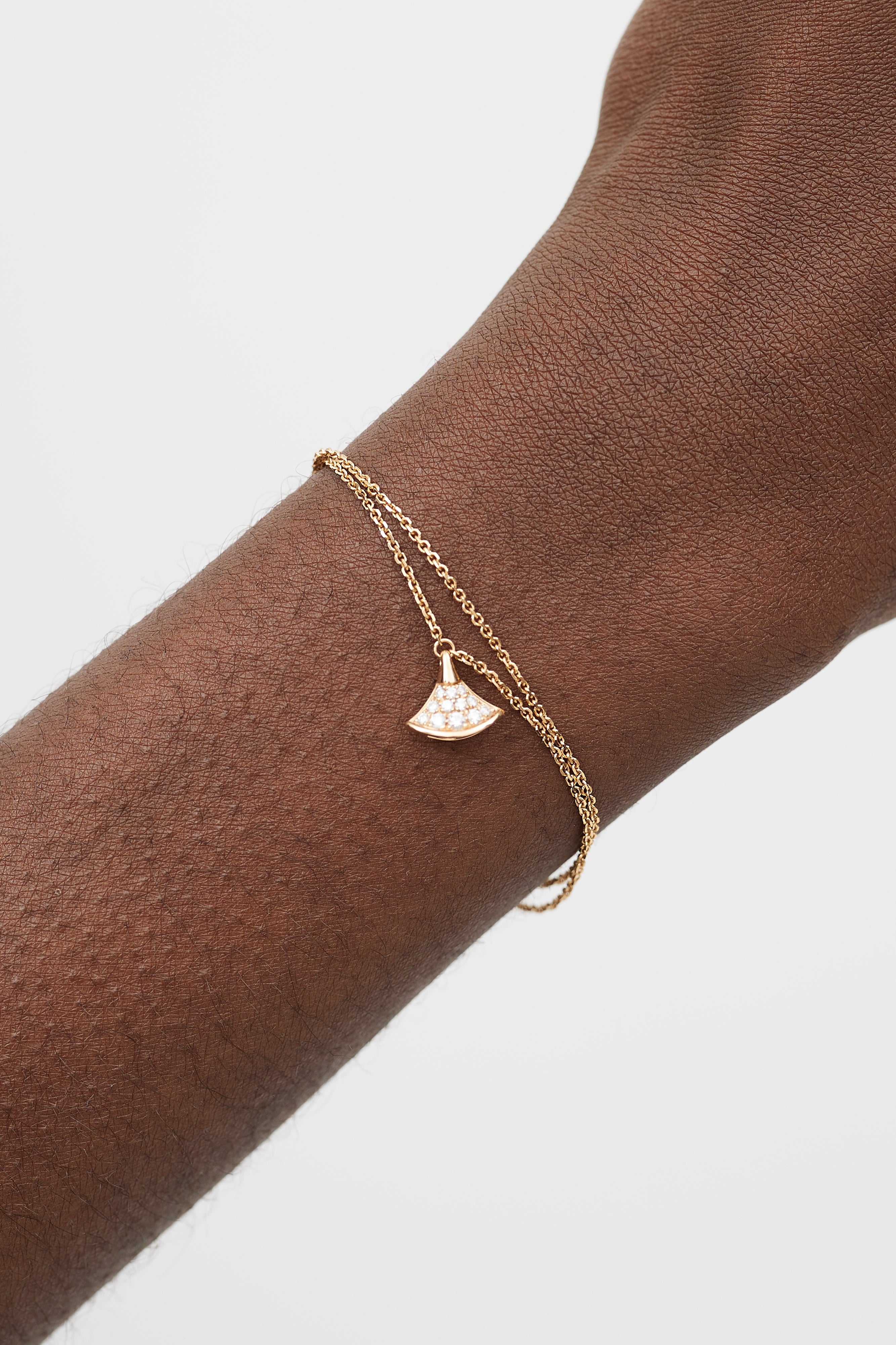 Pre-owned Bulgari gold Divina bracelet featuring pavé diamonds set in fan-shaped fixed pendant, two thin cable chains and two logo engraved jump rings. Comes with original dust bag and certificate of authentication.