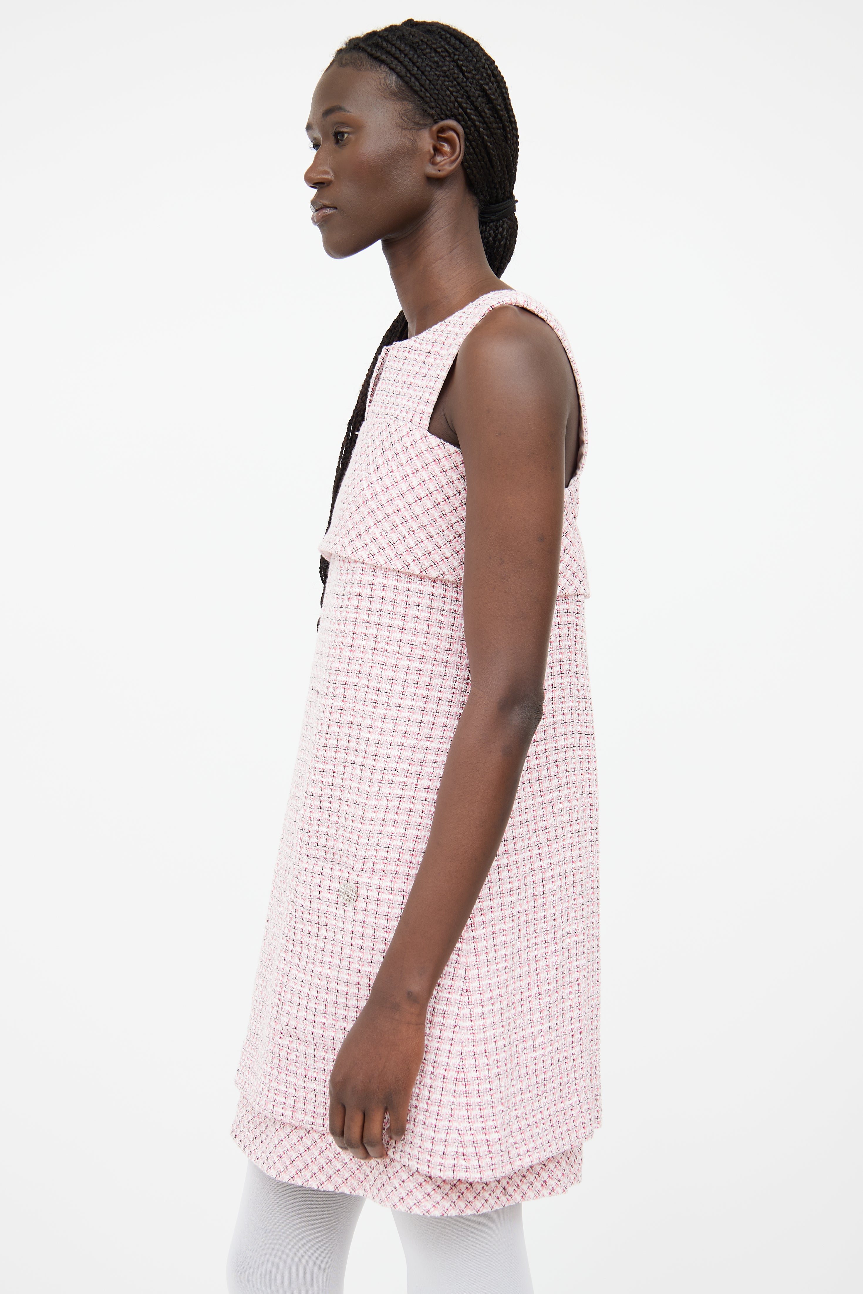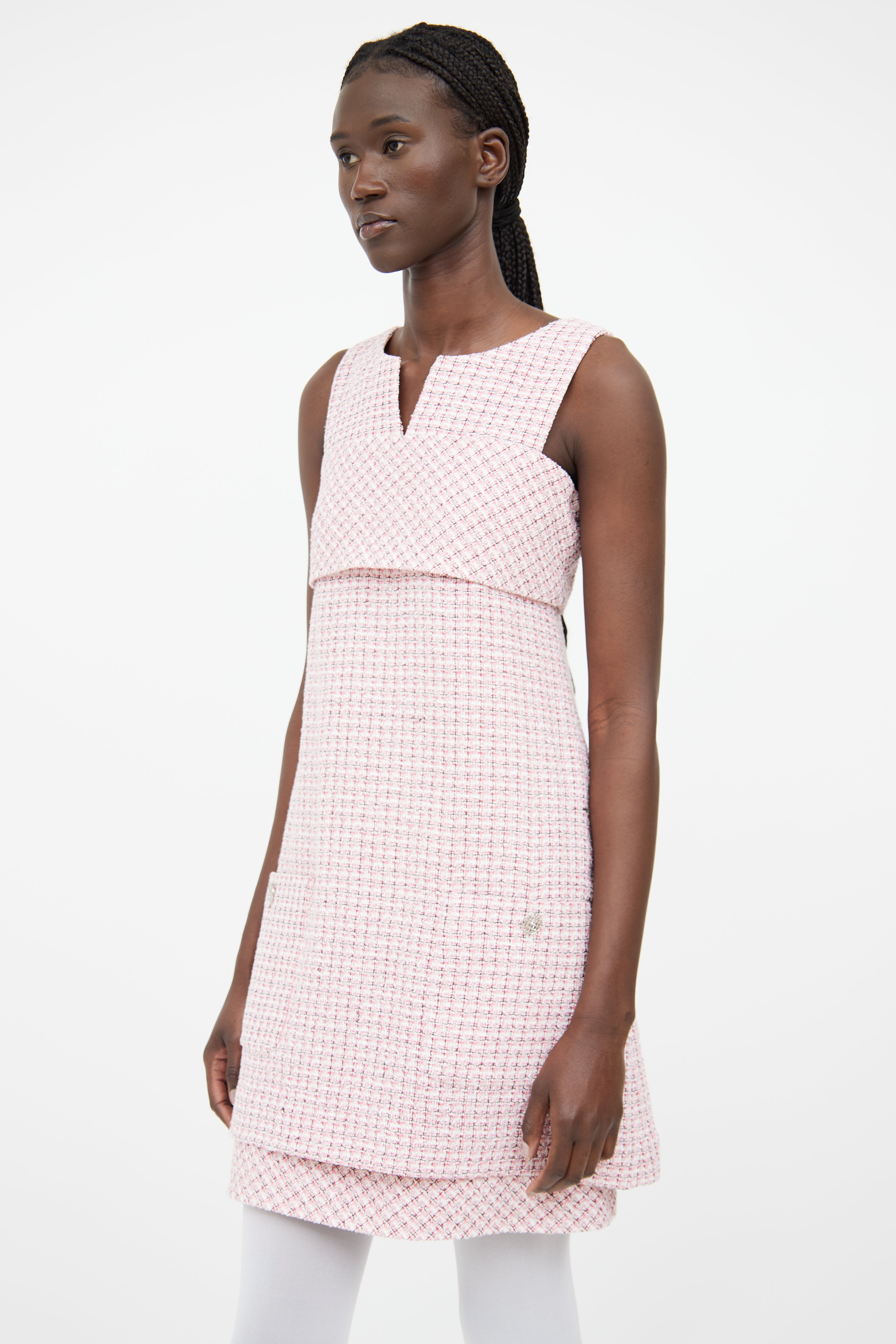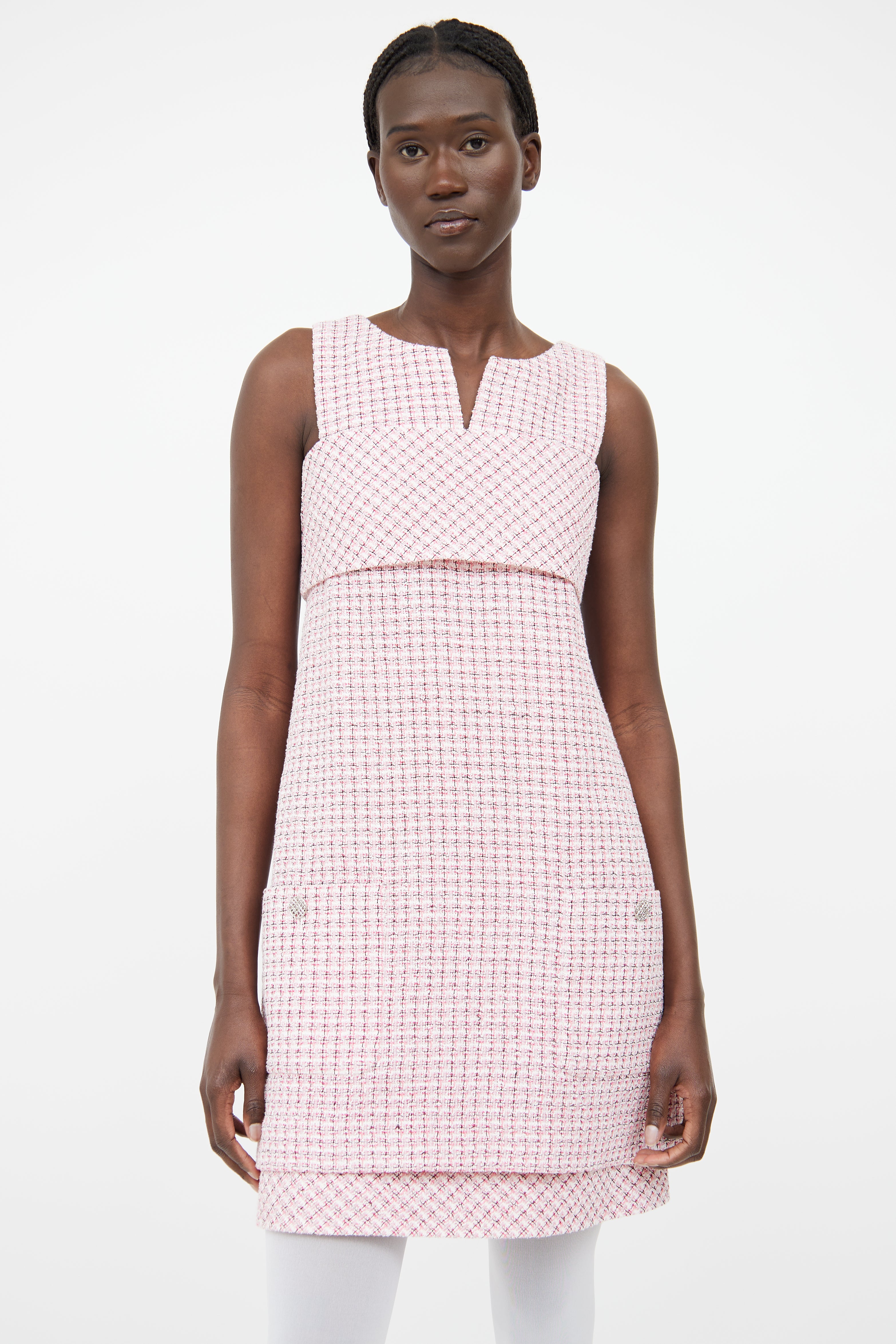 Pre-owned Chanel pink tweed SS 2014 sleeveless dress featuring split round neckline, two front button closure pockets, silver-tone button detailing, concealed back zip closure. Fully lined.