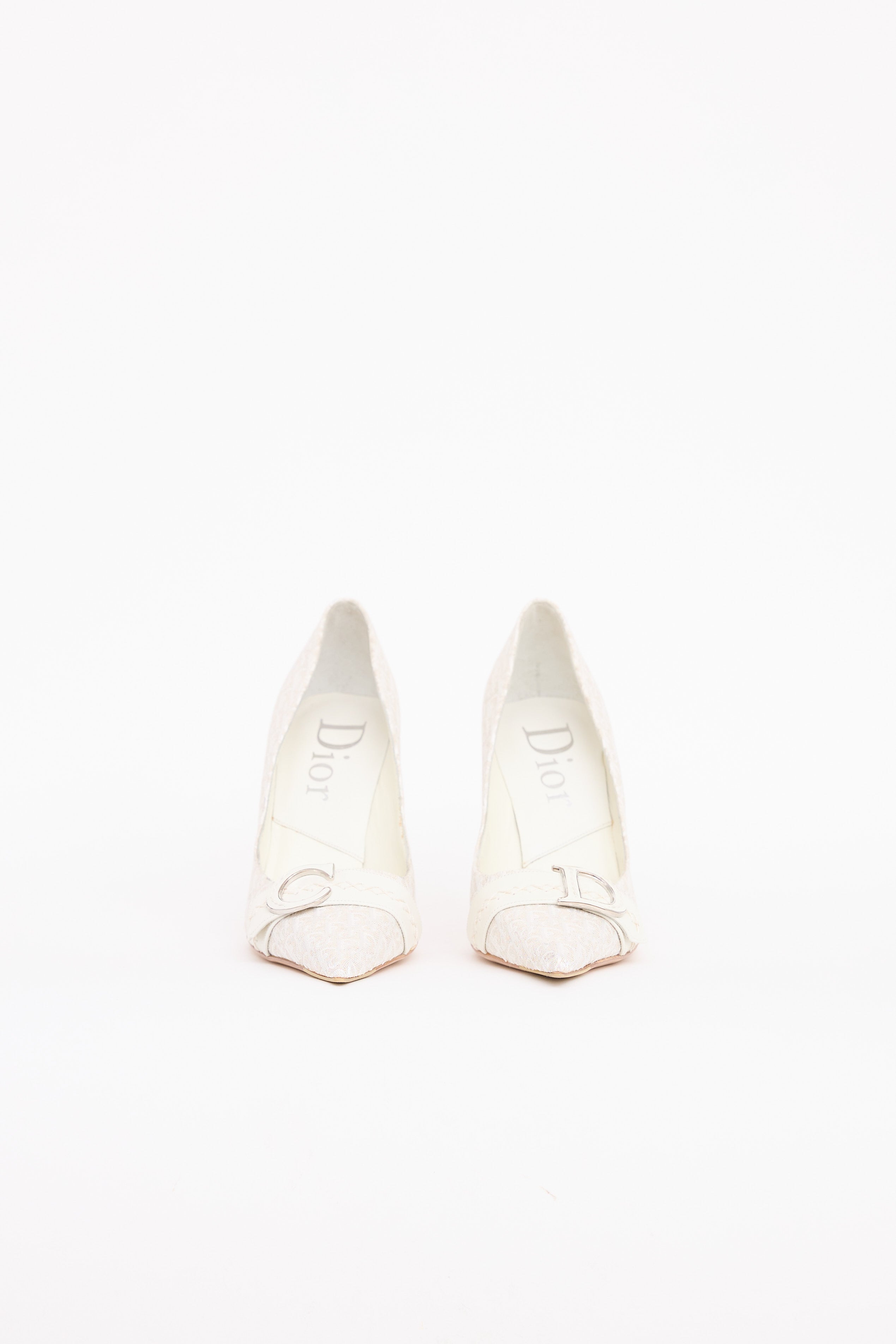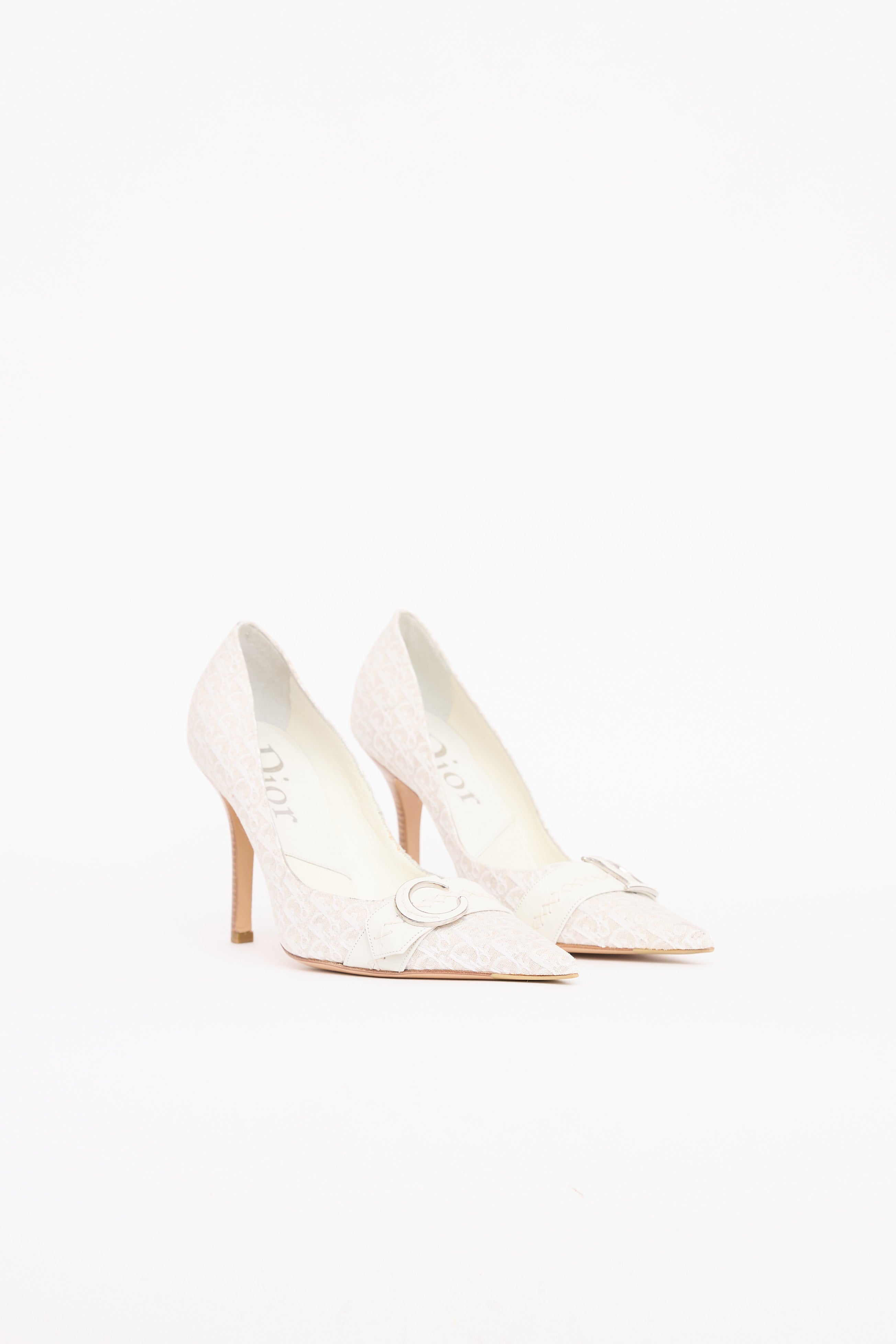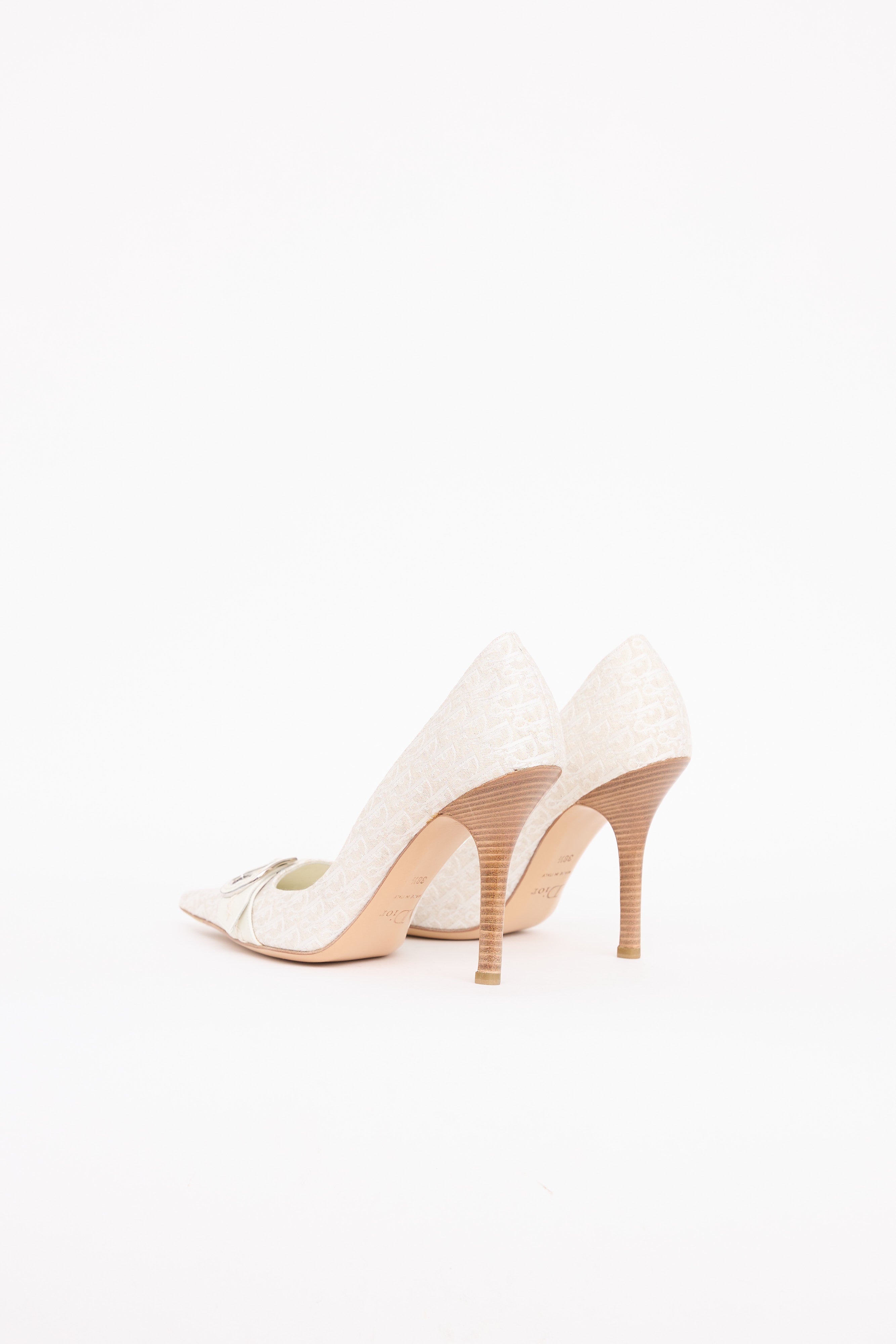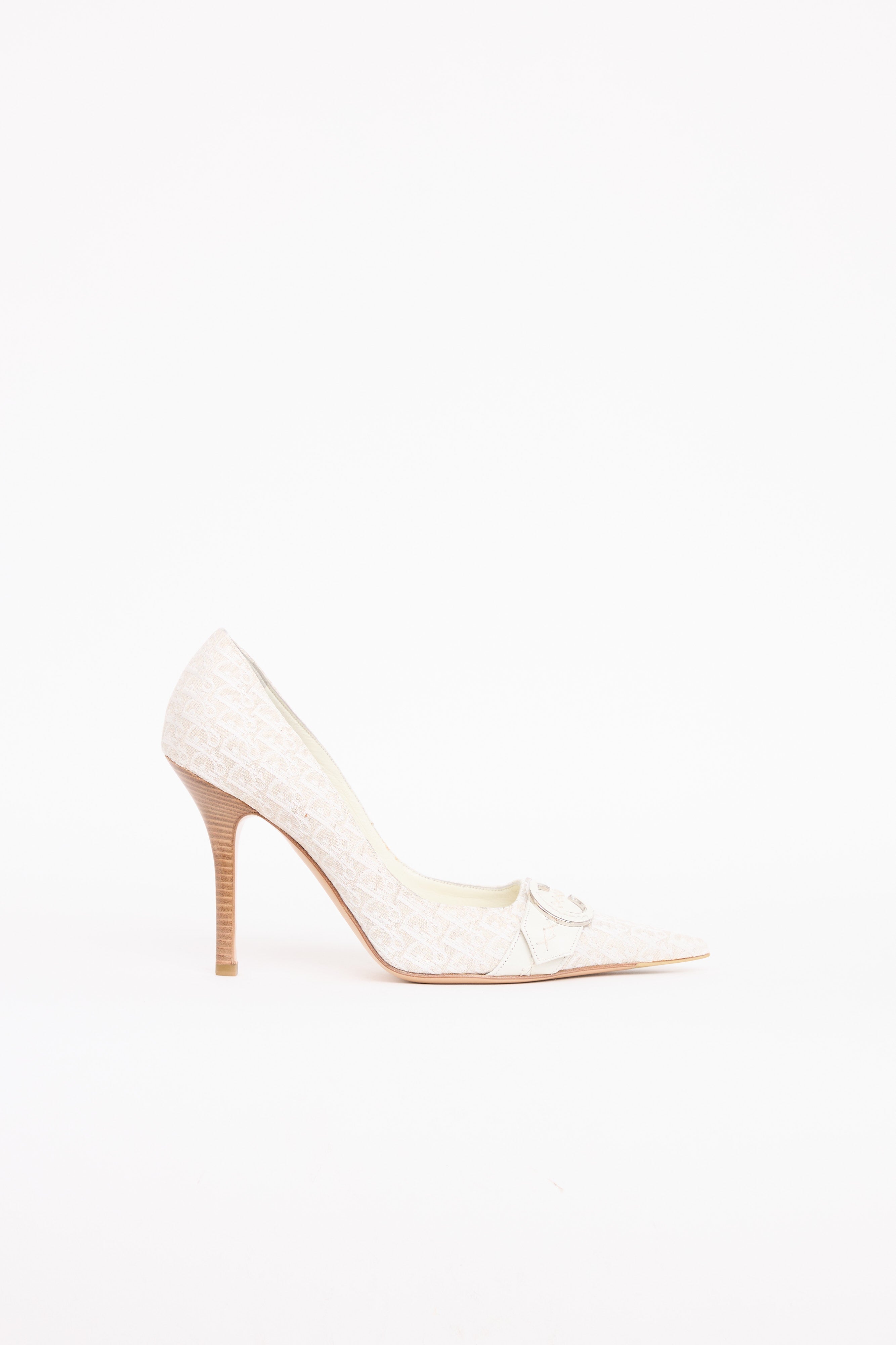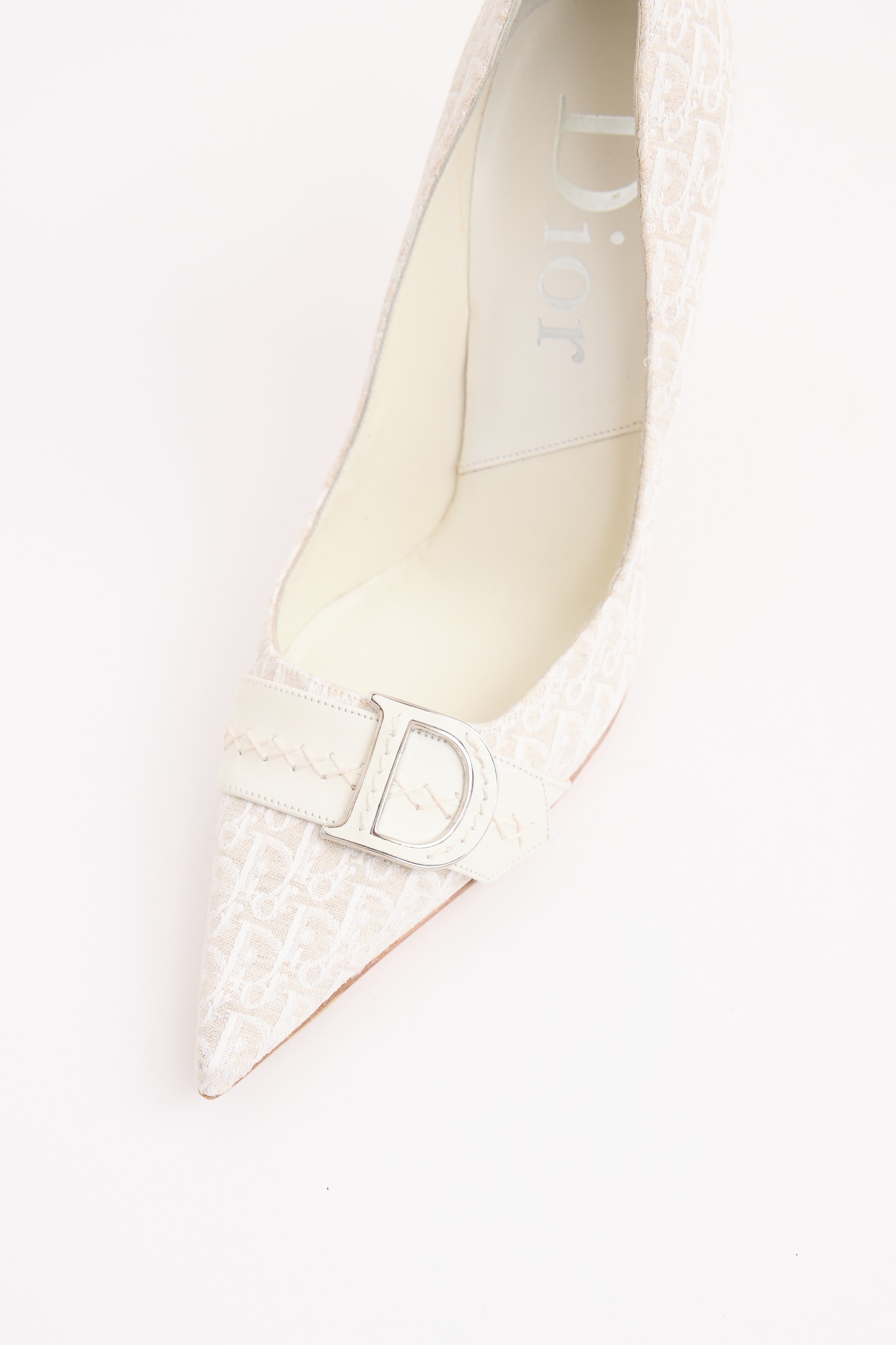 Pre-owned Dior white and beige pumps featuring pointed toe, strap with C and D hardware on toe box, exposed stitching on strap, oblique jacquard upper and stacked wooden heel.