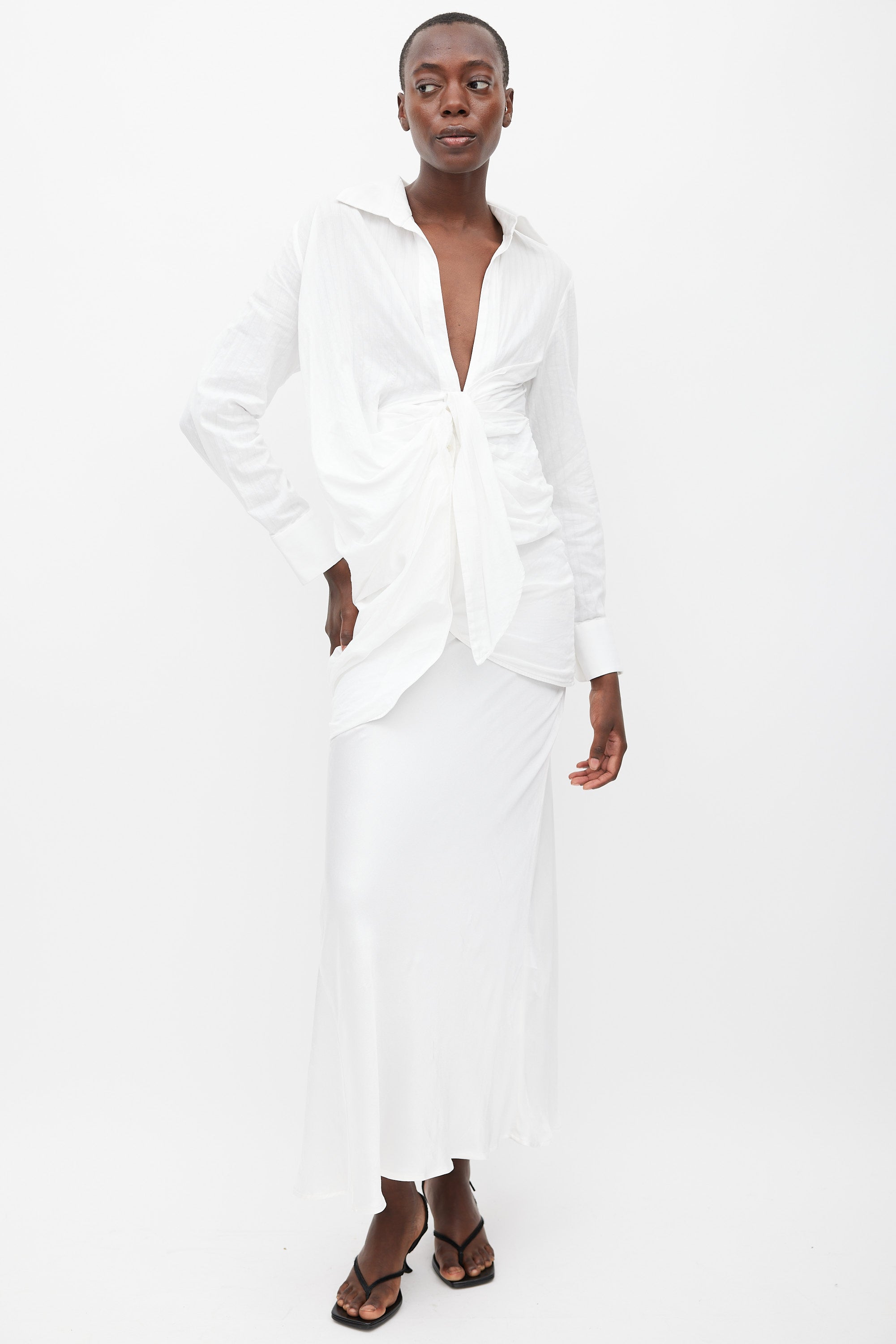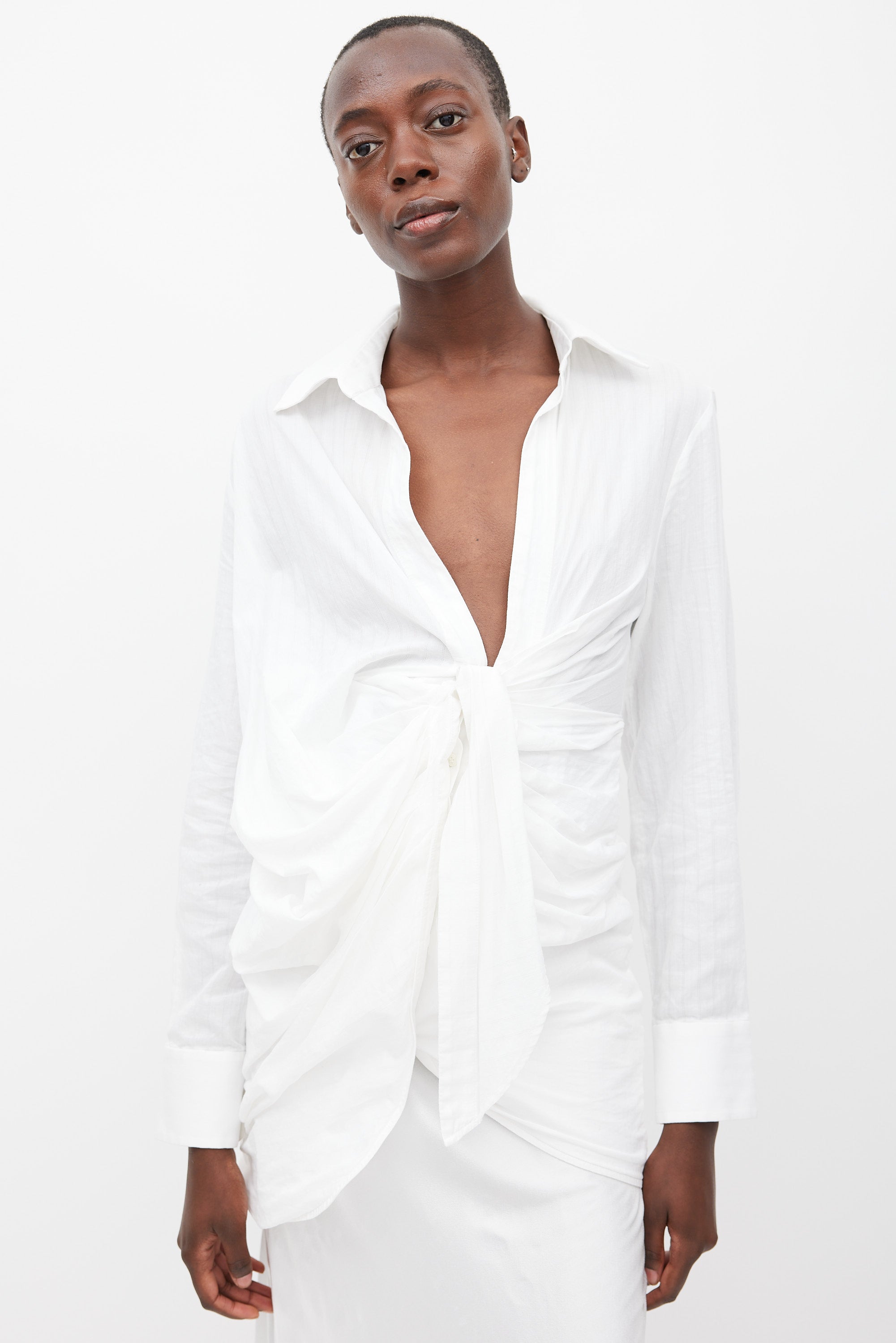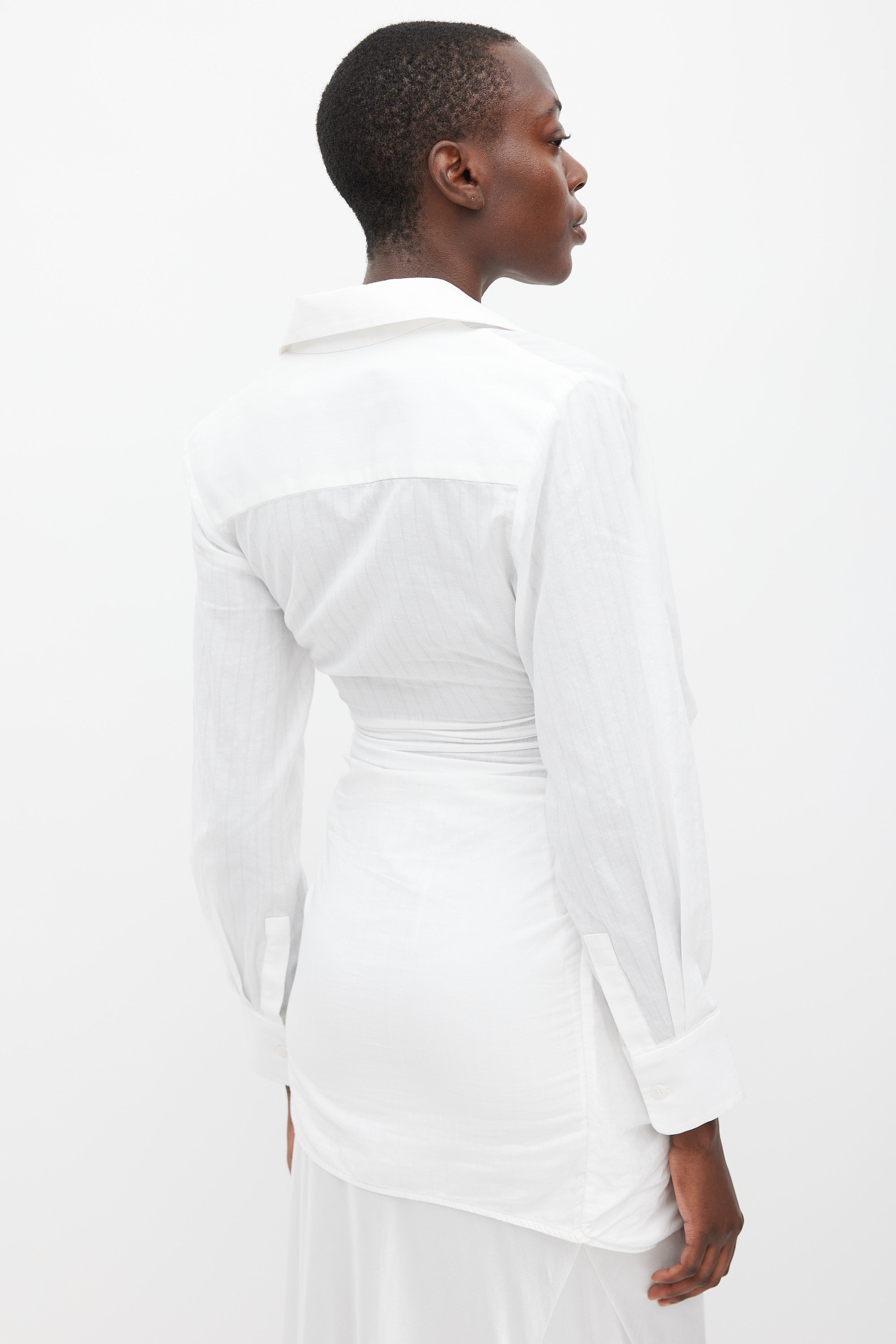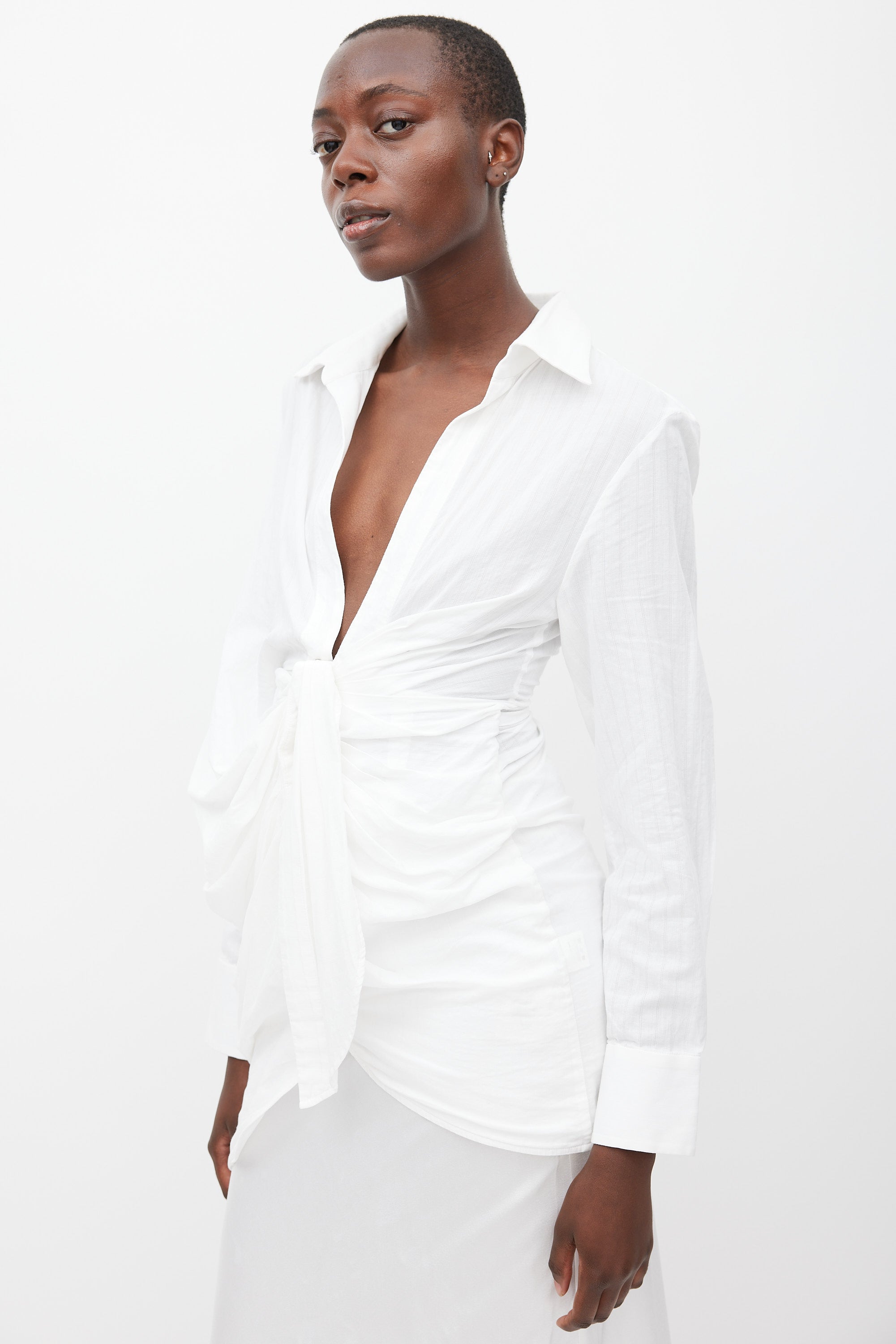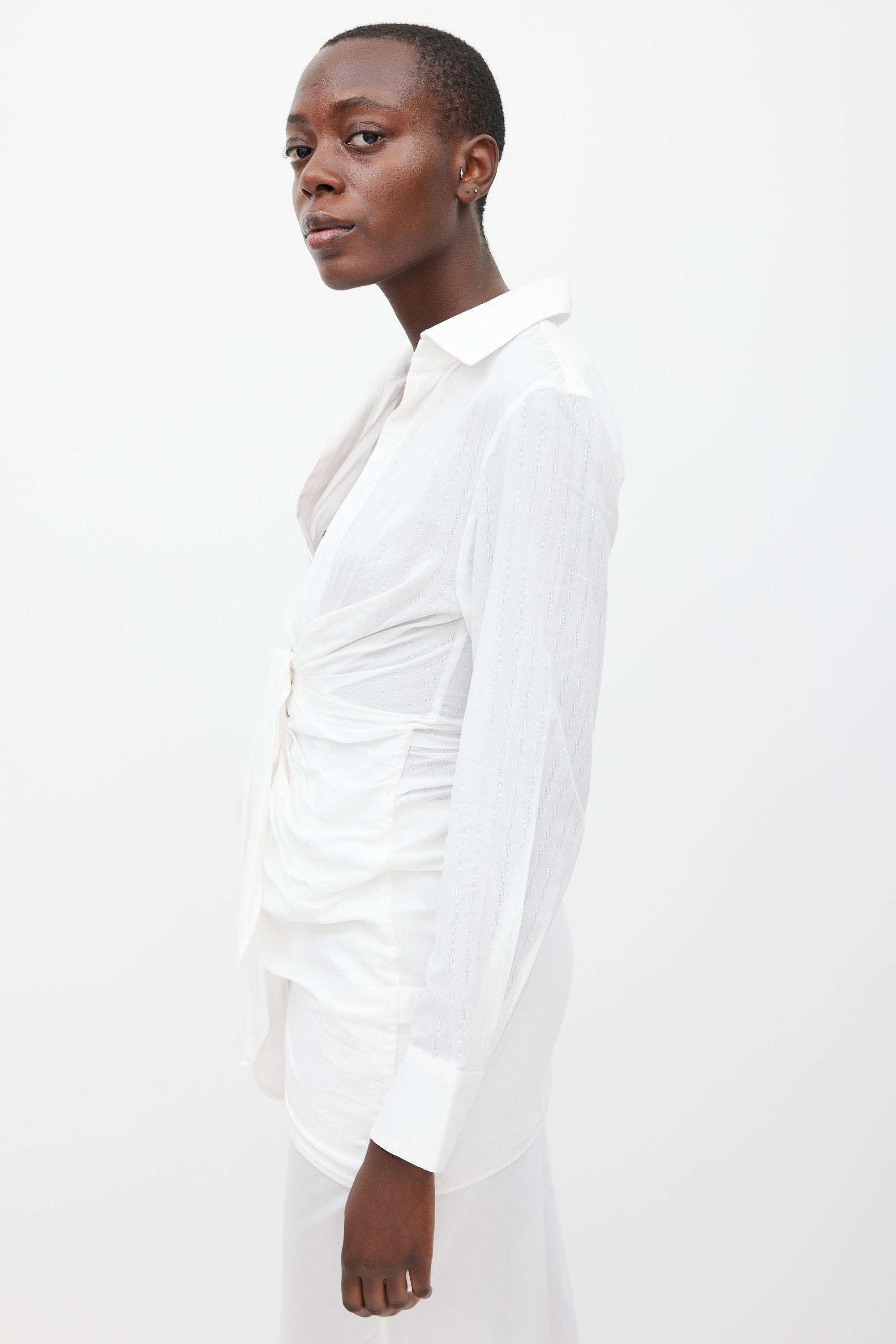 Pre-owned Jacquemus white cotton Le Coup De Soleil mini shirt dress featuring collared neck, plunging neckline, button up lower front, pleated drape front design, and long sleeves with buttoned cuffs. Styled with trousers.
