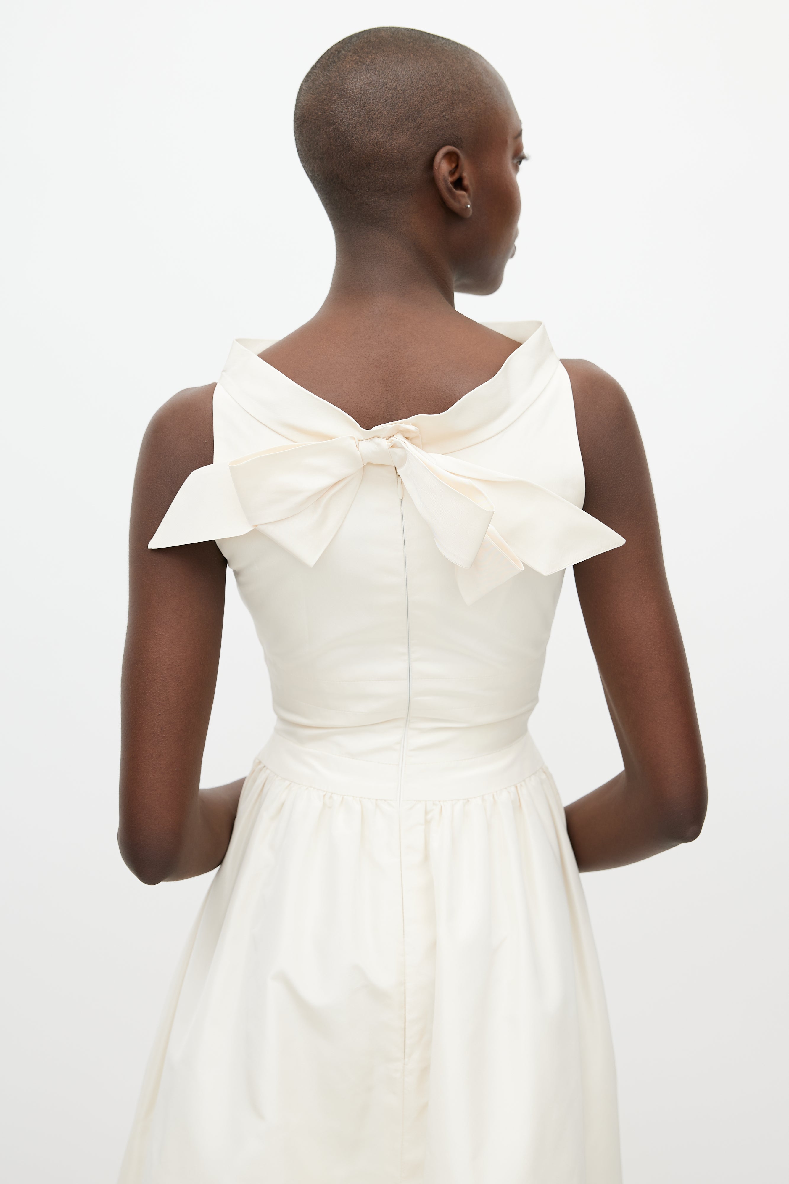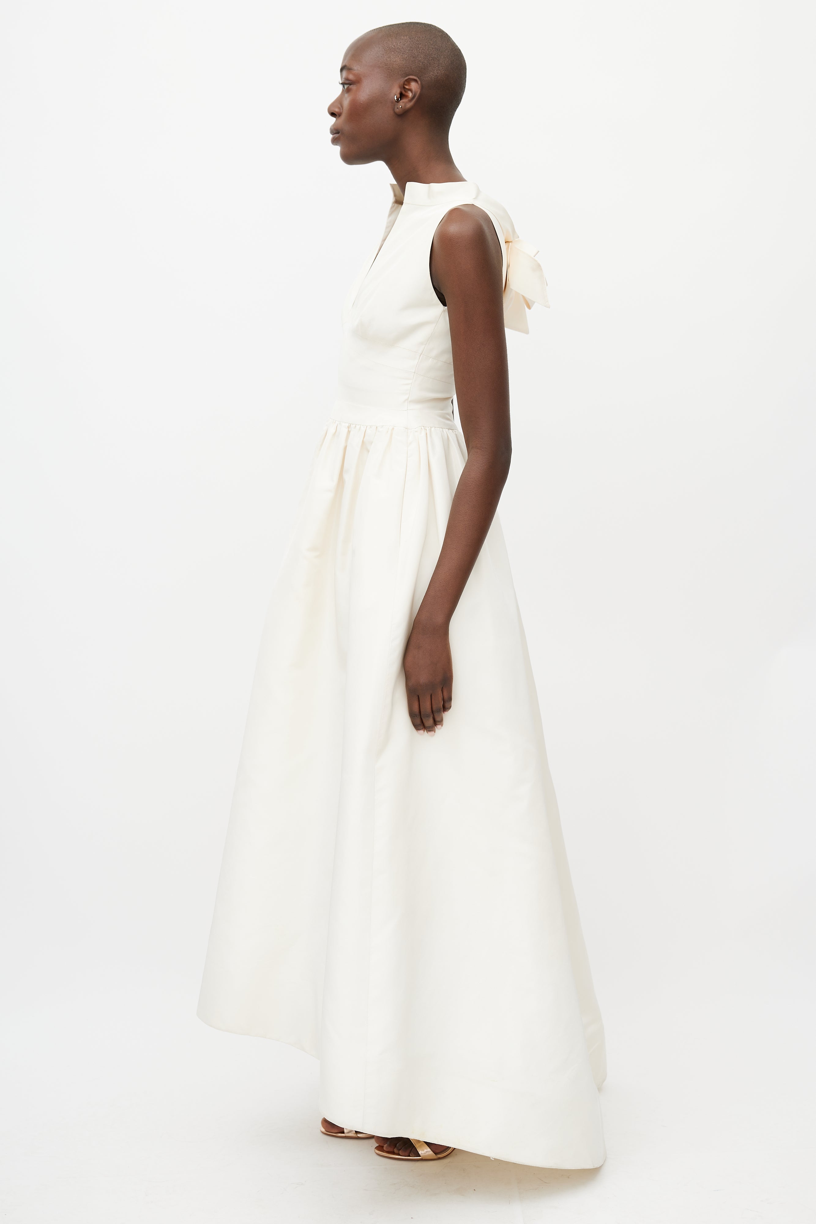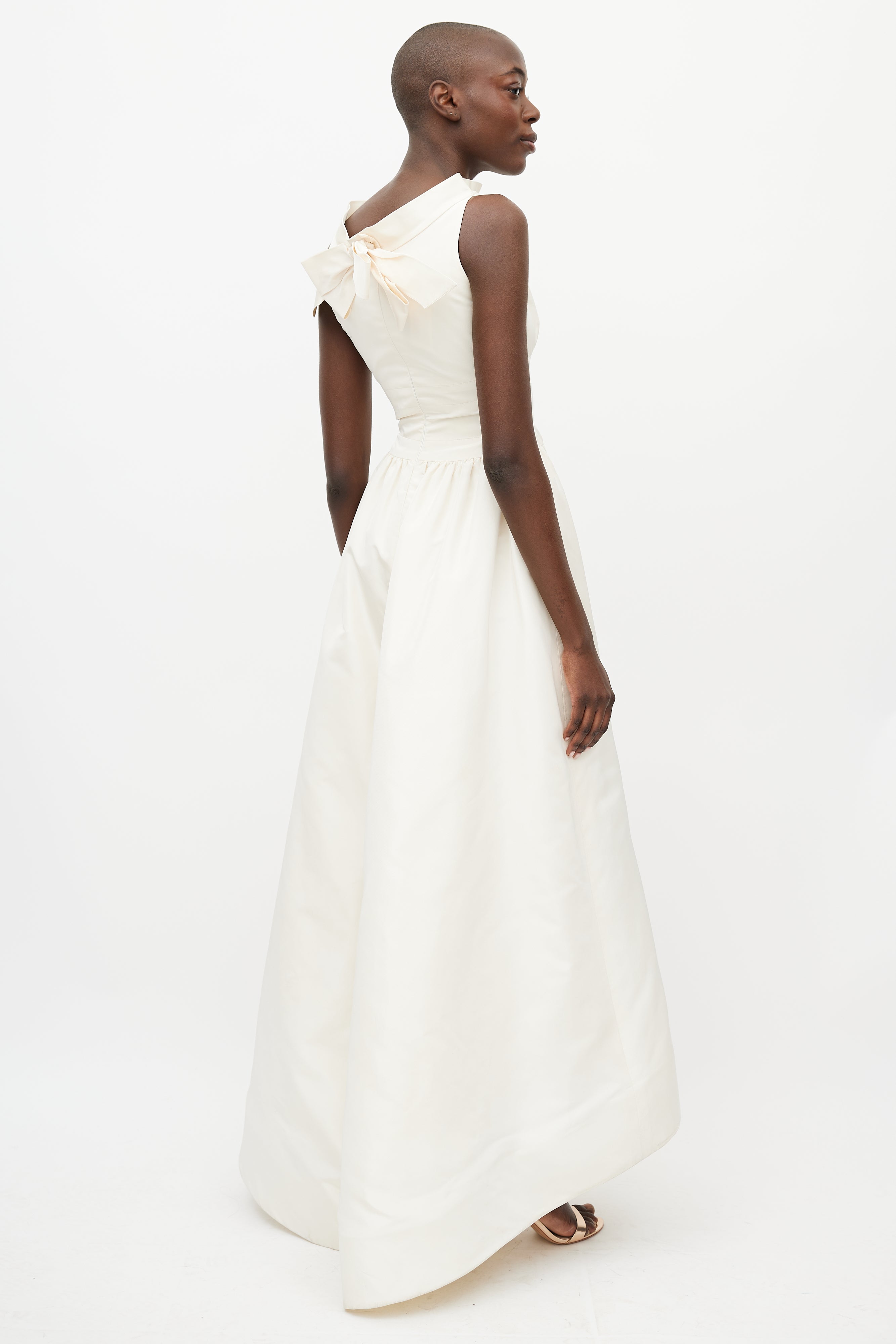 Pre-owned Oscar de la Renta Bridal Spring 2008 cream silk dress featuring high collar, V-neckline, two concealed hip pockets, hi-low hem, and attached bow at back. Lined.