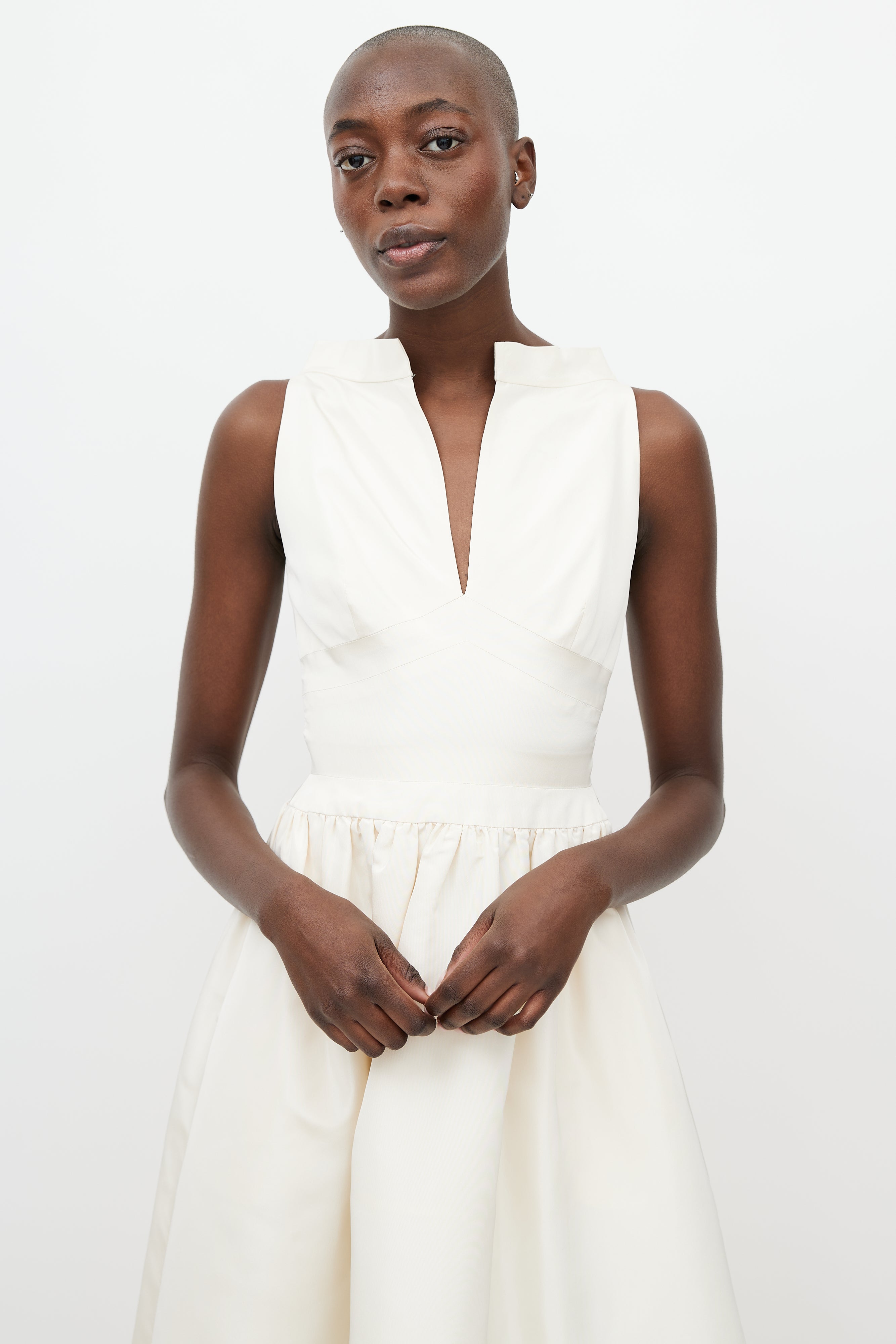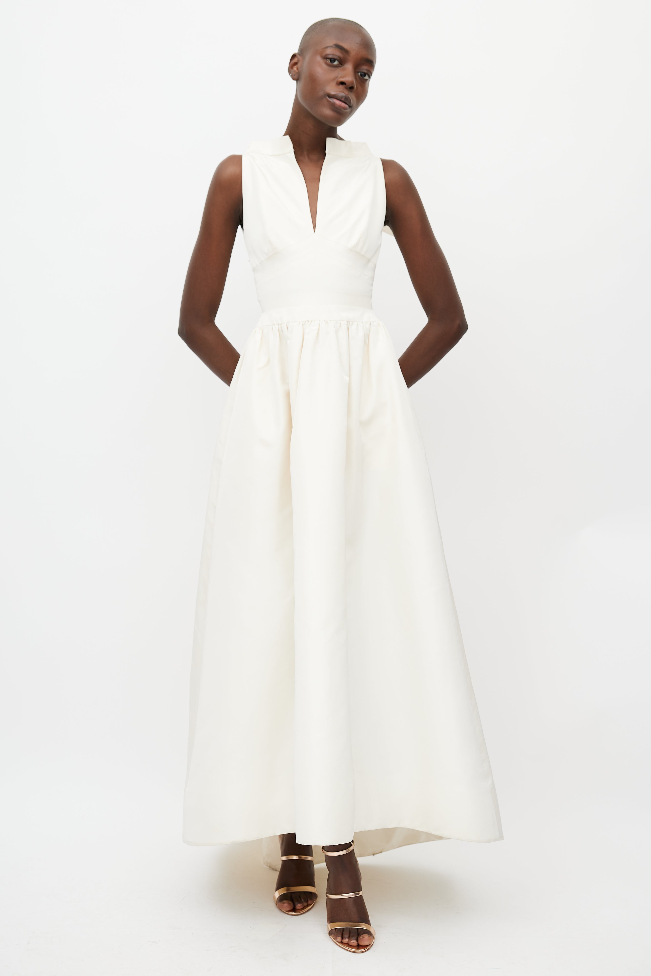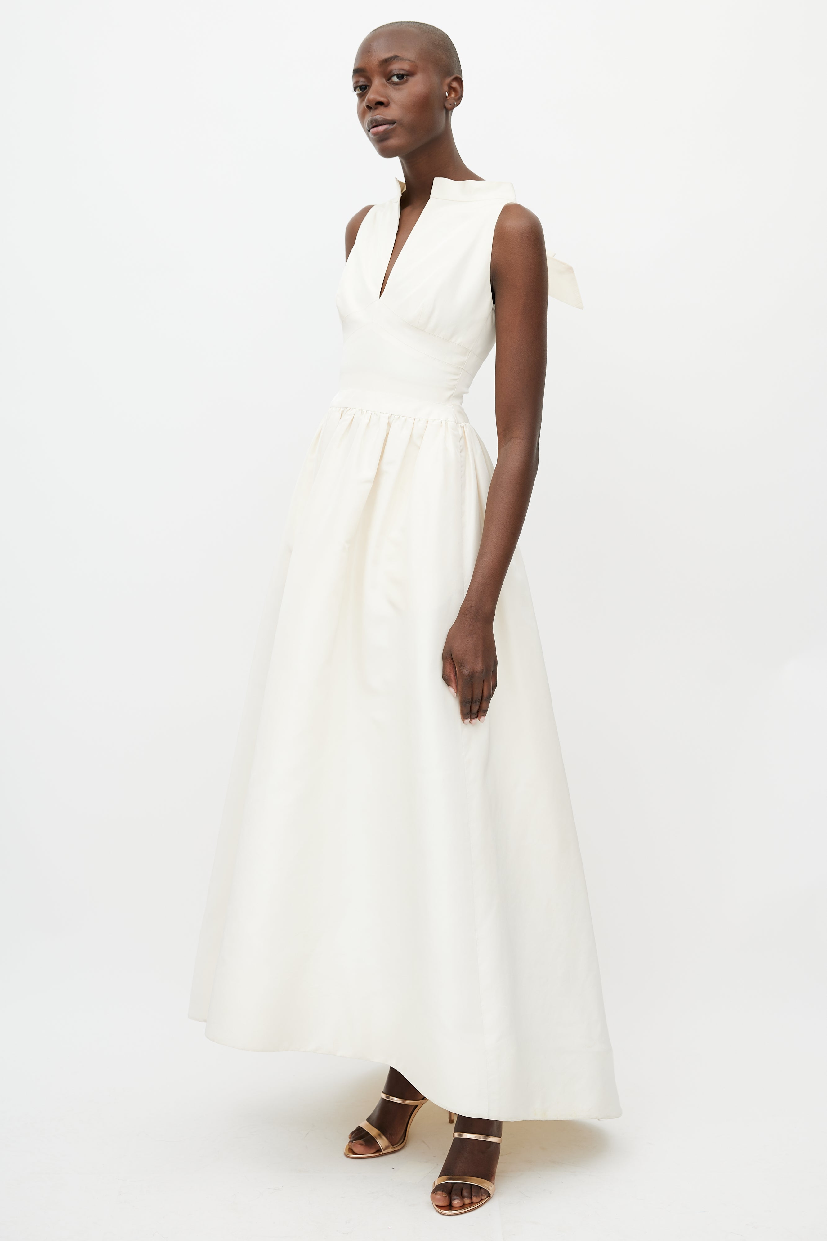 Pre-owned Oscar de la Renta Bridal Spring 2008 cream silk dress featuring high collar, V-neckline, two concealed hip pockets, hi-low hem, and attached bow at back. Lined.
