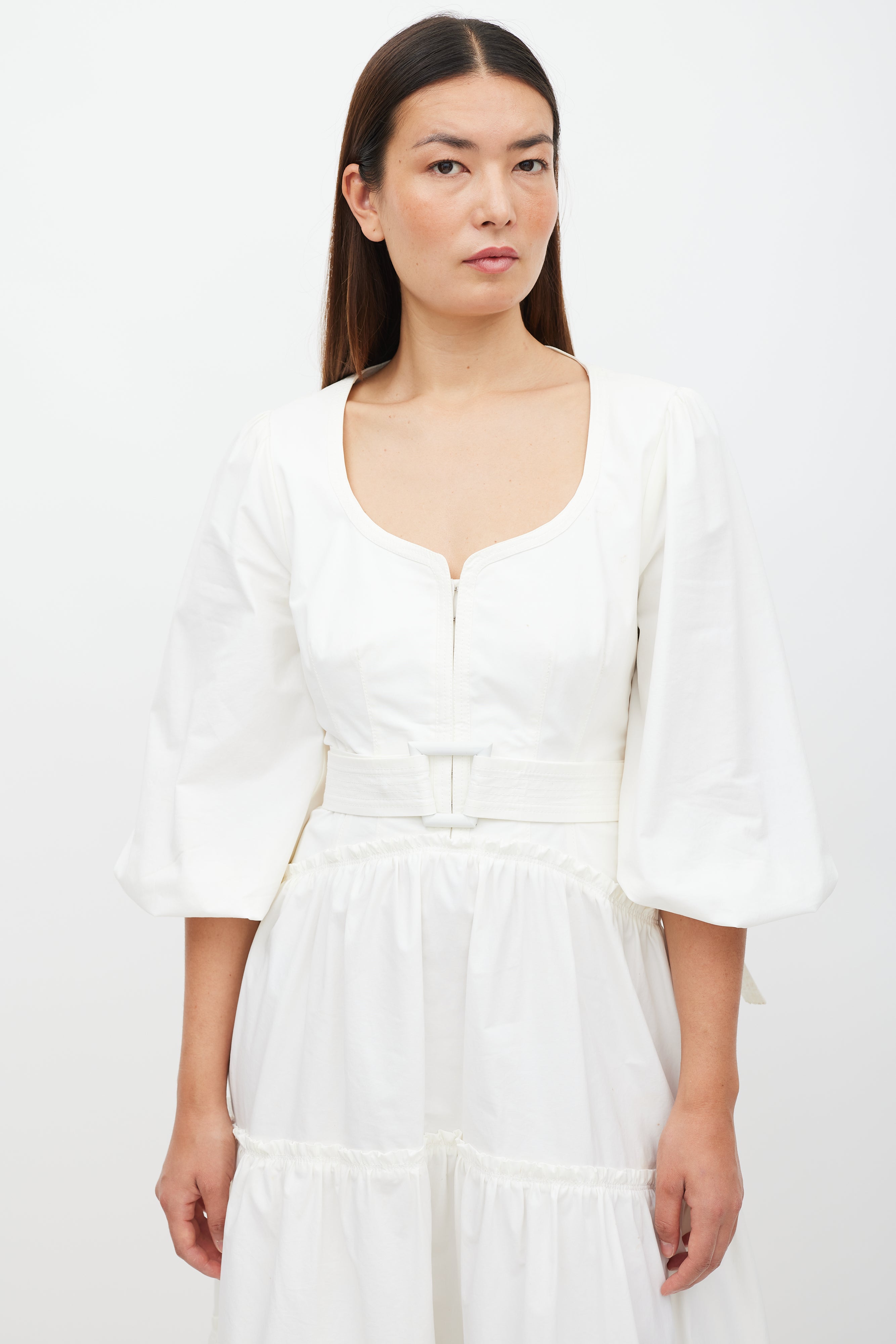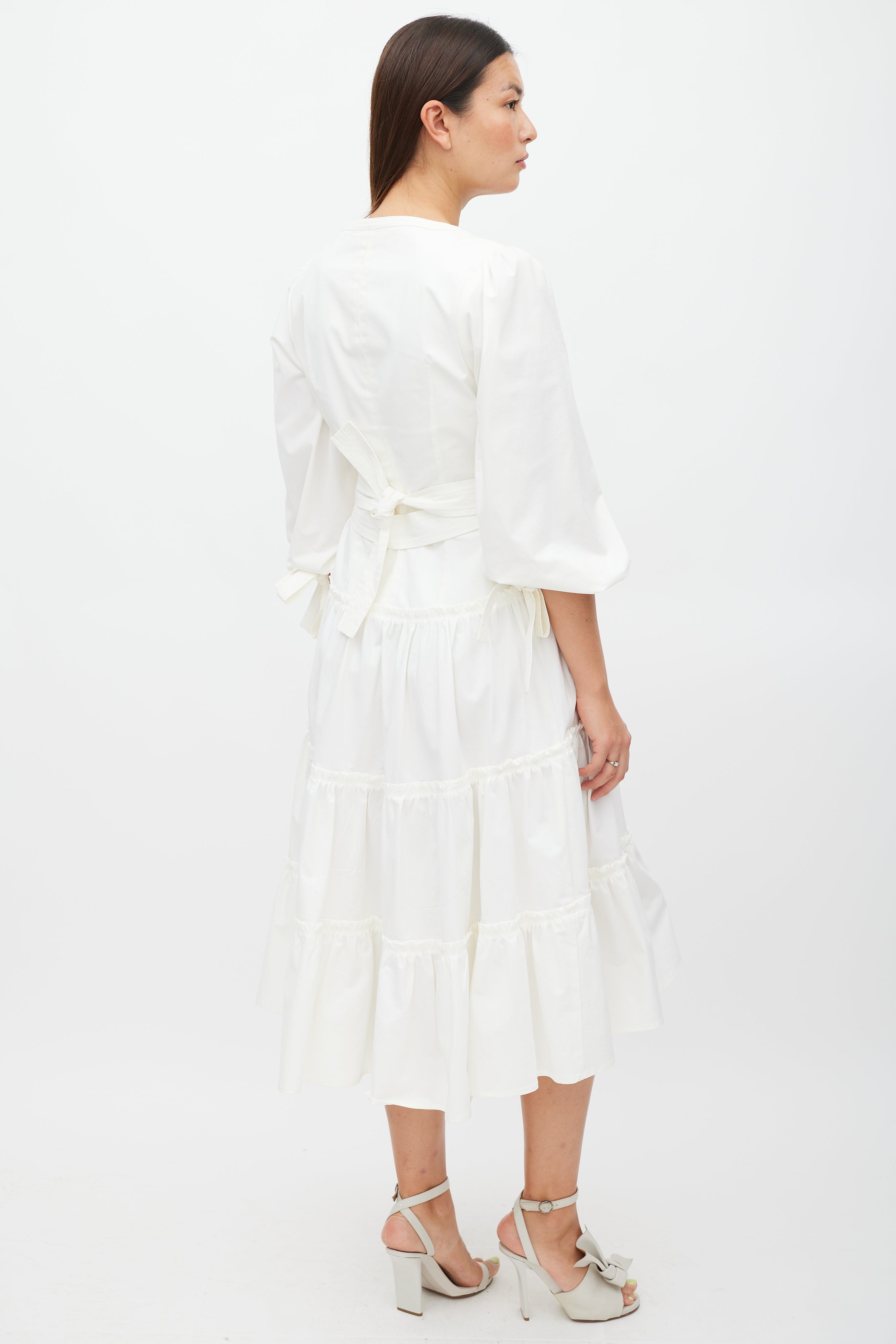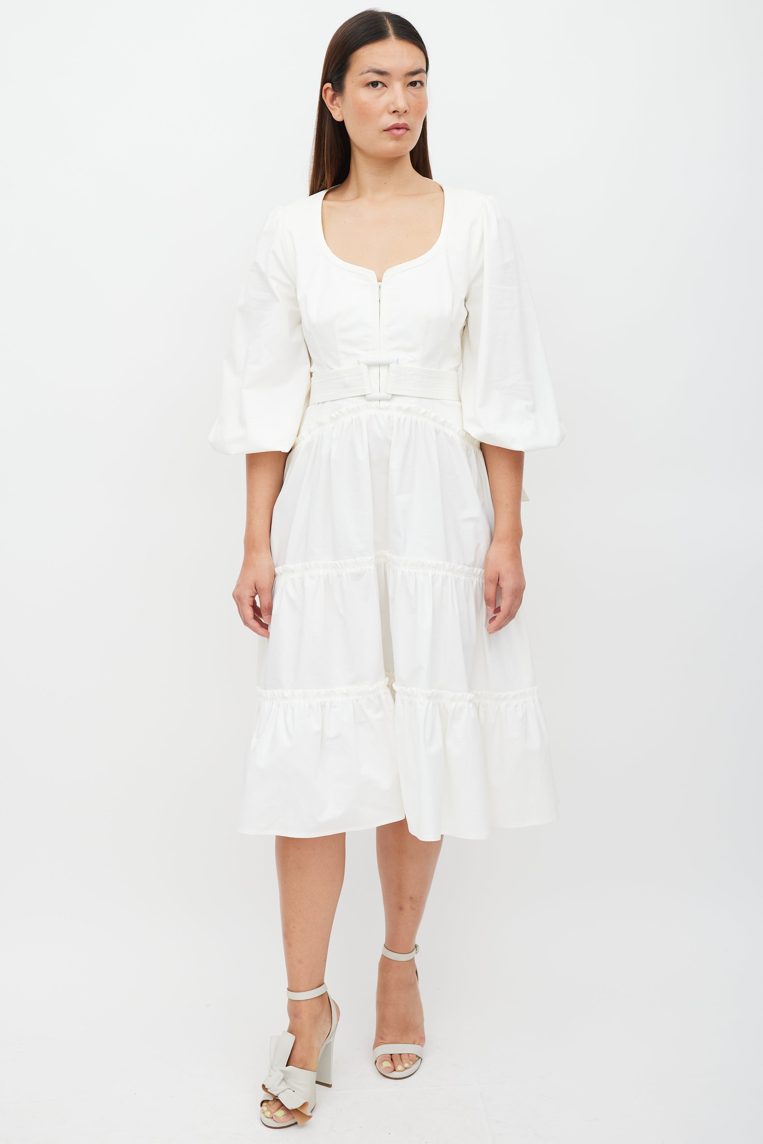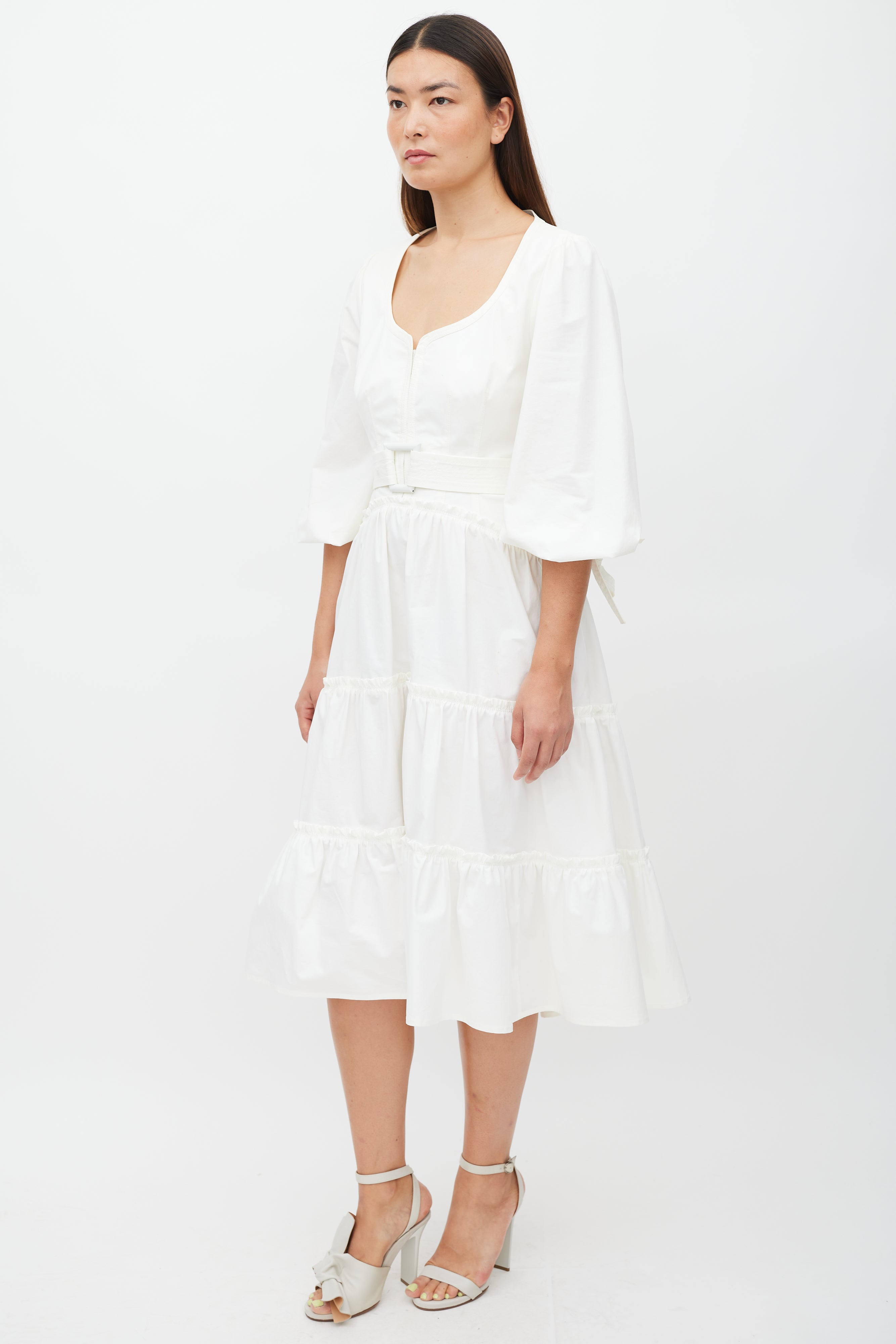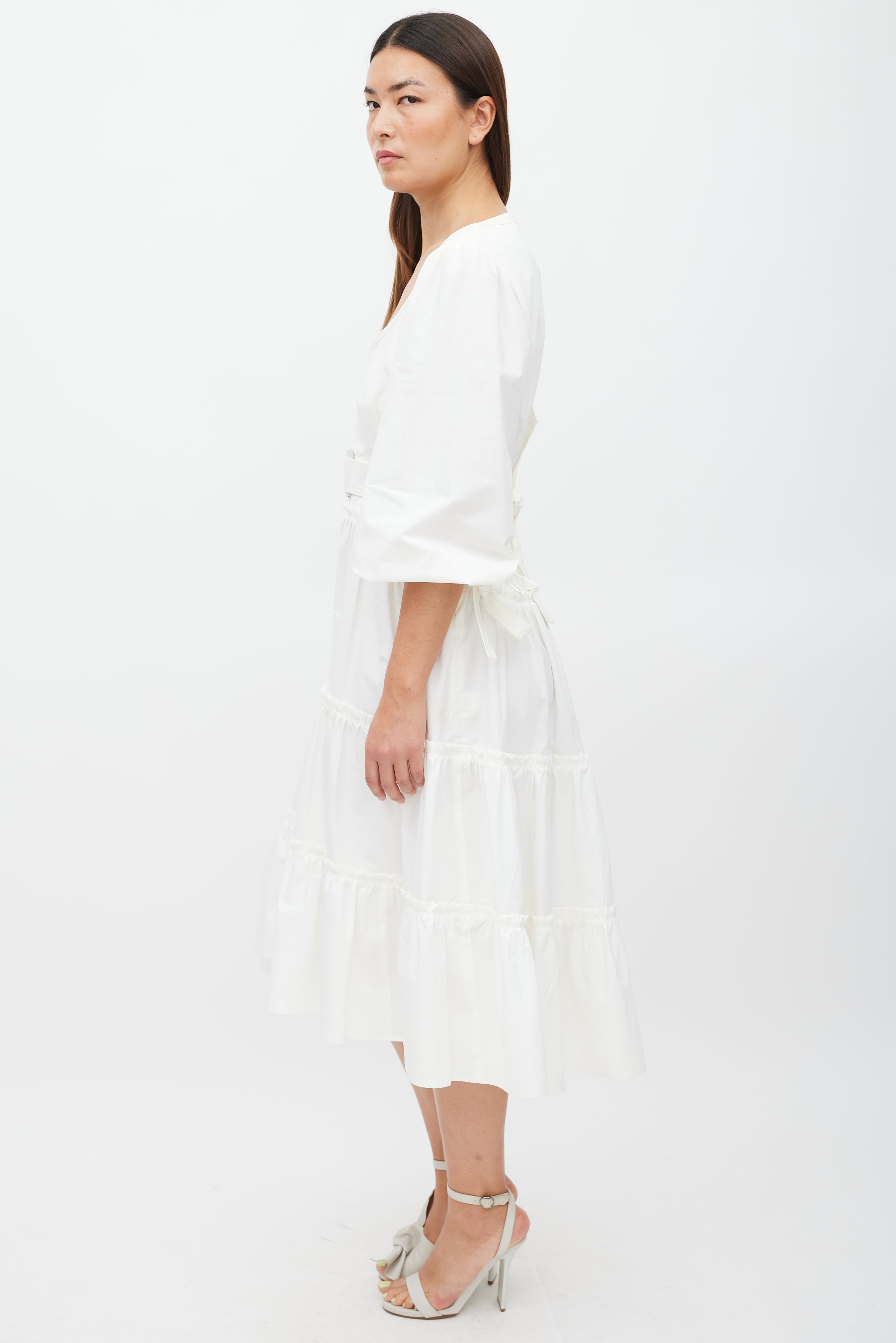 Pre-owned Proenza Schouler white dress featuring a scoop neckline, long sleeves with tie cuffs, adjustable belt at waist, tiered skirt with ruffled trim, hook and eye trim at front, and zip closure at side.