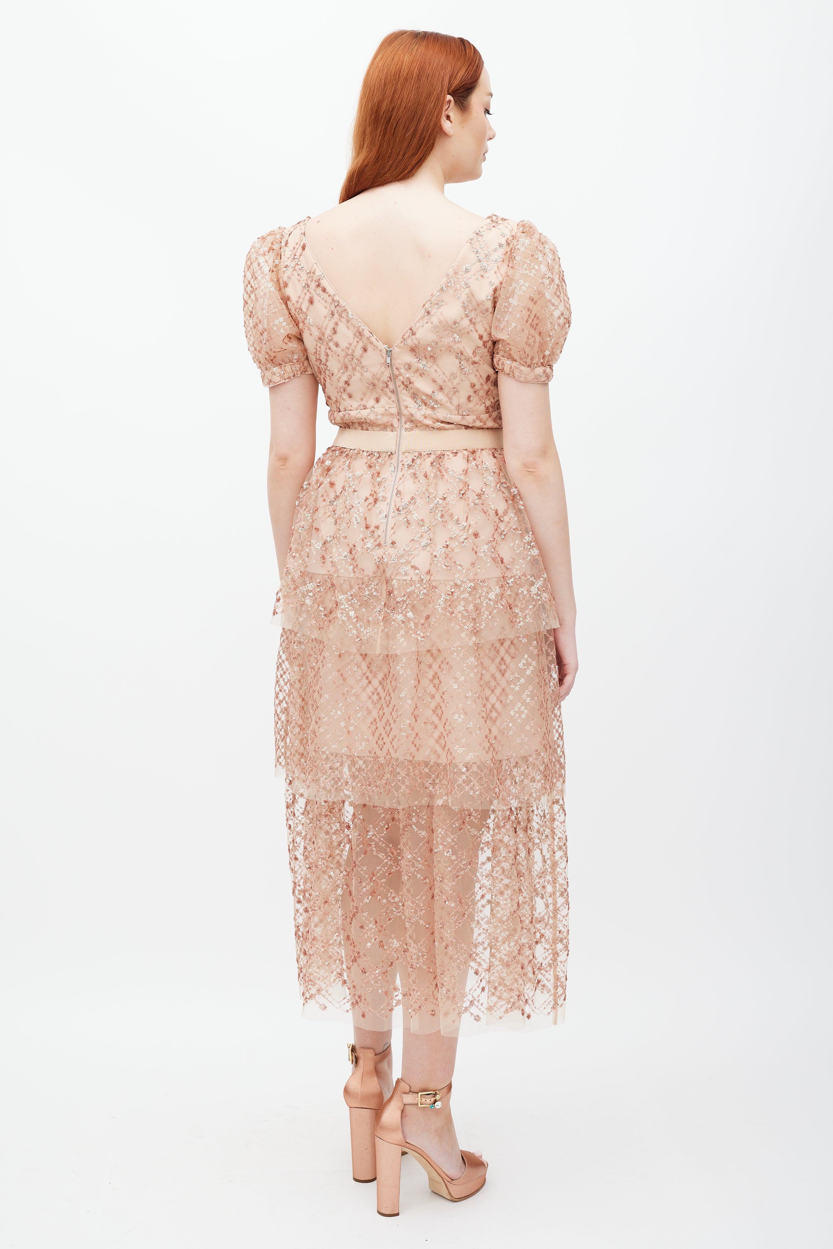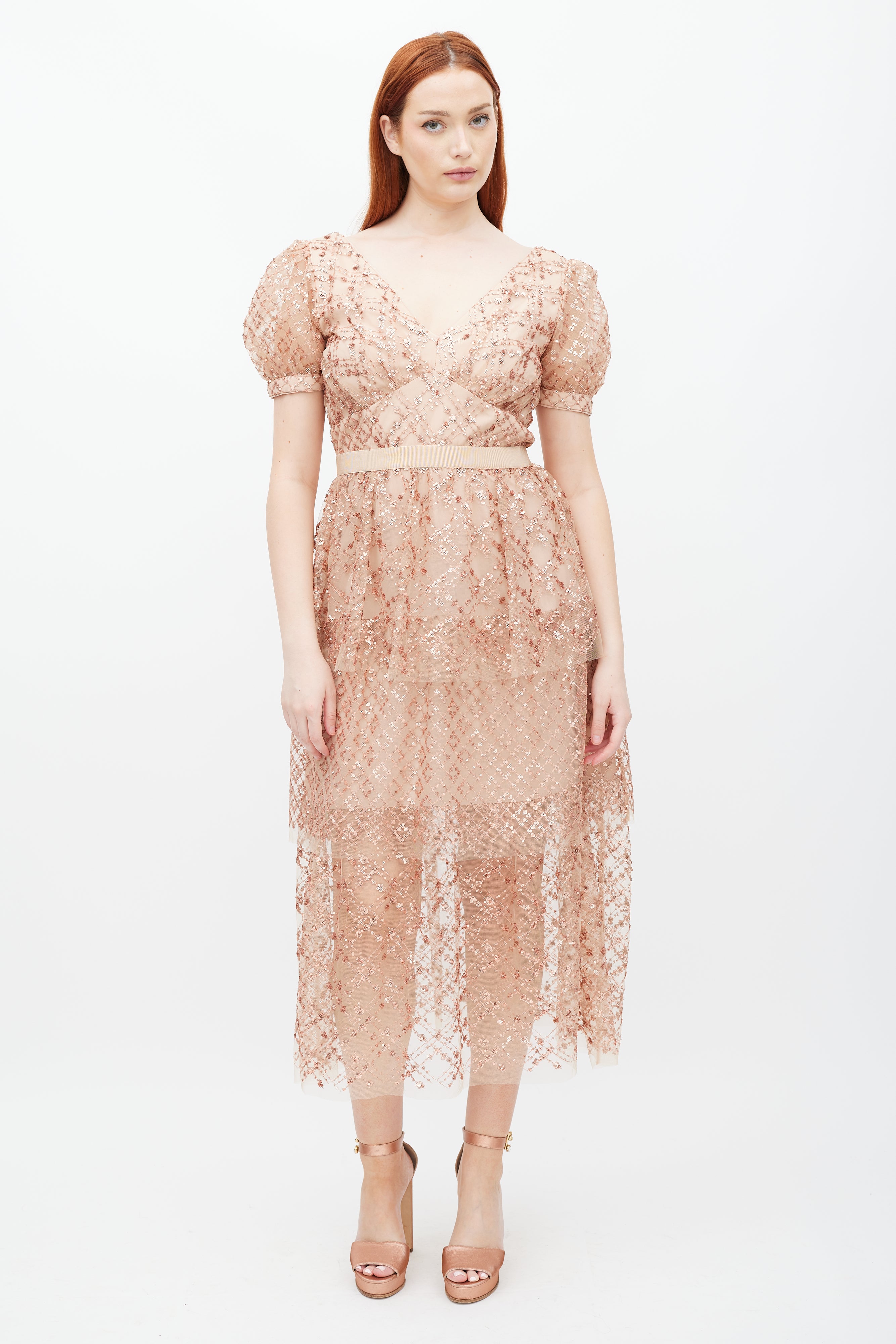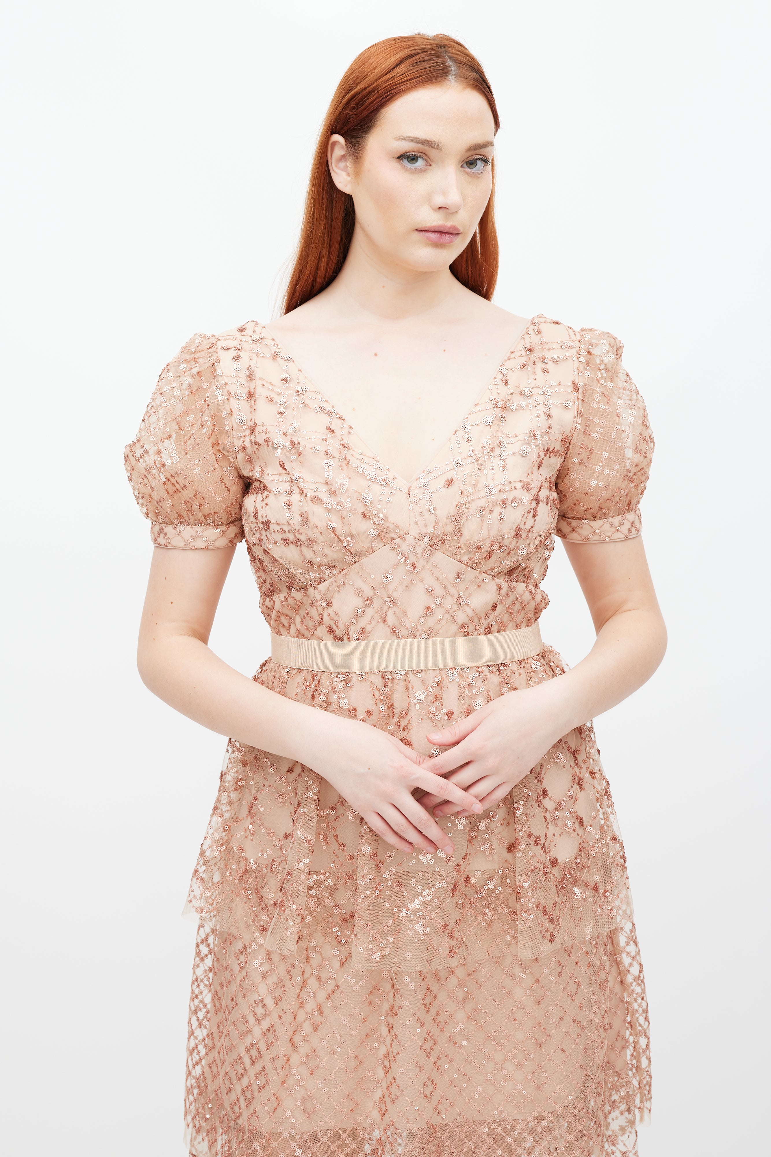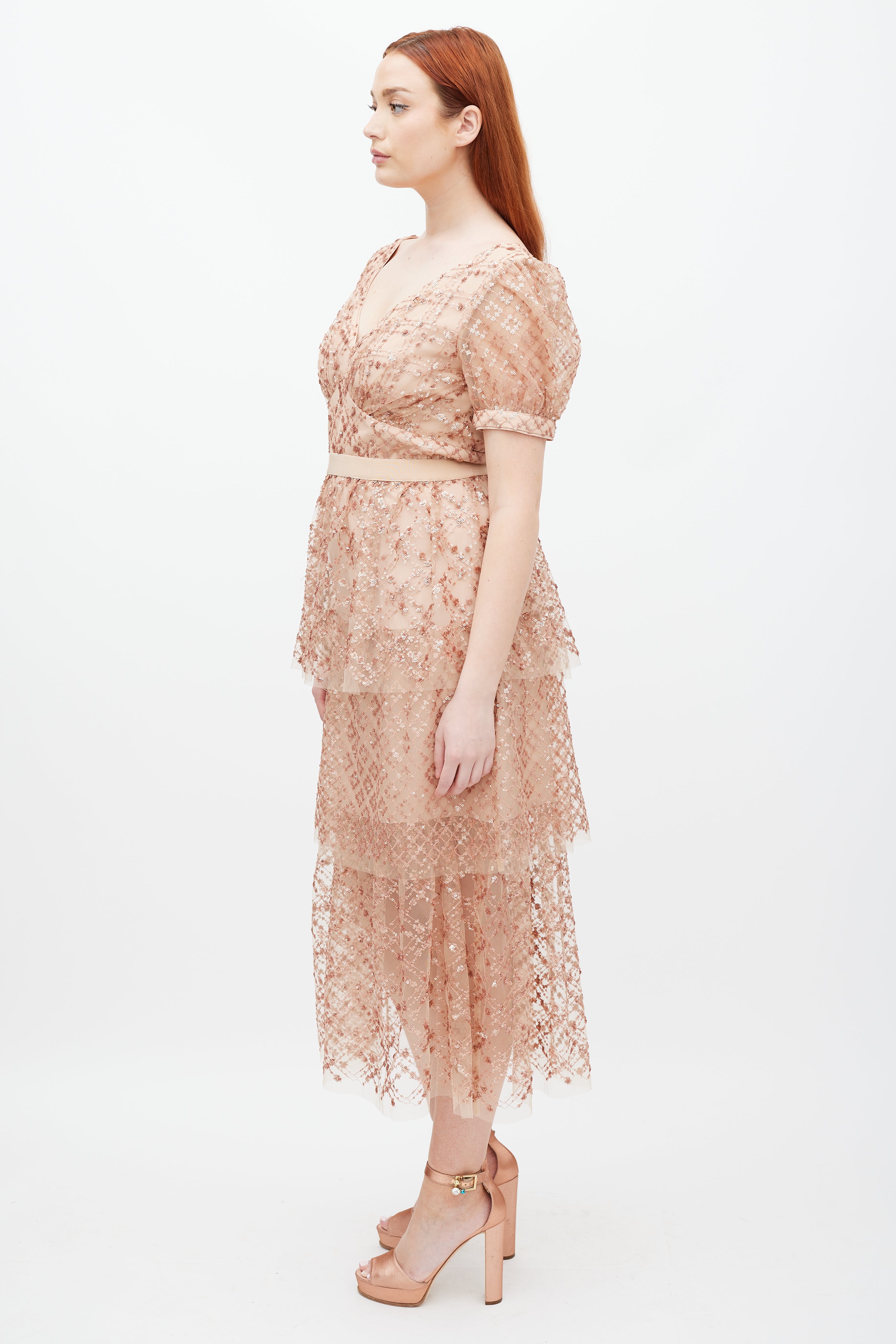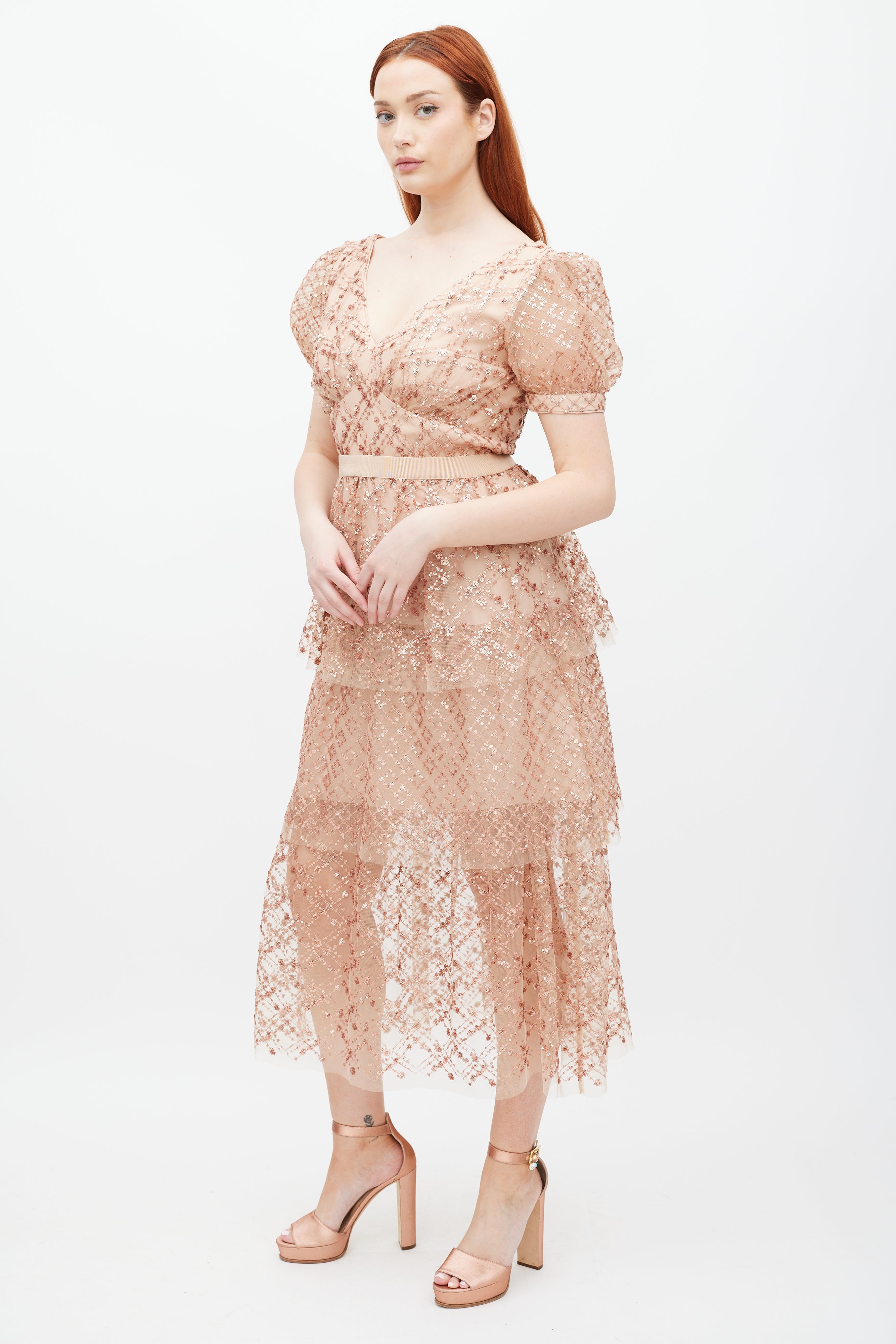 Pre-owned Self-Portrait beige Grid dress featuring a V-neckline, short sleeves, tonal sequin detailing, tiered skirt, and zip at back with hook and eye closure. Lined. Clipped to fit model.