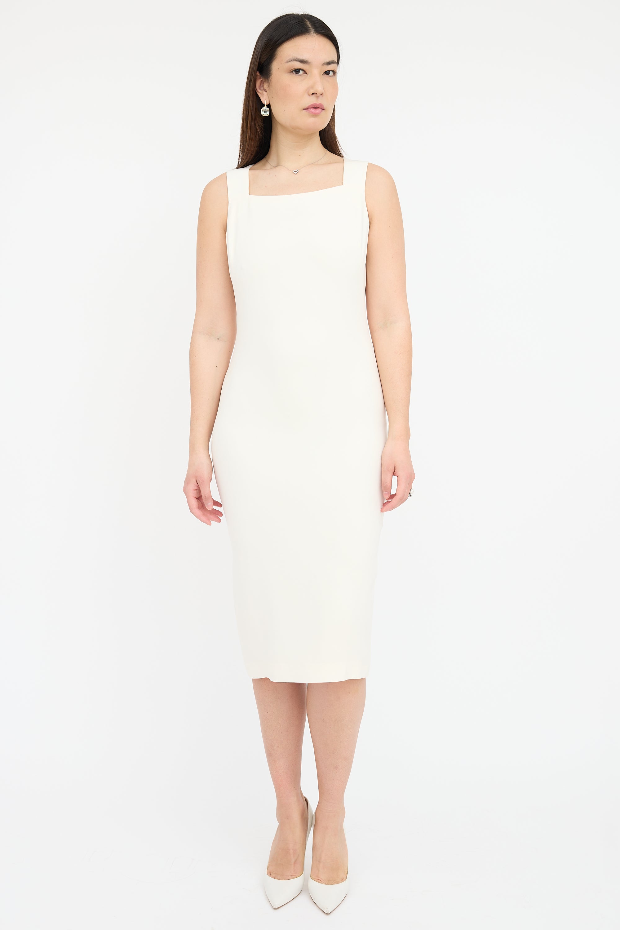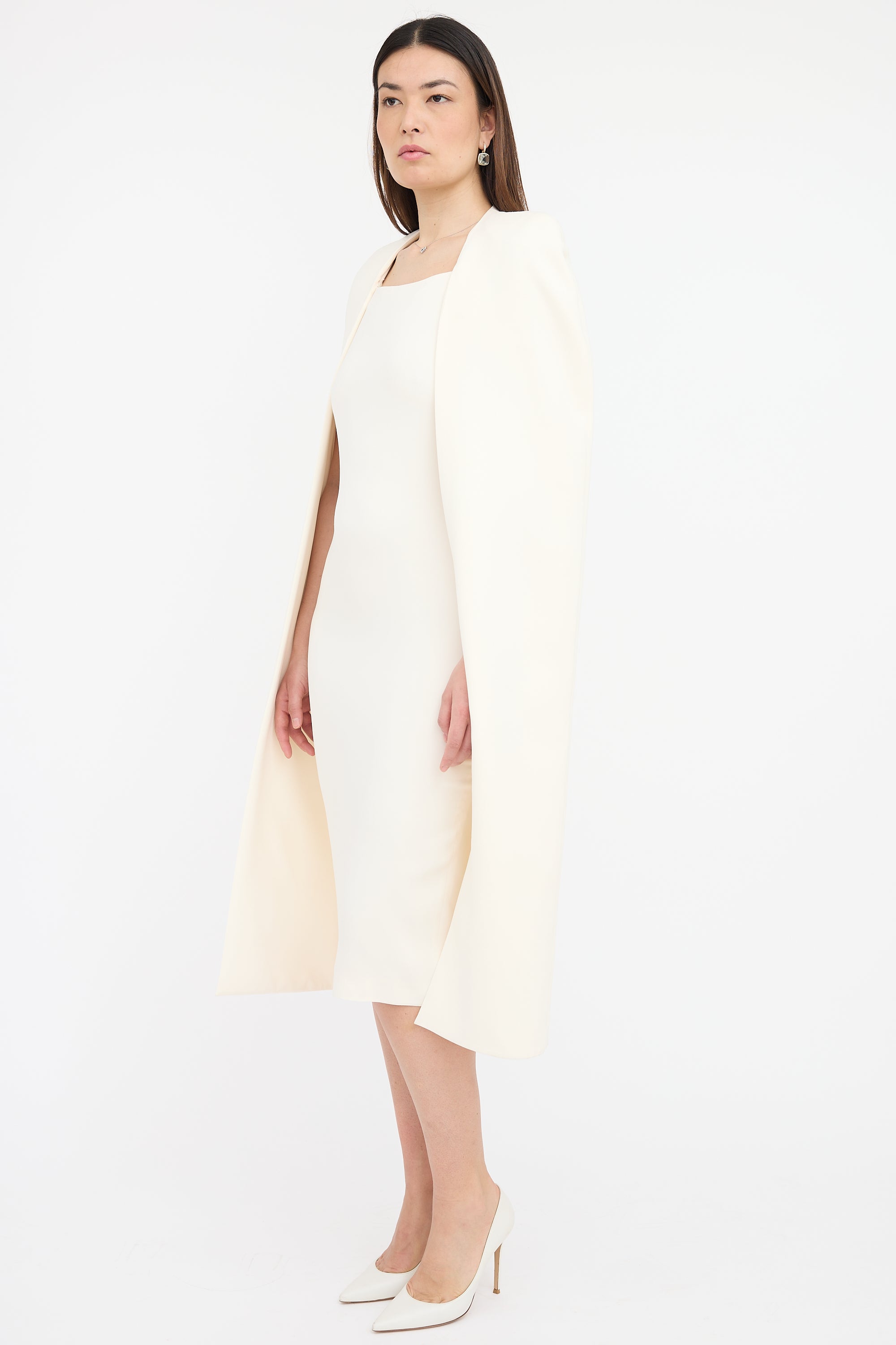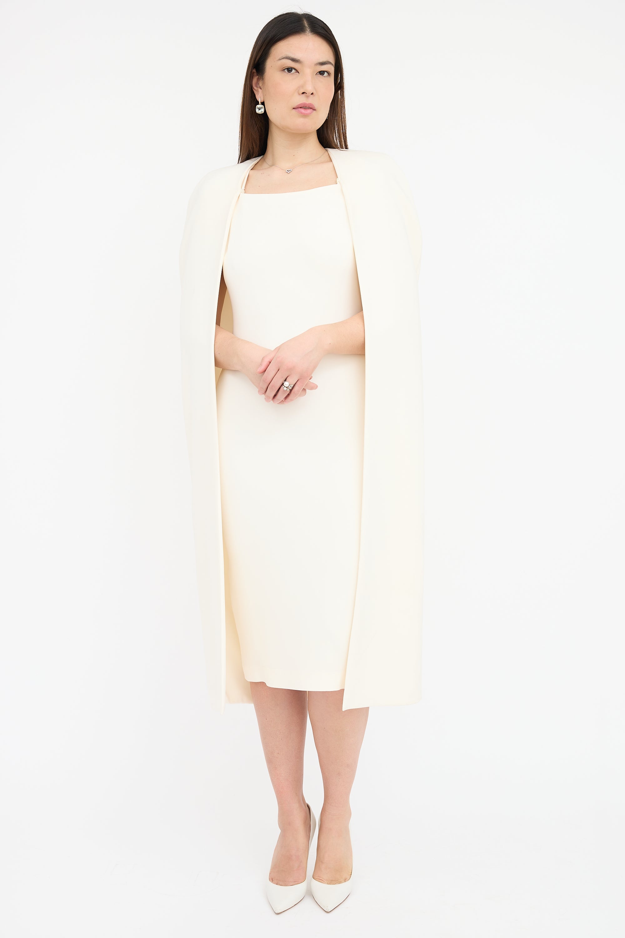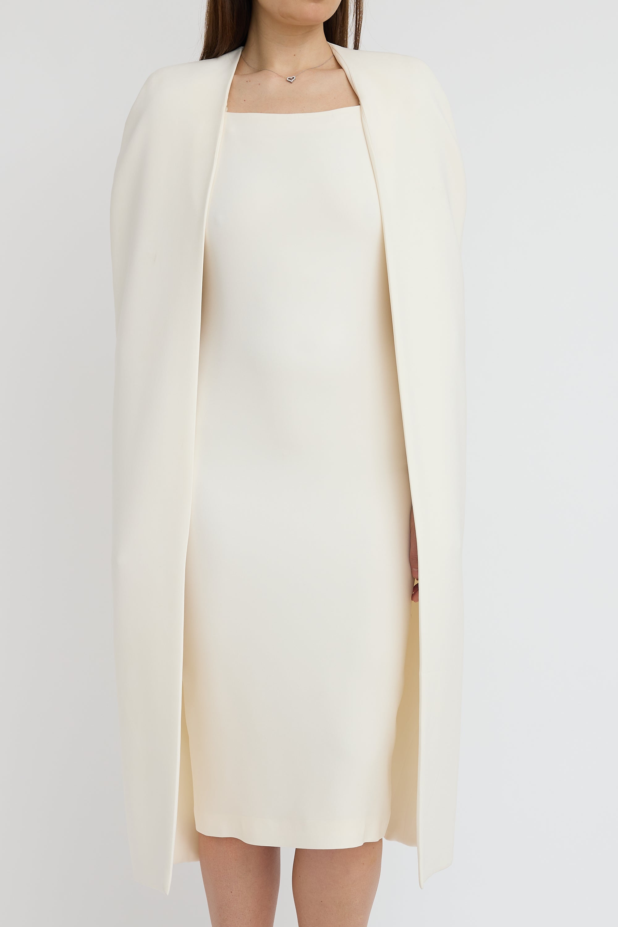 Pre-owned Tom Ford cream silk blend crepe dress featuring sleeveless midi dress with square neckline, back vent, concealed back zip, and detachable cape. Both dress and cape are lined.