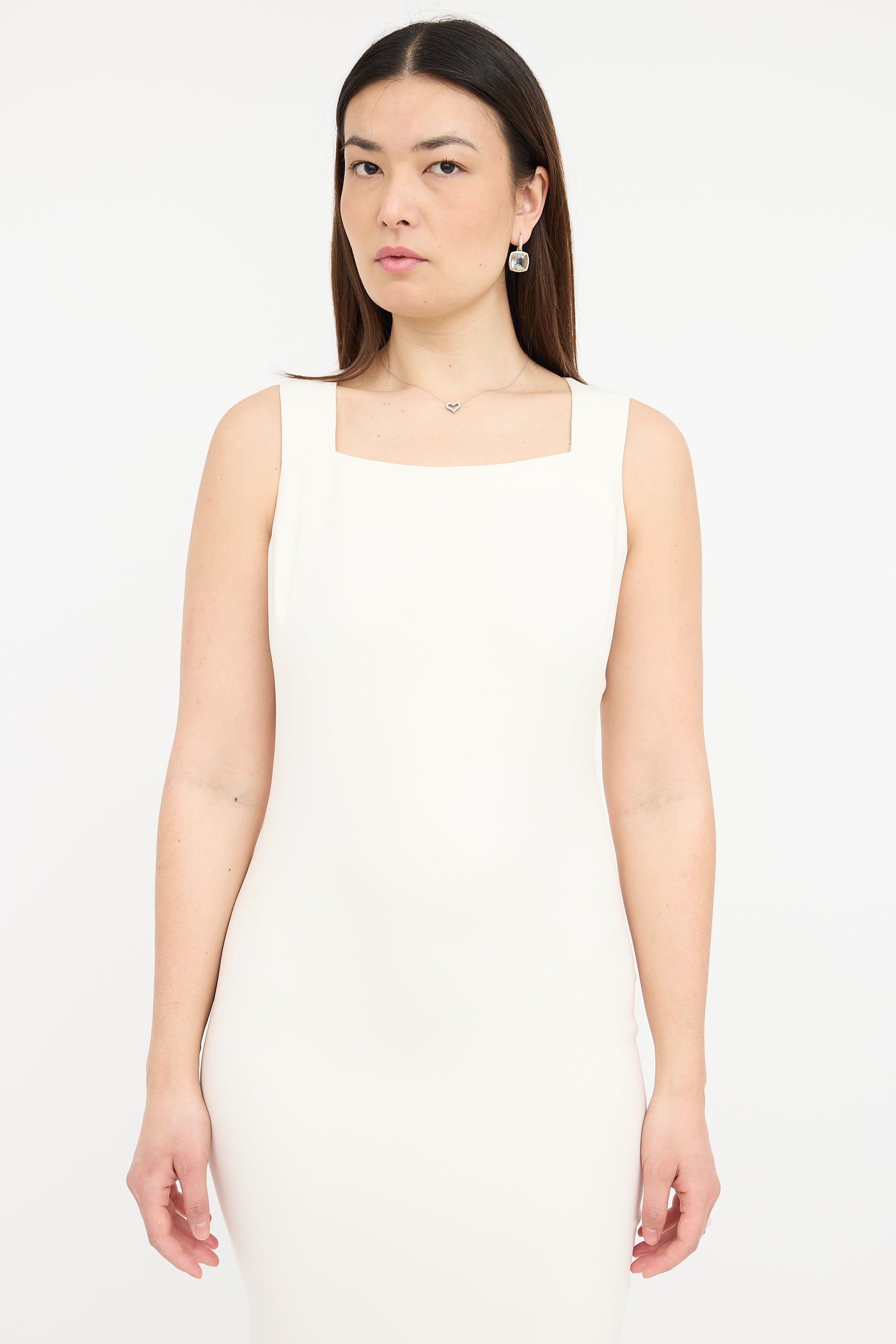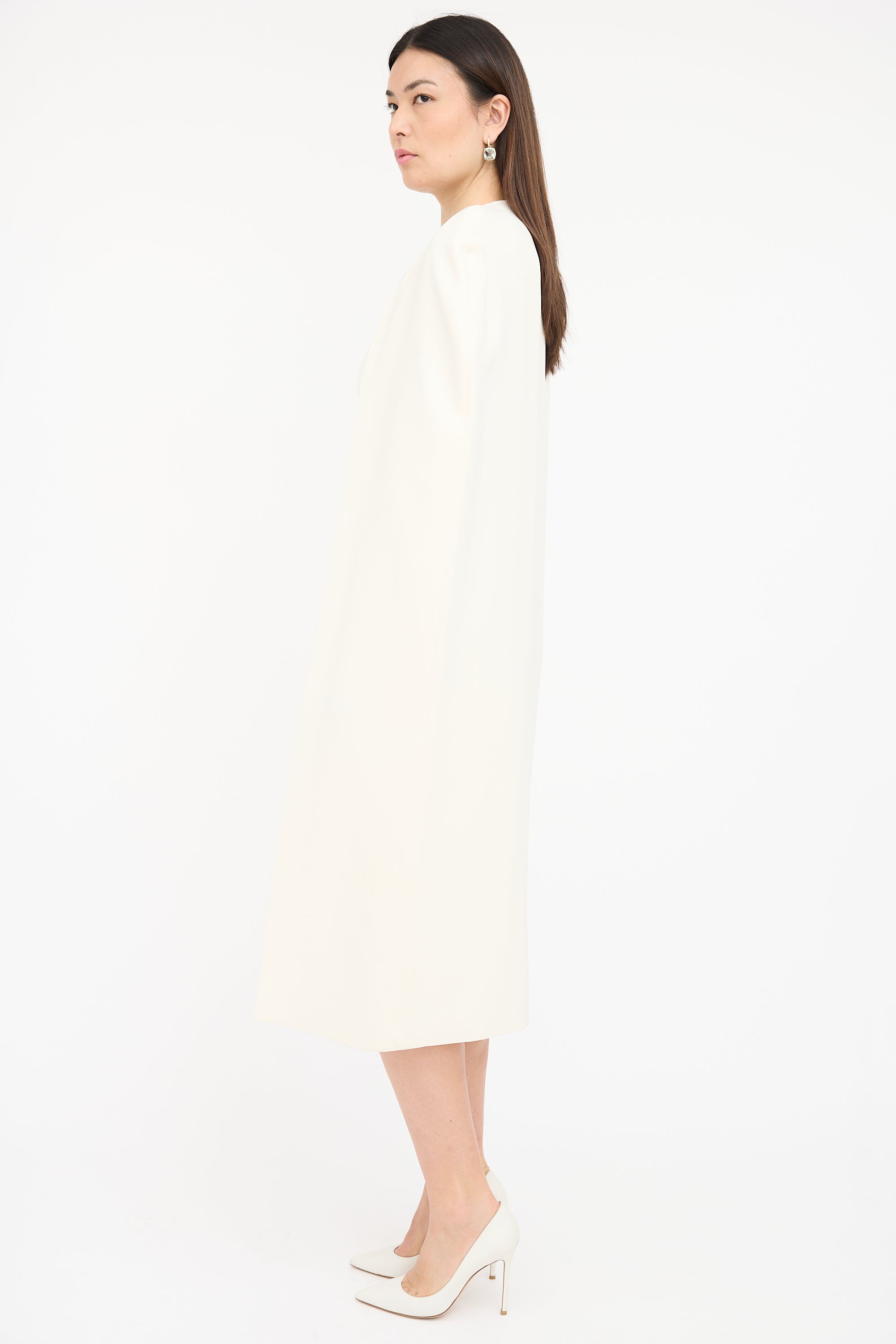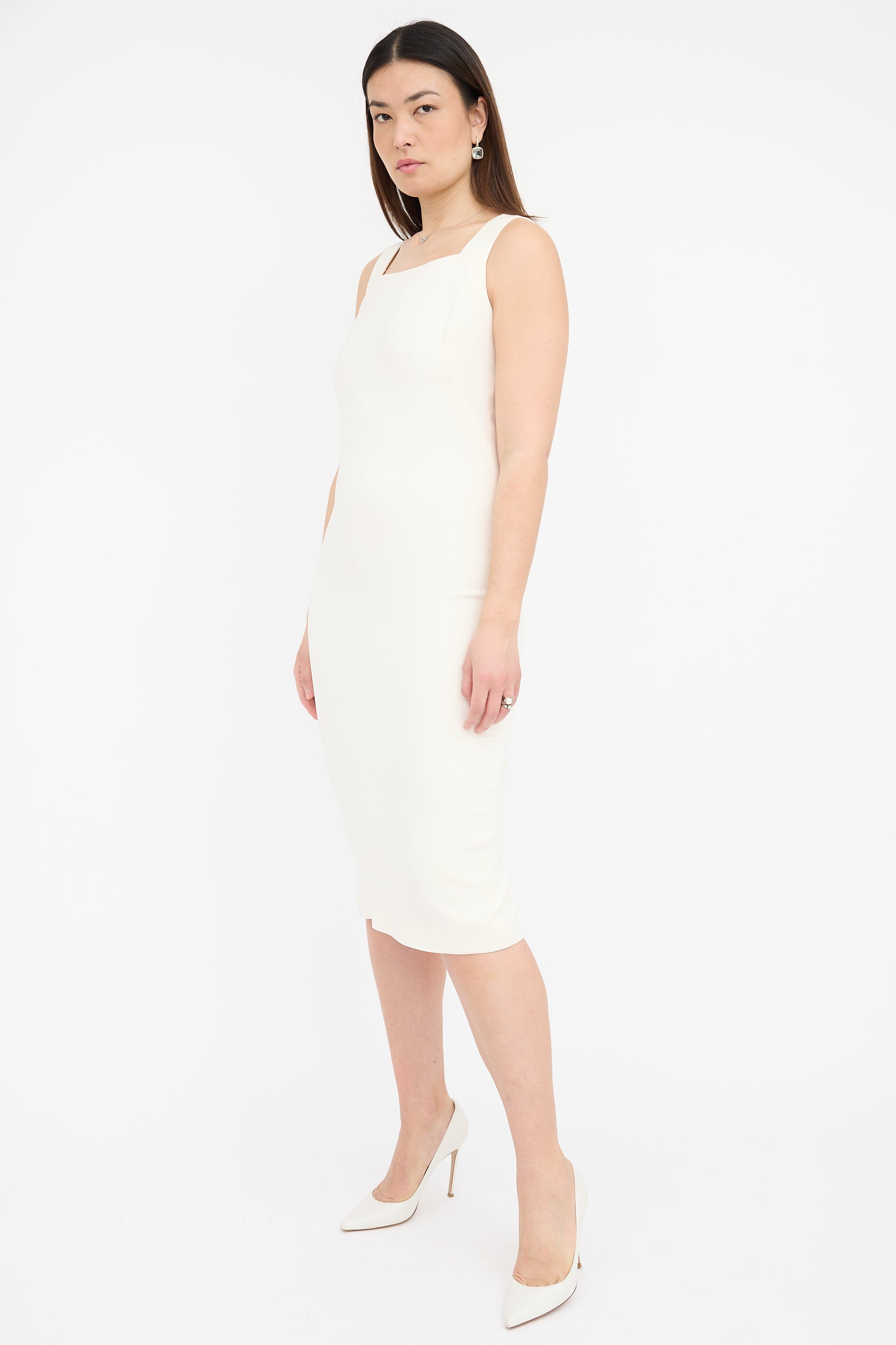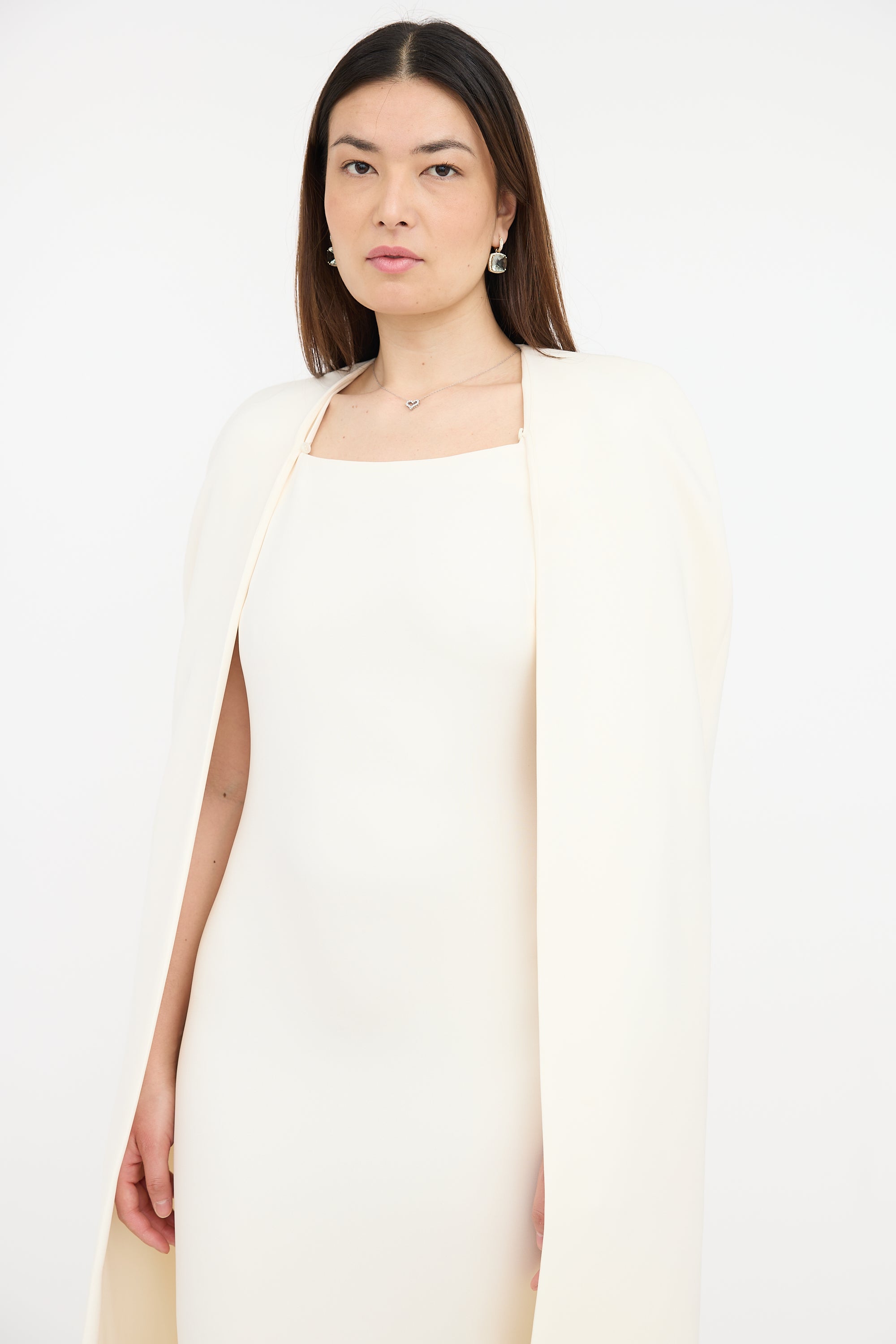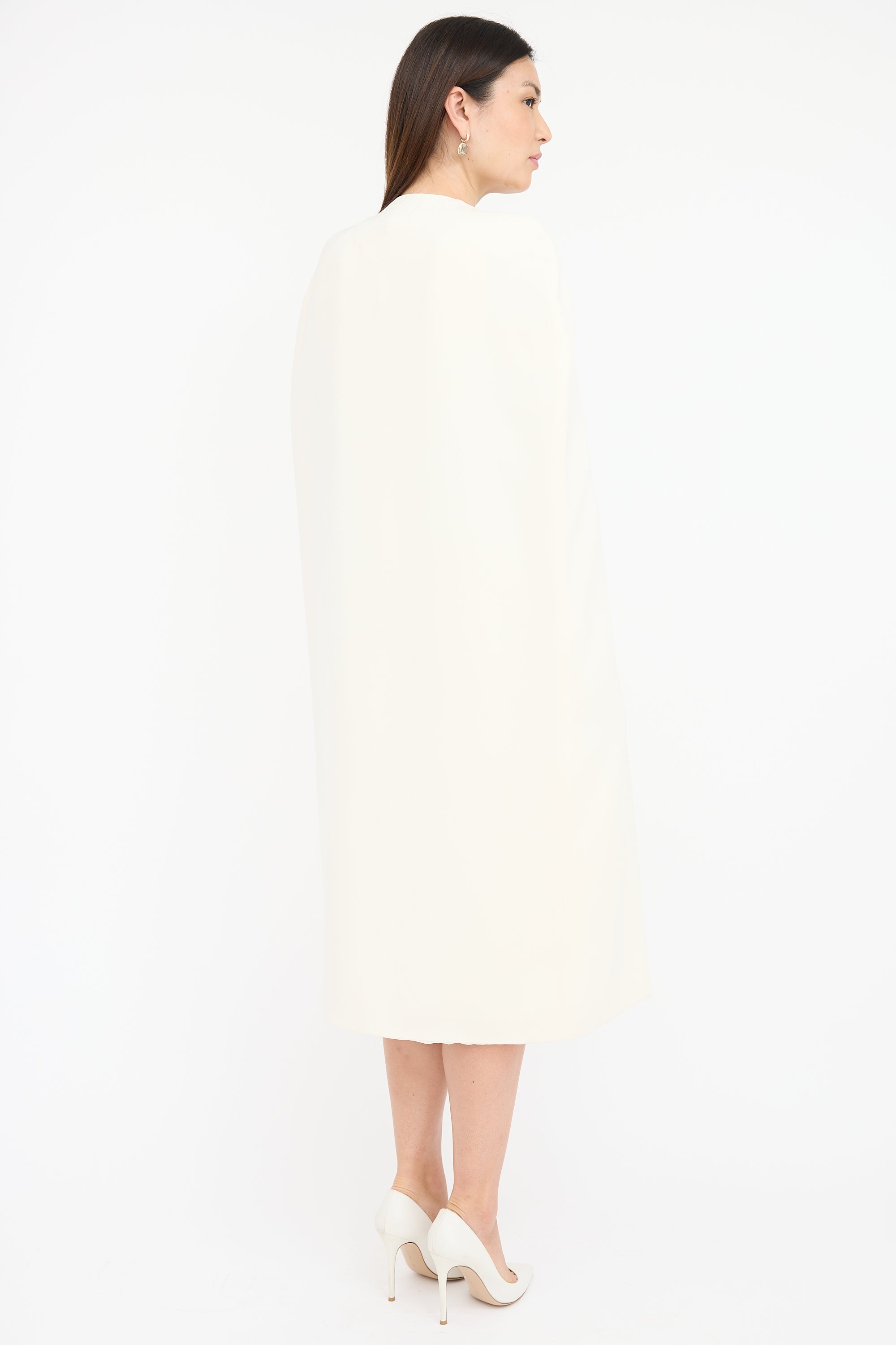 Pre-owned Tom Ford cream silk blend crepe dress featuring sleeveless midi dress with square neckline, back vent, concealed back zip, and detachable cape. Both dress and cape are lined.
