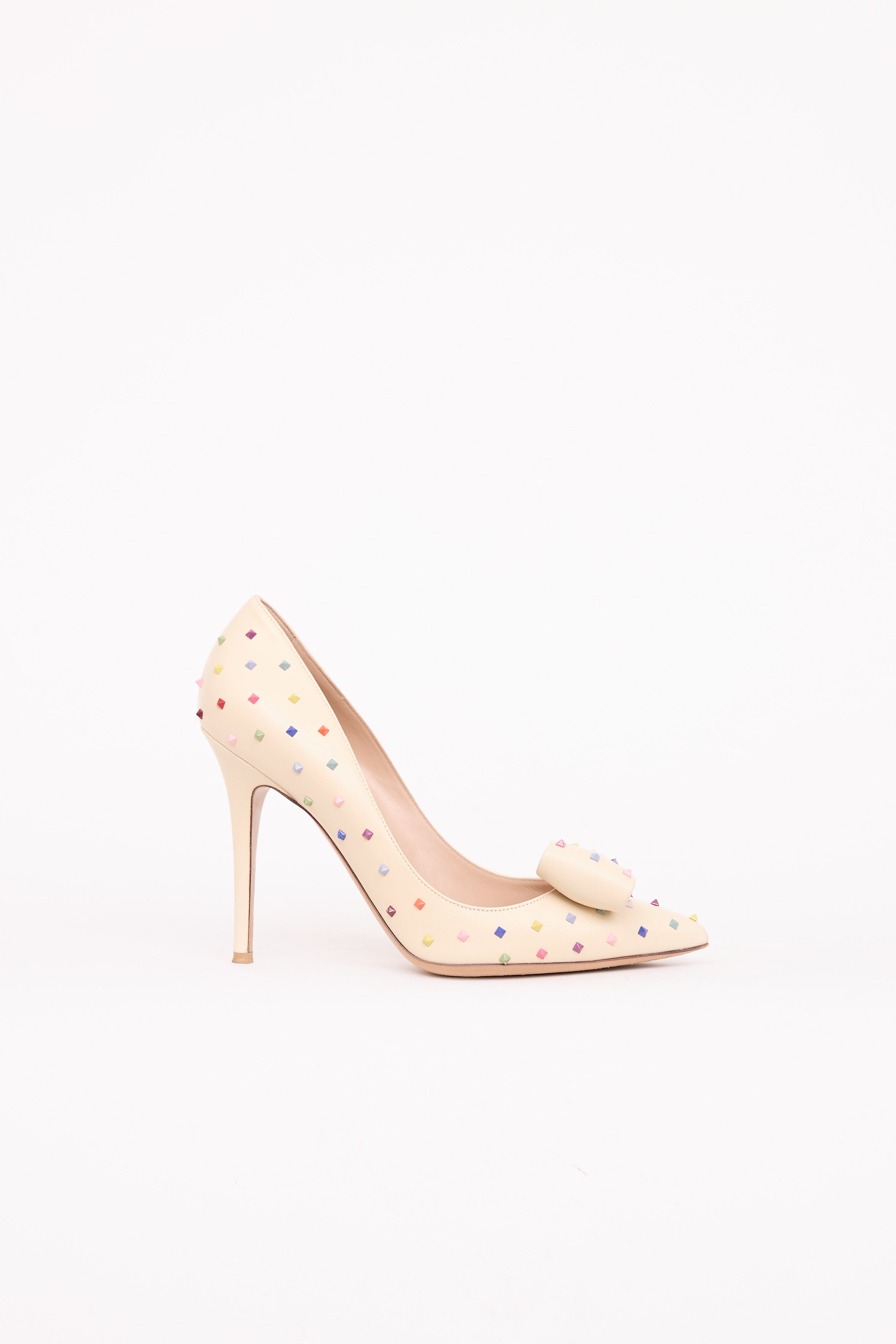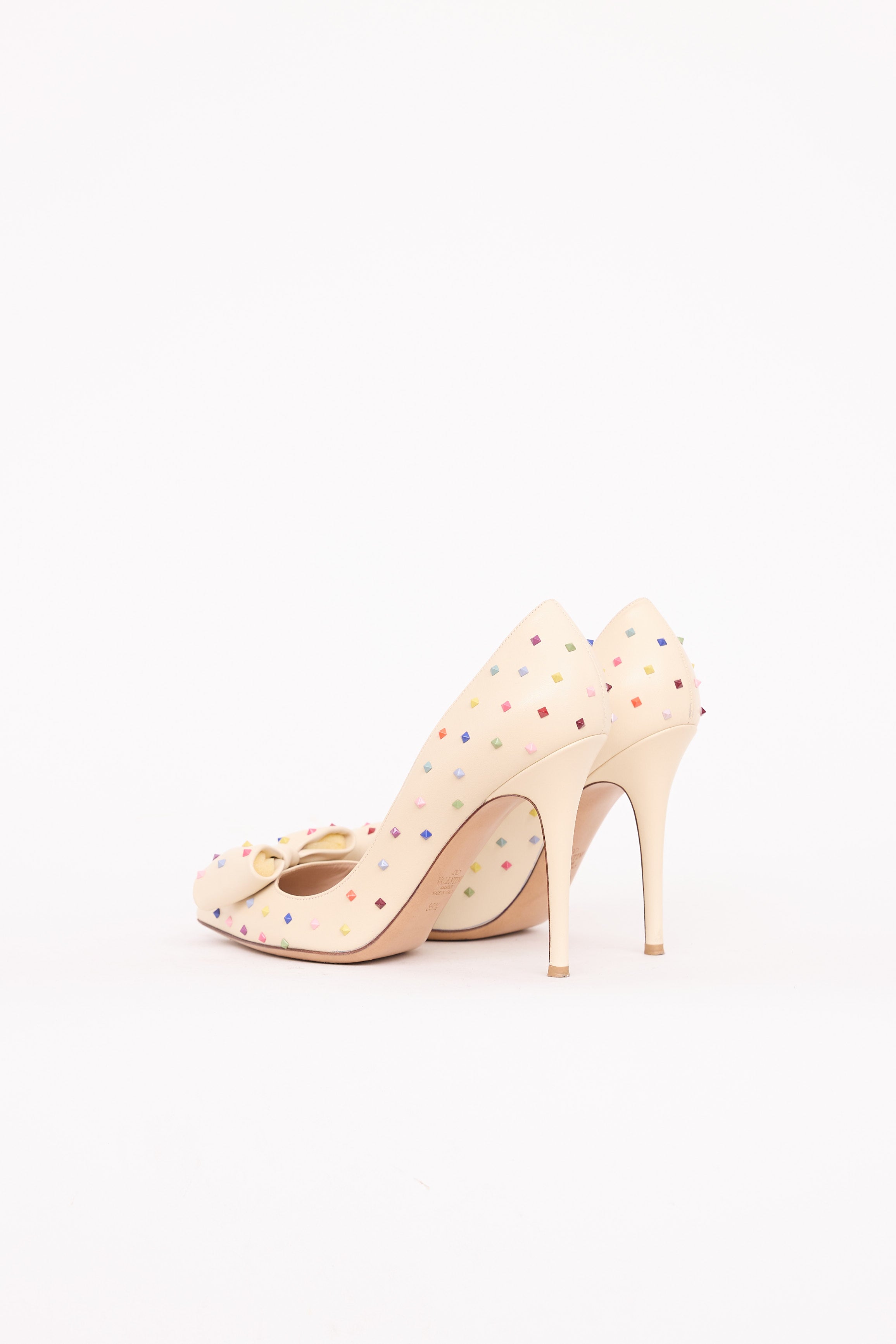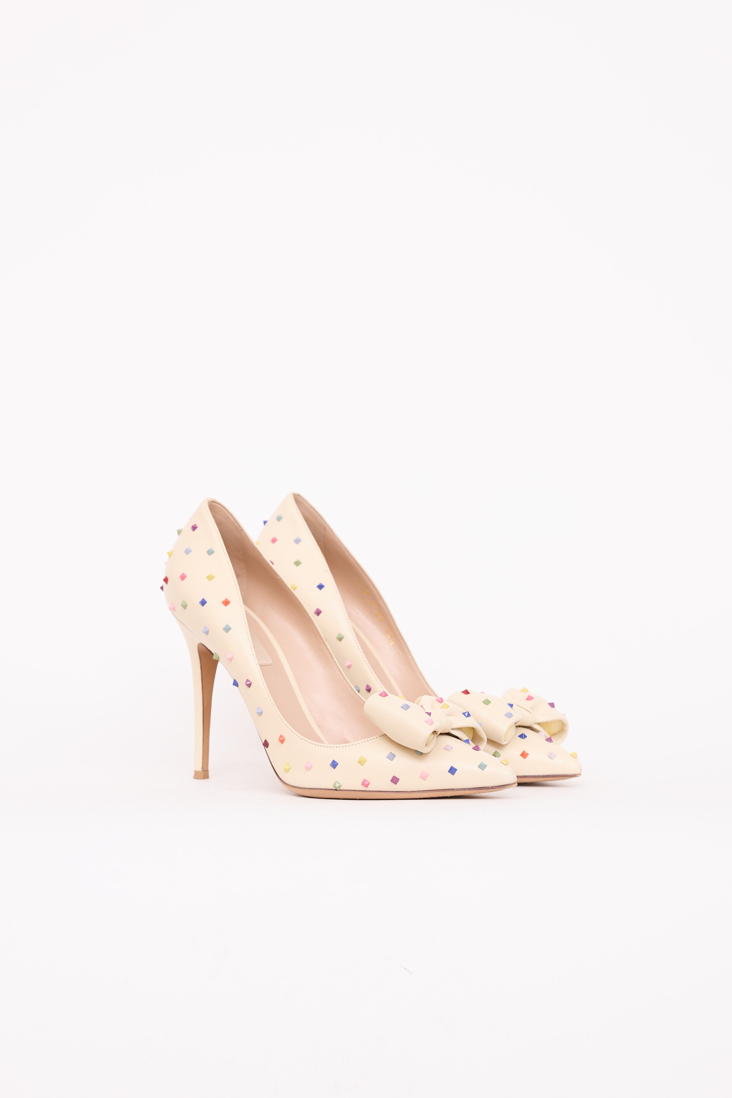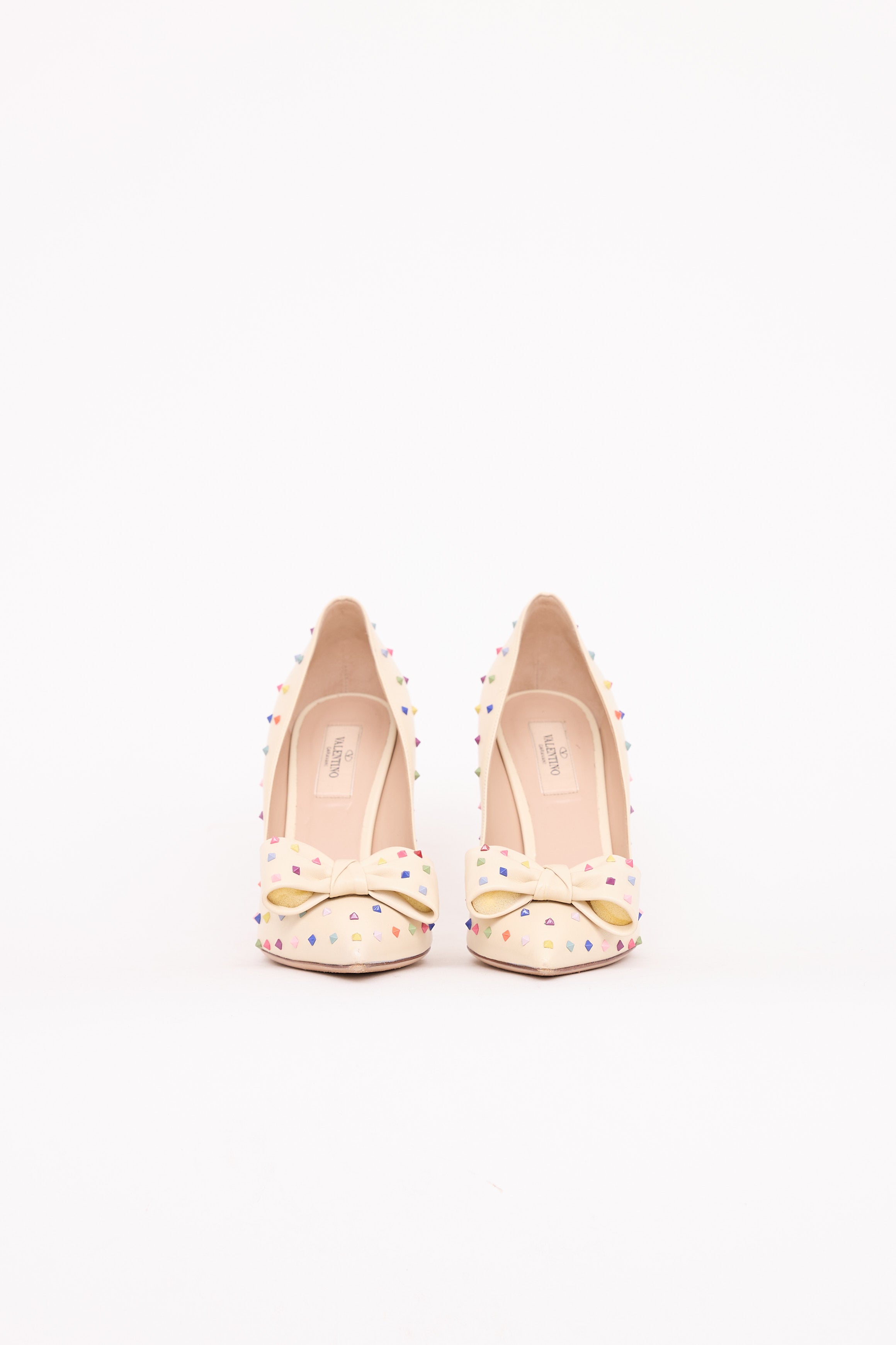 Pre-owned Valentino cream leather Rockstud pumps featuring a pointed toe, tonal leather bow at toe box, covered stiletto heel, mini multi-colour Rockstuds throughout and leather outsole.