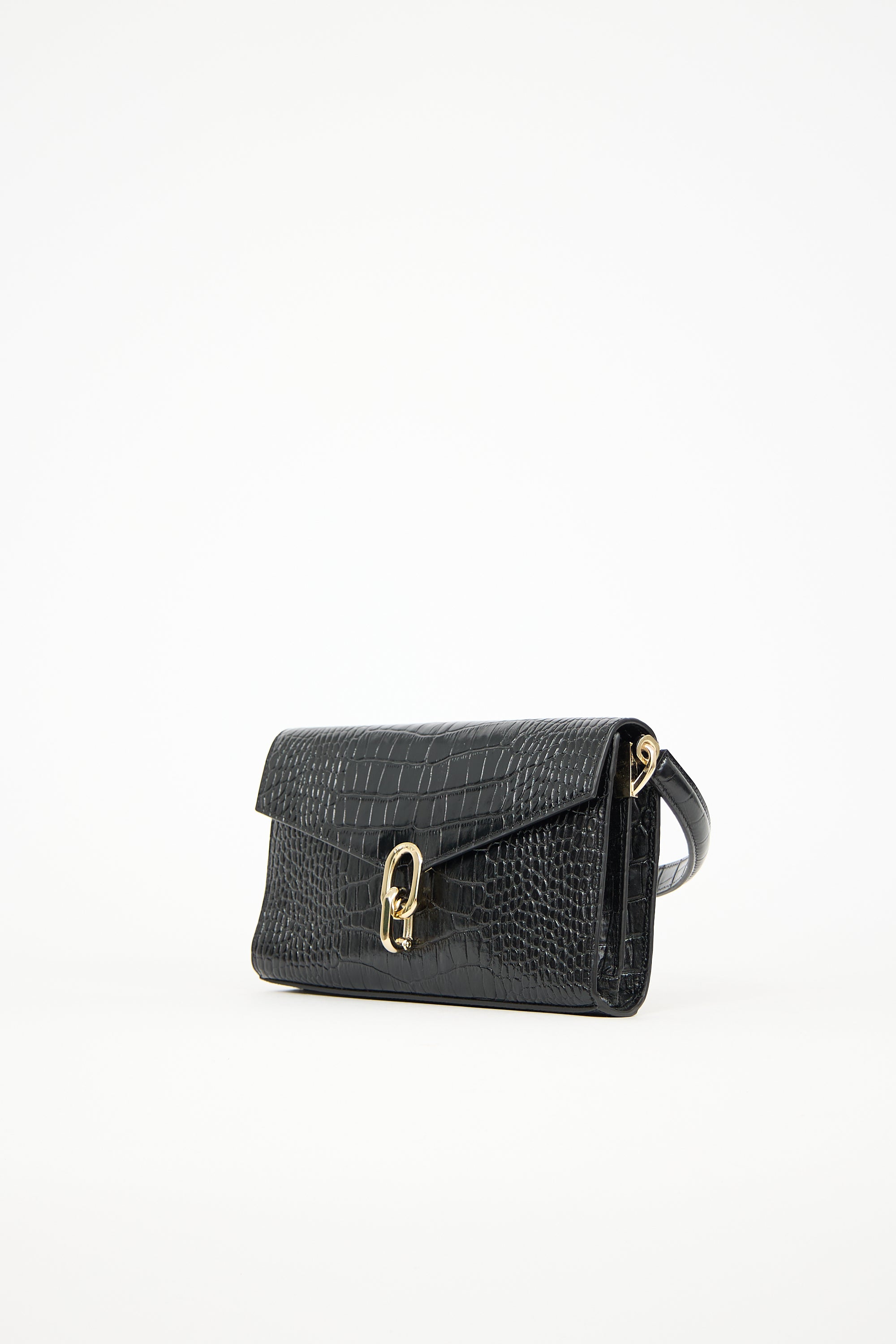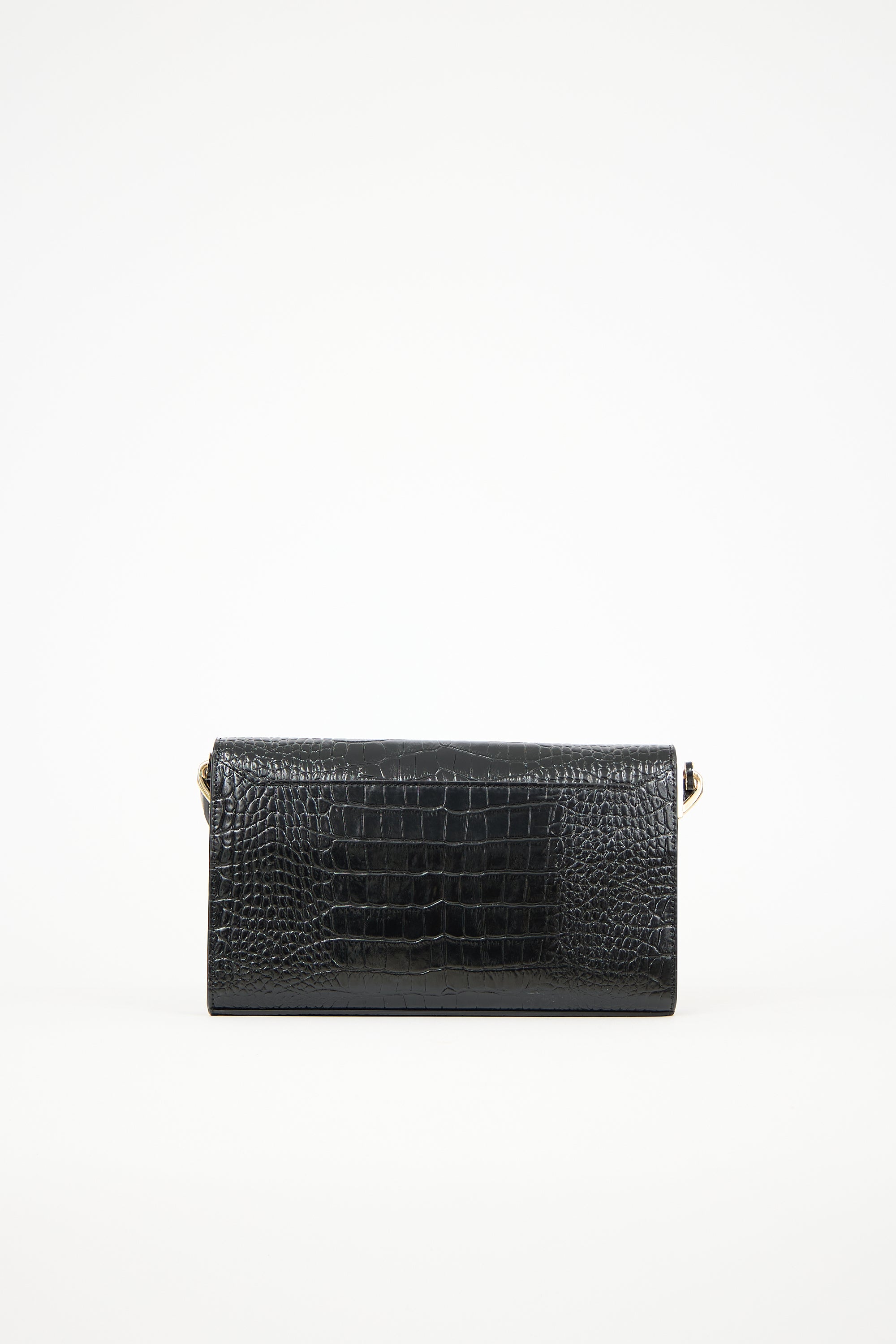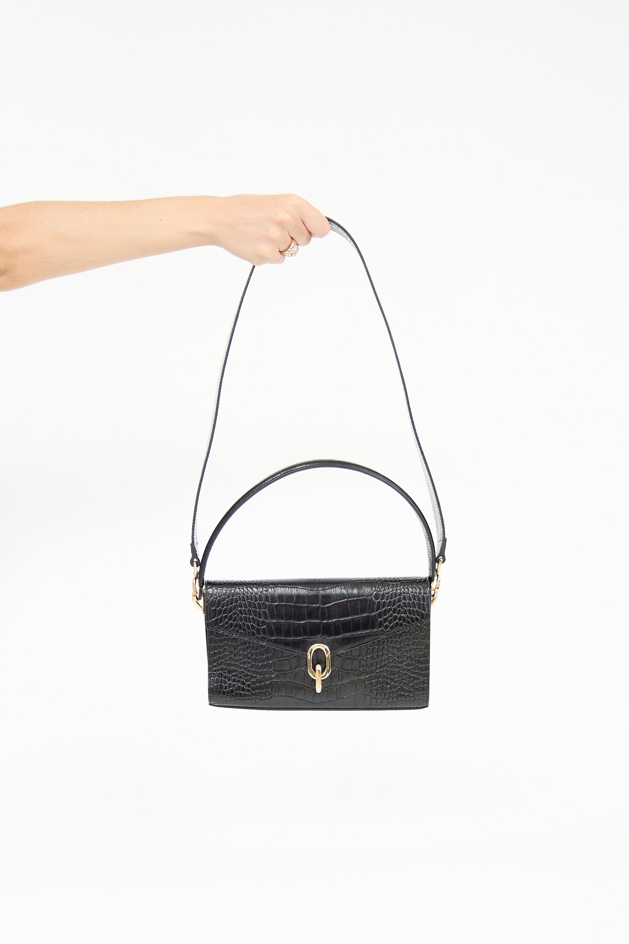 Pre-owned Anine Bing black croc embossed patent leather Colette bag featuring gold tone hardware, flat top handle, detachable fixed crossbody strap, one slip pocket at back, hinge lock at top flap, one main compartment, and one interior zip pocket.