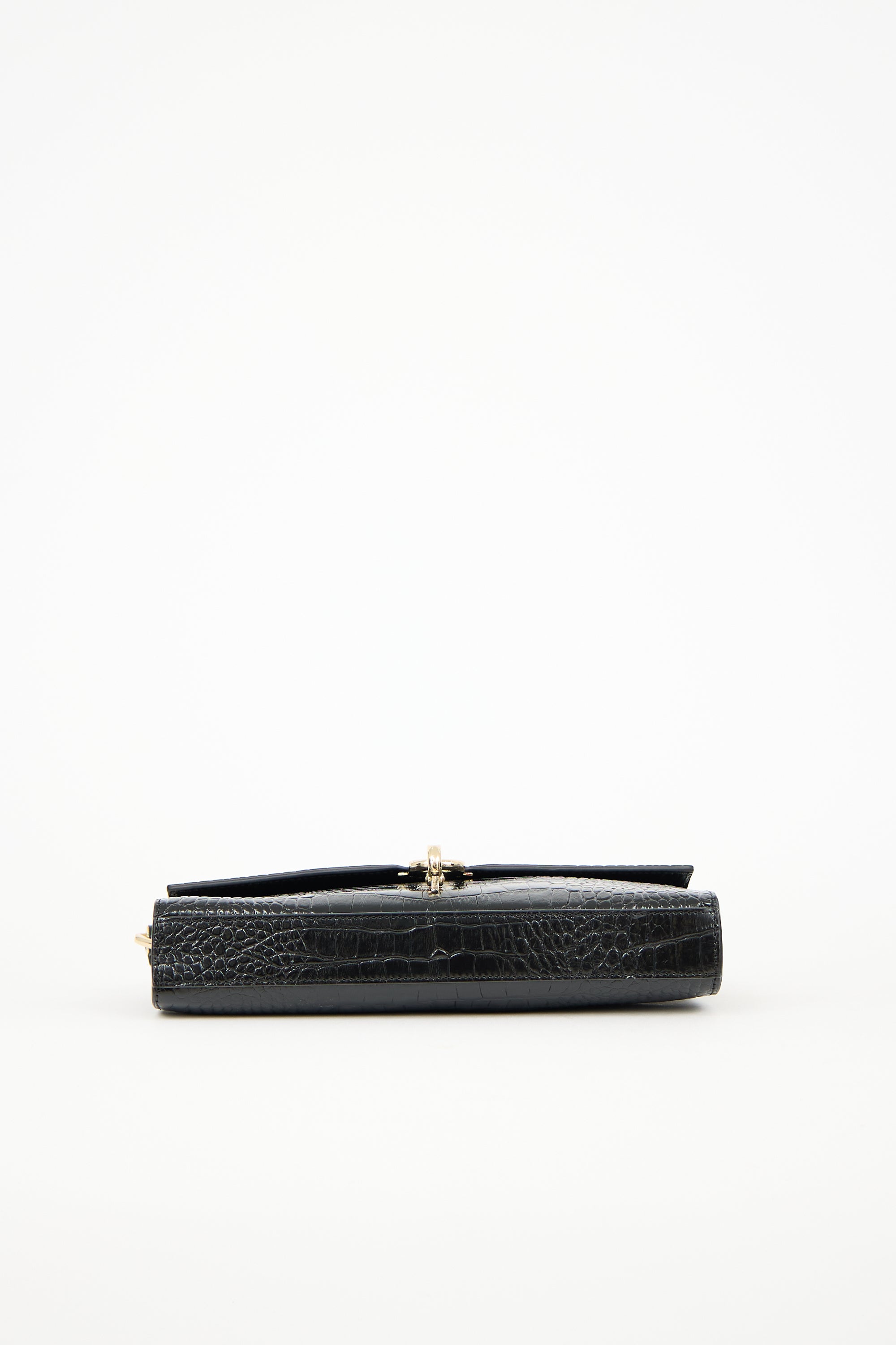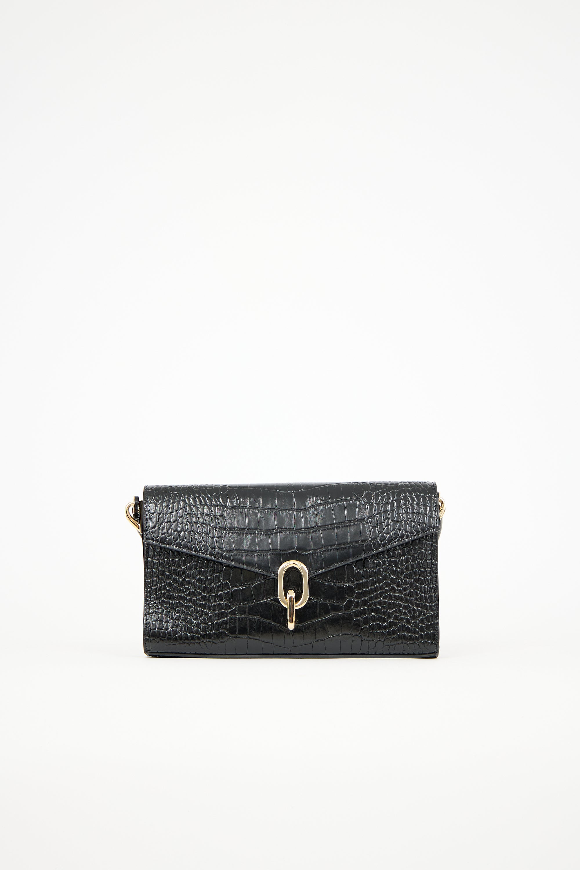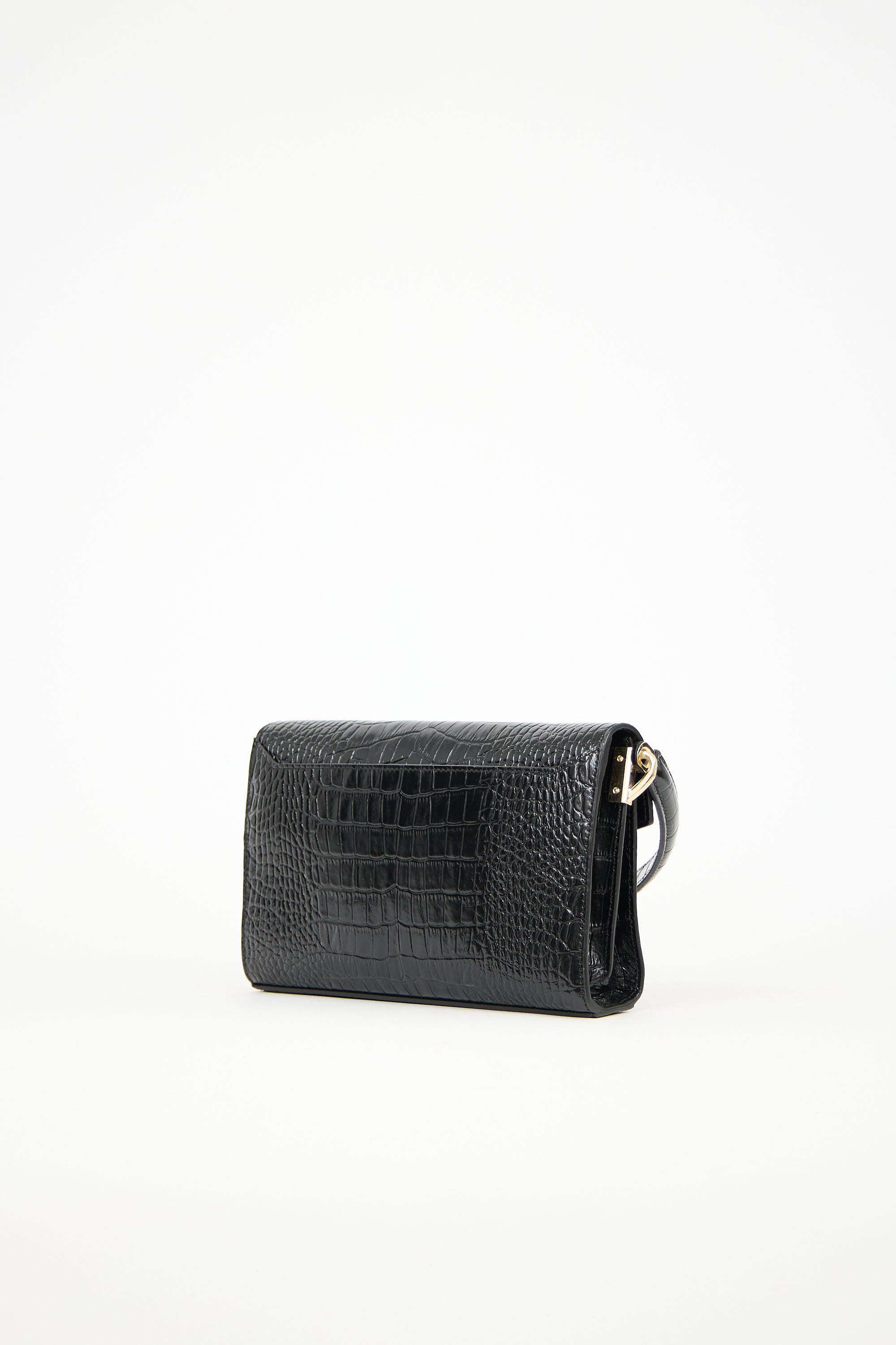 Pre-owned Anine Bing black croc embossed patent leather Colette bag featuring gold tone hardware, flat top handle, detachable fixed crossbody strap, one slip pocket at back, hinge lock at top flap, one main compartment, and one interior zip pocket.