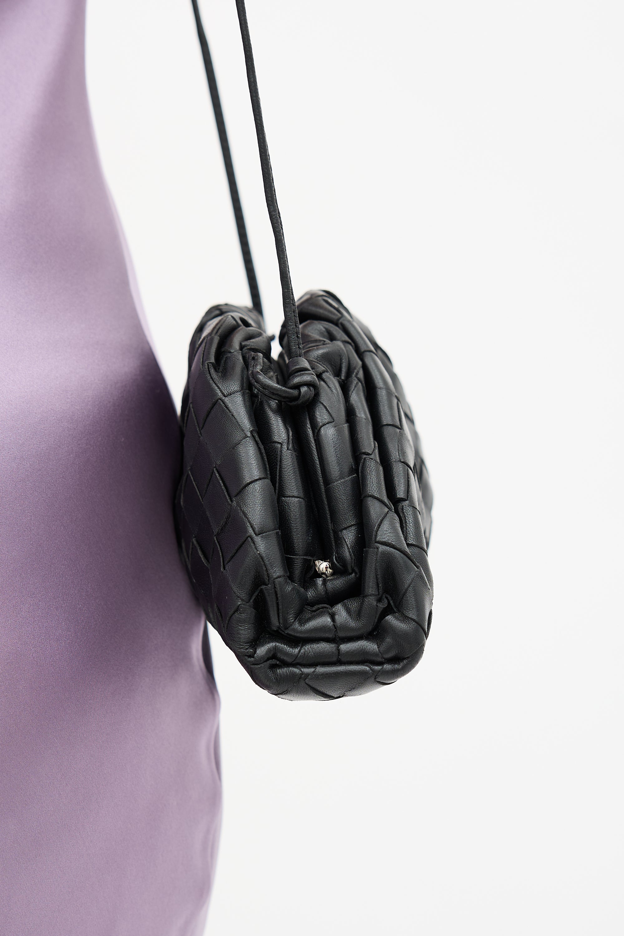 Pre-owned Bottega Veneta black leather Mini Pouch crossbody bag featuring Intrecciato weave, knotted shoulder strap, magnetic frame closure, and one main compartment.