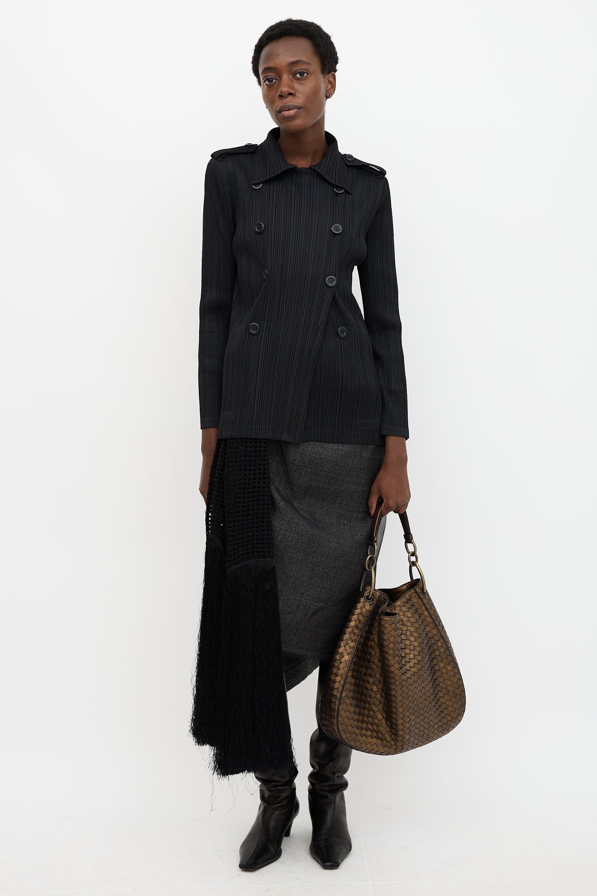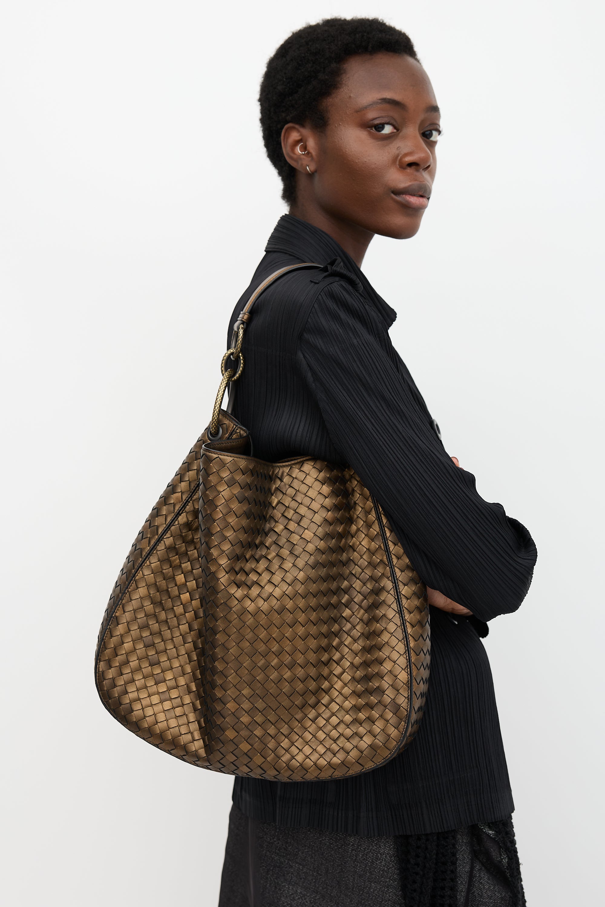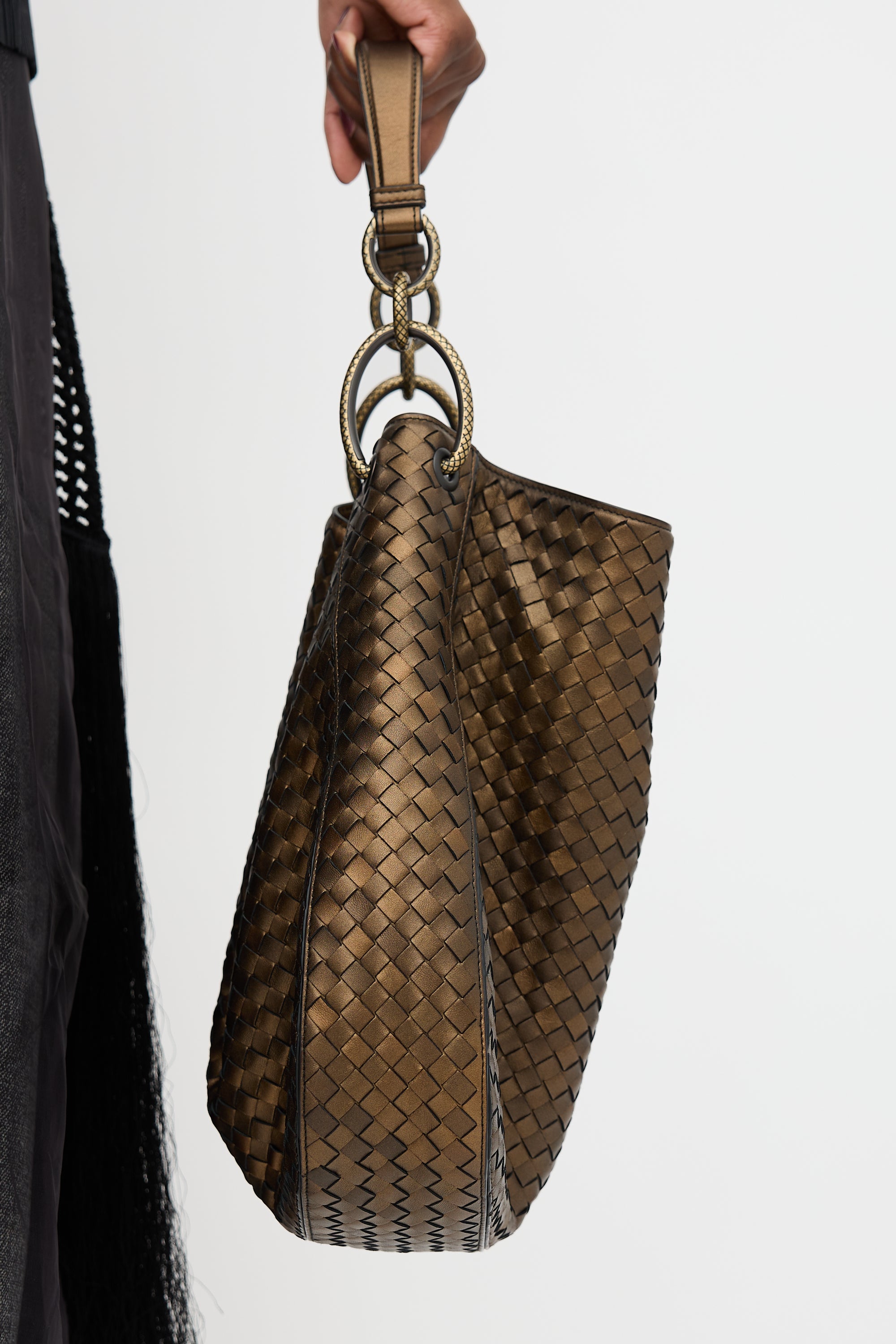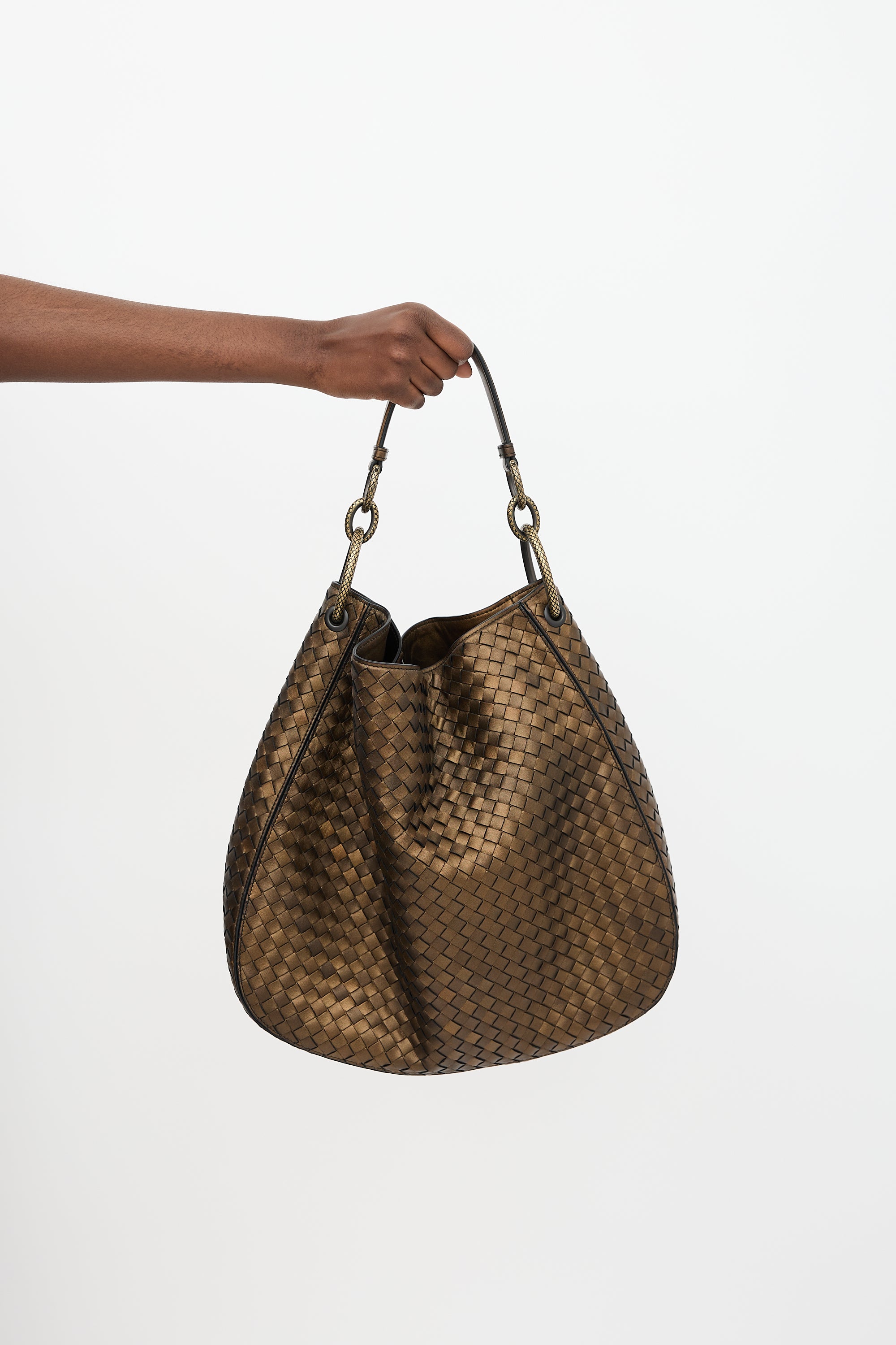 Pre-owned Bottega Veneta bronze leather Loop shoulder bag featuring Intrecciato weave, gold tone hardware with reptile motif, fixed shoulder strap, open compartment, suede lining, and interior compartment includes one main pocket, two slip pockets, and one zip pockets. Includes original dust bag.