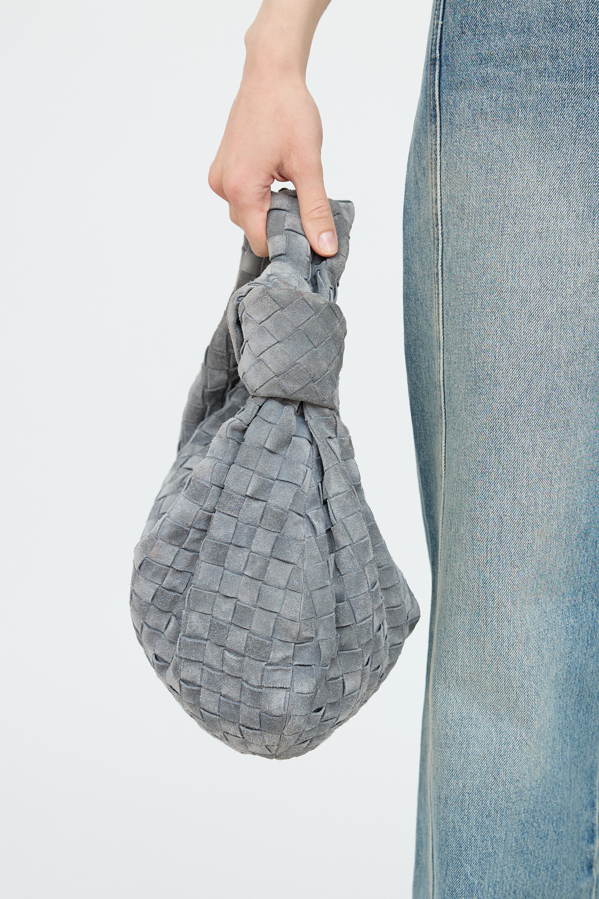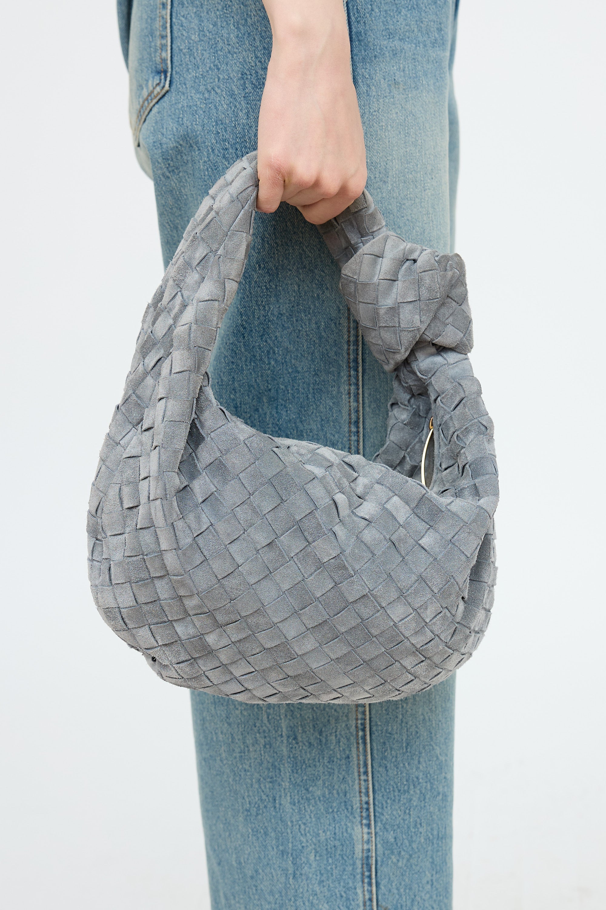 Pre-owned Bottega Veneta grey small suede Jodie bag featuring signature woven leather with knotted handle, gold tone zip closure, and one main compartment. Includes original dust bag.