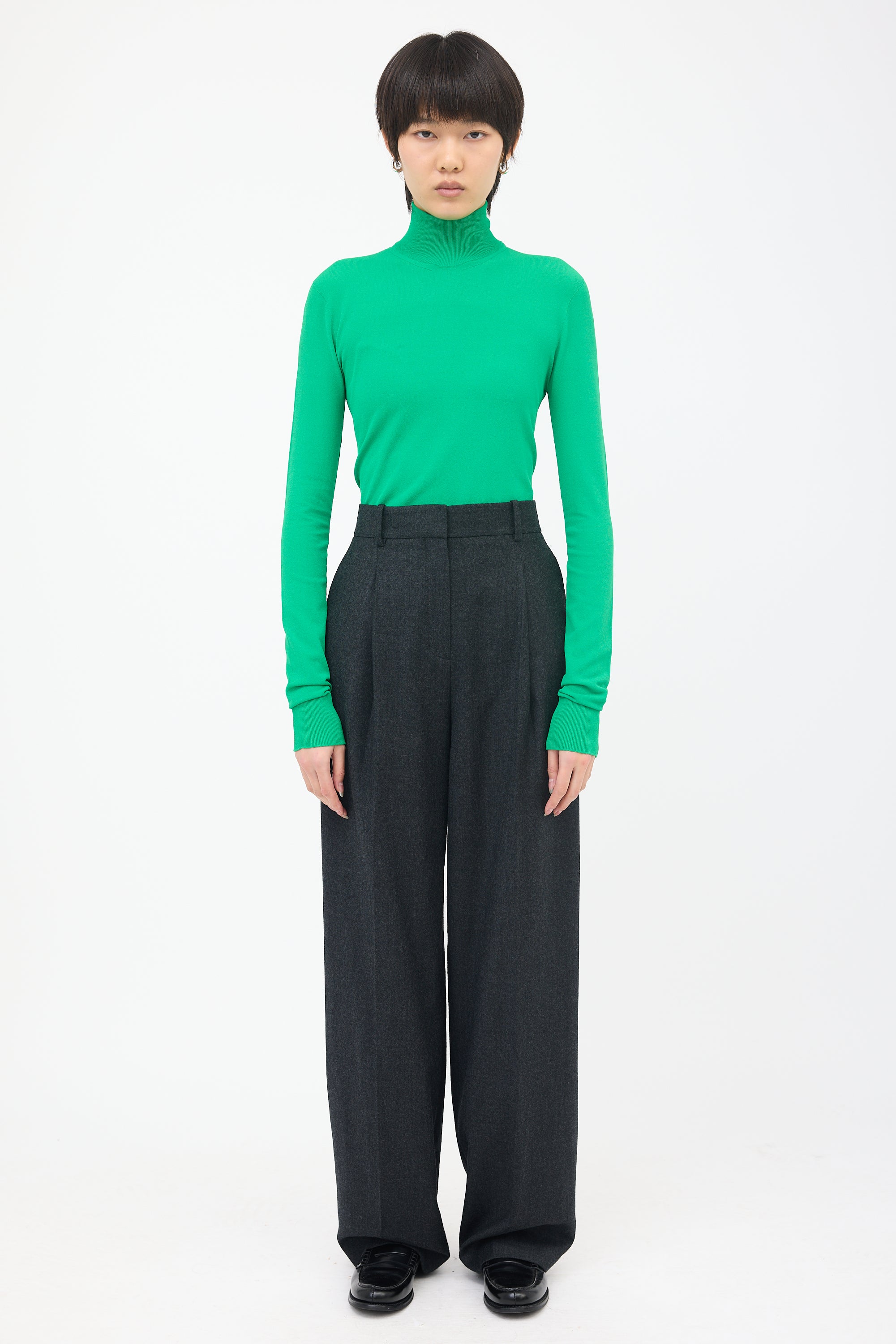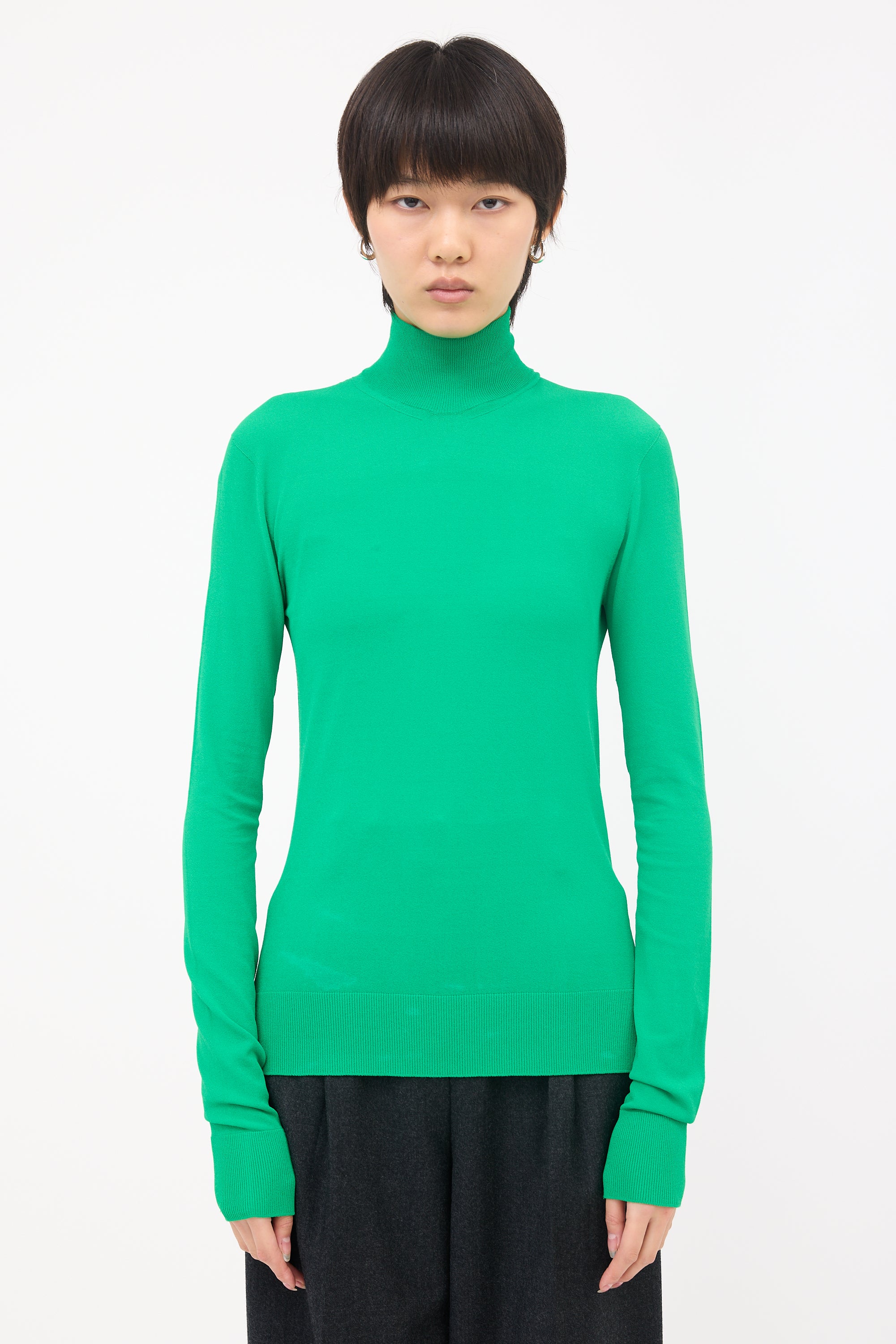 Pre-owned Bottega Veneta green stretch jersey top featuring a ribbed turtleneck, fitted silhouette, and a ribbed hem and cuffs.