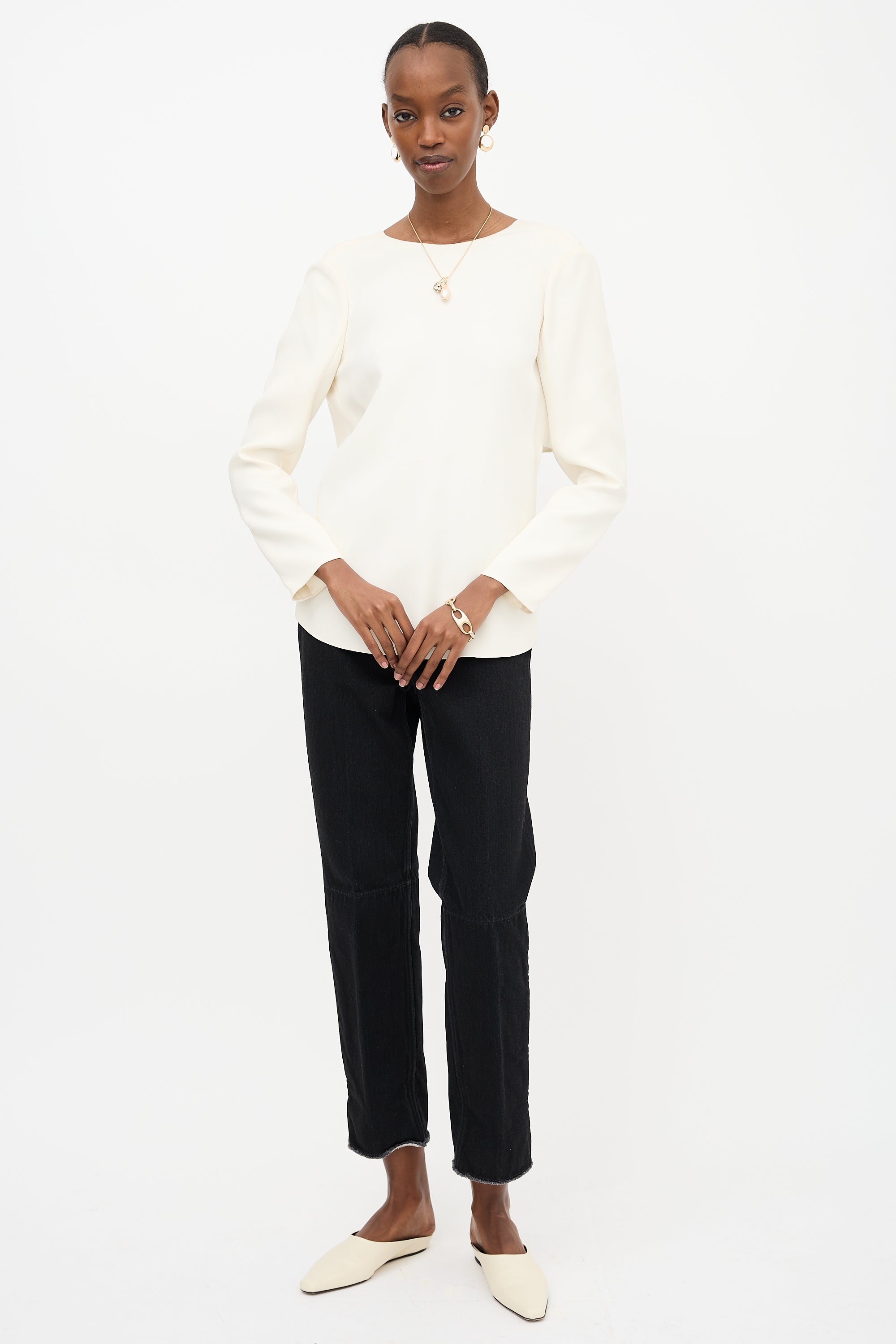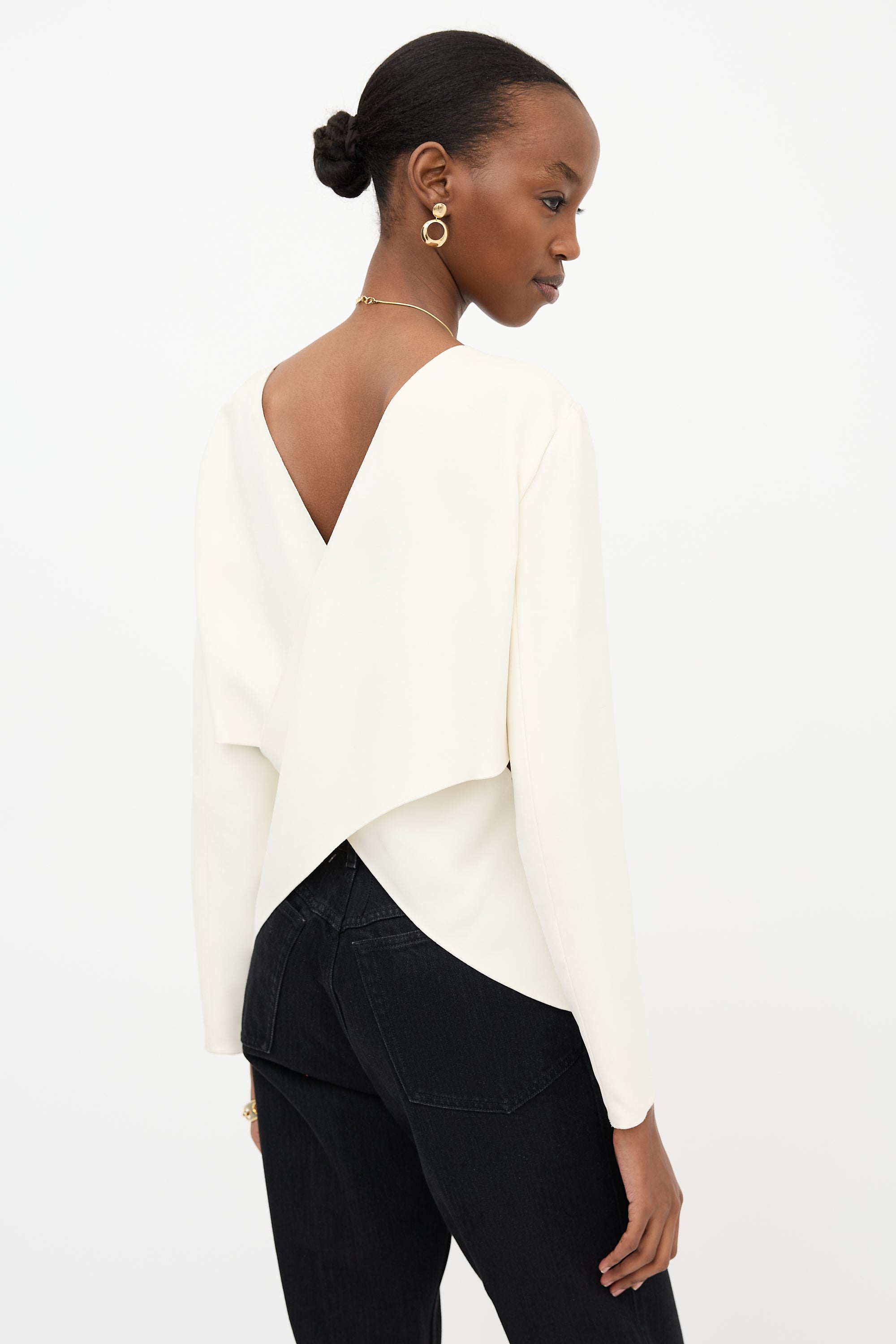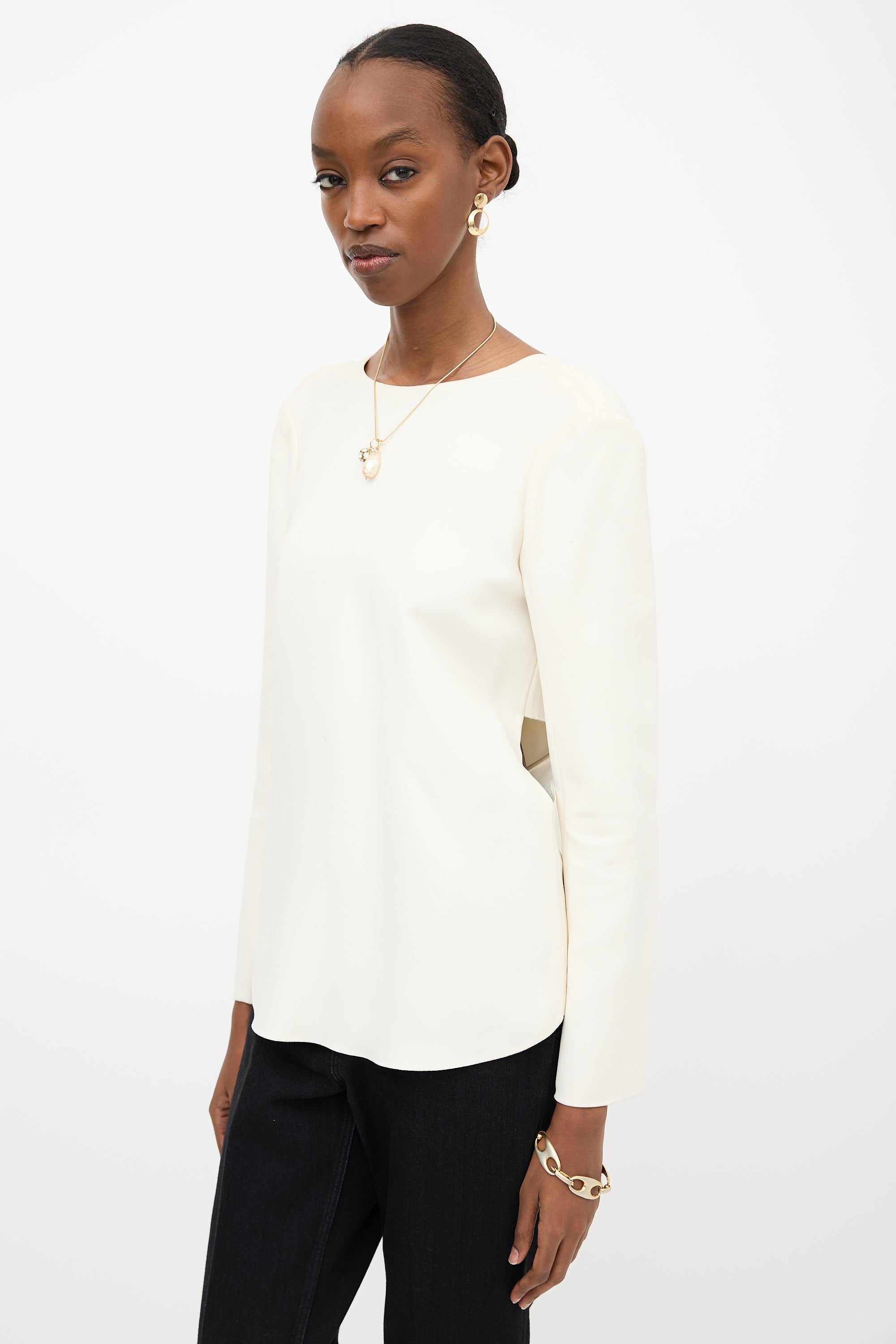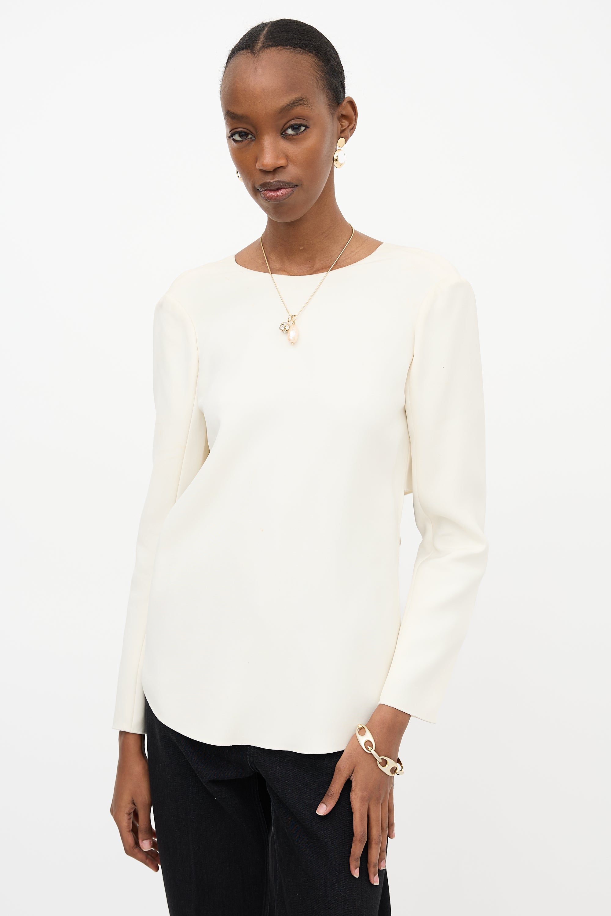 Pre-owned Celine cream blouse featuring a round neckline, long sleeves, and a criss cross open back design.