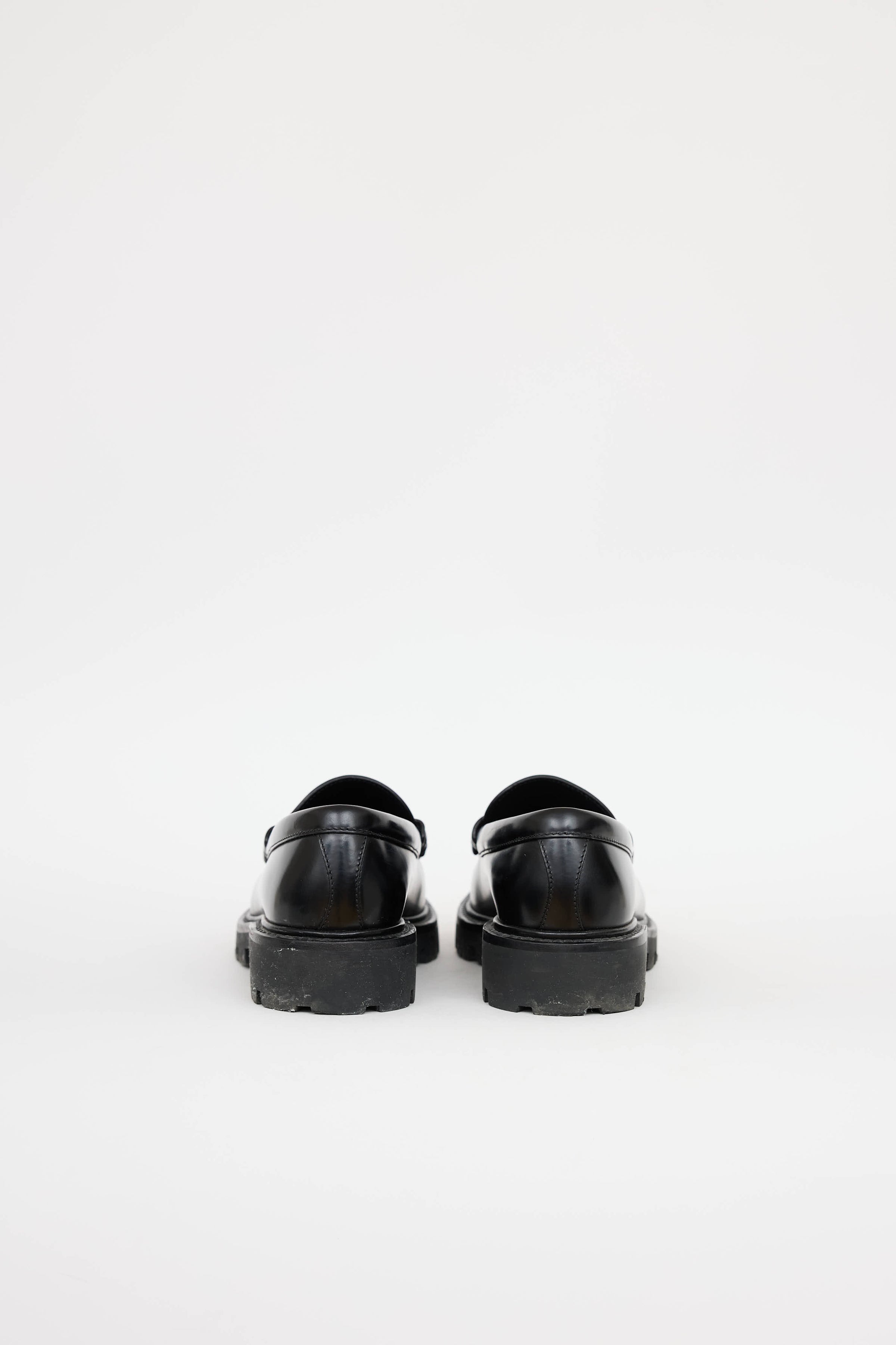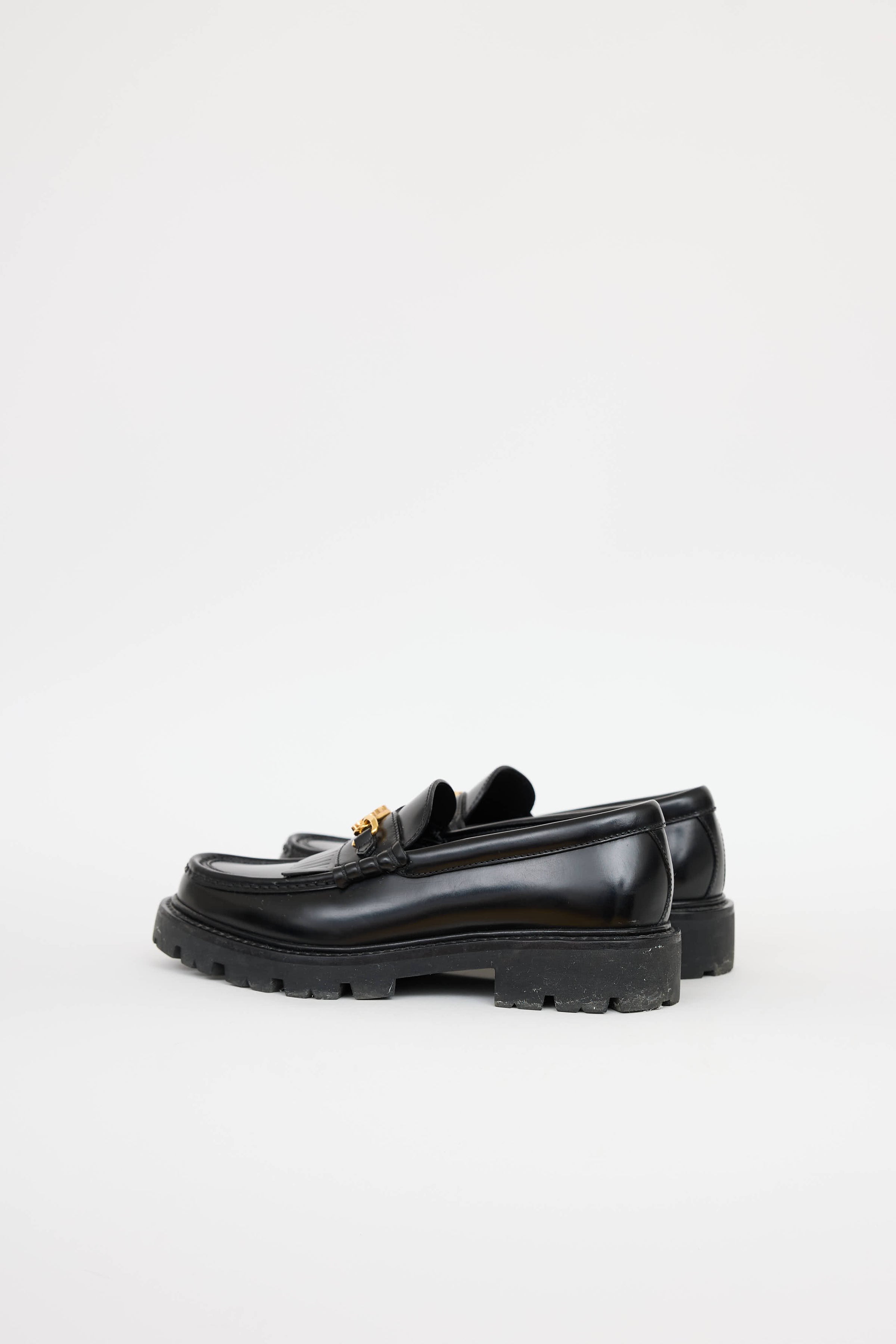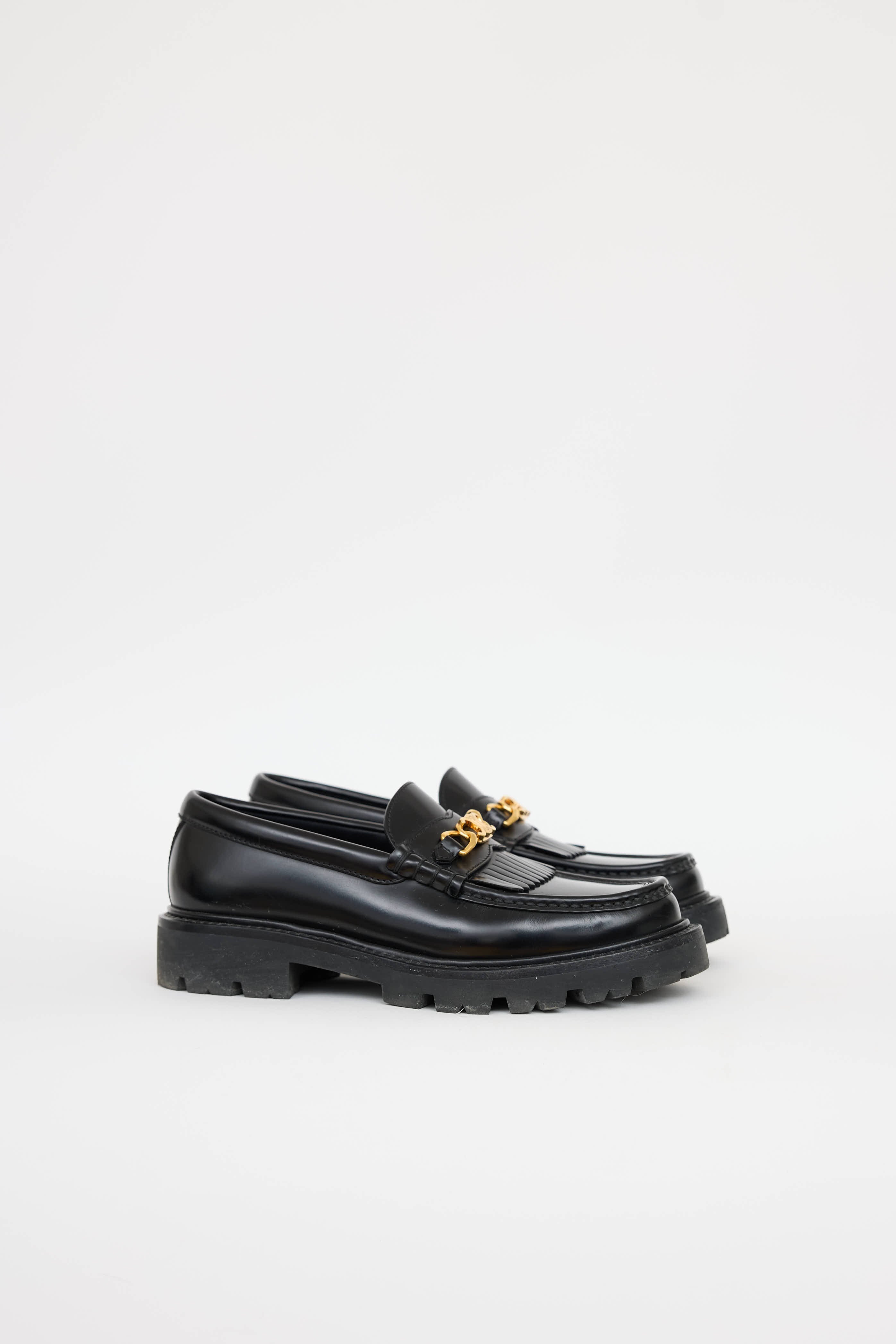 Pre-owned Celine black Margaret loafers featuring round toe, kiltie fringe at vamp, gold tone Triomphe logo hardware, and lug sole.
