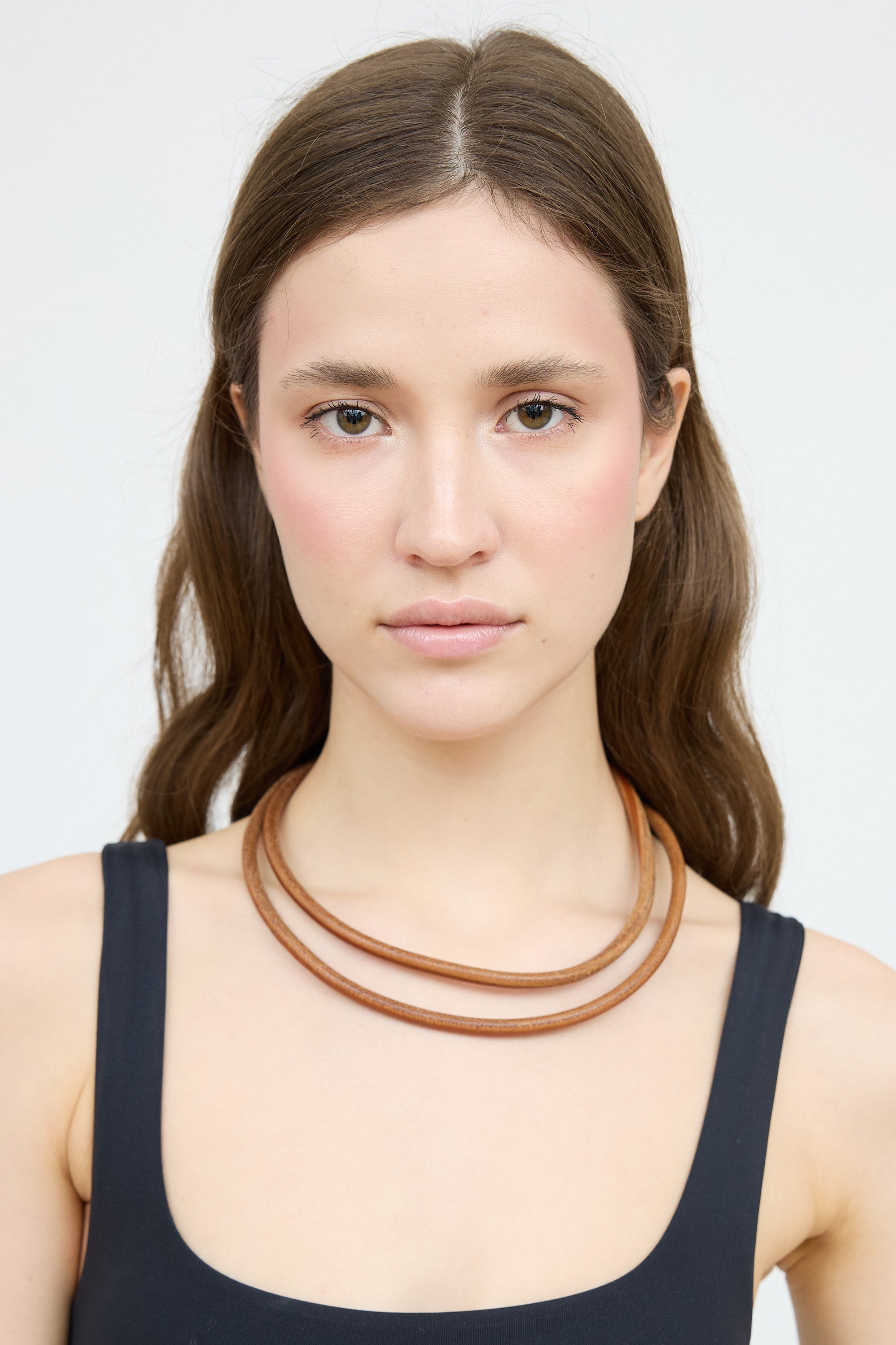 Pre-owned Hermès brown Tour leather cord necklace featuring silver tone hardware, magnetic closure, and engraved with "Hermès".