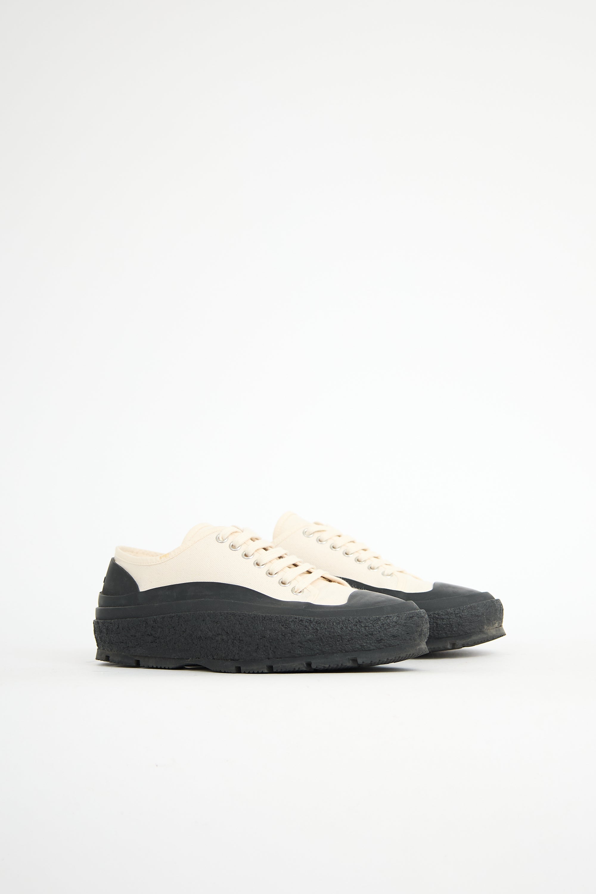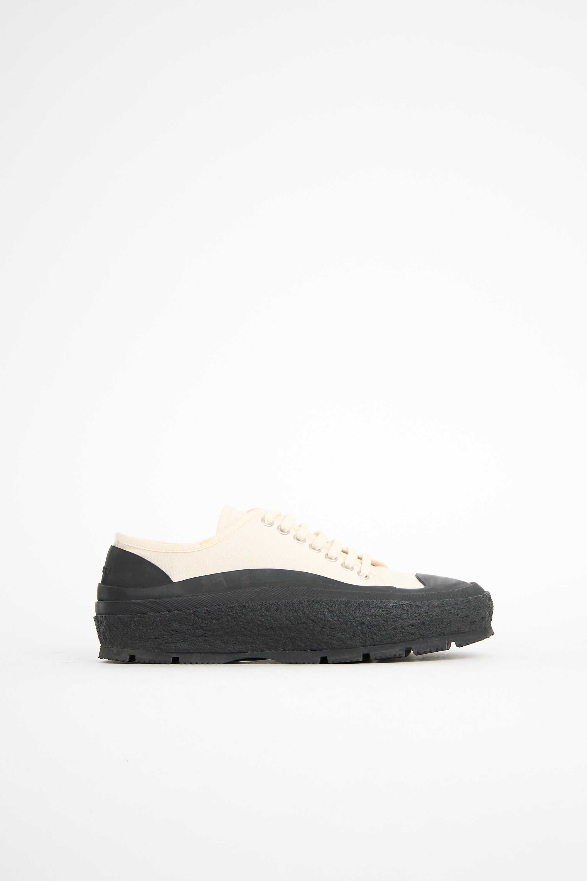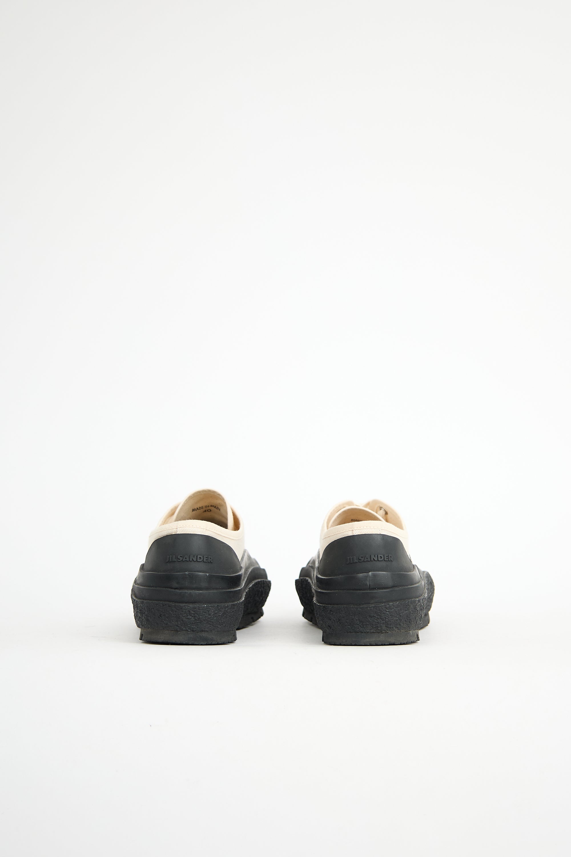Pre-owned Jil Sander cream canvas and black rubber sneakers featuring rounded toe, lace up instep, rubber panelling with embossed logo at counter, and textured rubber platform sole. Comes with original dust bag.