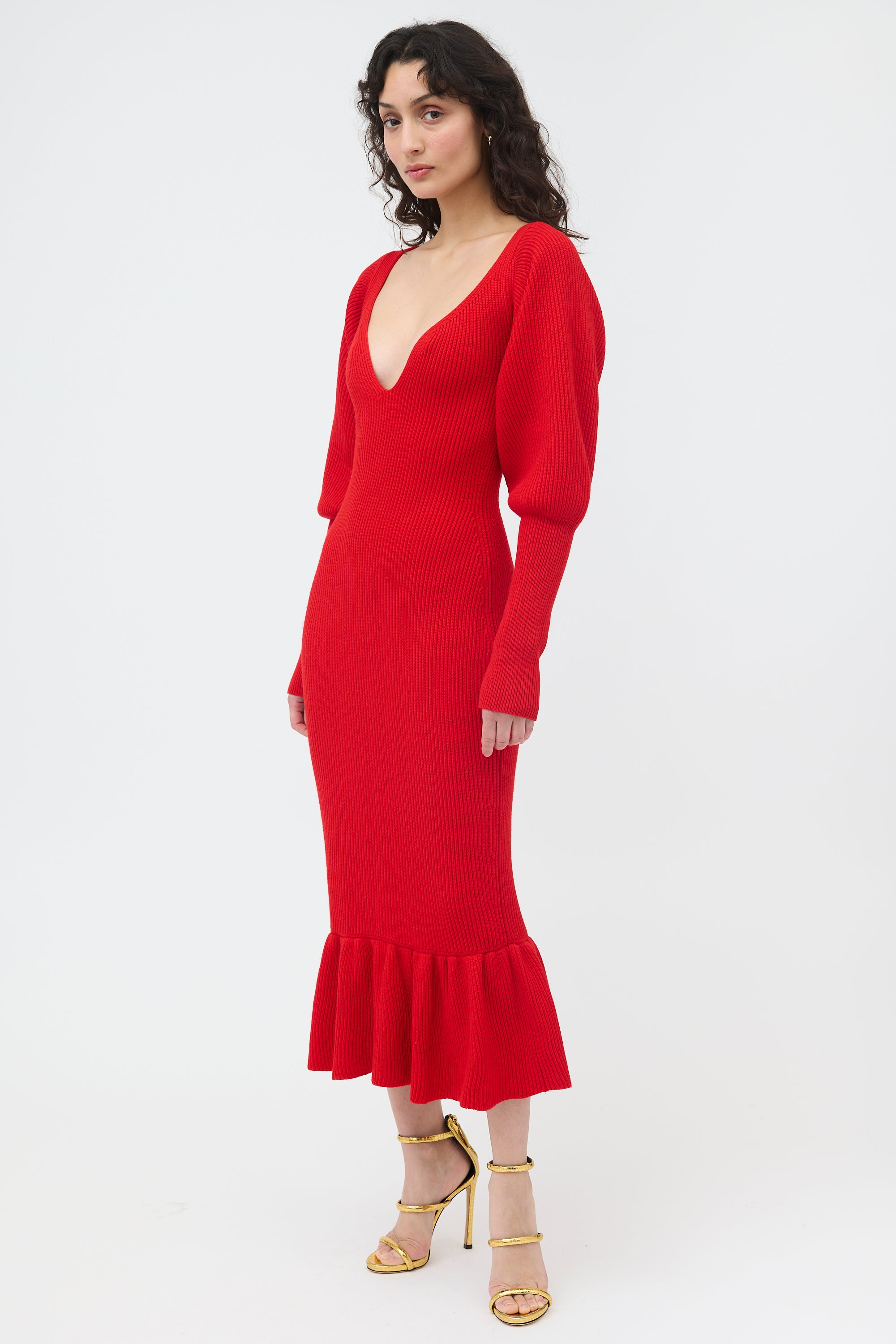 Pre-owned Khaite red merino wool Ina dress featuring a ribbed knit, sweetheart neckline, tapered puff sleeves, and ruffled hem.