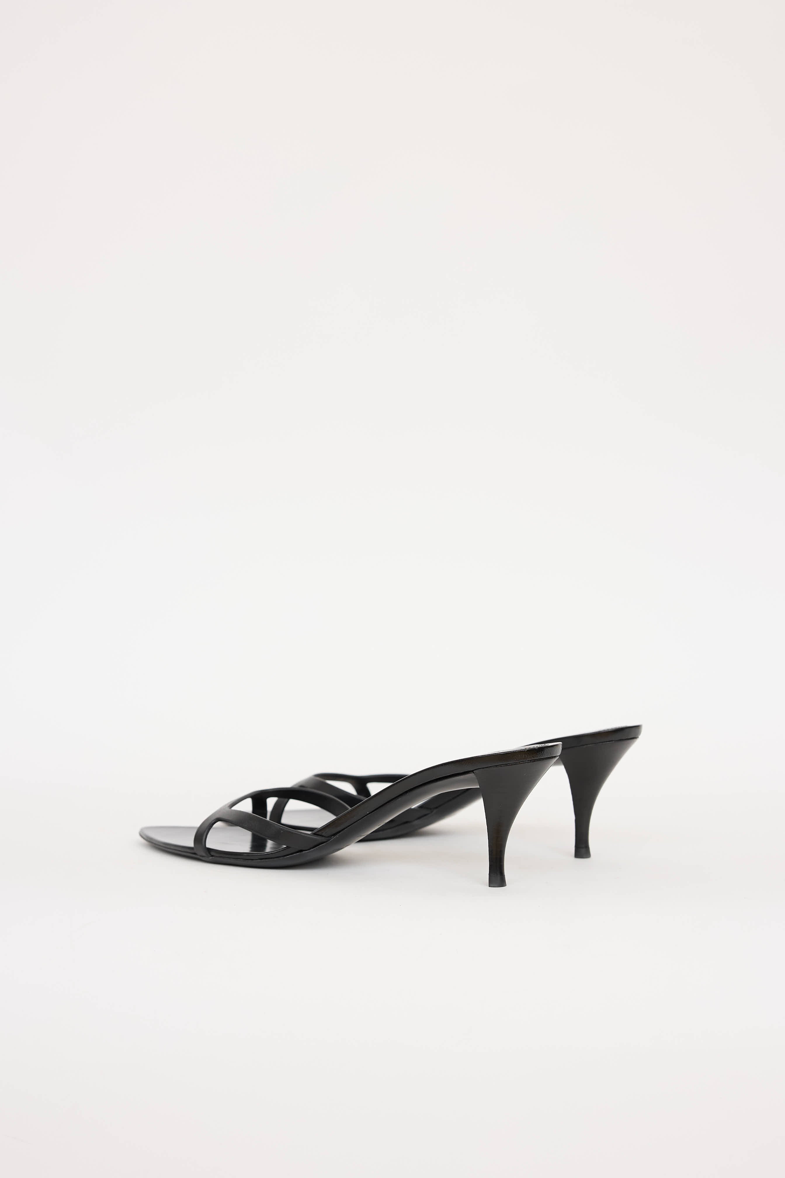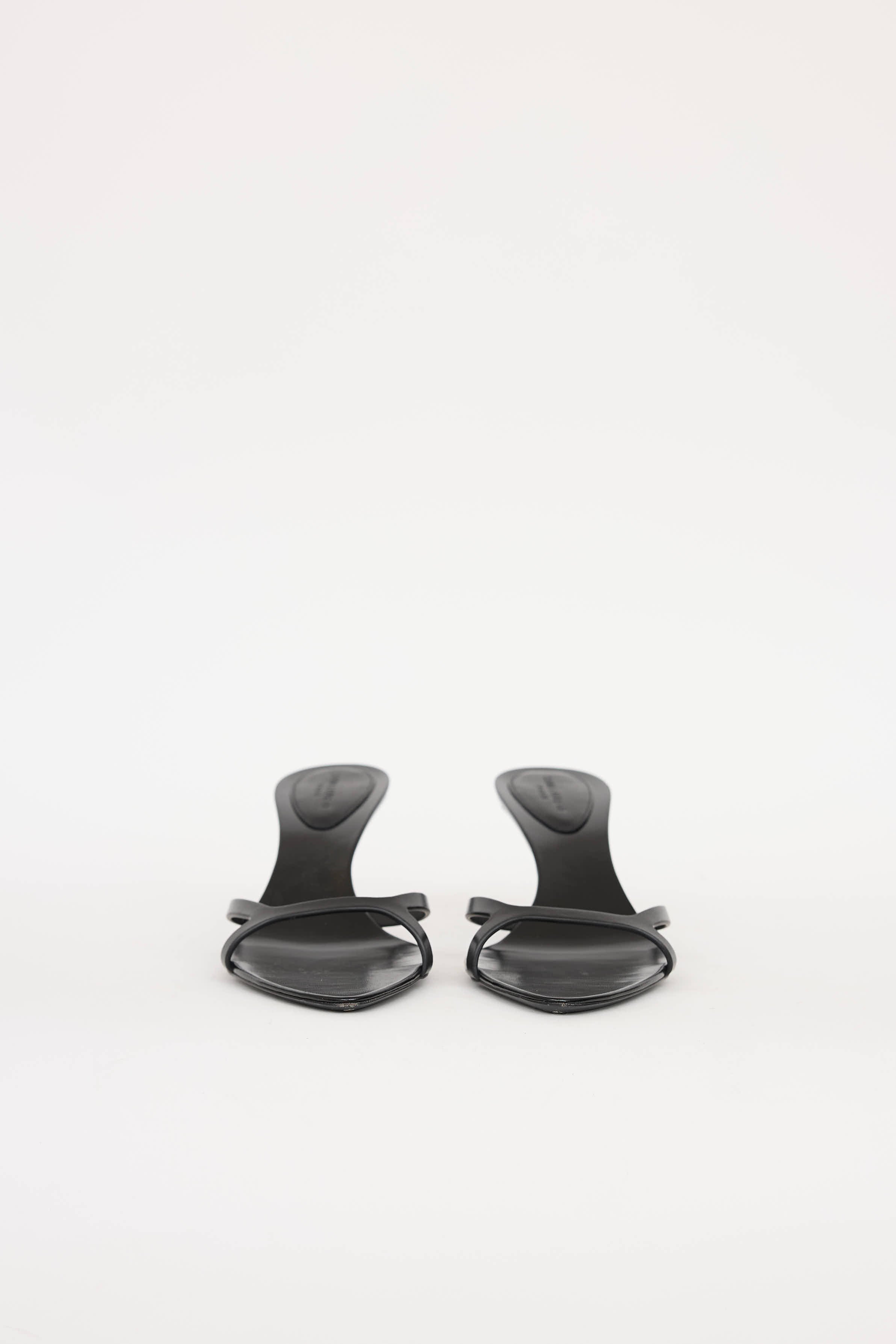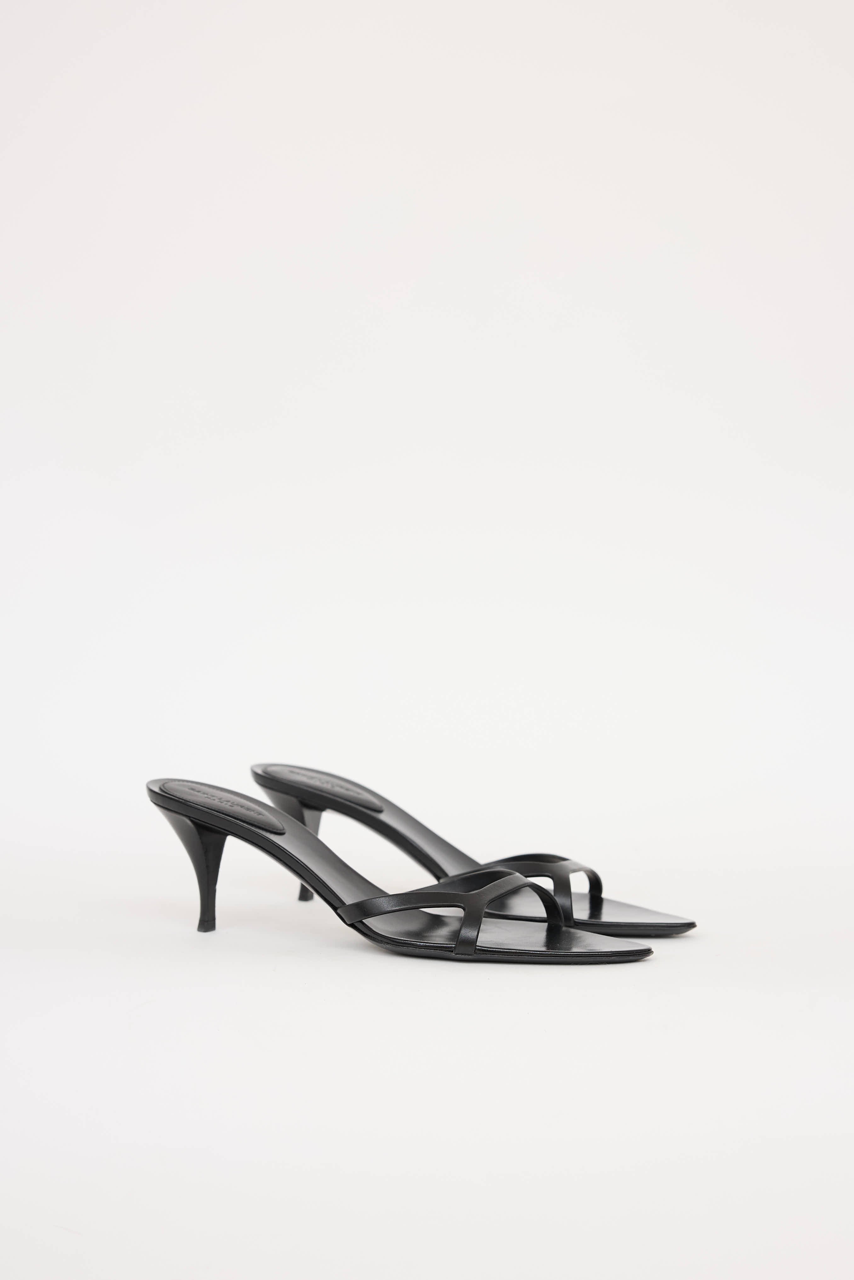 Pre-owned Saint Laurent black Gippy Dream mules featuring pointed toe, strap at vamp, and stacked kitten heel.