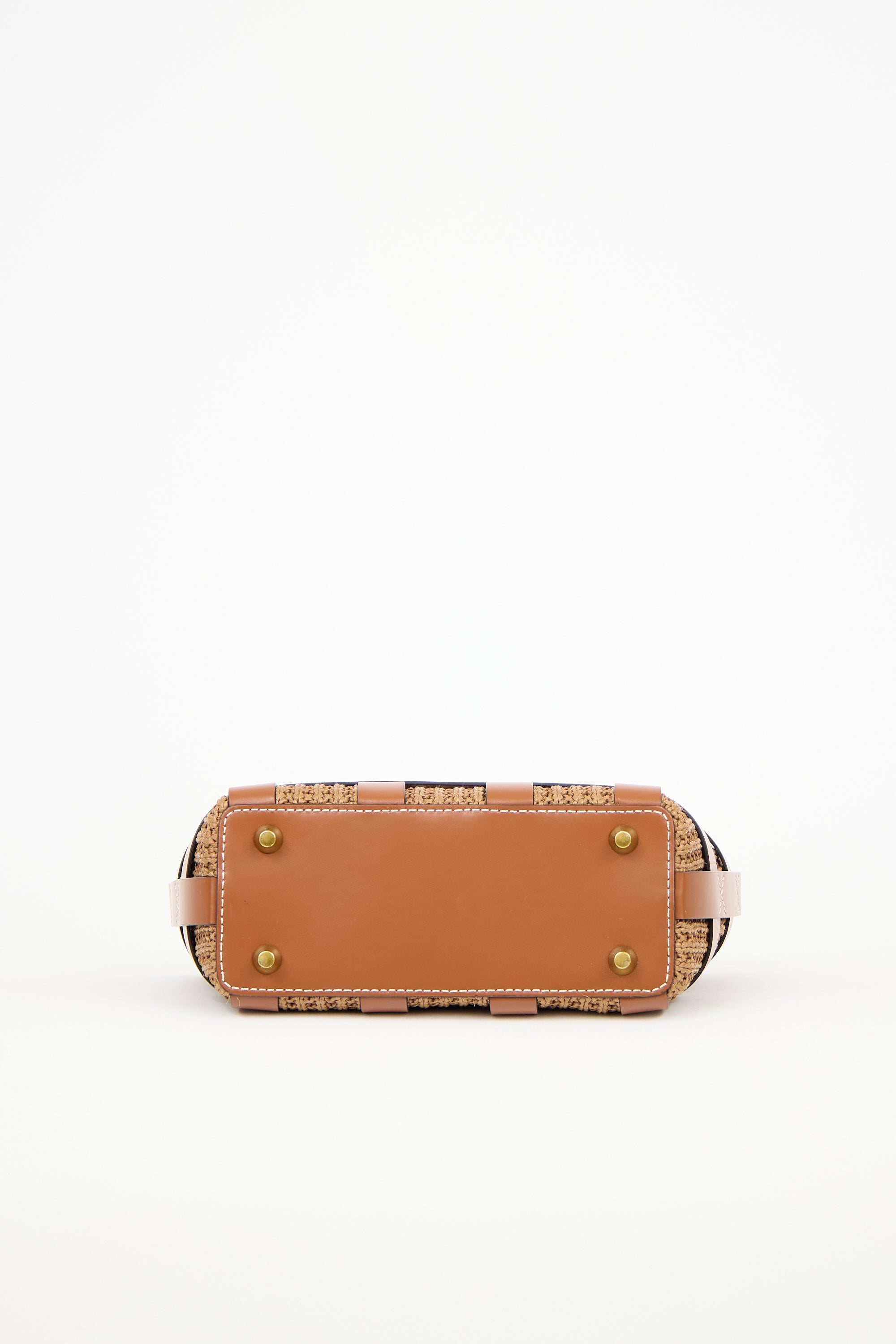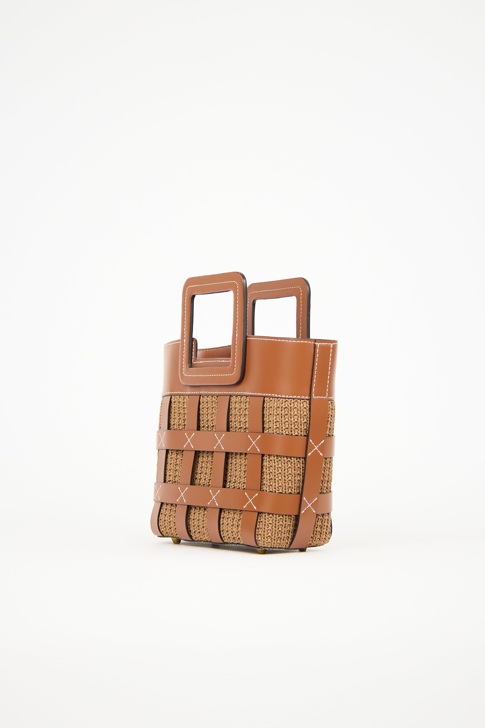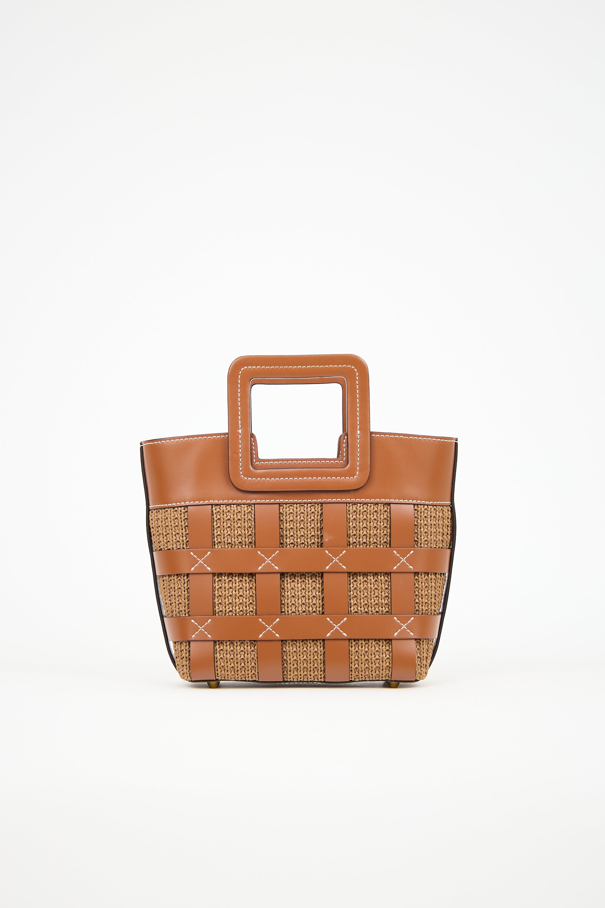 Pre-owned Staud brown leather Mini Shirley bag featuring dual squared top handles, caged raffia body, white top stitching, open top compartment with canvas lining, removable inner zip pouch, and four protective feet.