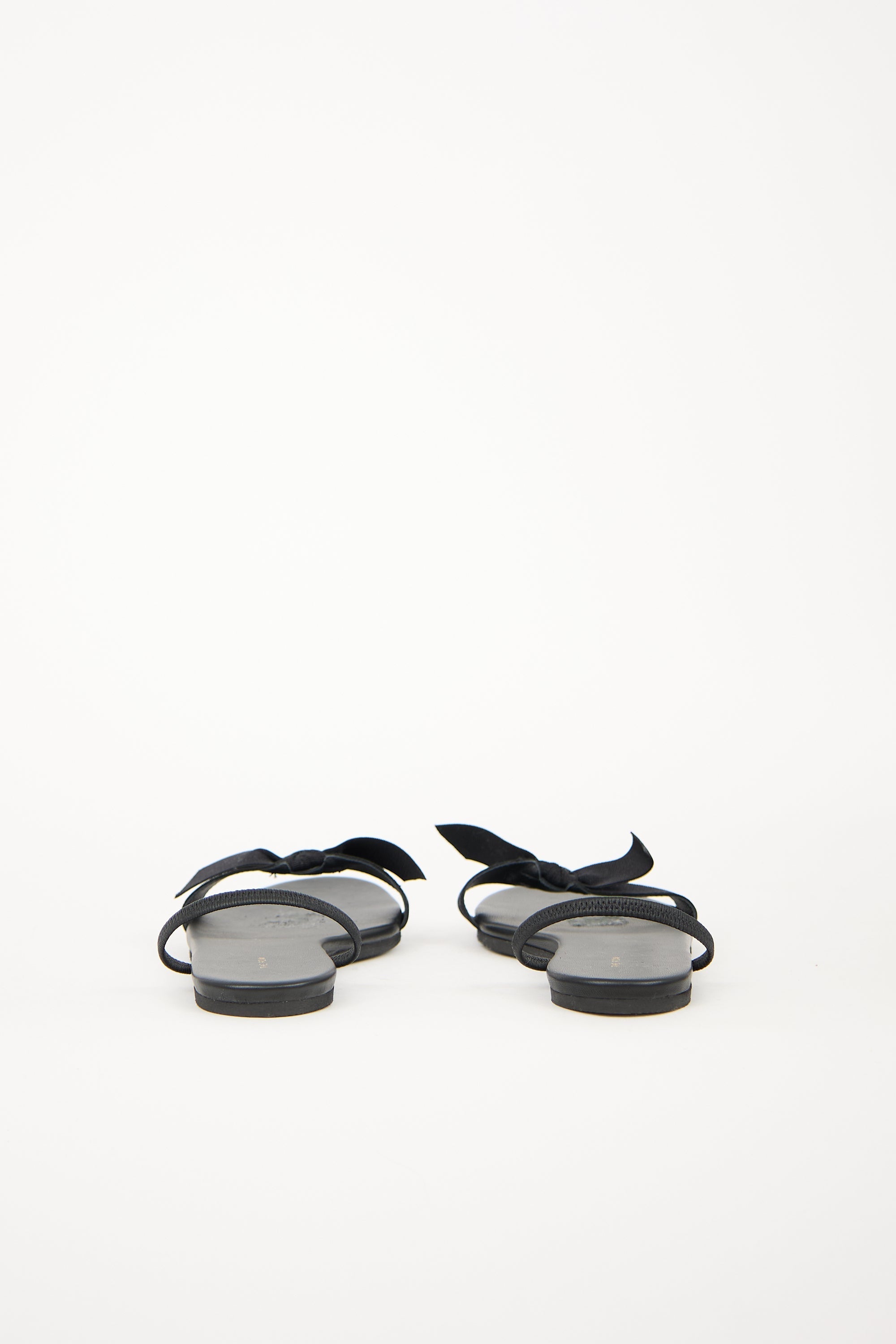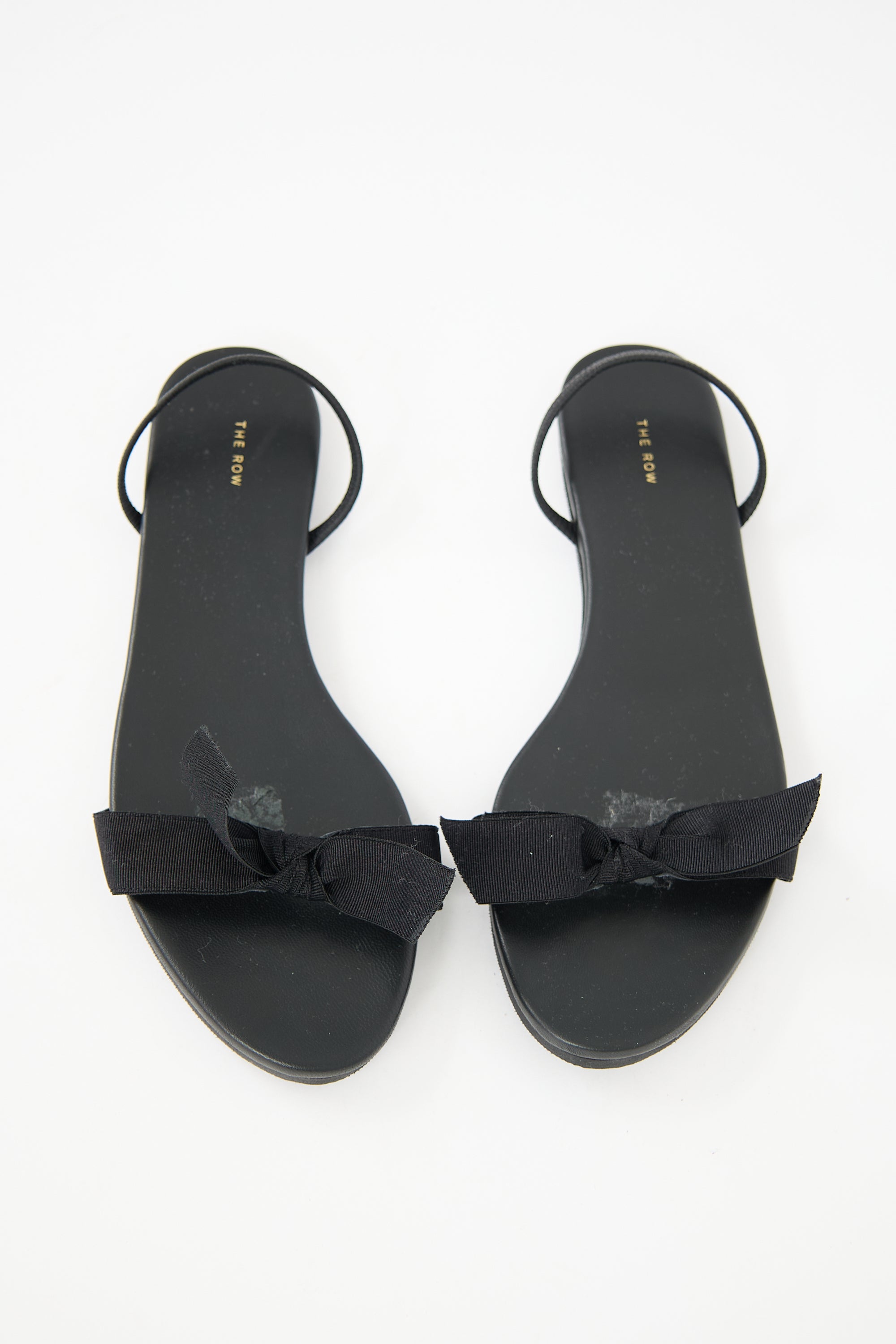 Pre-owned The Row black sandals featuring grosgrain bow at vamp, slingback strap, leather insole, and rubber outsole. Comes with original dust bag.